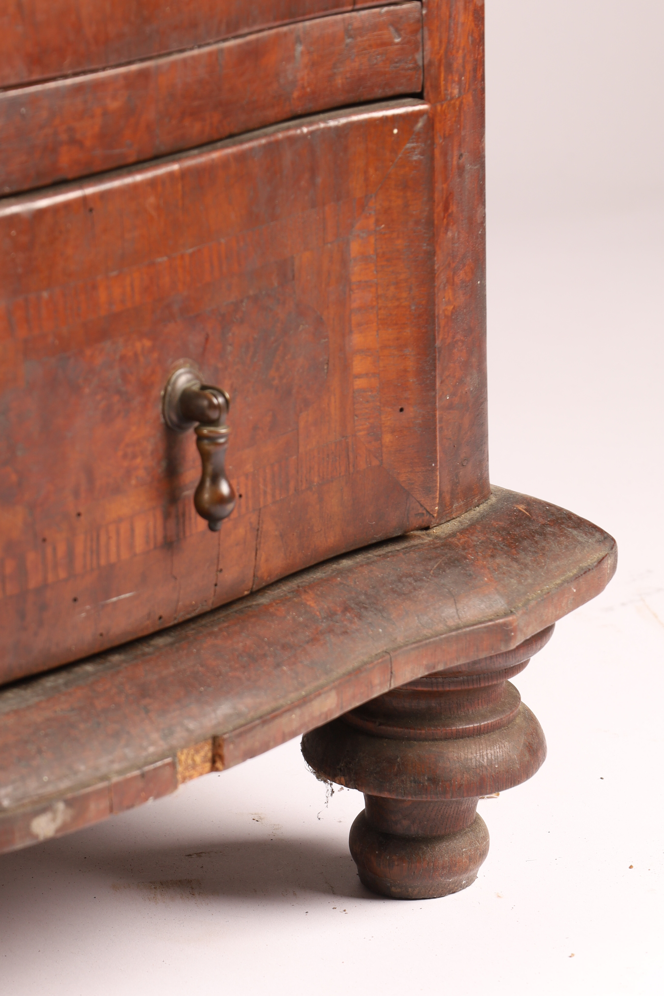 Antique South German Baroque Style Marquetry Four Drawer Chest of Drawers with drop handles (one missing) and turned feet. Measuring 29 H x 43 W x 25 inches deep.
