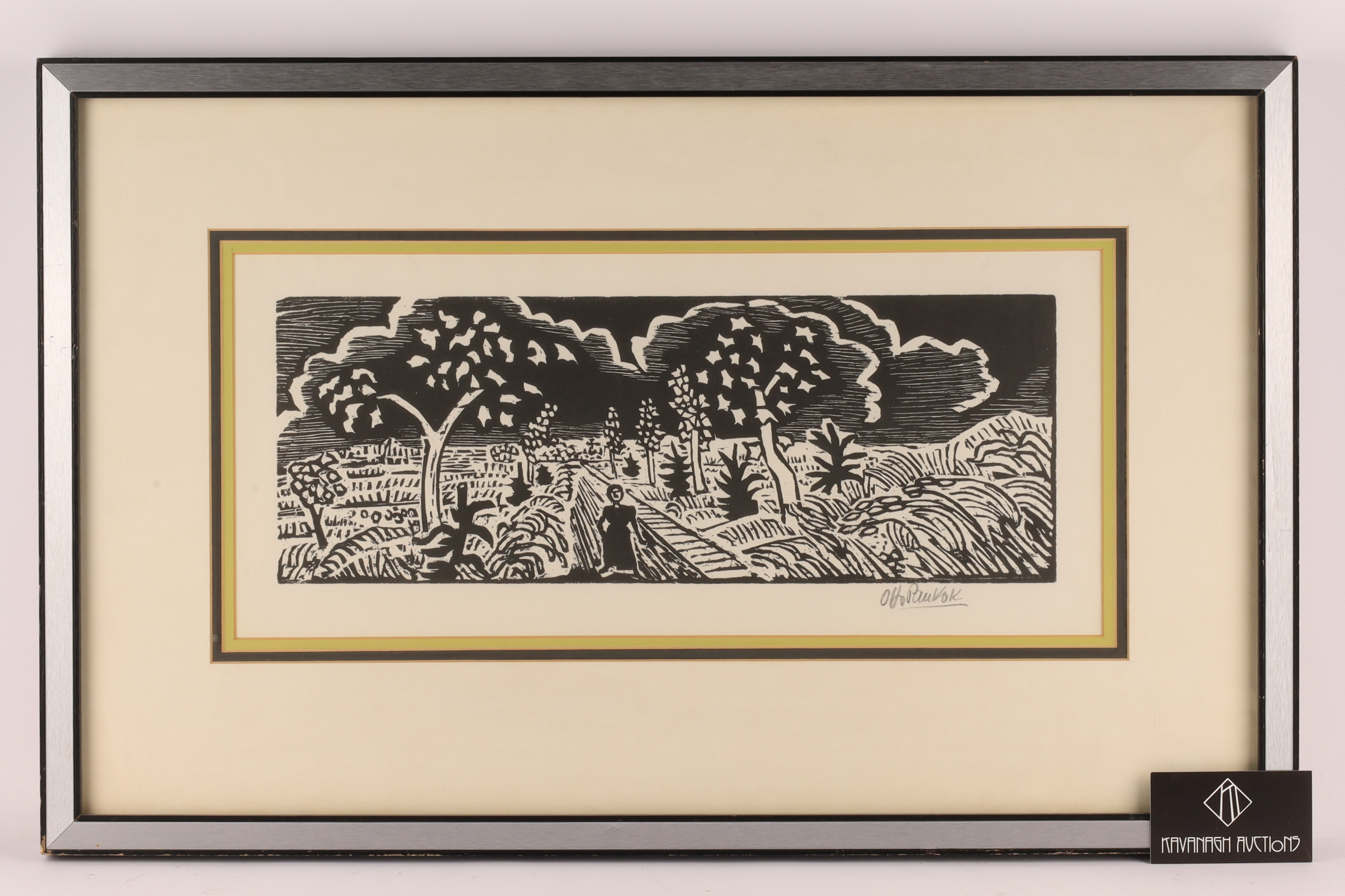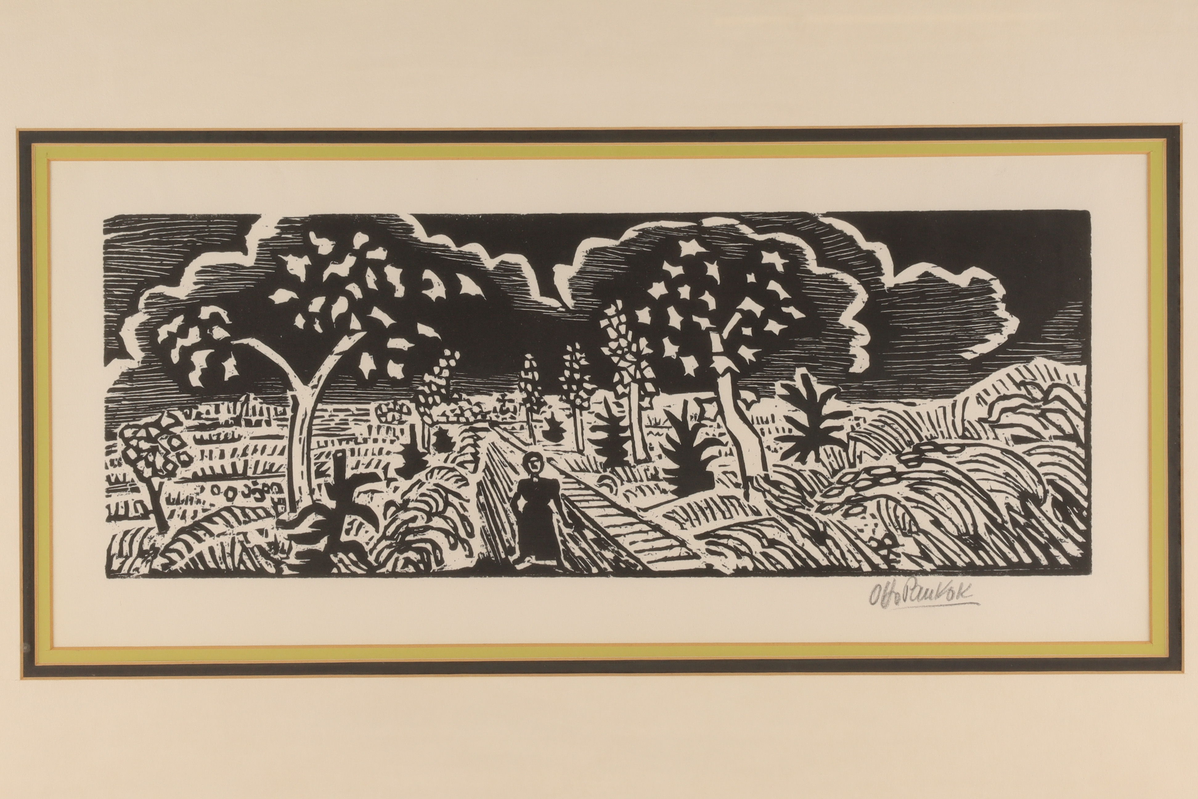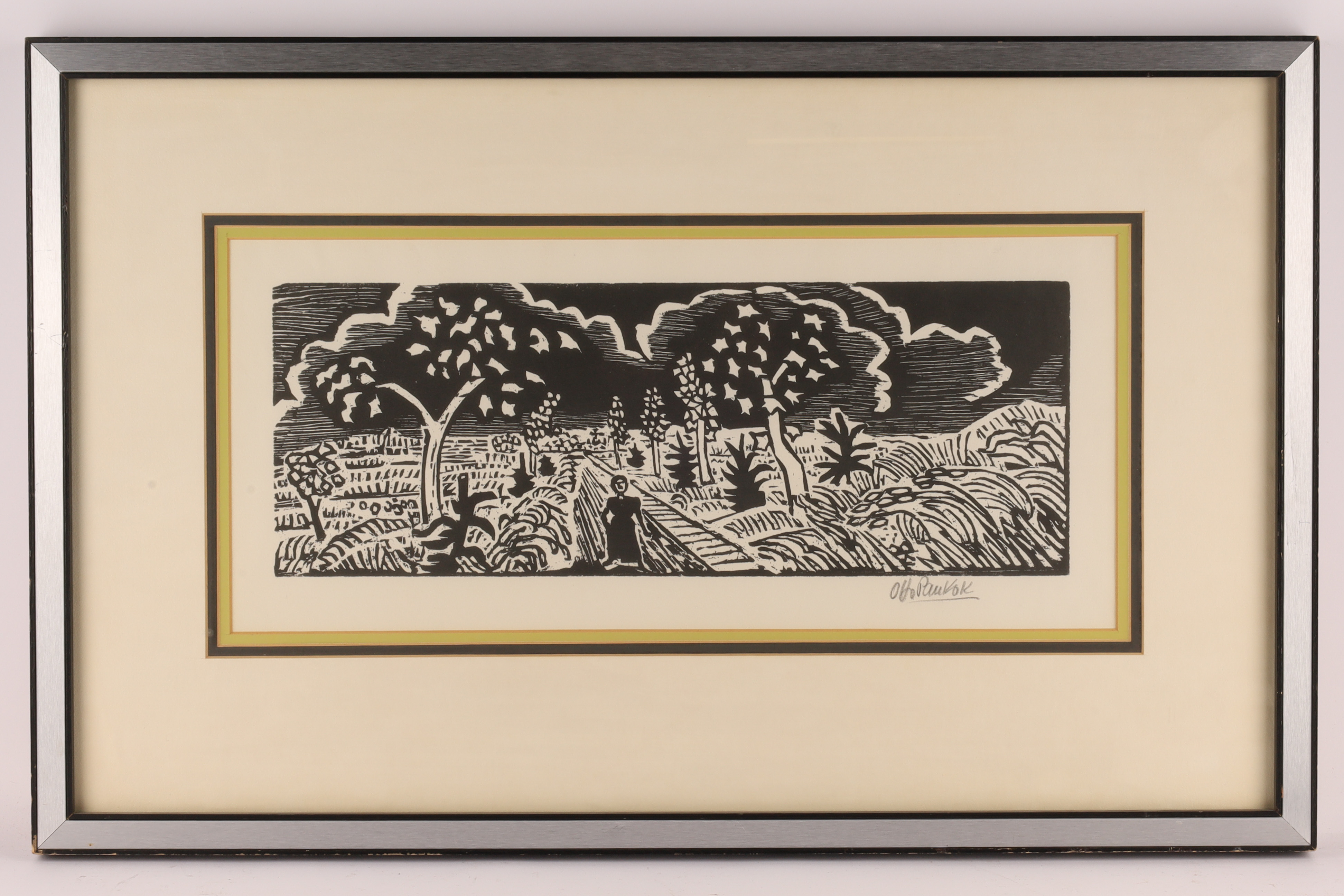 Otto Pankok (German, 1893 – 1966) Expressionist Woodcut Print, Landscape with Figure, signed lower right. Image measures 8.5 inches H x 18.5 W, frame measures 17 x 27 inches.