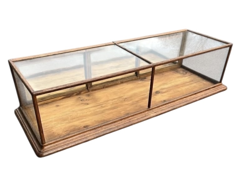Antique Montreal Showcase Co Long Mercantile Counter Top Display Case. With sliding doors, 67 inches L x 22 deep x 17 H