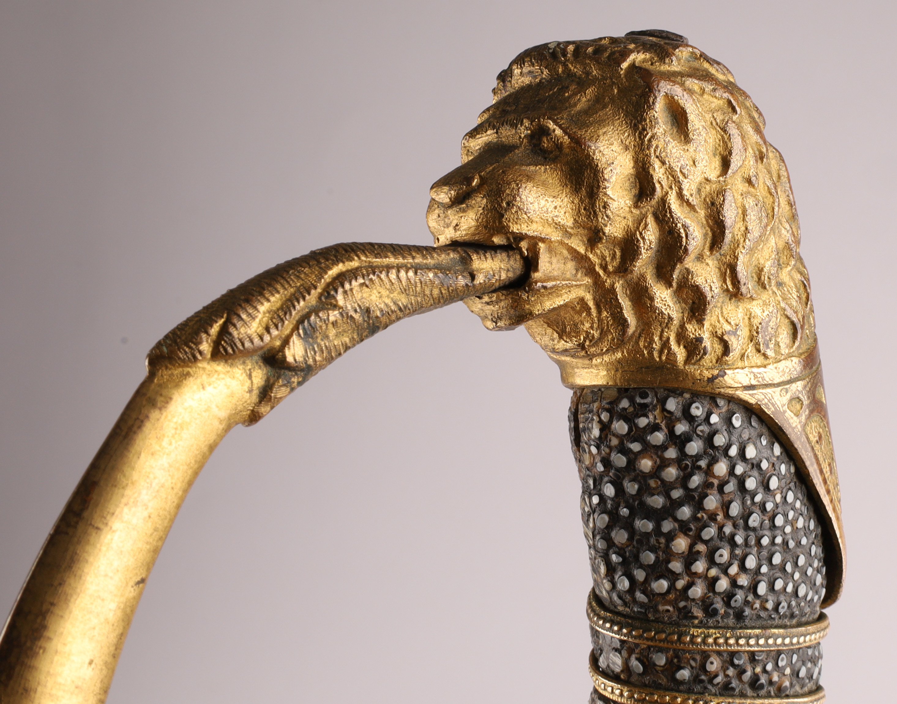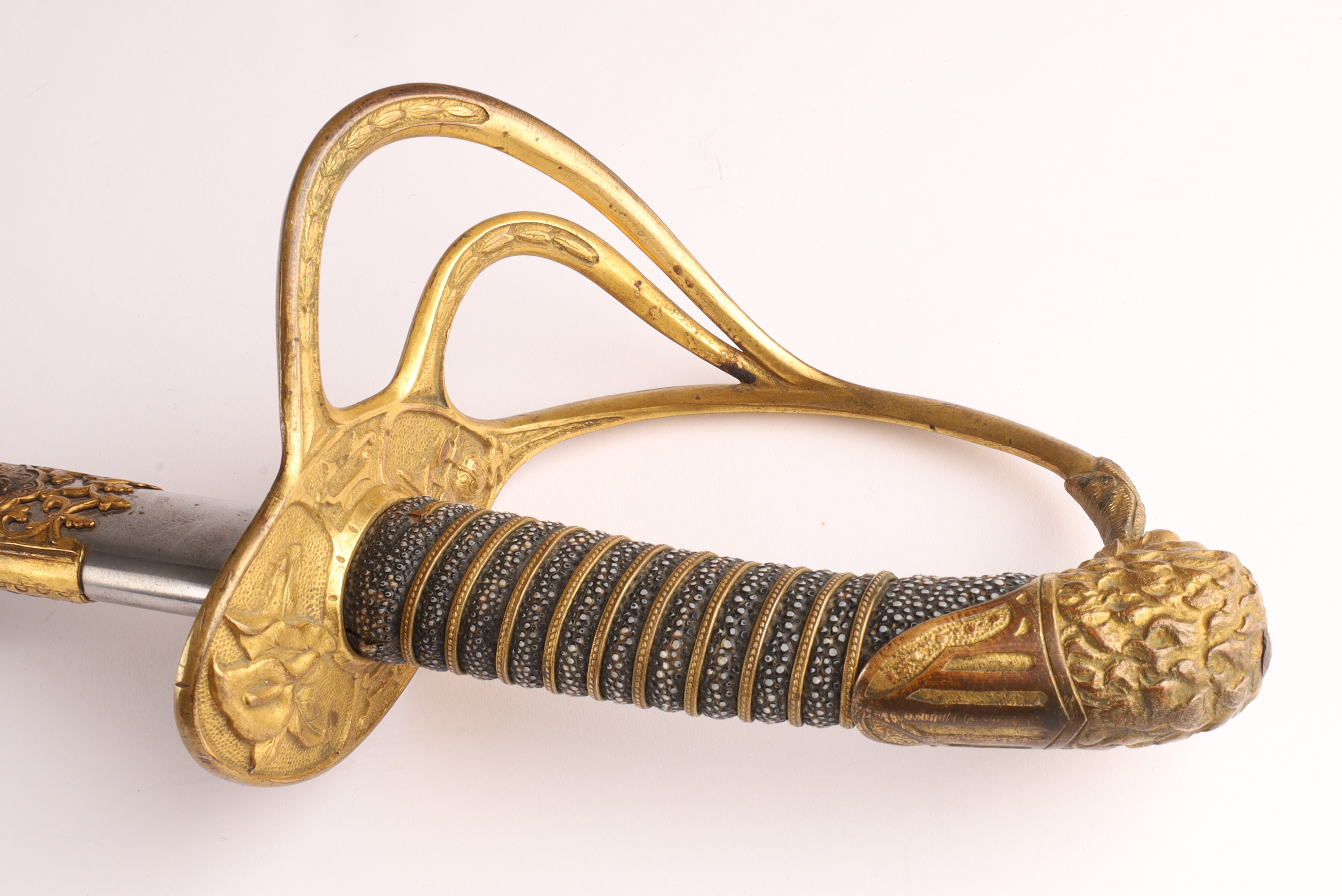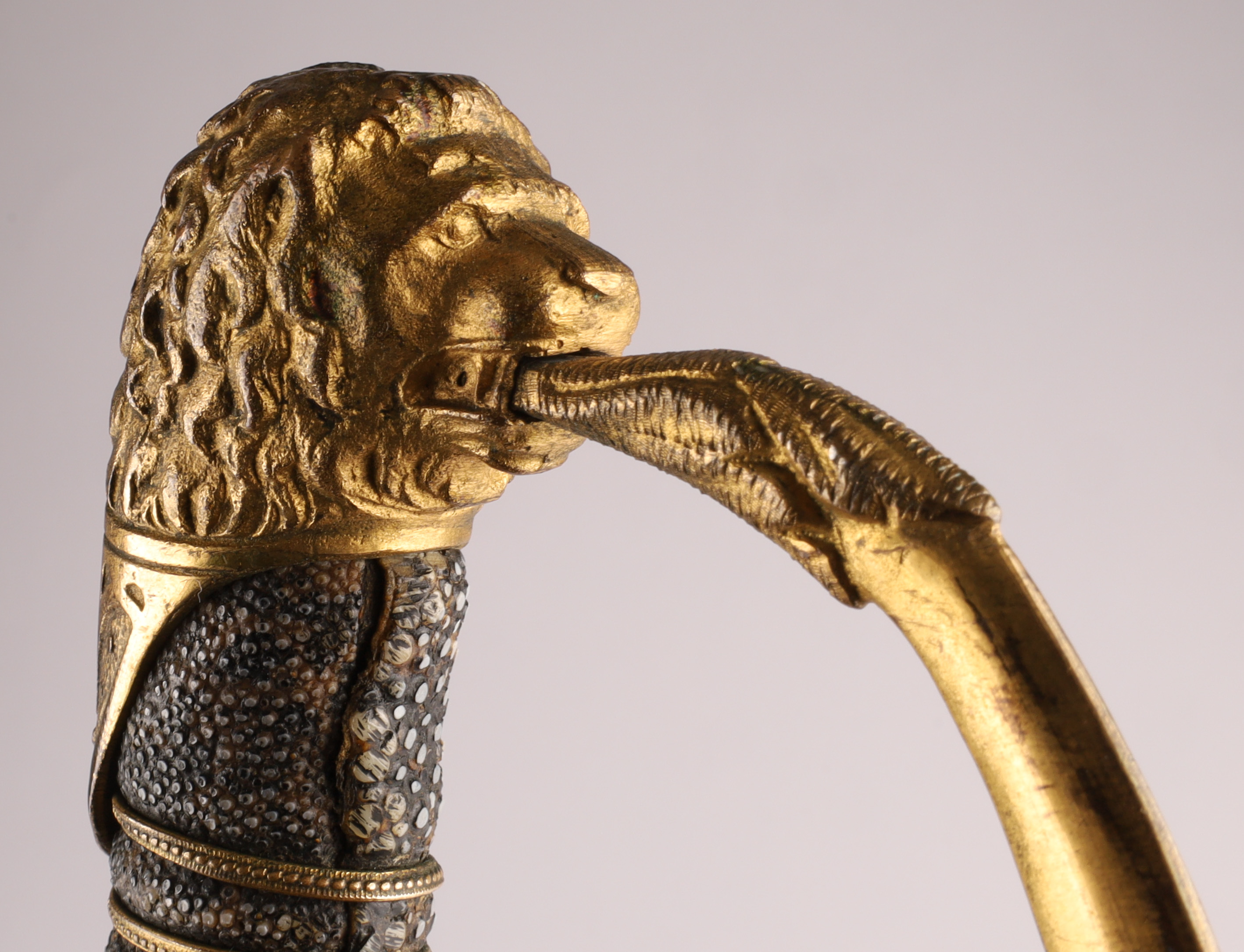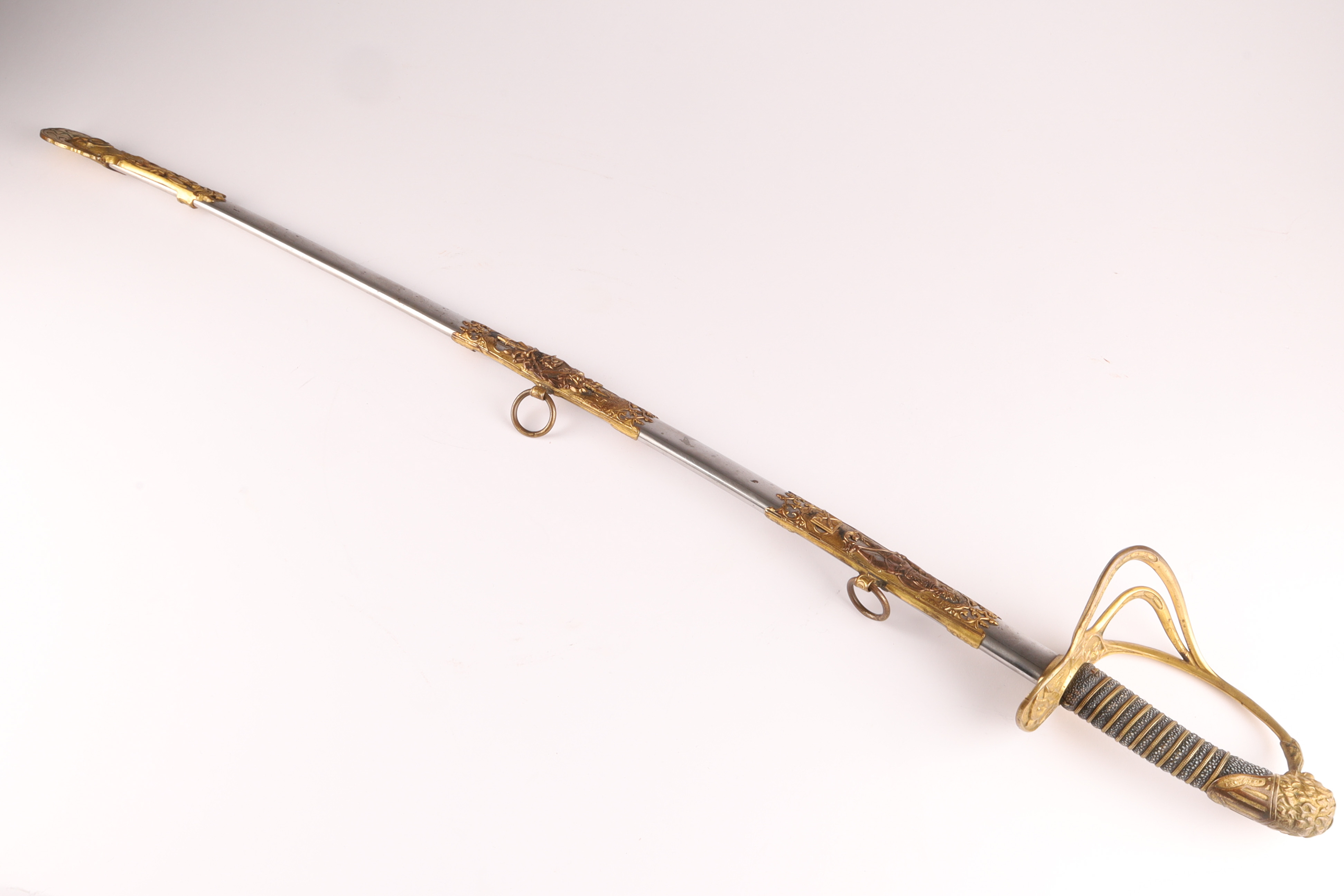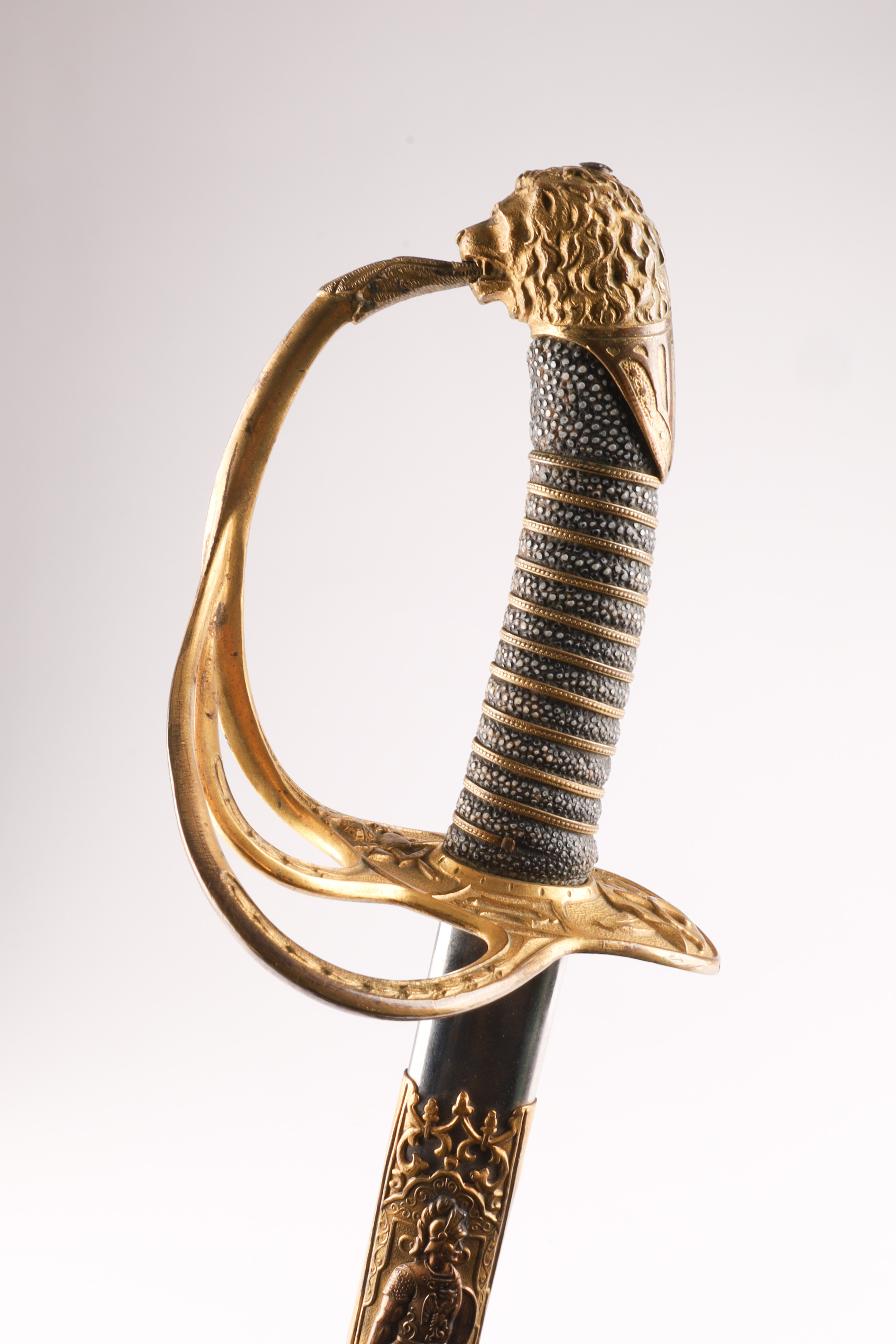 19th C Cincinnati Regalia Co Fraternal Presentation Dress Sword. Inscribed on blade, Captain Freehold, Co 17th. With shagreen handle and lion head pommel. Measuring 35 inches L, blade measures 28 inches.