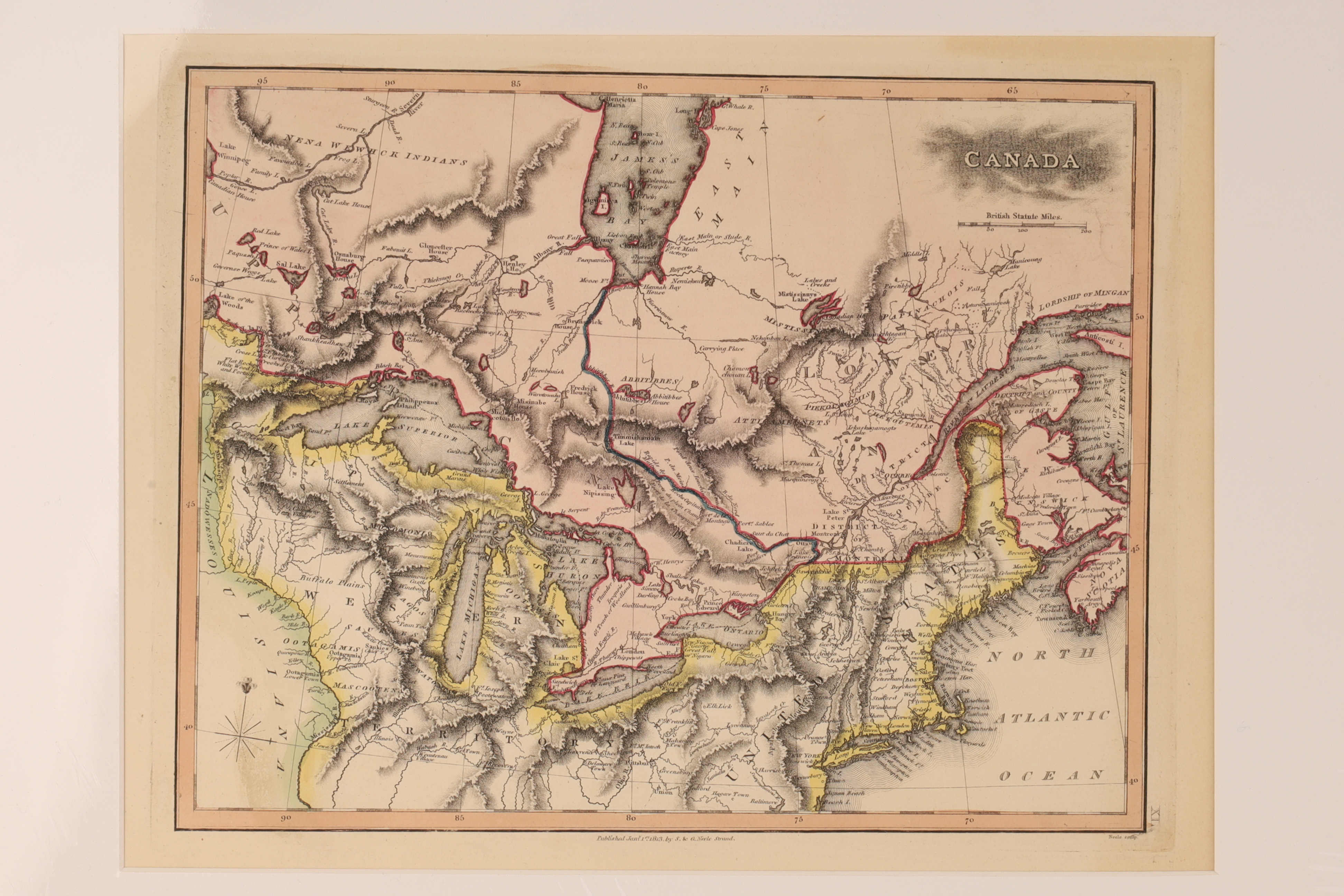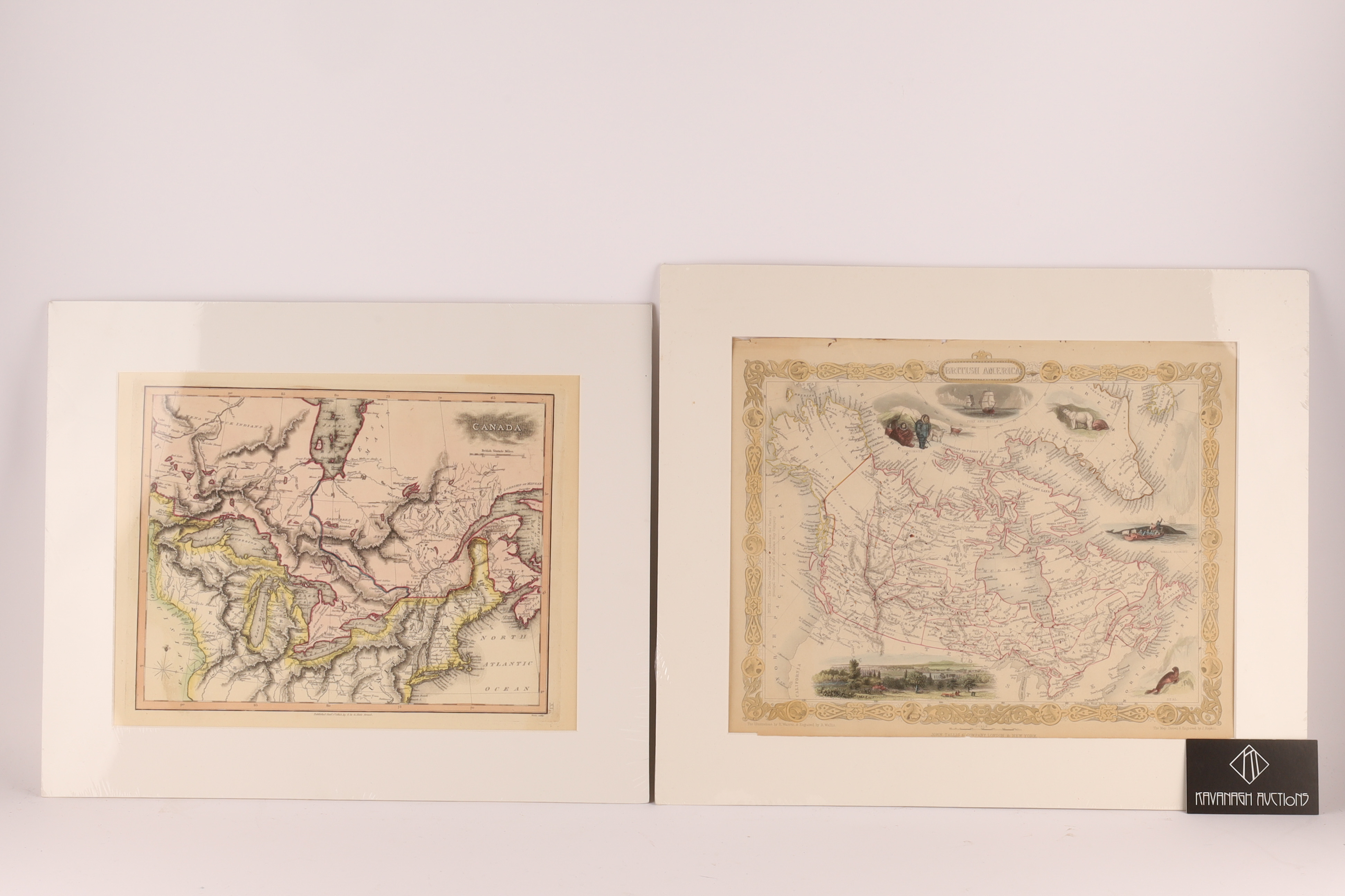 Lot of 2 Antique Maps of Canada. One marked Plate XI, Published Jan. 1st 1813 by S. and G. Neele, Strand. Second marked MAP OF BRITISH AMERICA, drawn and engraved by J Rapkin, H Warren, and R Wallis. Both in unframed matting, measuring approximately 14 x 17 inches.