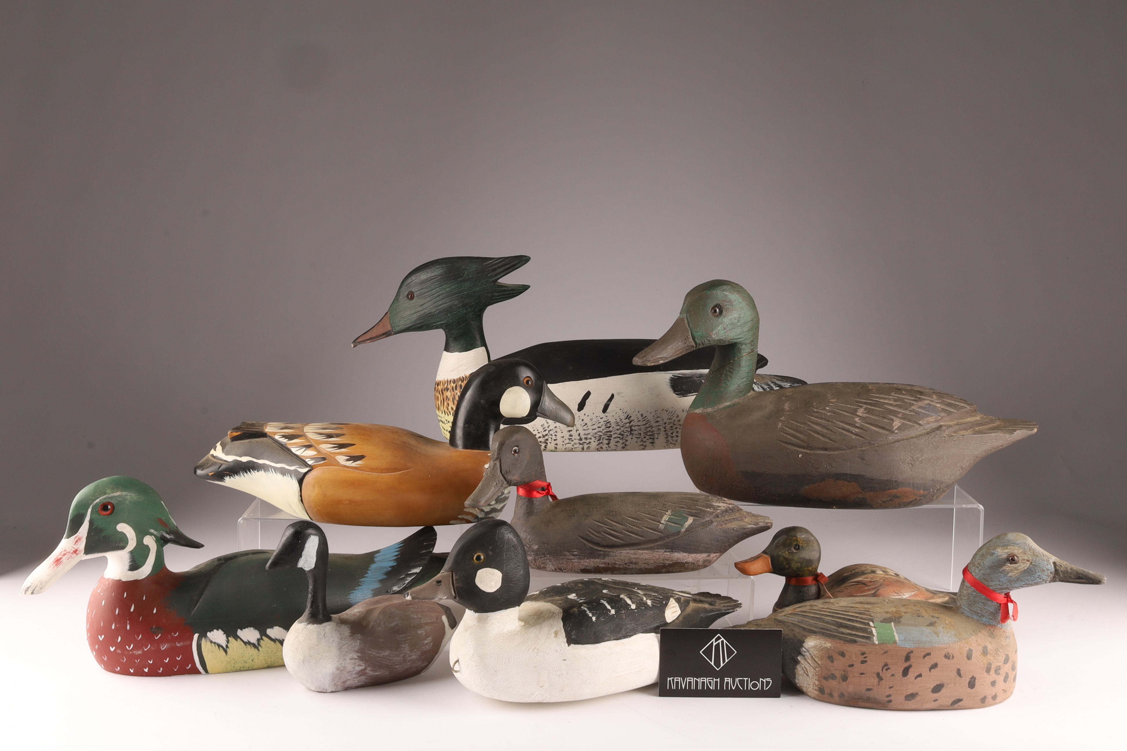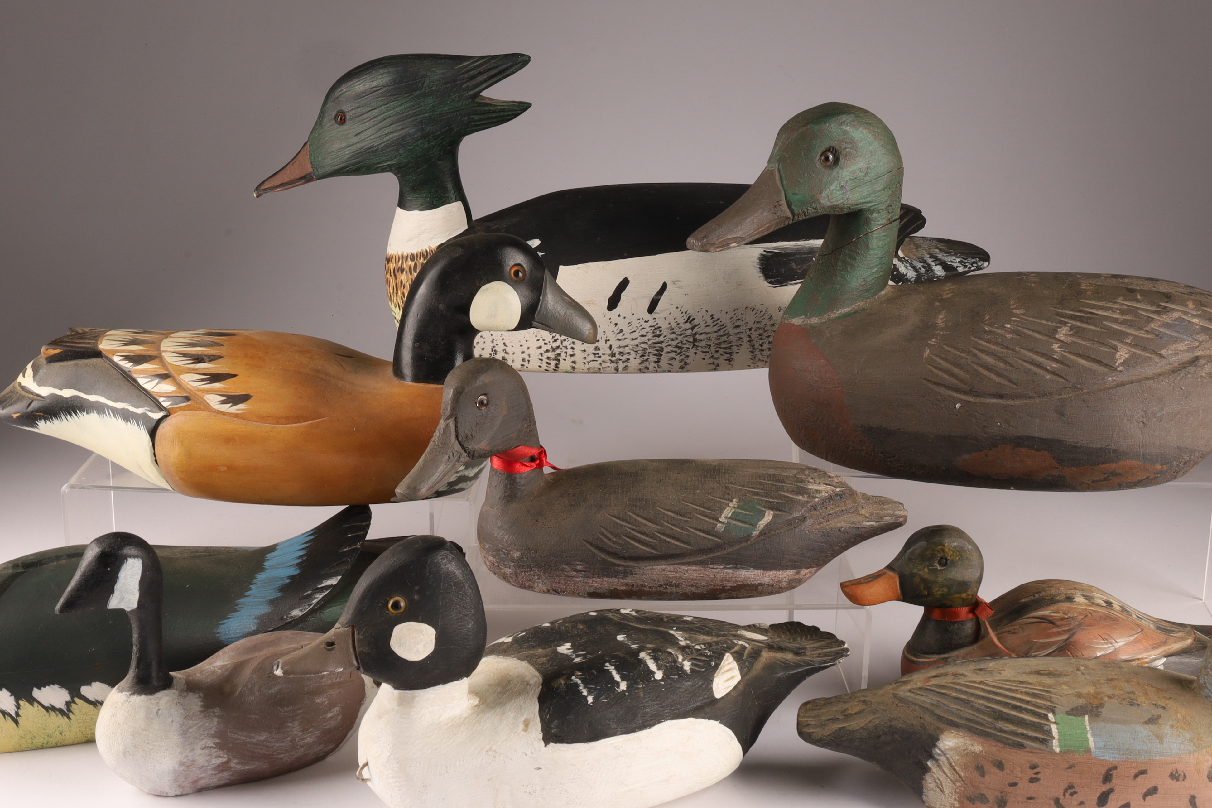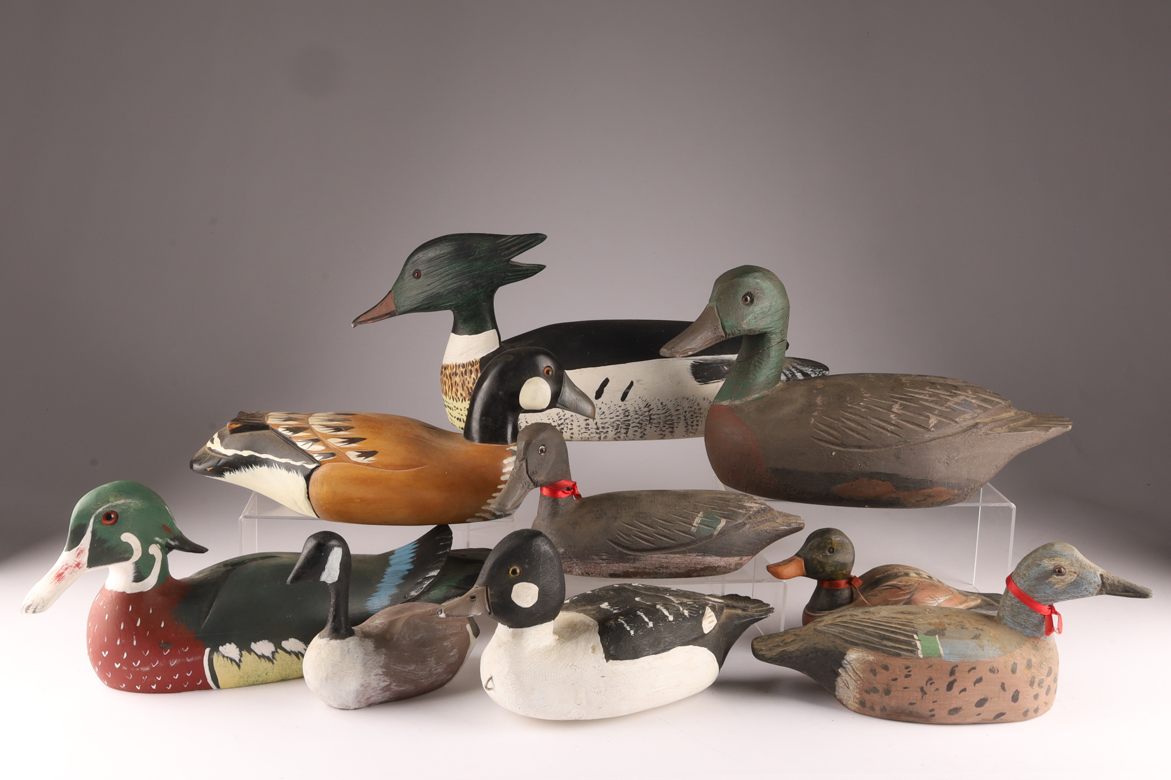 Large Lot of 9 Carved and Painted Duck Decoys. Various maker marks, Tremblay, Newfoundland St. John, A. Thouin, Initialled C.D. Largest (merganser) measures 18 inches L x 7 H.