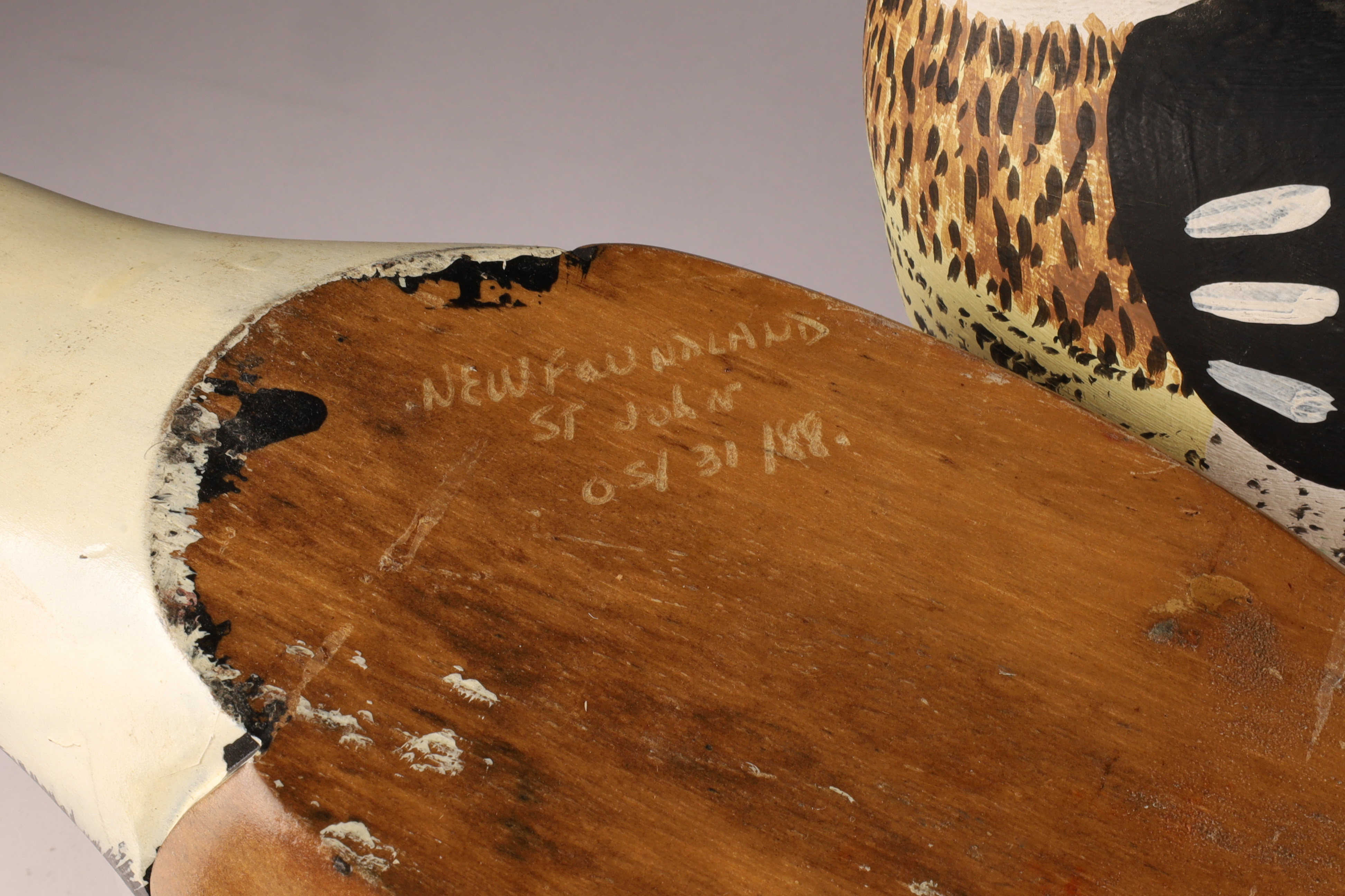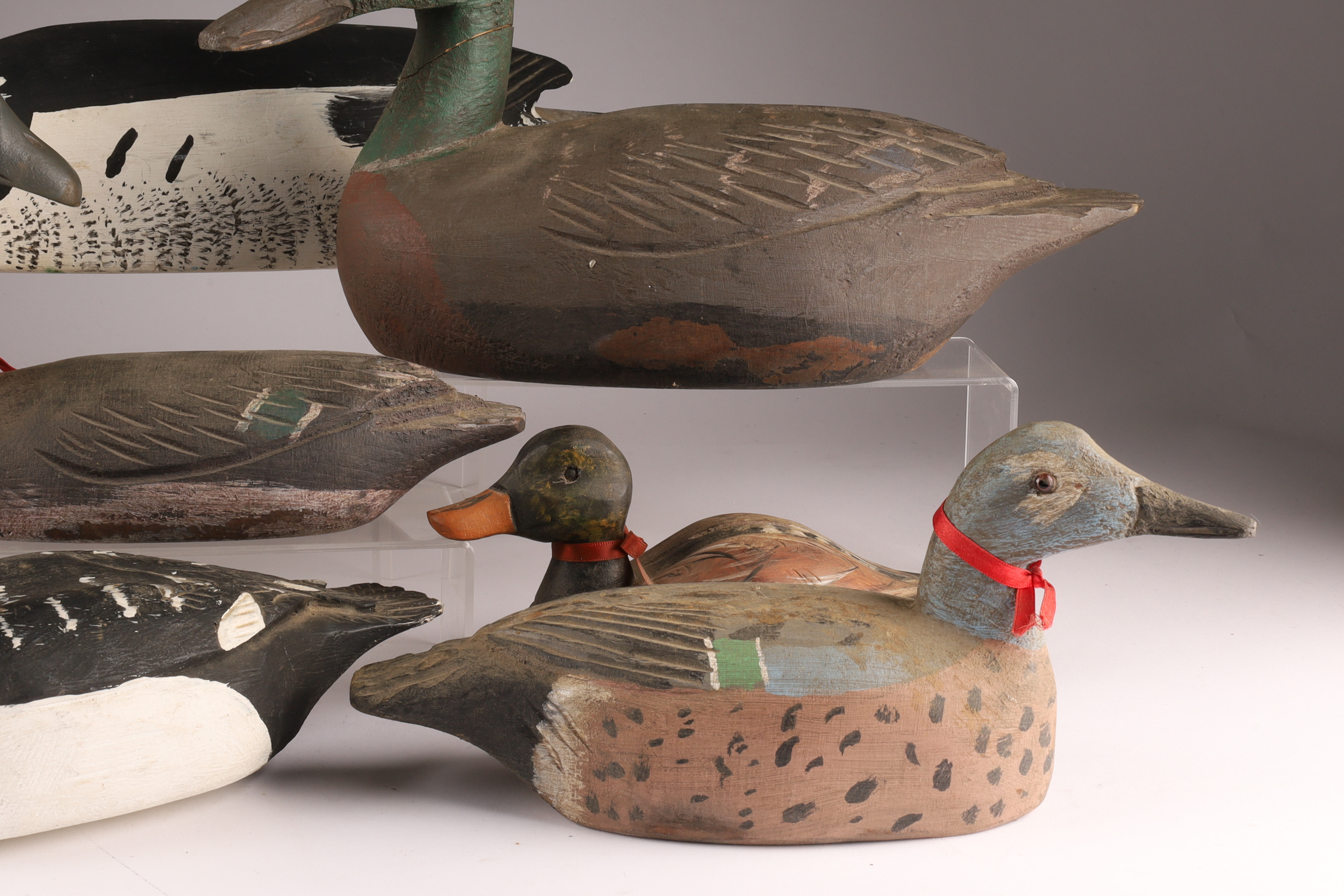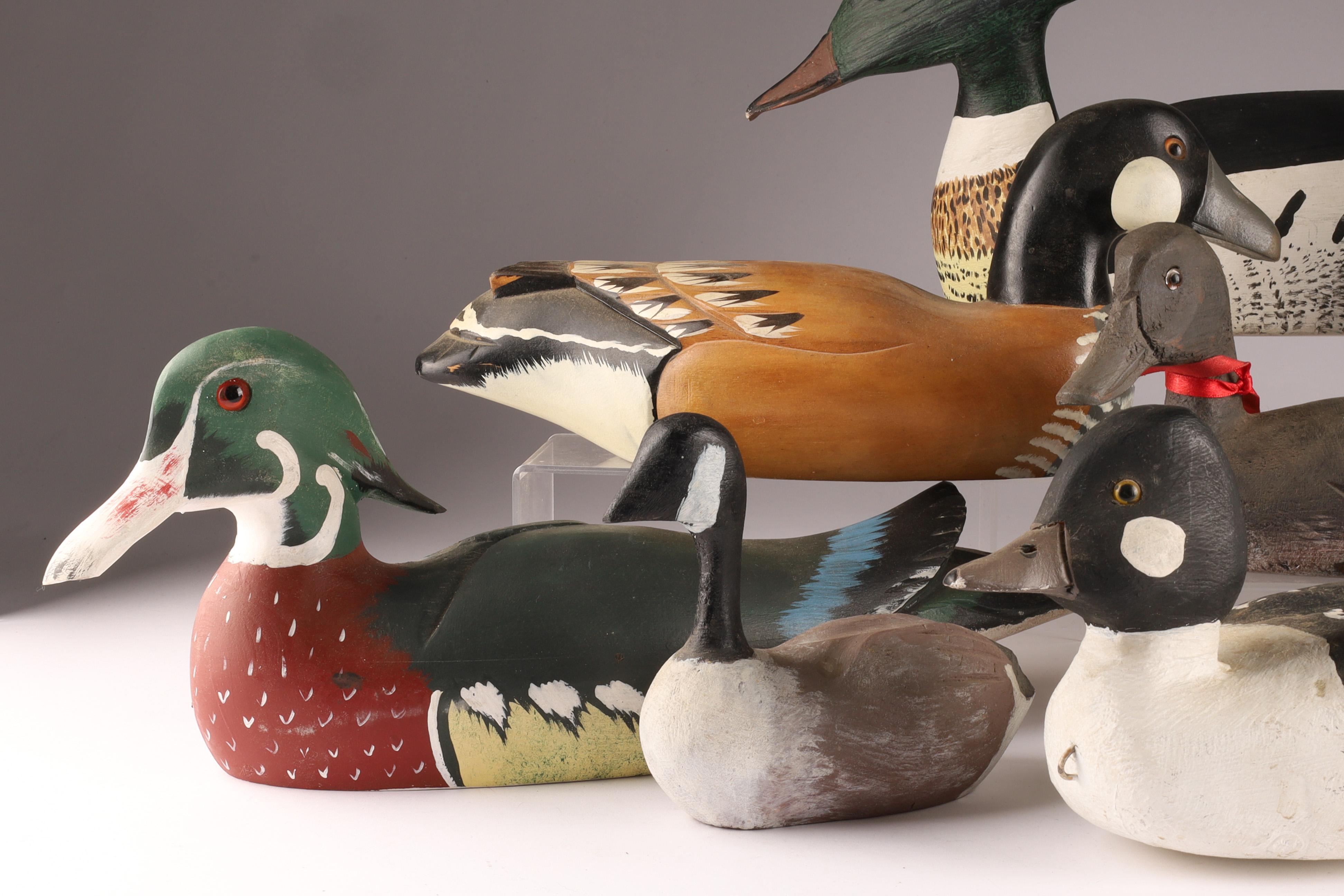 Large Lot of 9 Carved and Painted Duck Decoys. Various maker marks, Tremblay, Newfoundland St. John, A. Thouin, Initialled C.D. Largest (merganser) measures 18 inches L x 7 H.