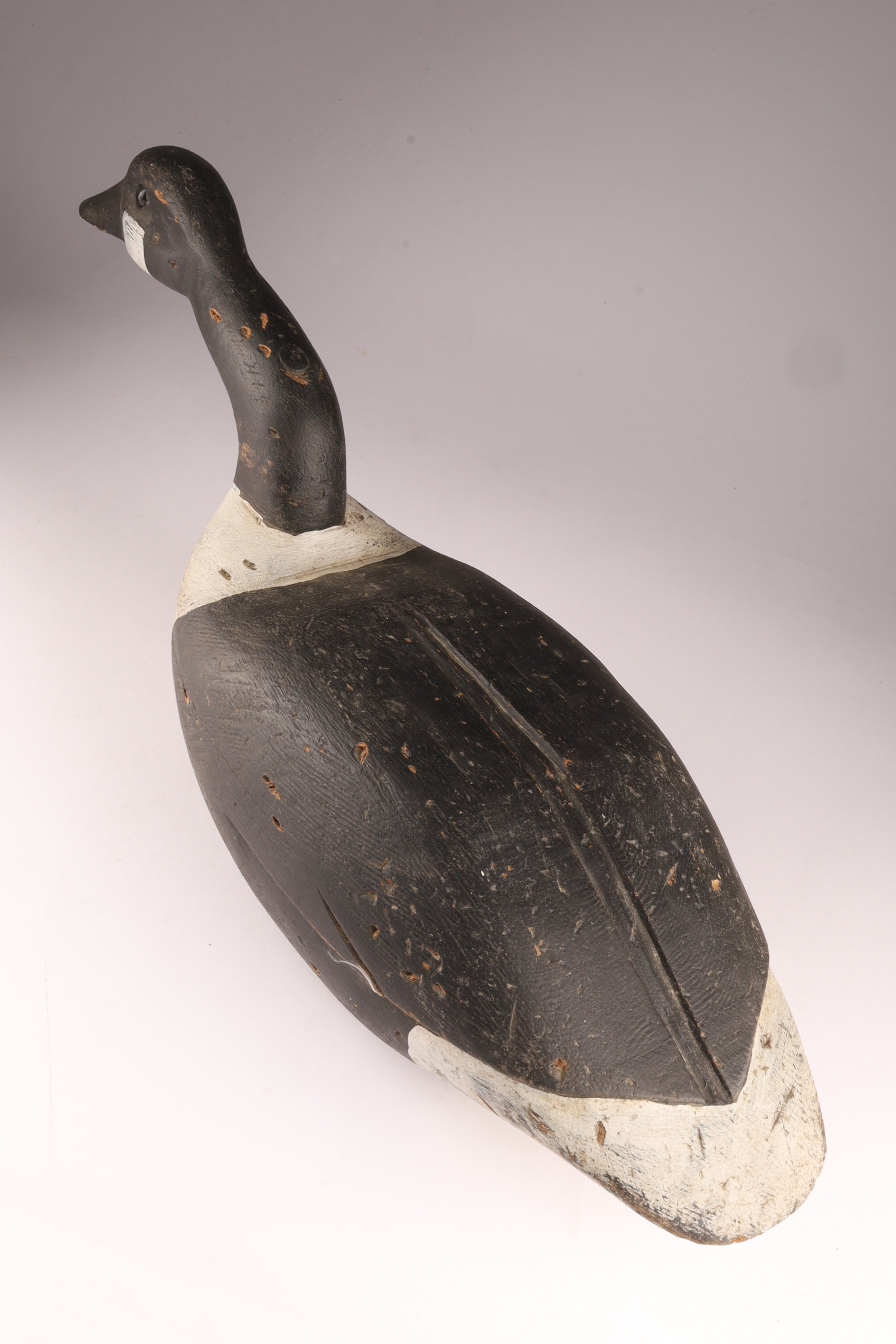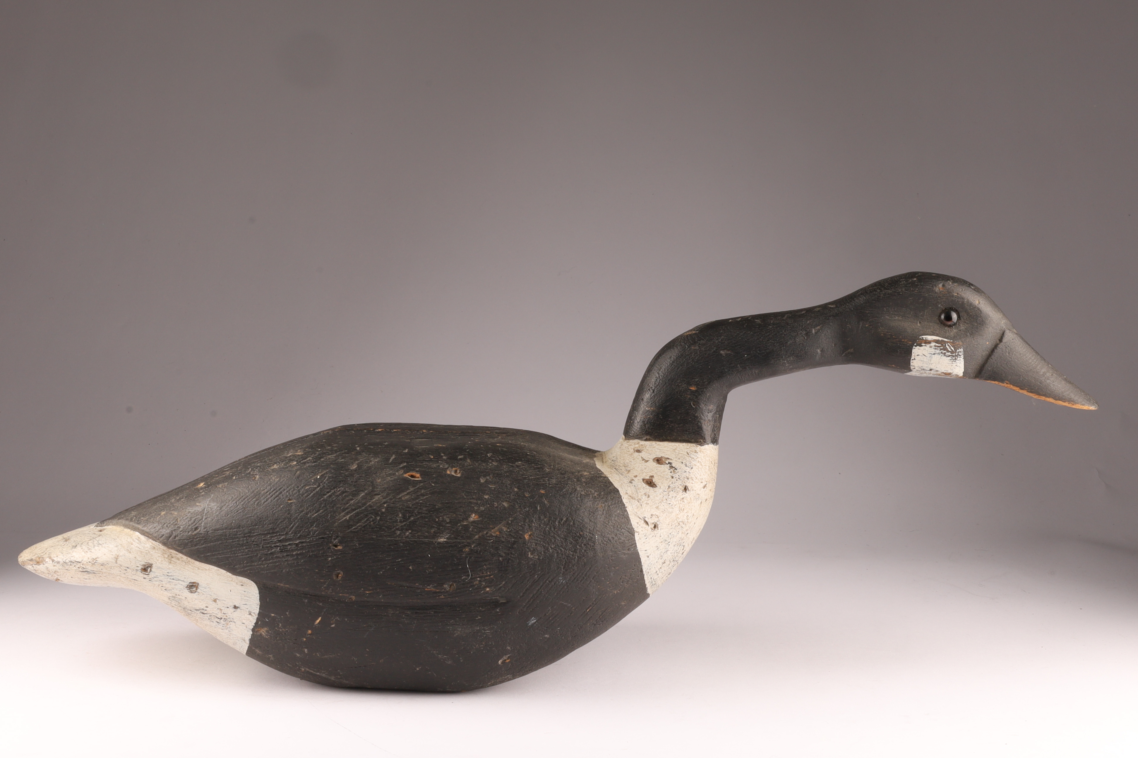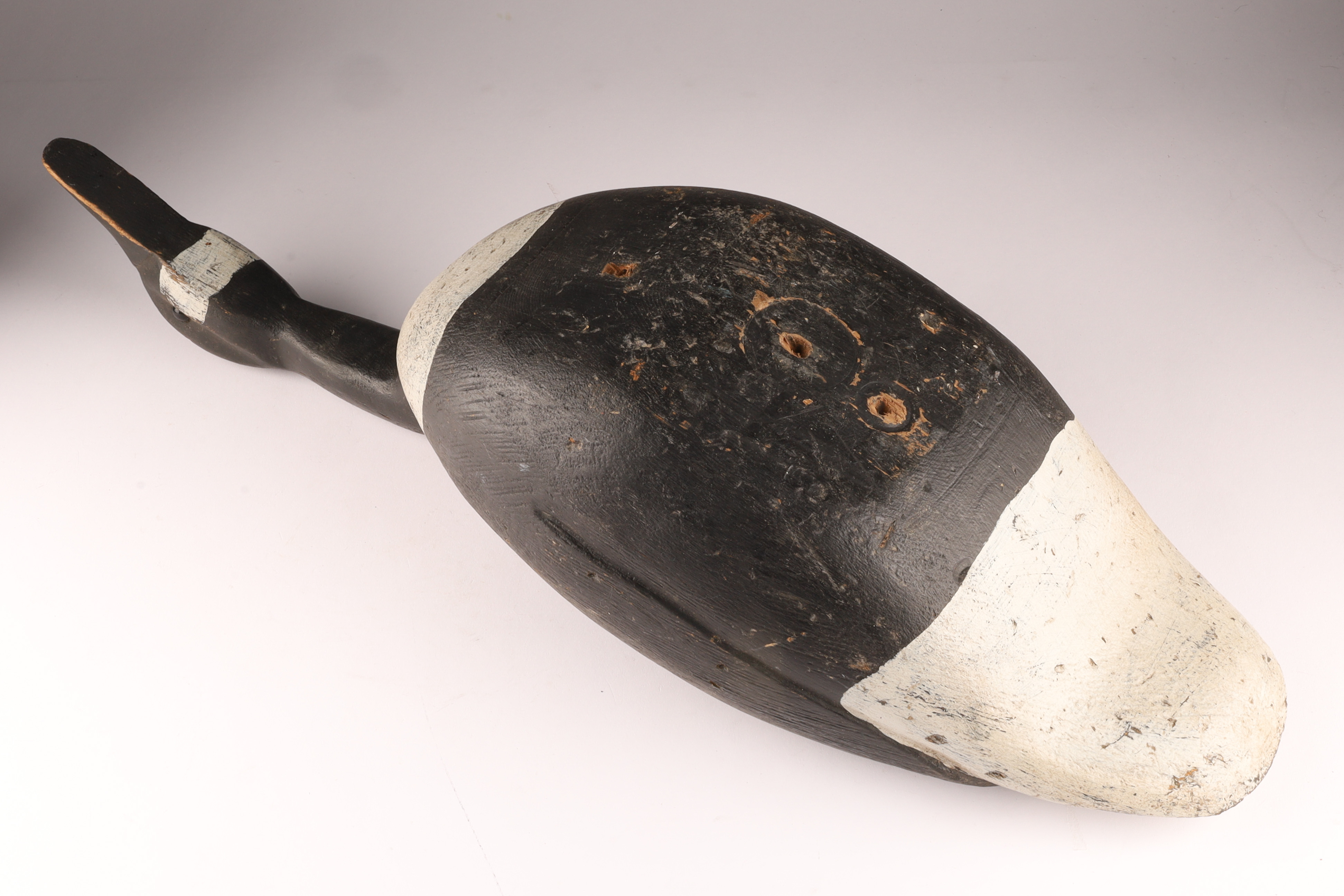 Carved Canada Goose Duck Decoy in Feeding Position, unsigned. Measures 24 inches L x 7 W x 9.5 H. HOles for stand on underside.