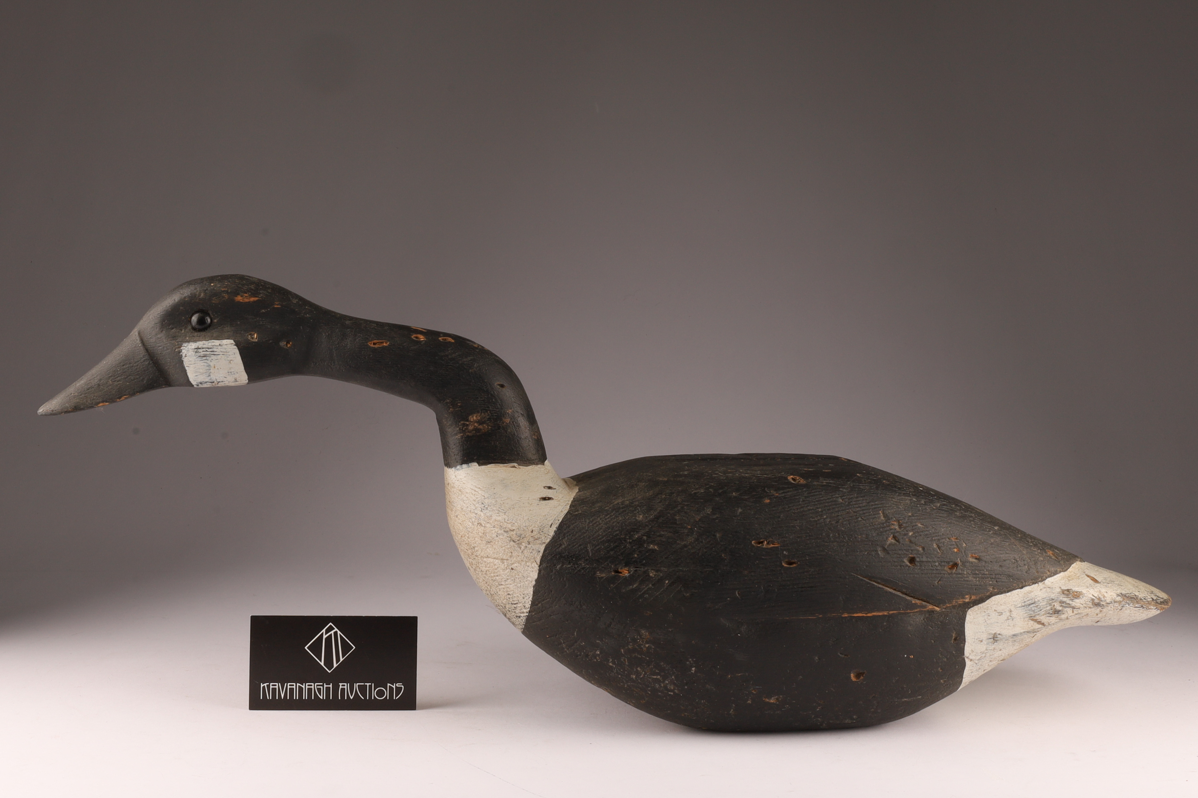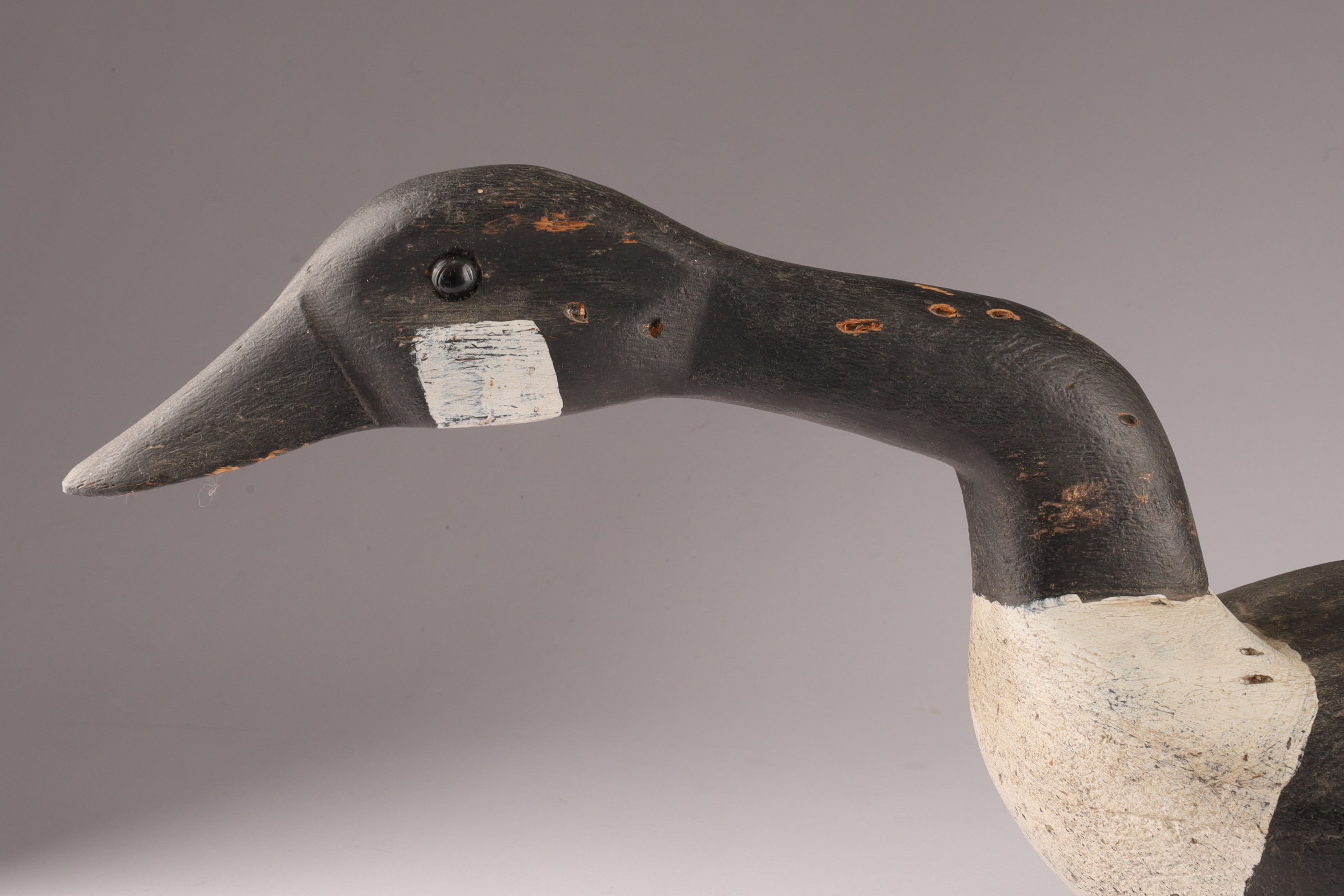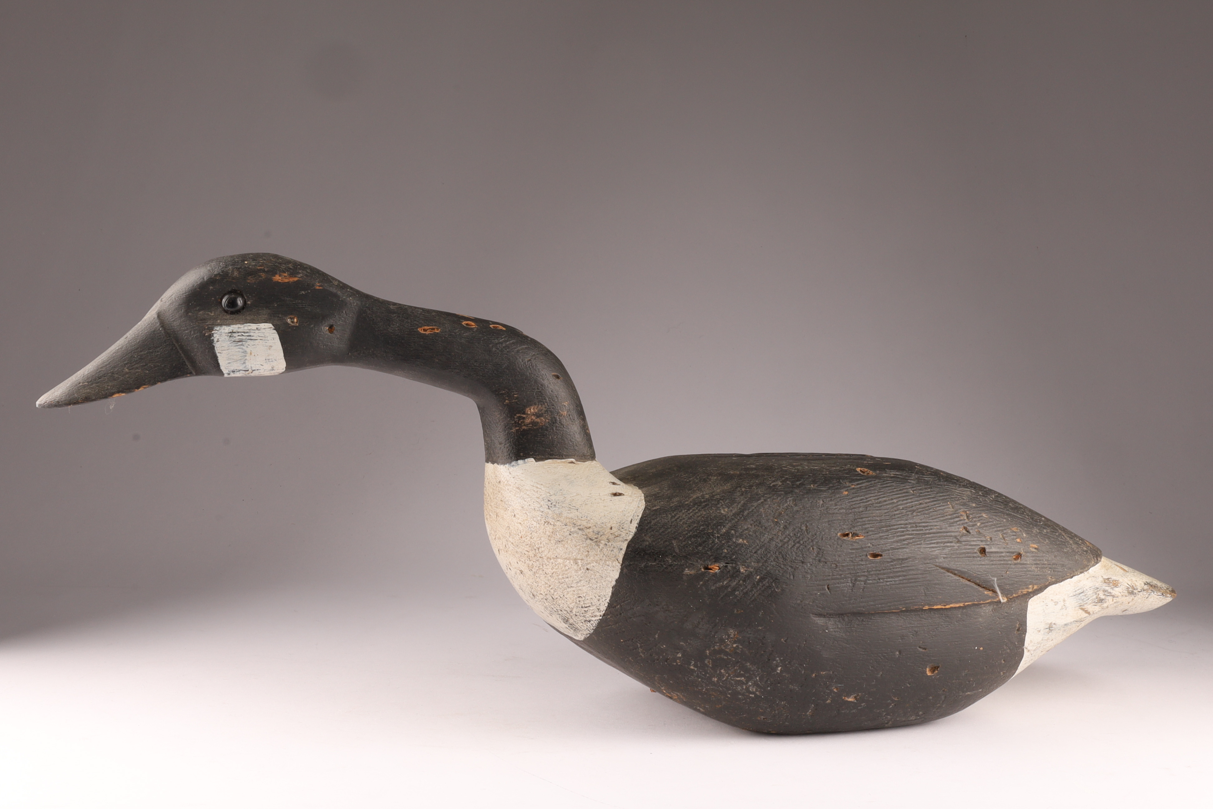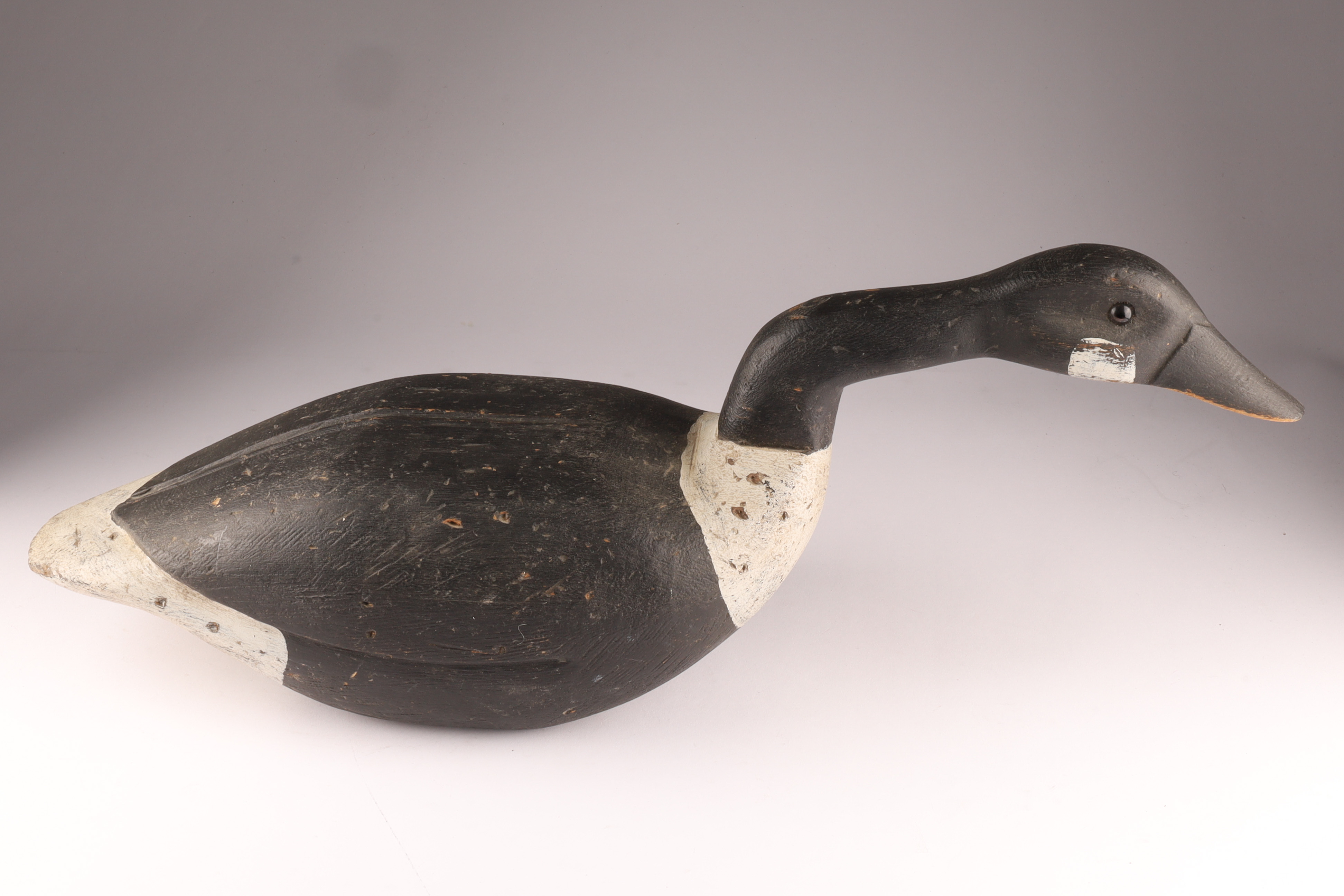 Carved Canada Goose Duck Decoy in Feeding Position, unsigned. Measures 24 inches L x 7 W x 9.5 H. HOles for stand on underside.