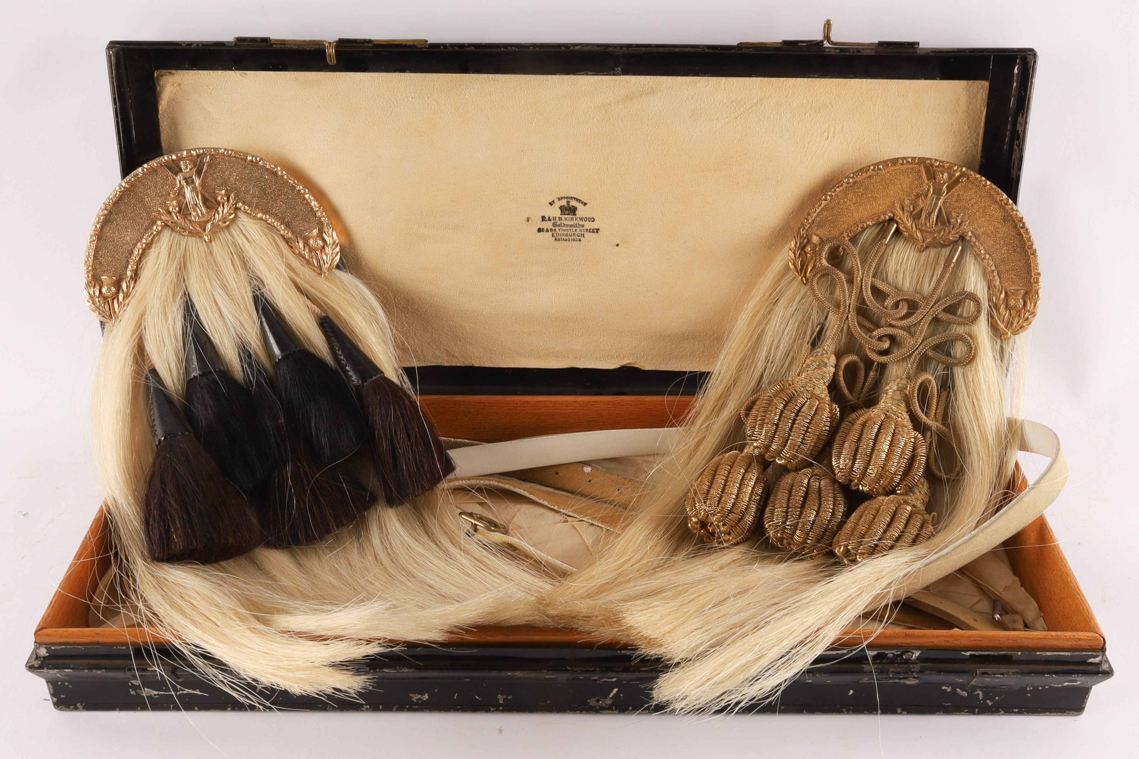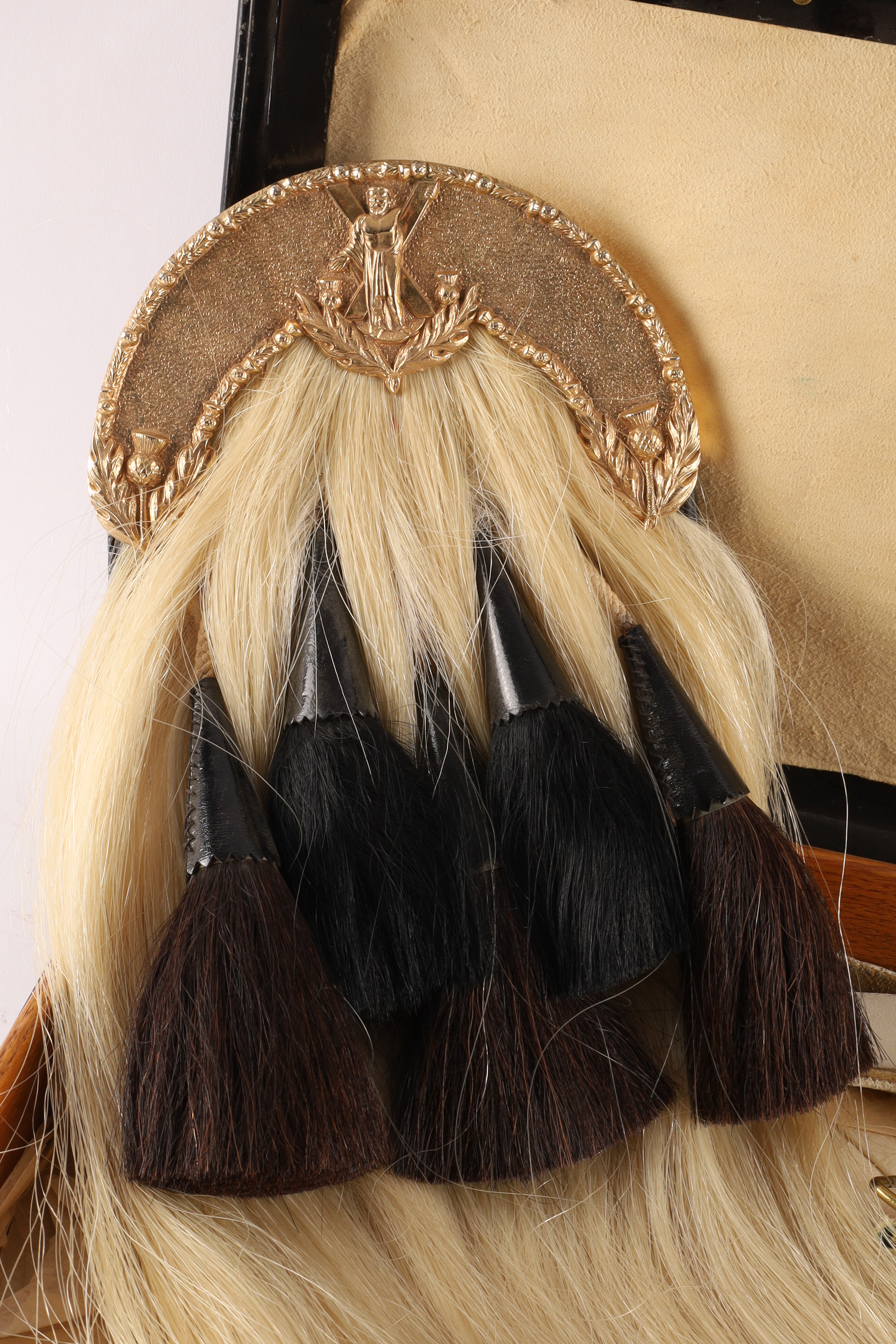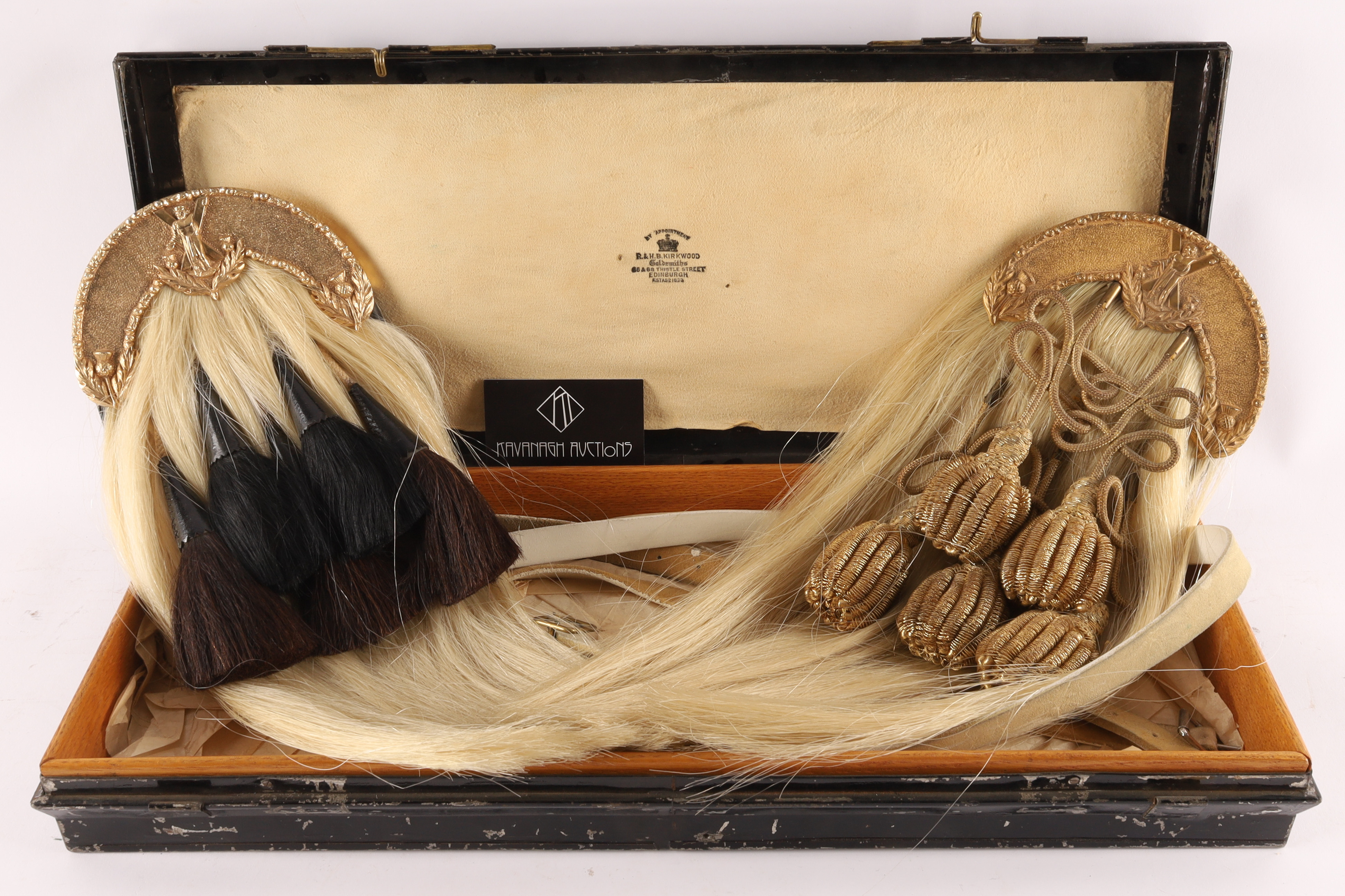 Lot of Two Antique Montreal WWI Era Scottish Sporrans for Black Watch. One sporran has gilt cantle with raised thistle edge and St Andrew to the center, a white horses hair body with five black horses hair tassels, emerging from plain black patent leather bells. A leather pouch to the back with two loops for the white belt. The other with officer’s dress sporran with five knotted gold bullion tassels. Both measuring 18 inches L x 7 W with 40 inch L leather belts. In protective case measuring 22 x 9 x 3 inches.