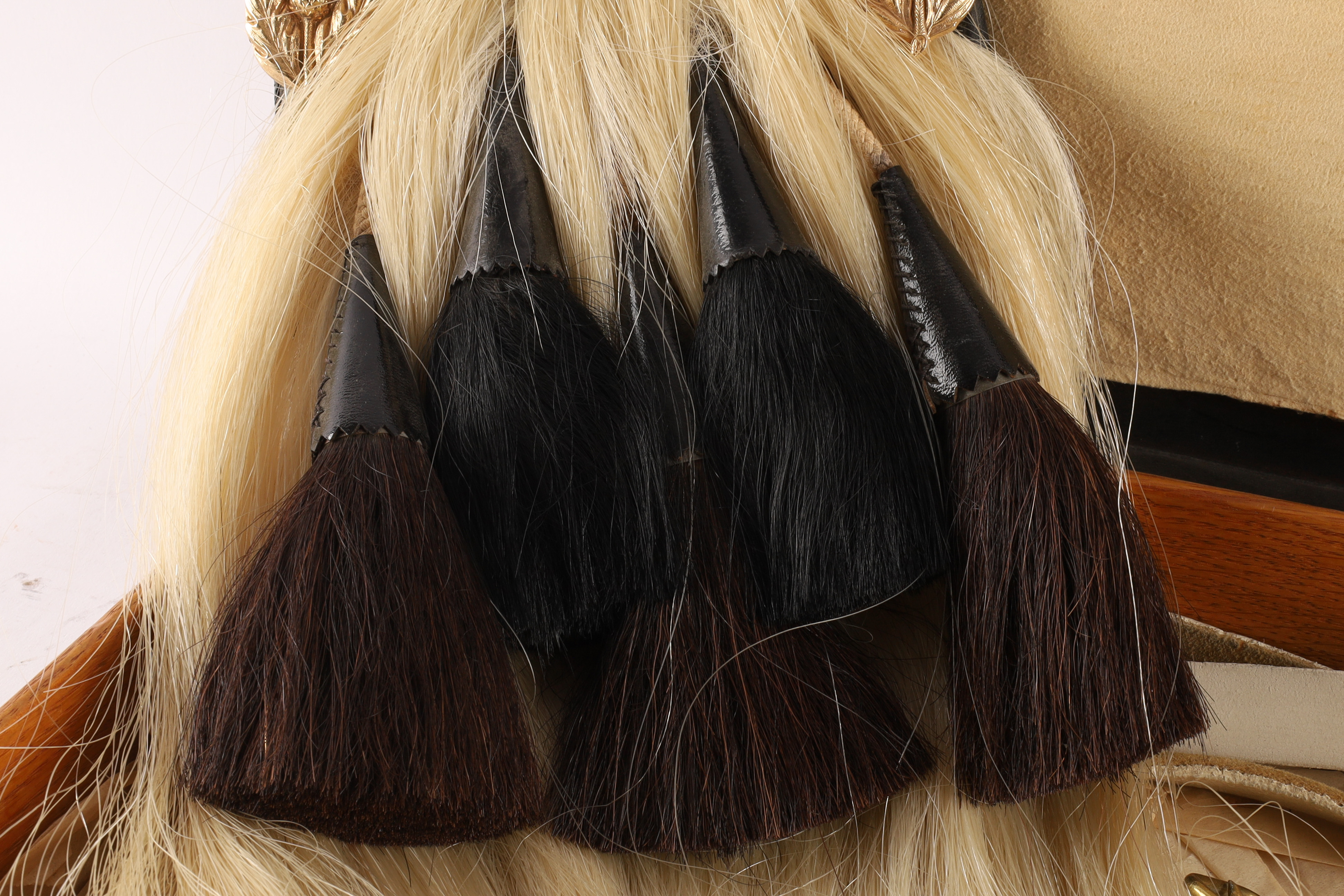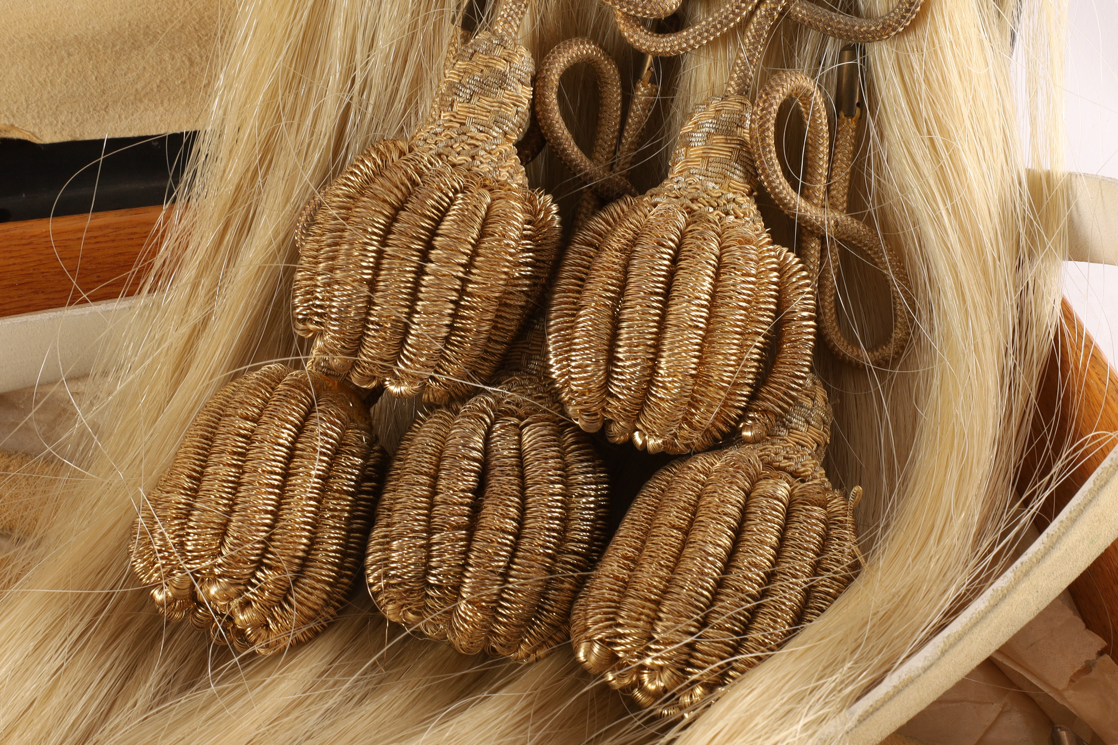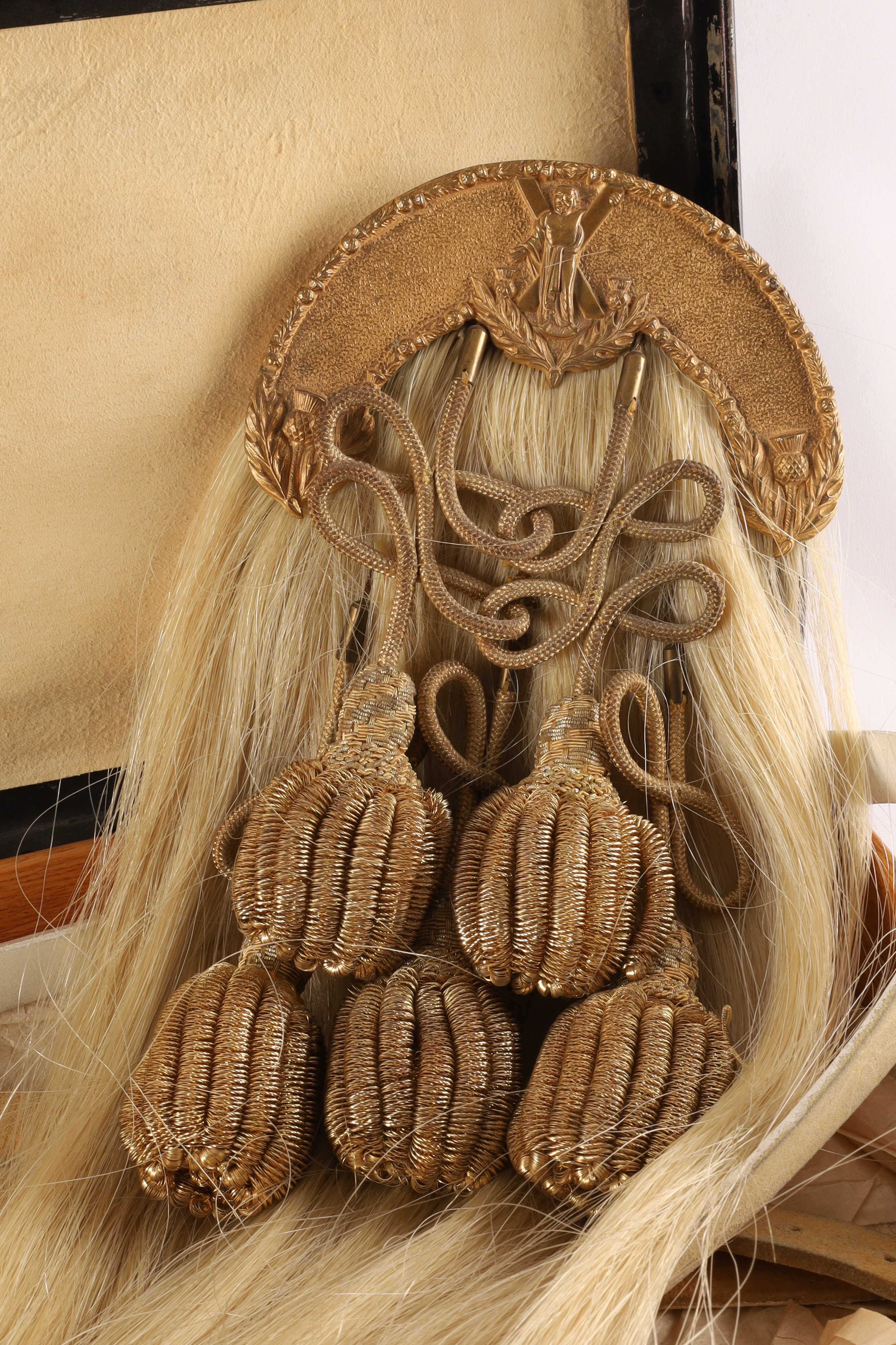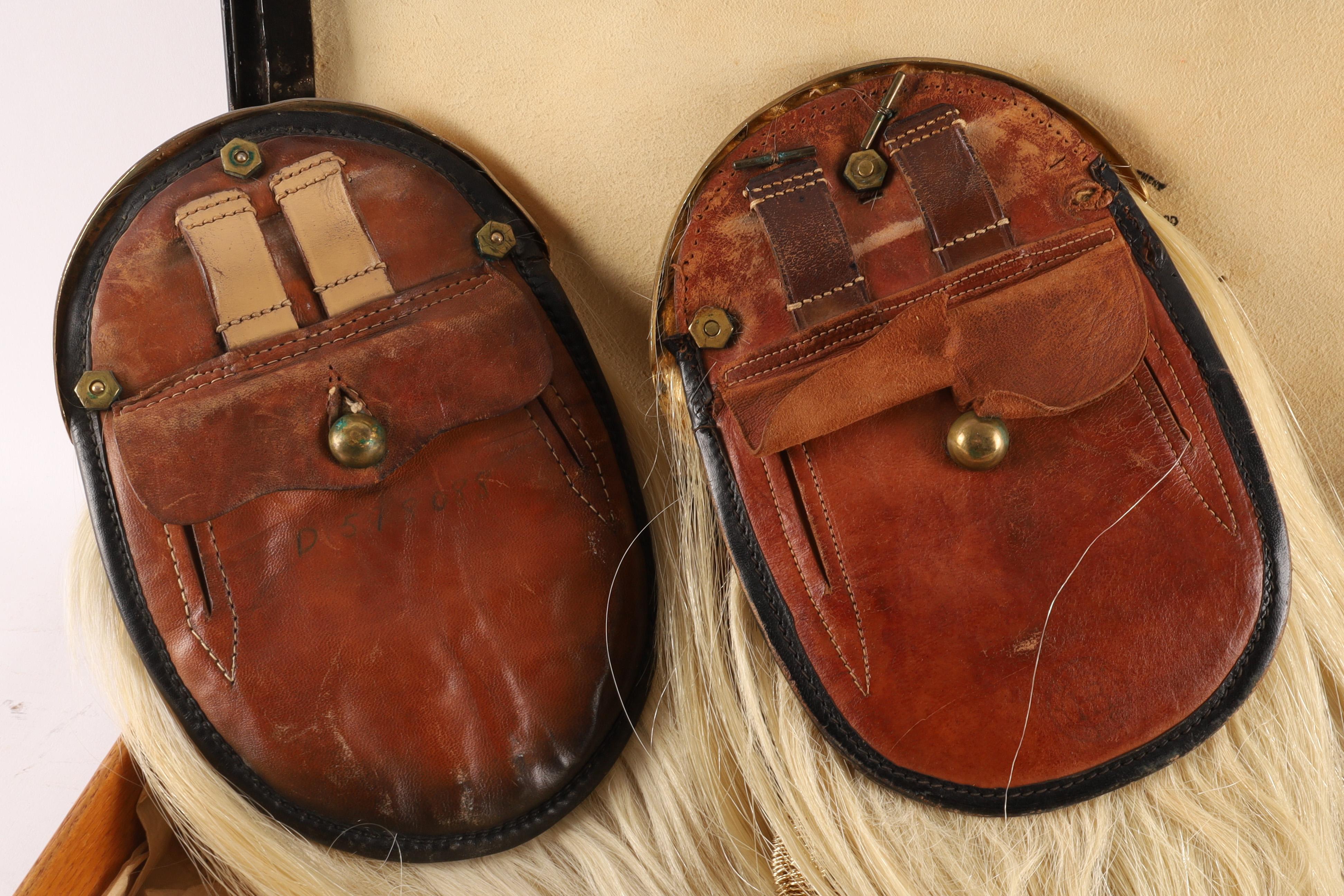 Lot of Two Antique Montreal WWI Era Scottish Sporrans for Black Watch. One sporran has gilt cantle with raised thistle edge and St Andrew to the center, a white horses hair body with five black horses hair tassels, emerging from plain black patent leather bells. A leather pouch to the back with two loops for the white belt. The other with officer’s dress sporran with five knotted gold bullion tassels. Both measuring 18 inches L x 7 W with 40 inch L leather belts. In protective case measuring 22 x 9 x 3 inches.