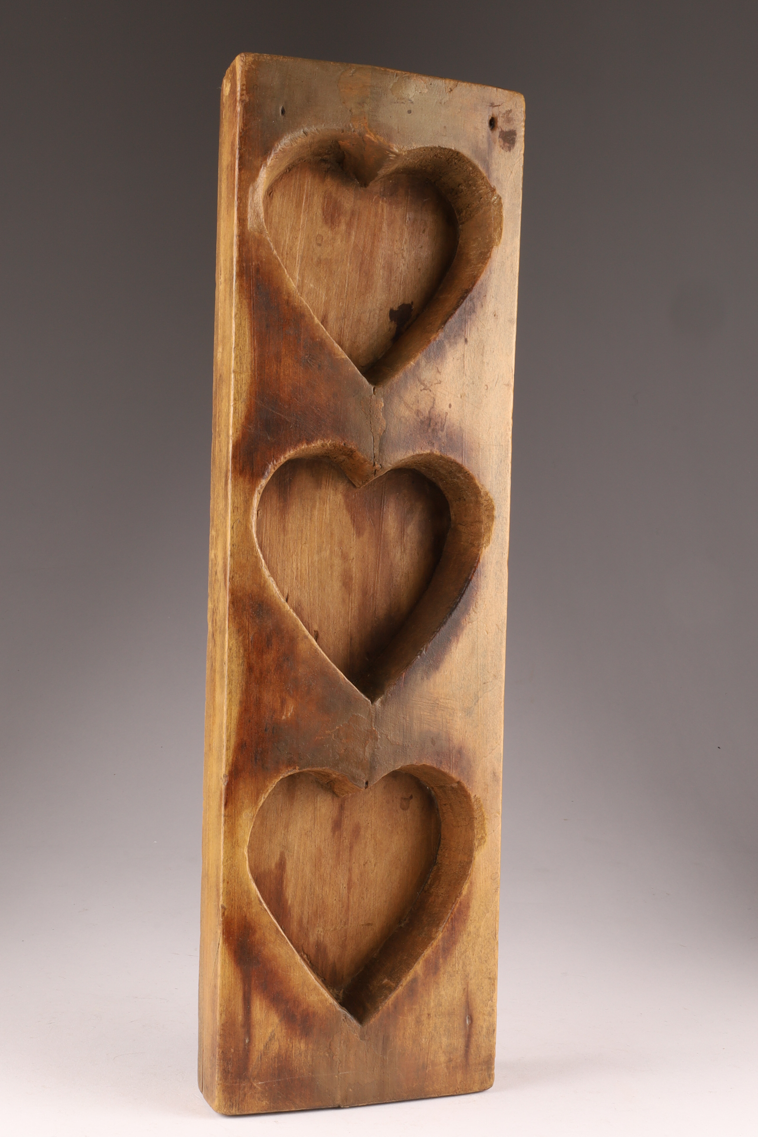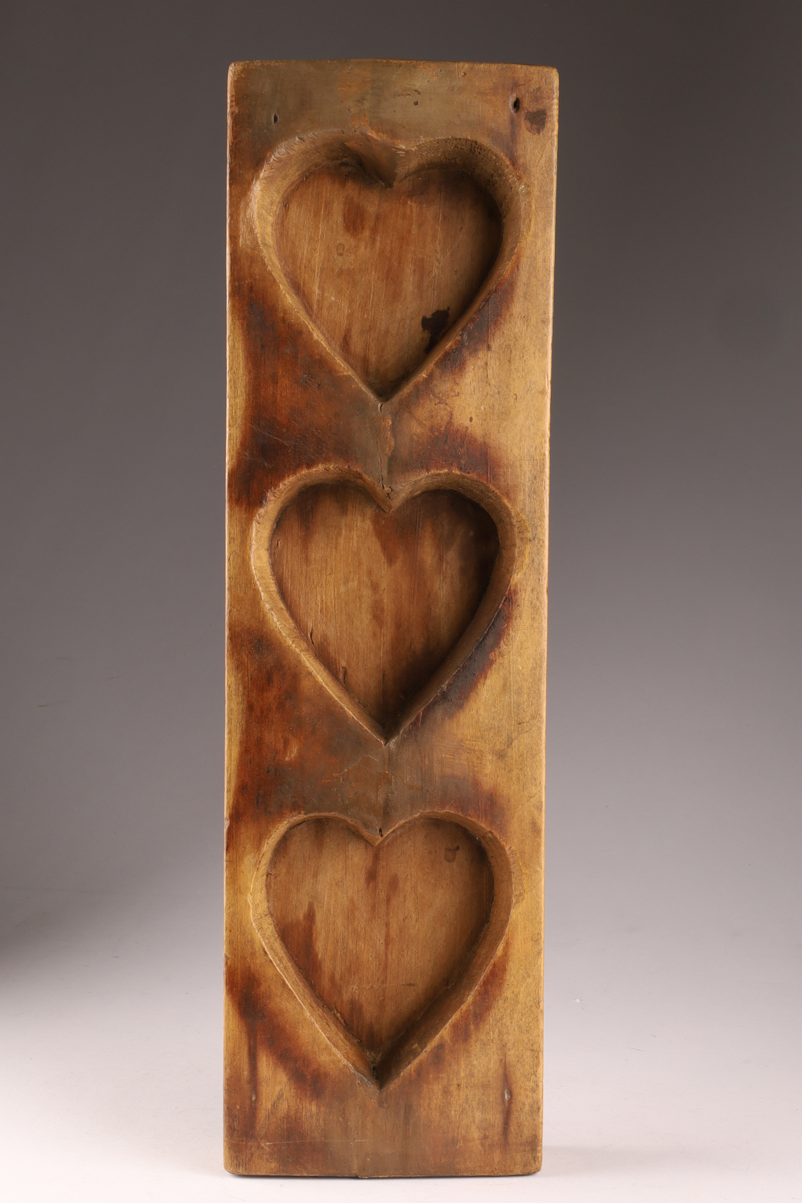 Late 19th C Quebec Maple Sugar Mold, Hearts. Three carved hearts in a wood frame measuring 15.5 x 4.75 x 1.5 inches.
