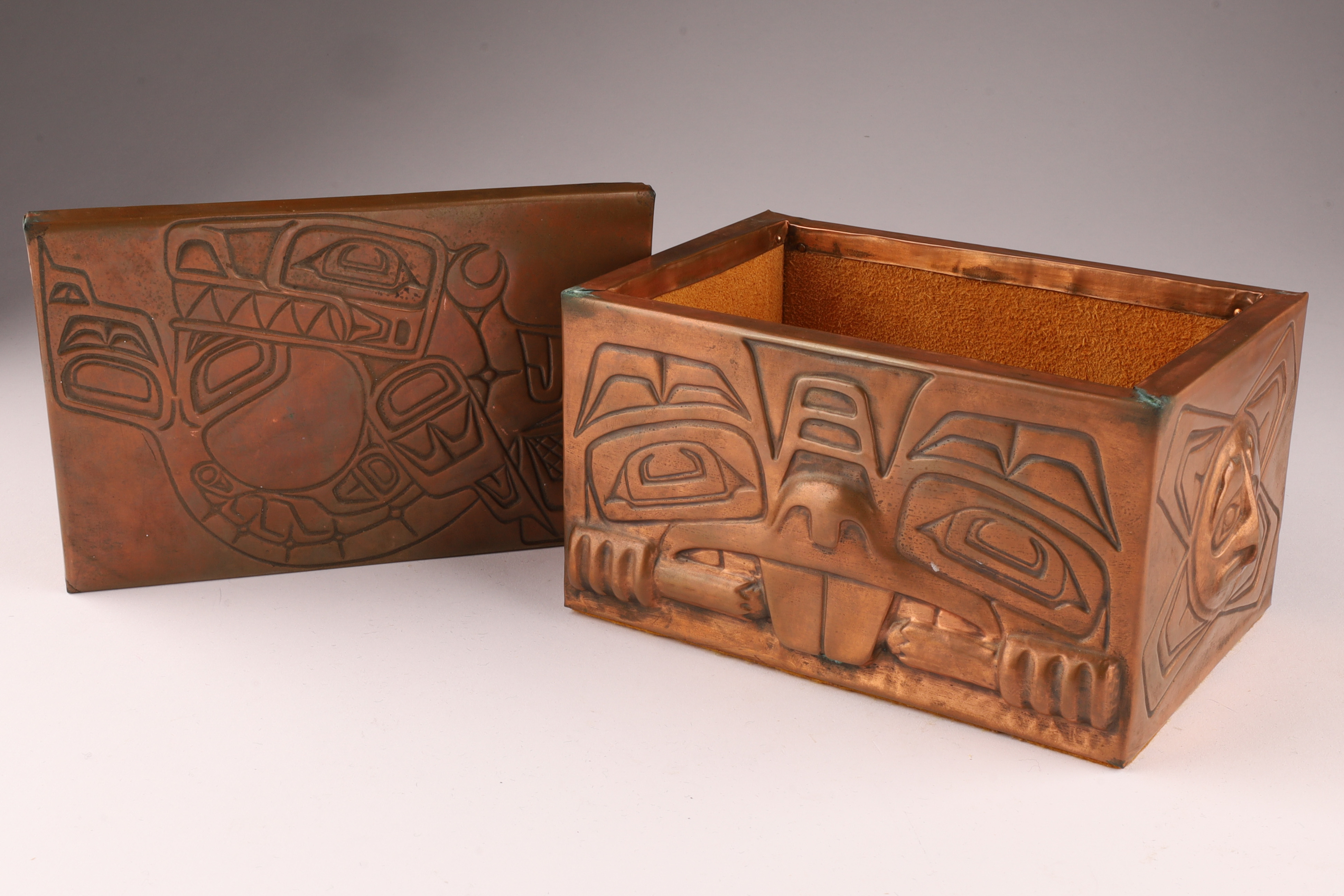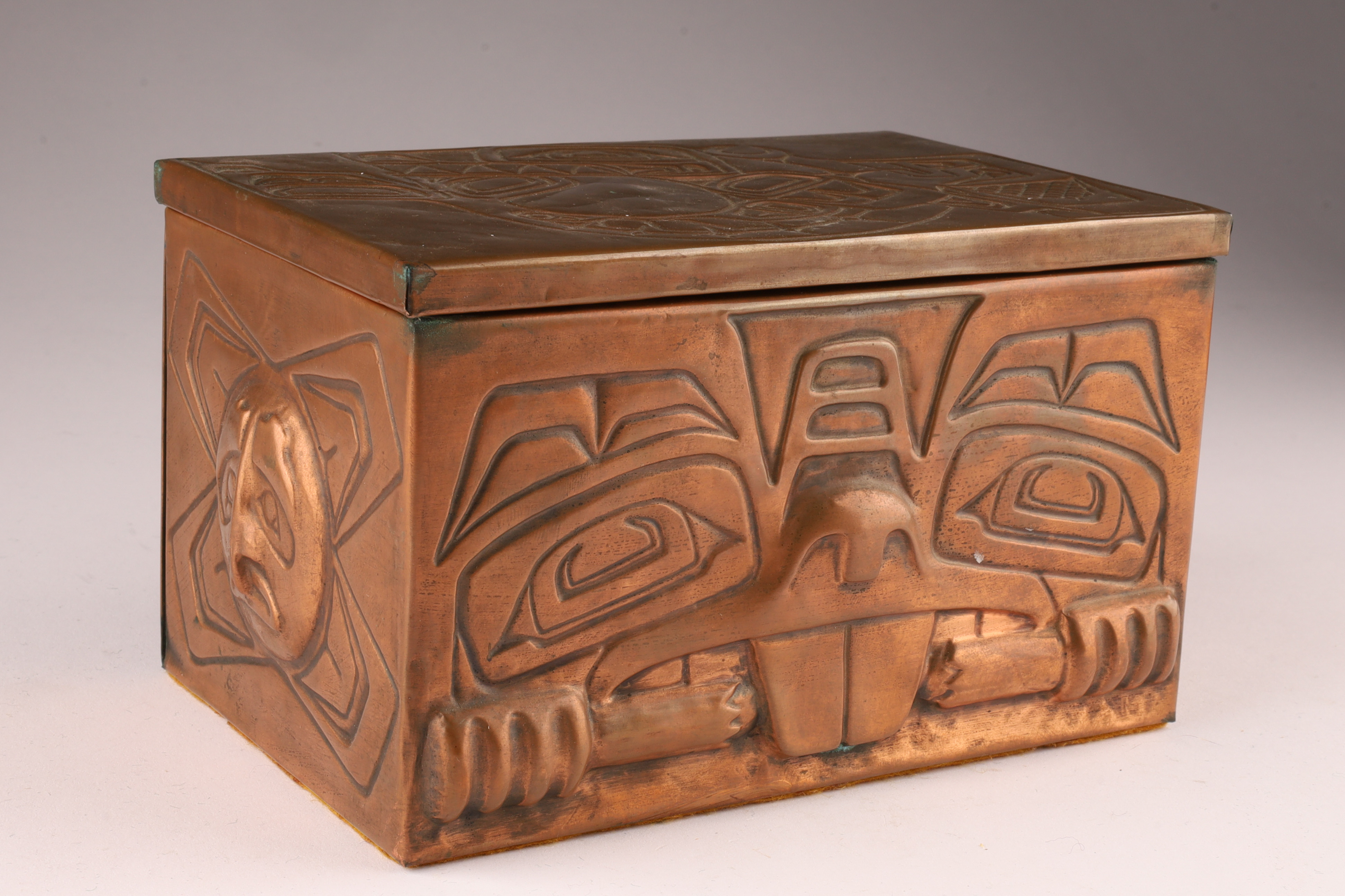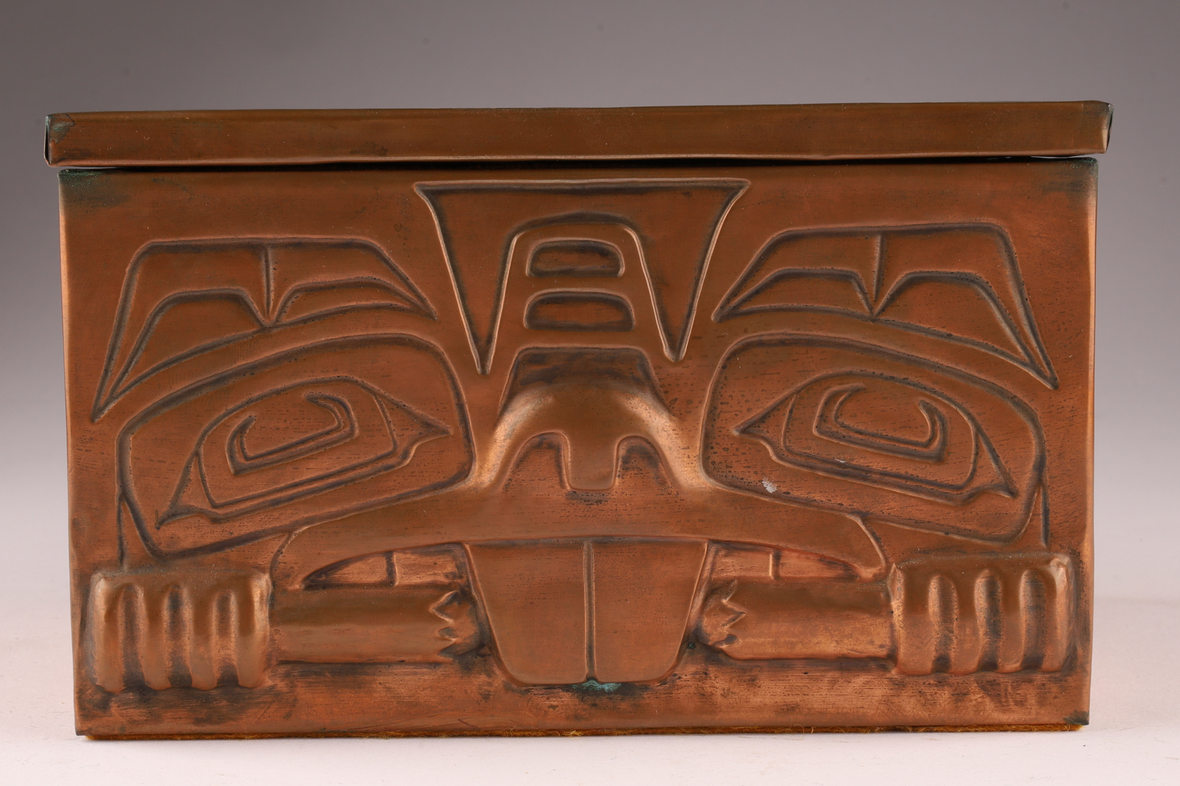 Haida Northwest Coast Copper Repousse Lidded Box decorated with a Beaver with faces on teh sides. 3.75 inches H x 6 W x 4 deep.
