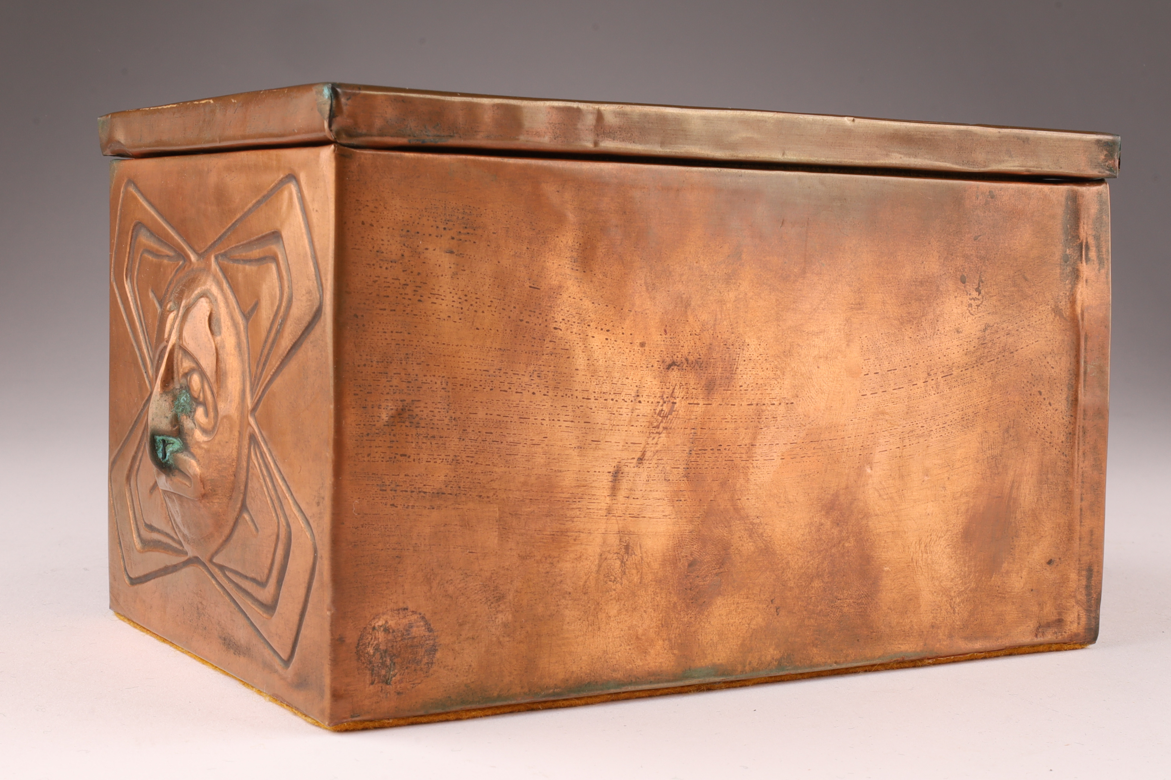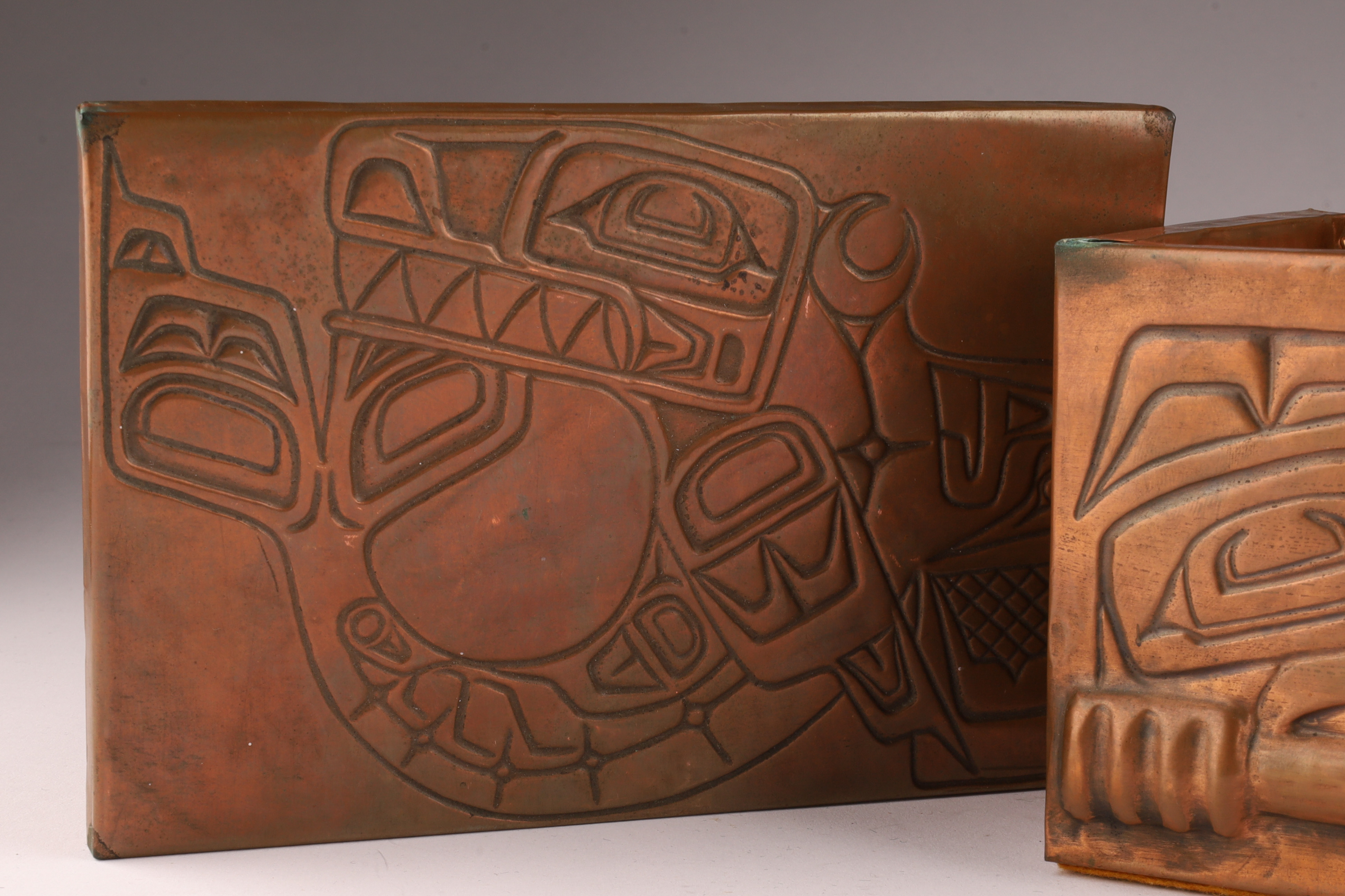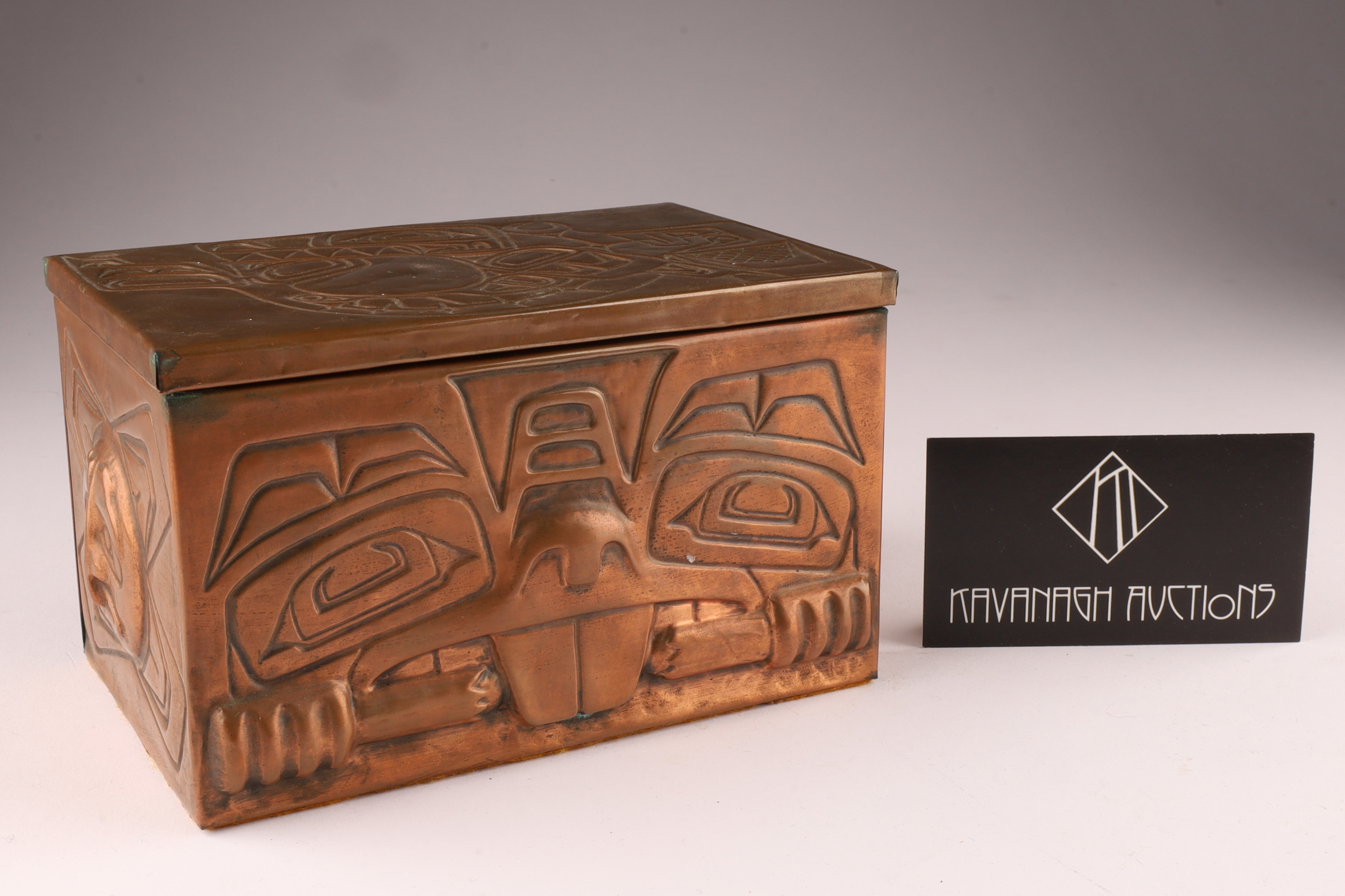 Haida Northwest Coast Copper Repousse Lidded Box decorated with a Beaver with faces on teh sides. 3.75 inches H x 6 W x 4 deep.