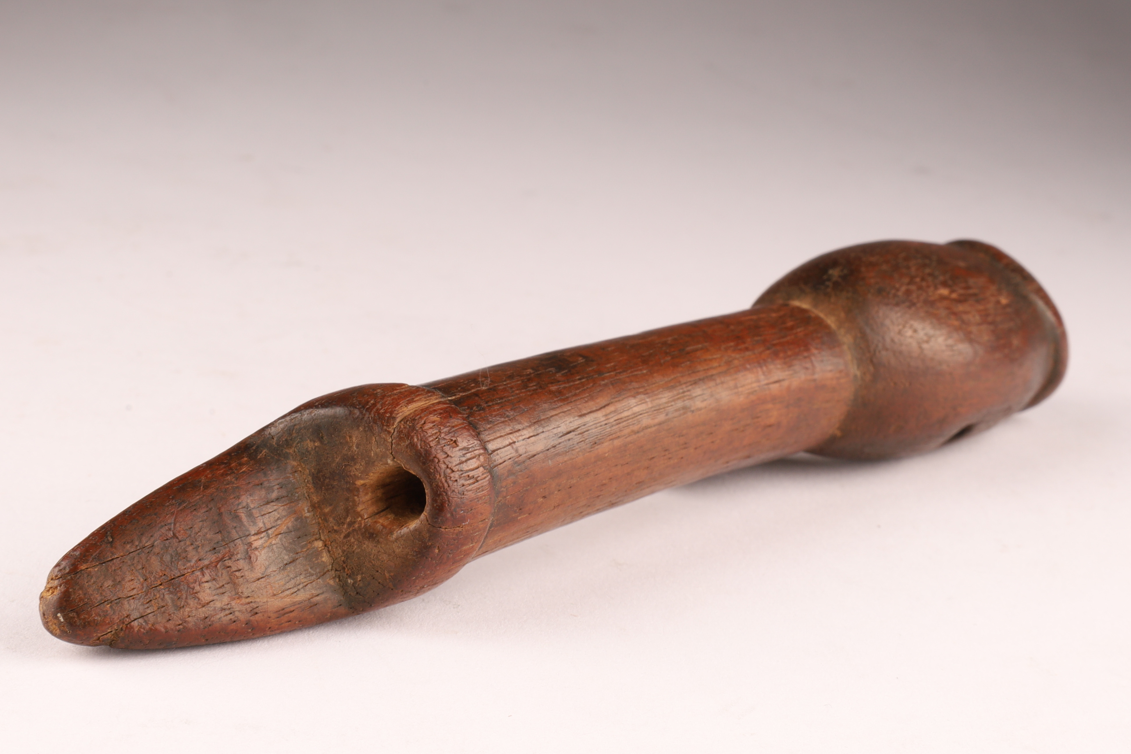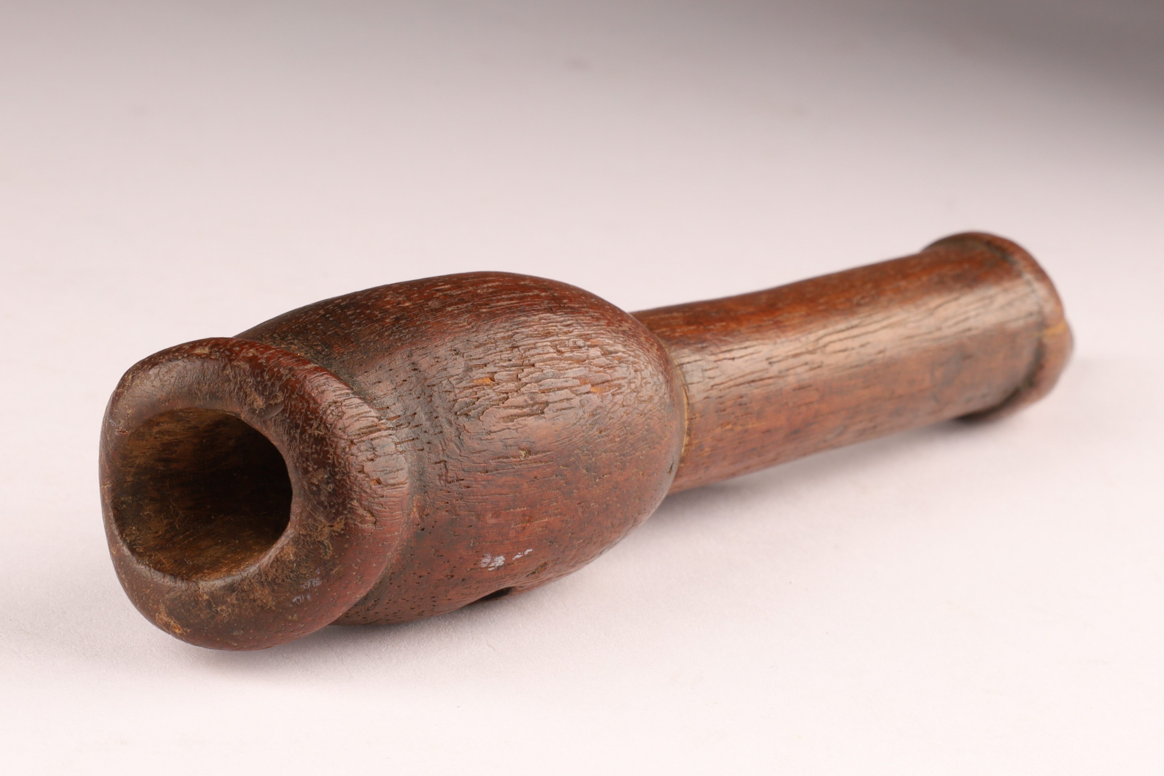 Carved hardwood pipe stem with circular bowl socket, drilled side draft hole, and a small pierced lug for securing decorative elements or bindings. The tapering mouth end shows smooth wear and rich patina. Originally fitted with a removable pipestone or clay bowl. A well-preserved example of a personal-use pipe stem from the Plains or Eastern Woodlands tribal regions.