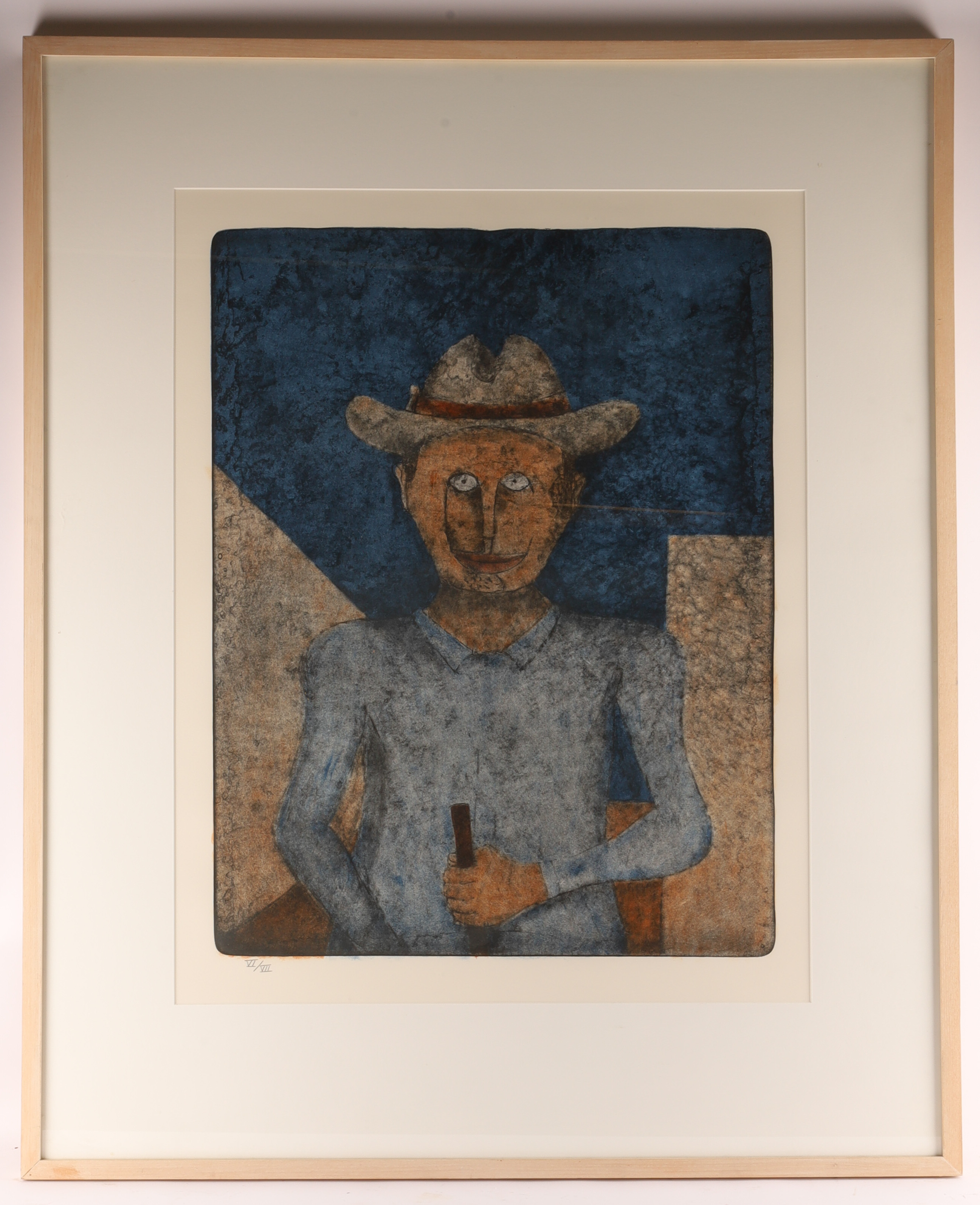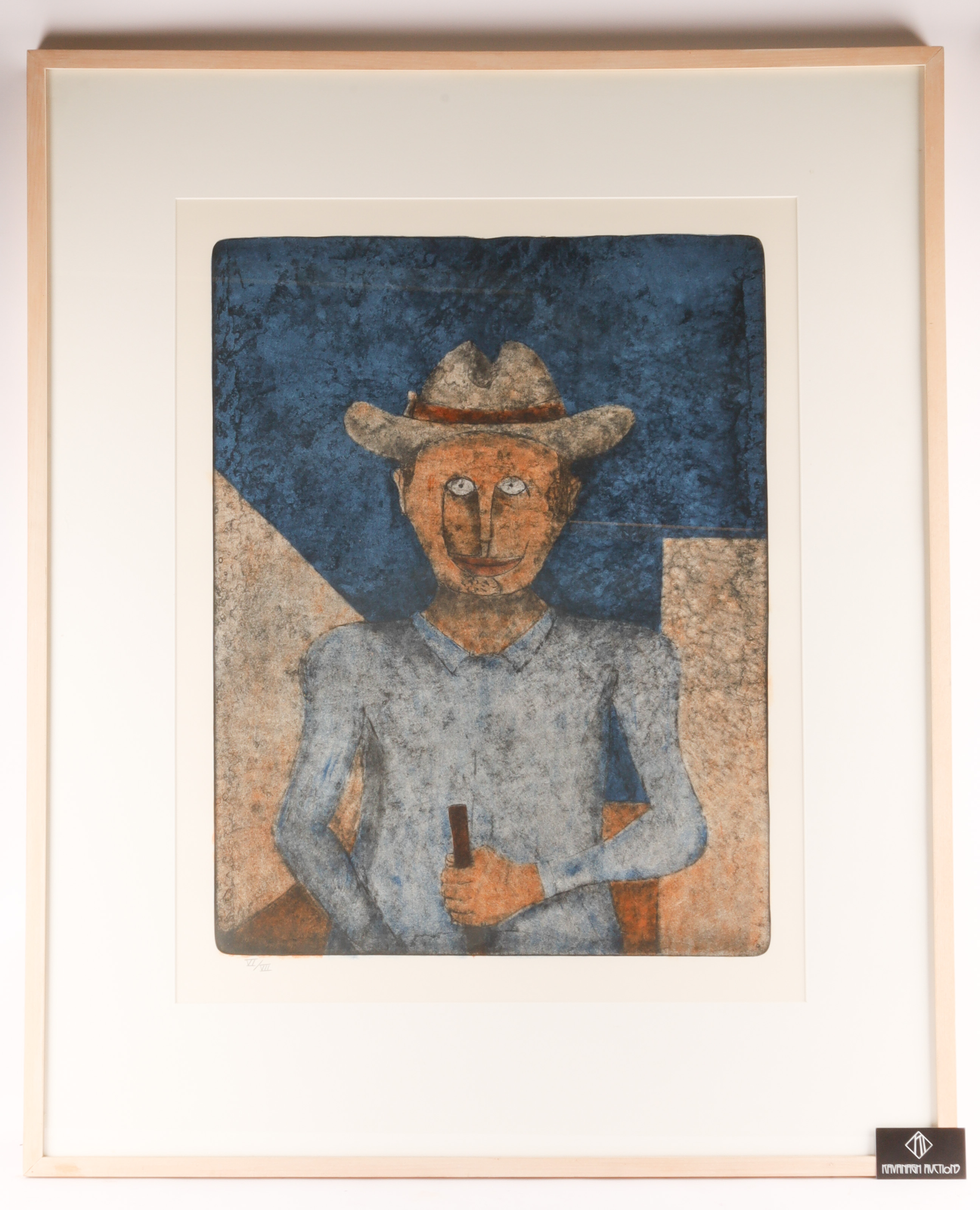 A rare small-edition Mixografía from Tamayo’s mature period, depicting a stylized male figure with a broad hat set against a richly textured blue and ochre background. The monumental simplicity of the figure, the geometric facial structure, and the granular surface texture are hallmarks of Tamayo’s late printmaking, executed in collaboration with the Remba Workshop. The exceptionally small edition of XIII suggests a special project or a limited workshop series.