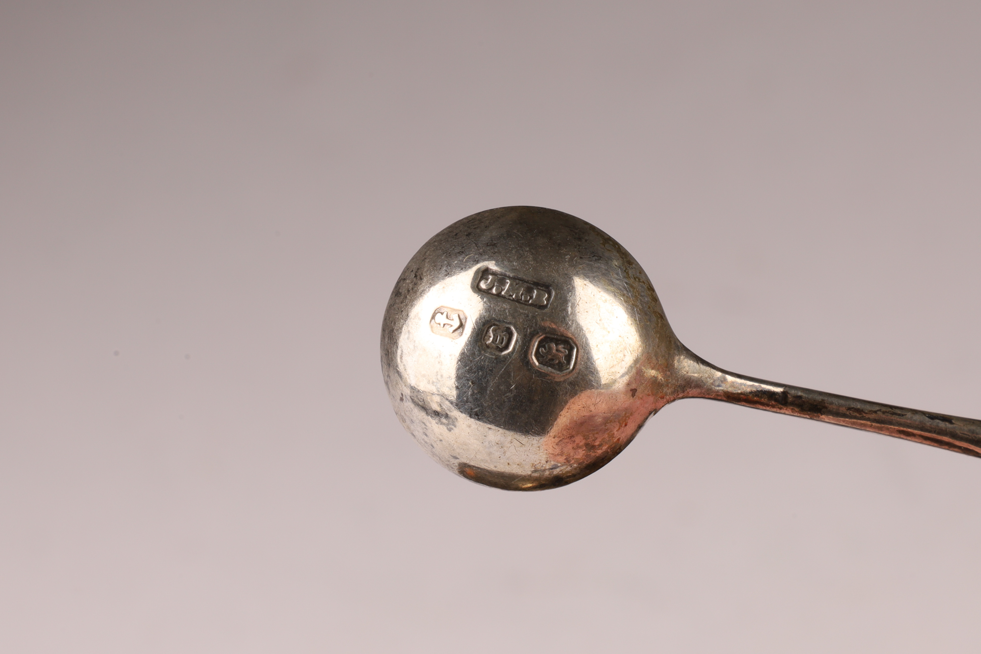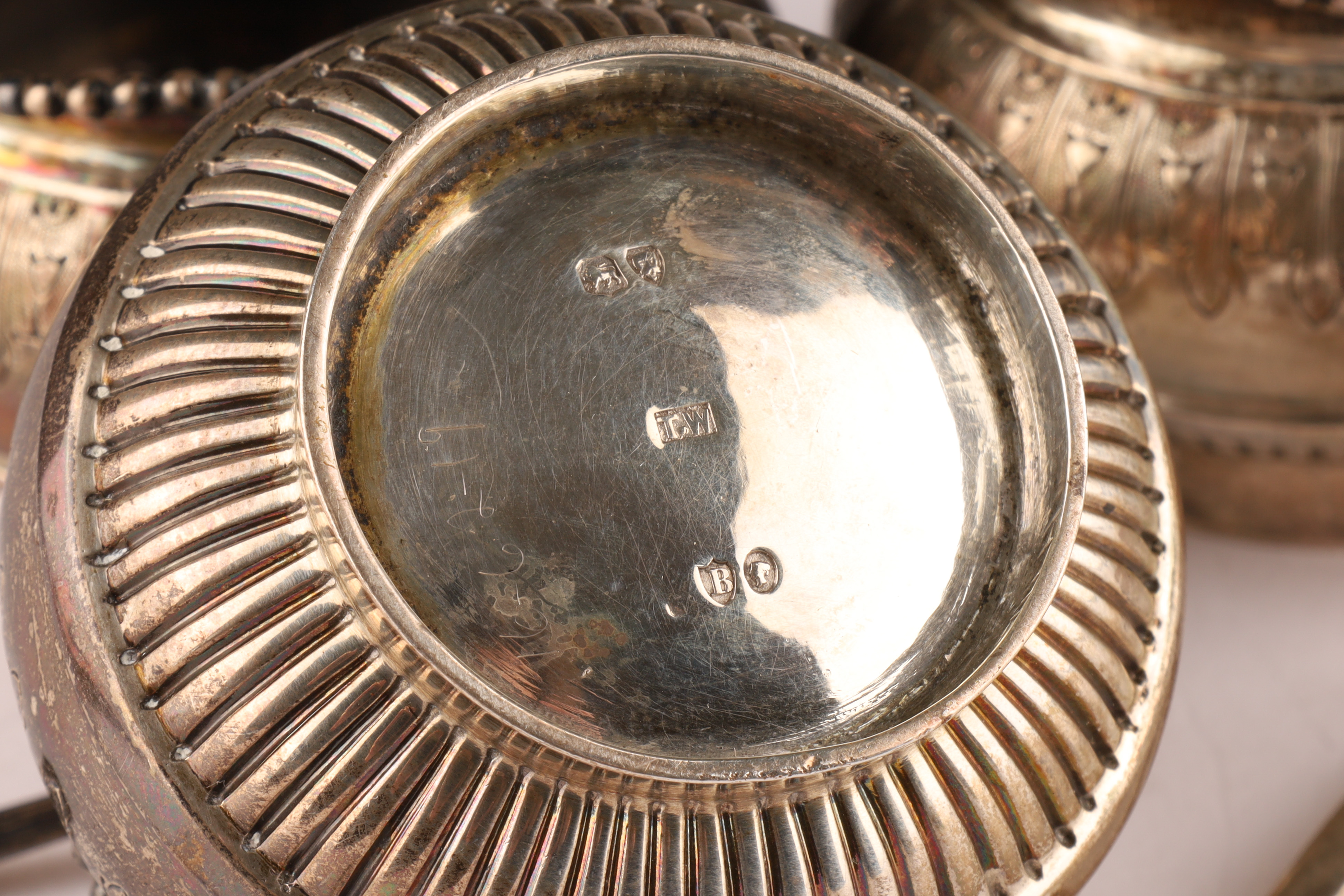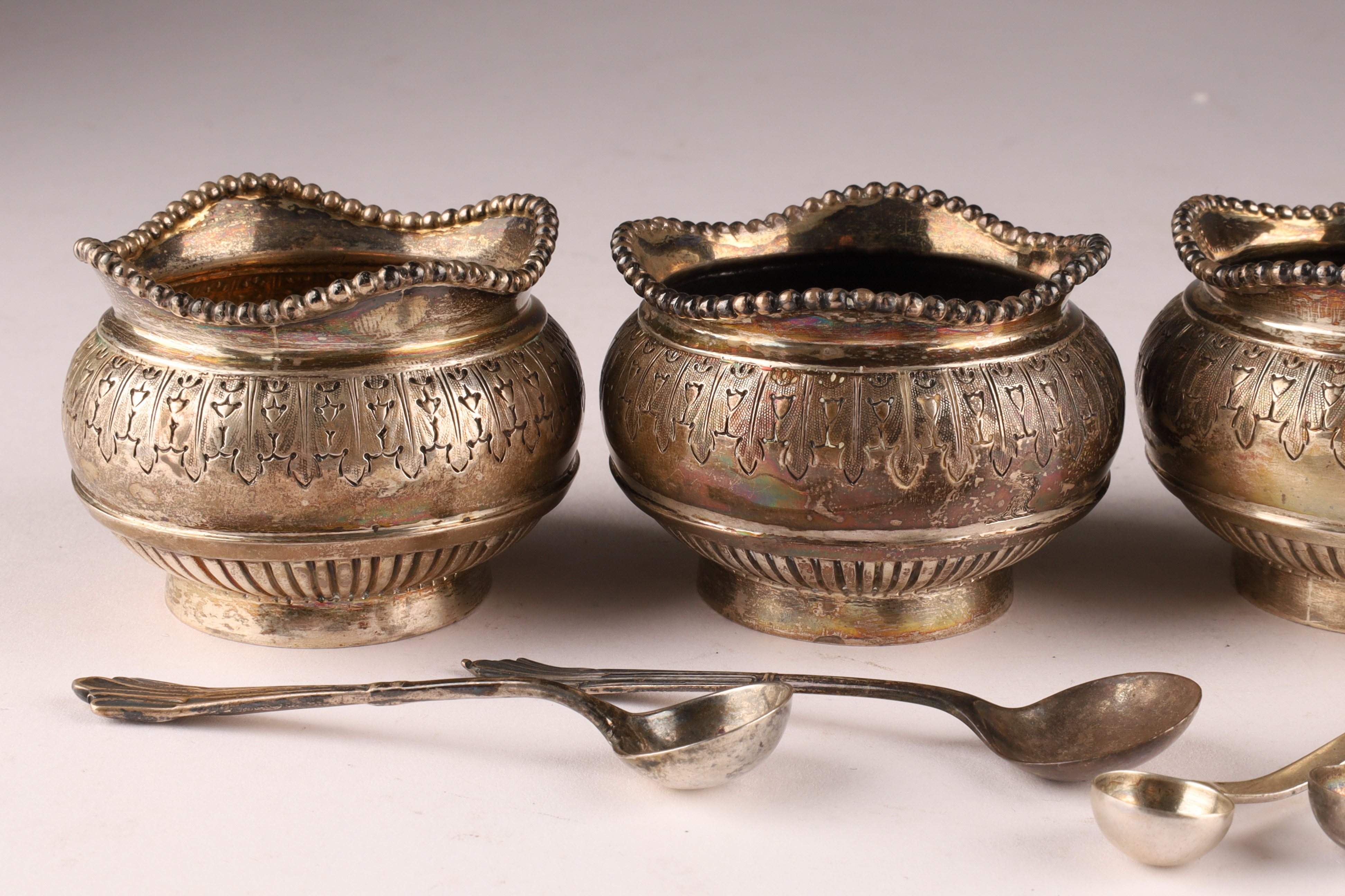 Set of 4 19th C London Silver Salts, Thomas Wheeler 1877. Gadrooned urns with chased acanthus leaf decoration, with five spoons, measuring 197.7 grams total weight, 1.5 inches H x 2 W.