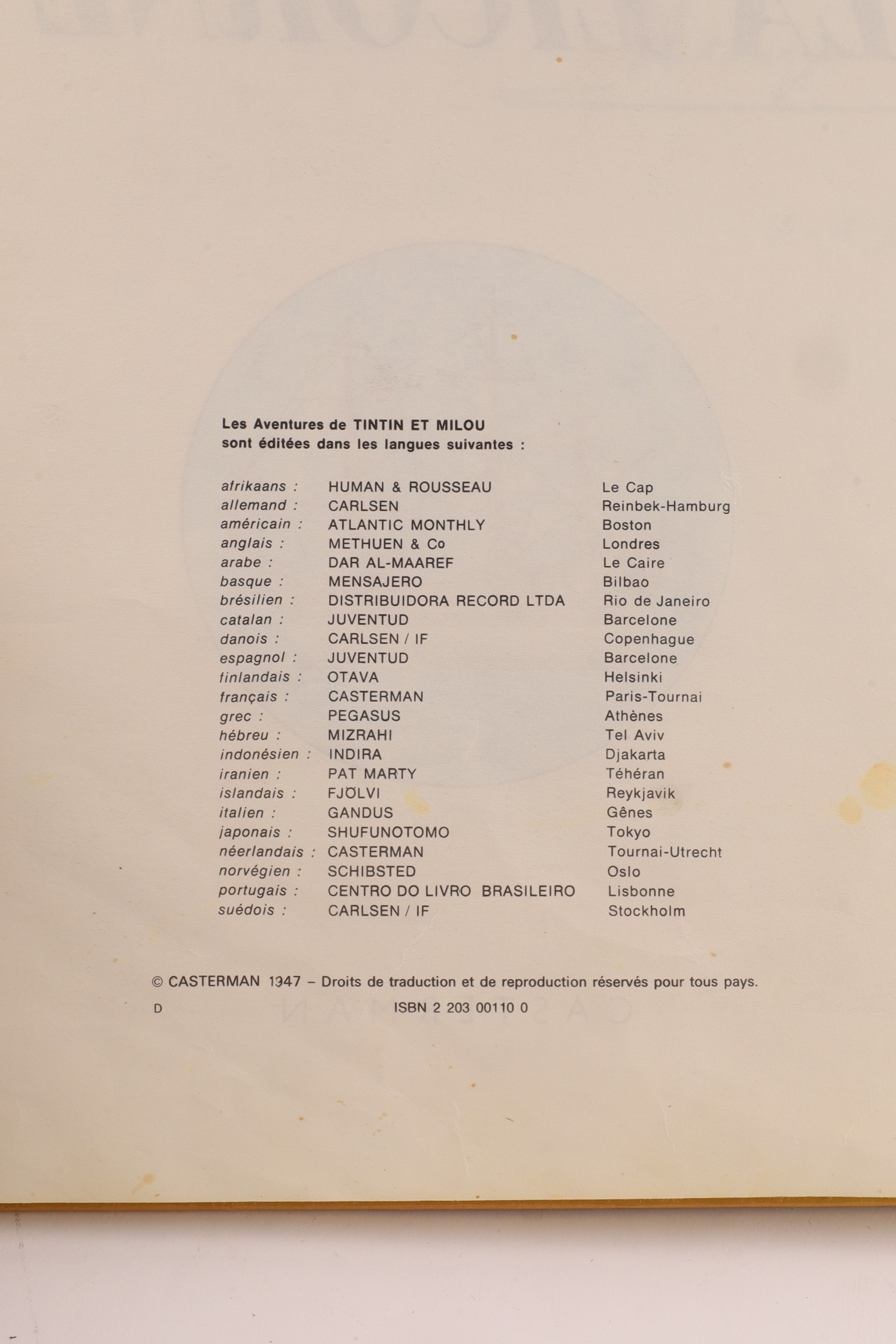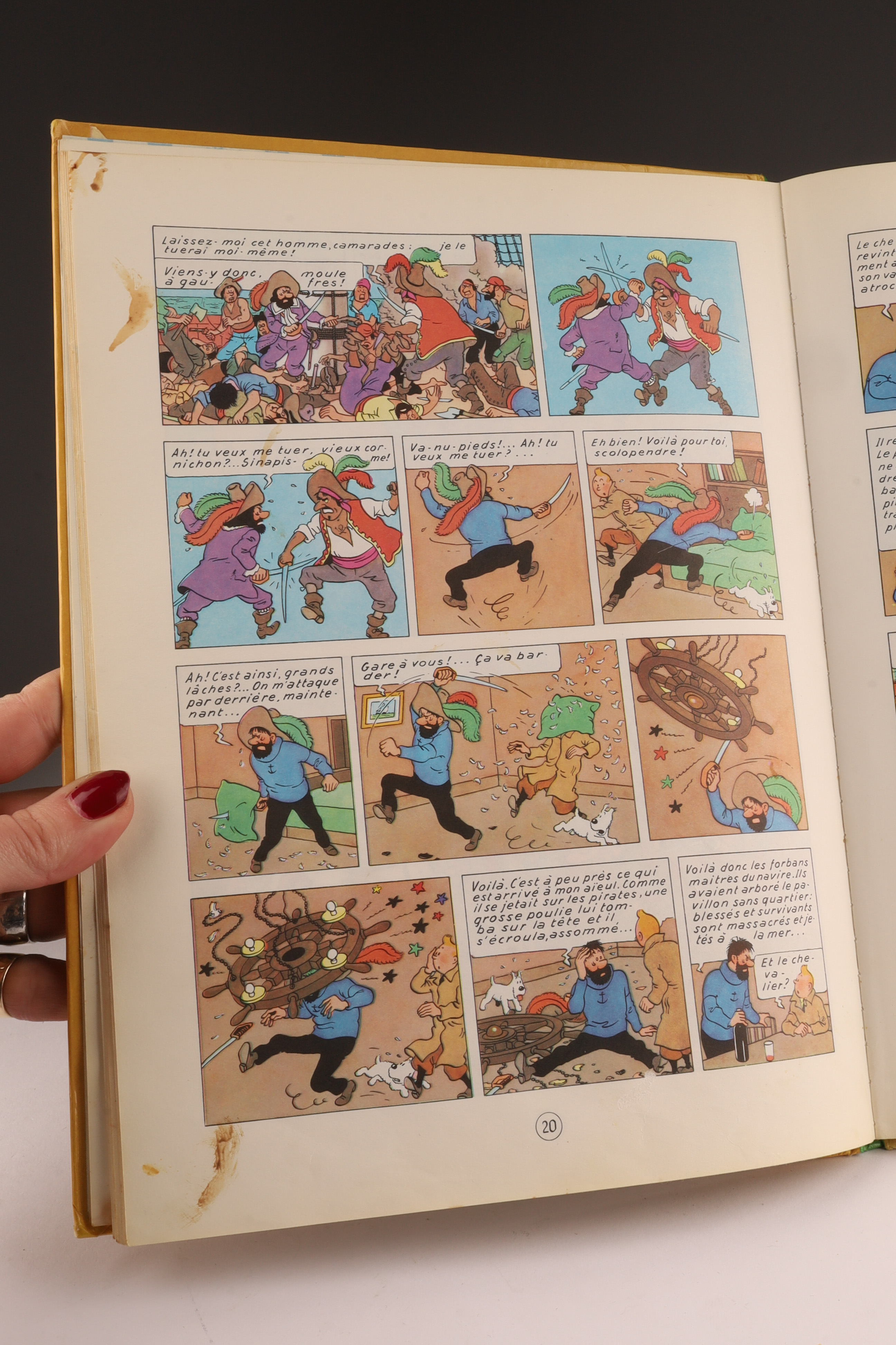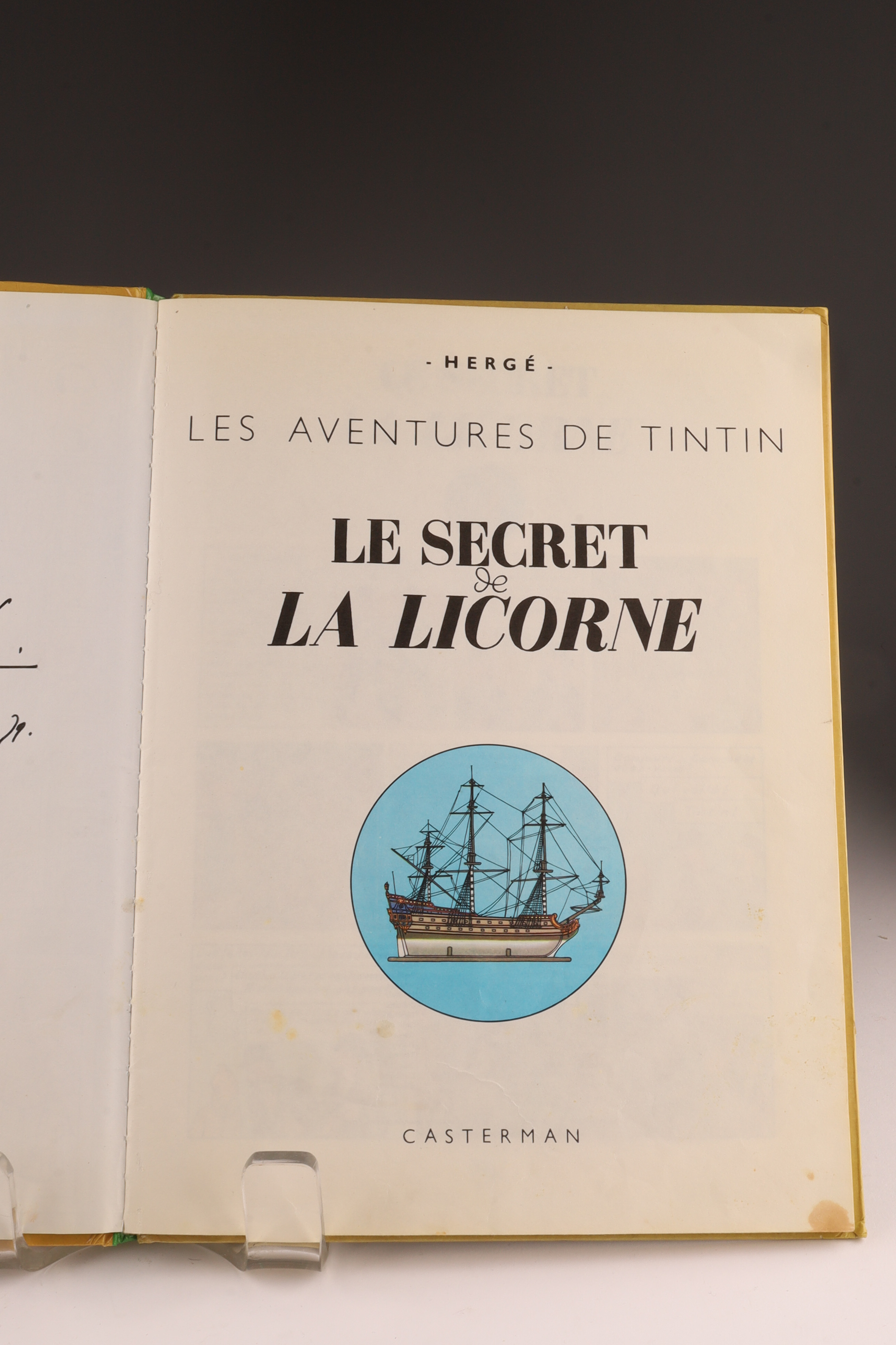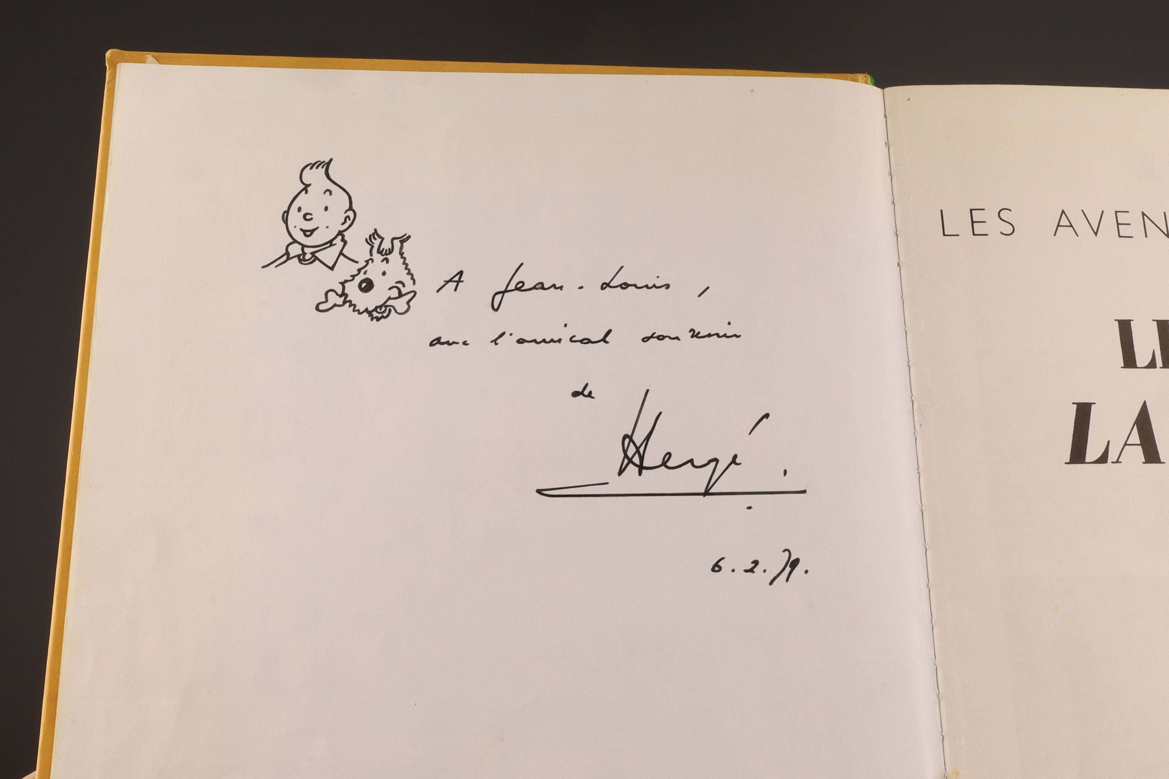 Signed and Inscribed iwth Drawing, Herge Les Aventures de Tintin, Le Secret La Licorne 1947. Inscription dated 1979. Some staining to pages, wear to spine. Measuring 12 x 9 inches.