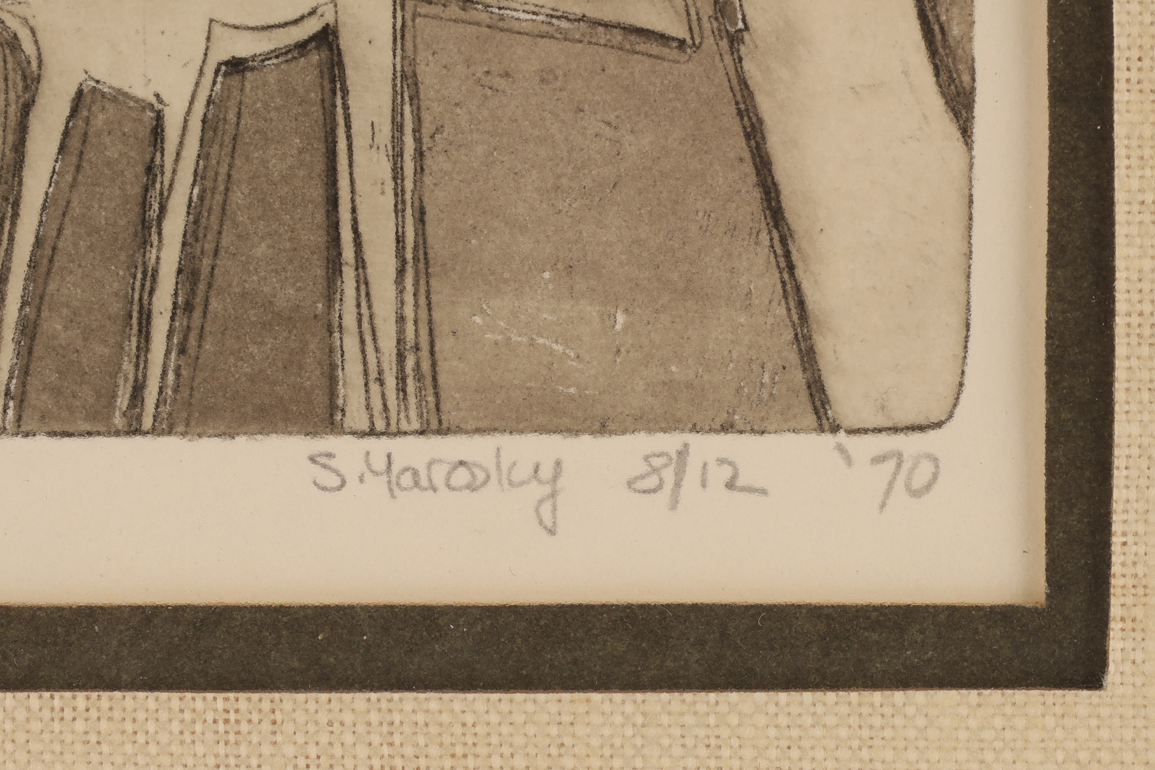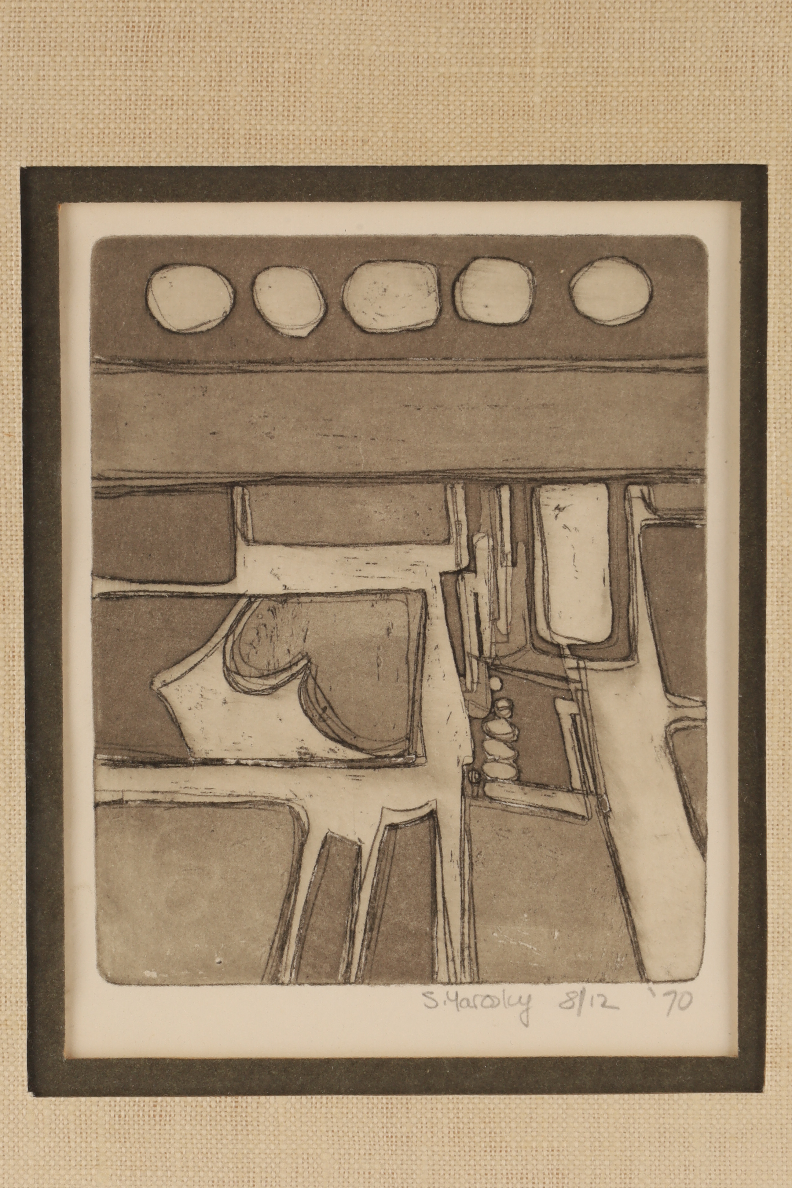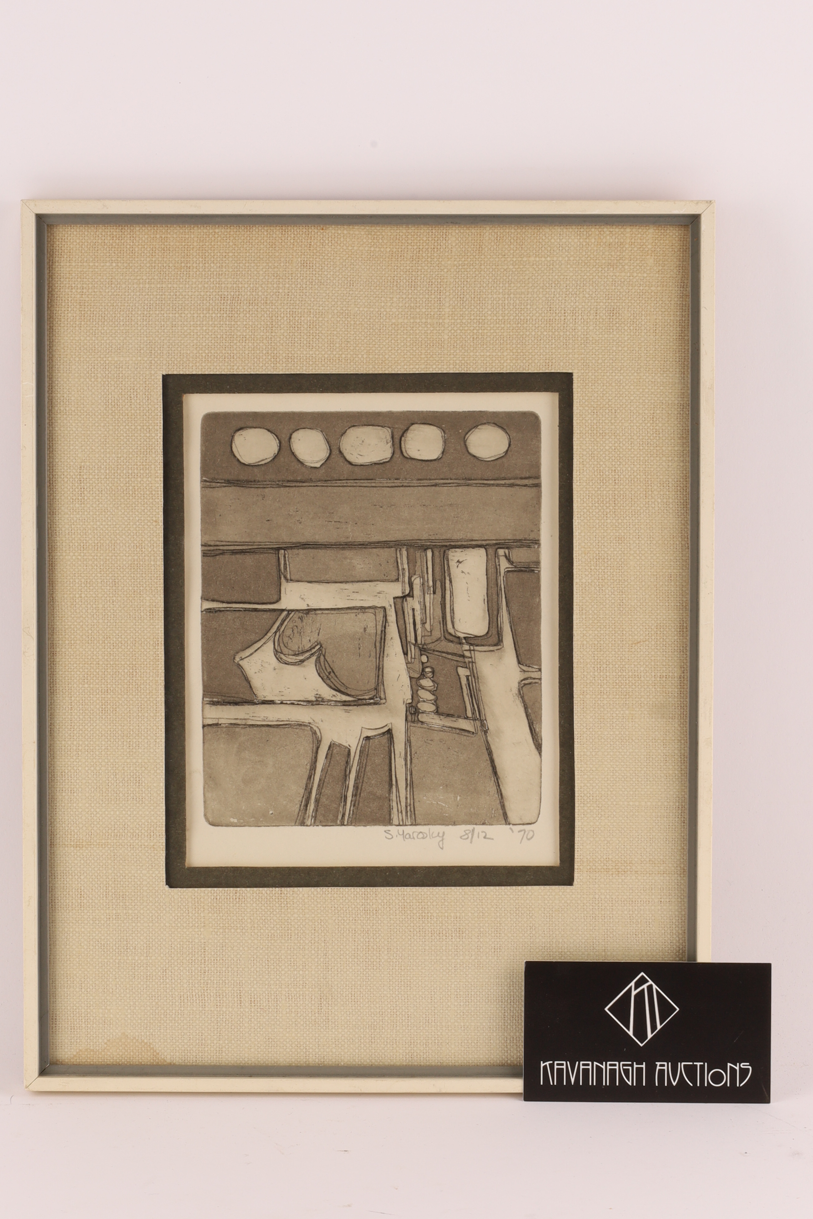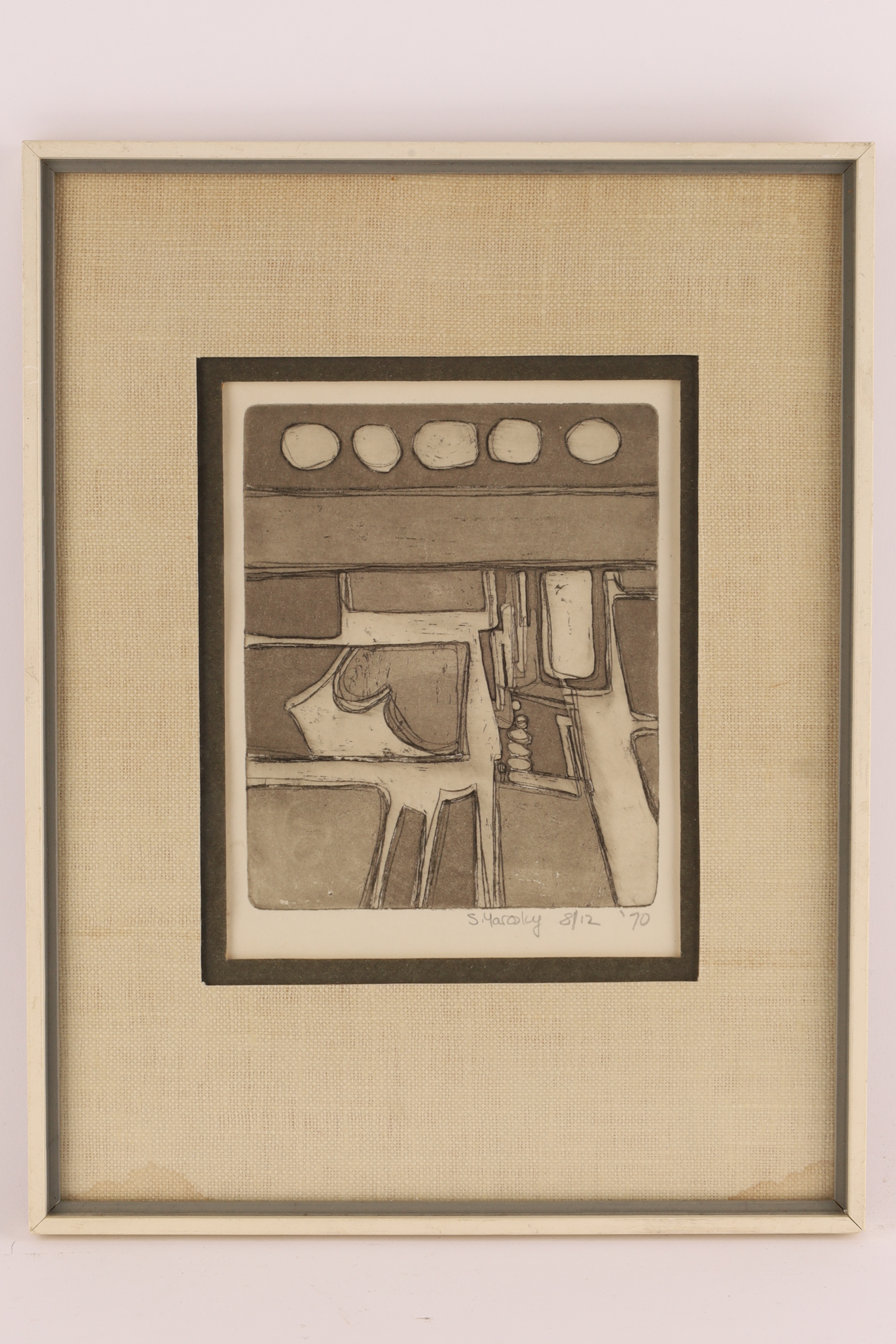 Signed Mid Century Modern S. Yarosky Abstract Engraving. Numbered 8/12, dated 1970 in pencil. Measuring 6.75 x 5.25 inches W, frame measures 12.5 x 9.75 inches.