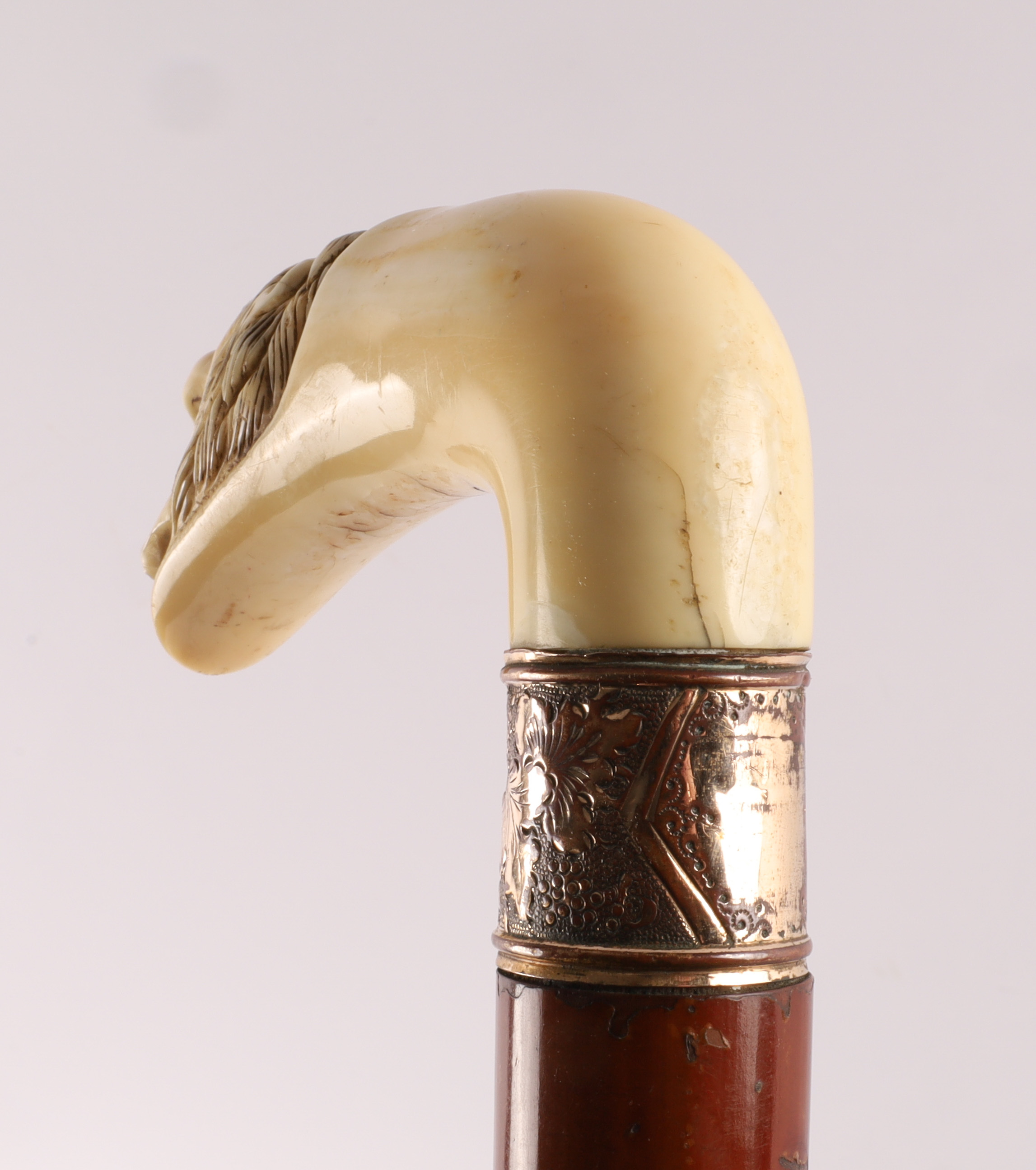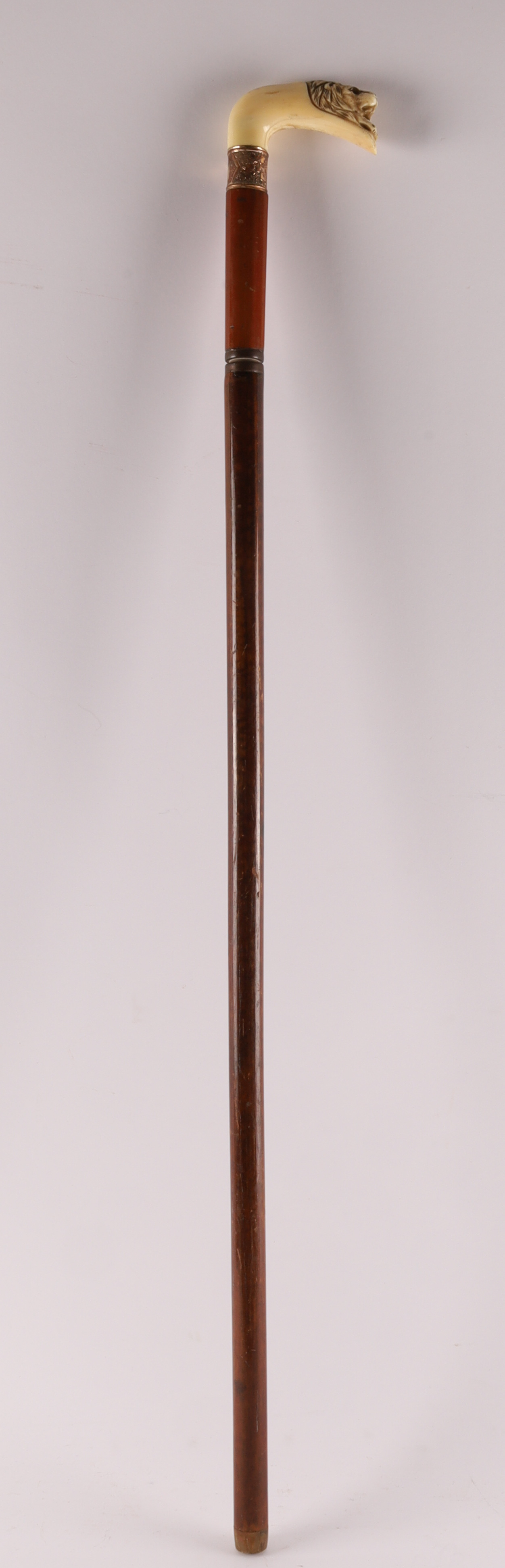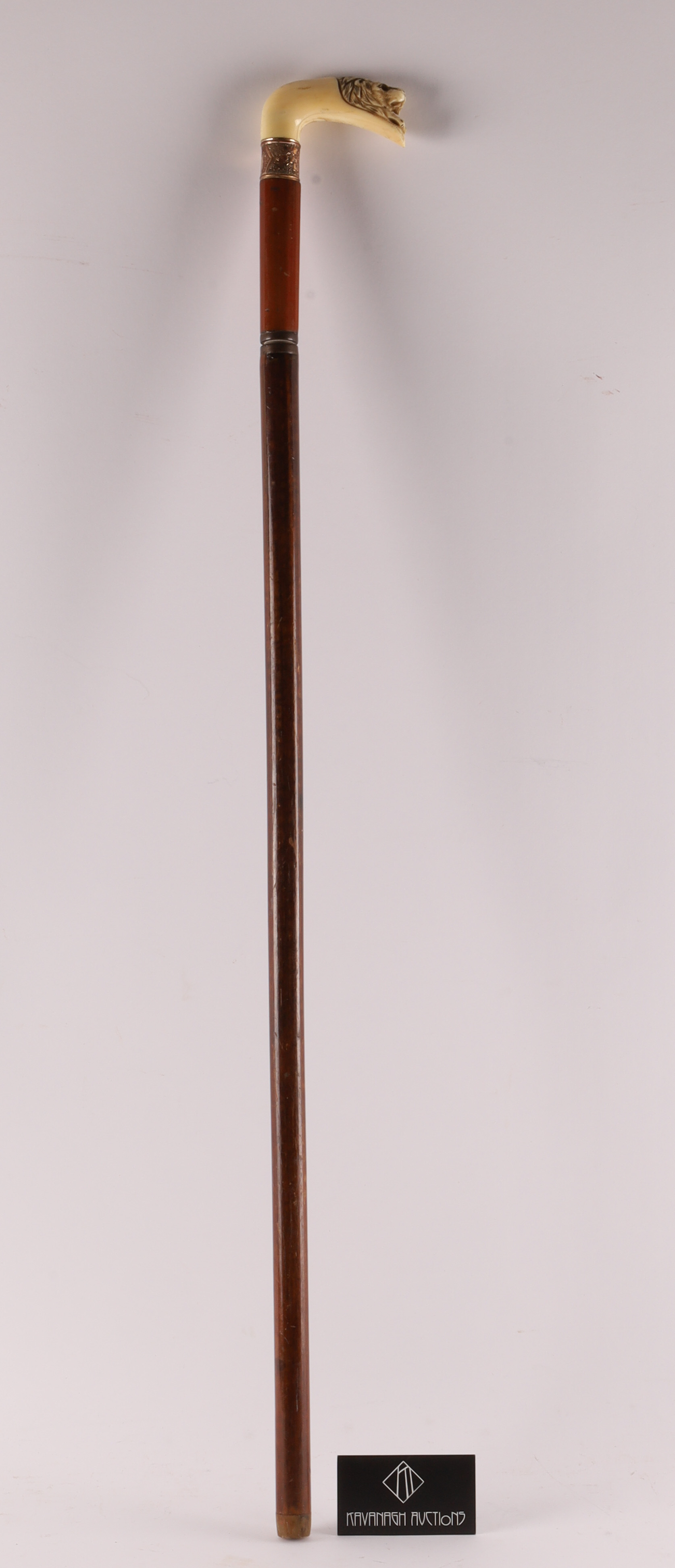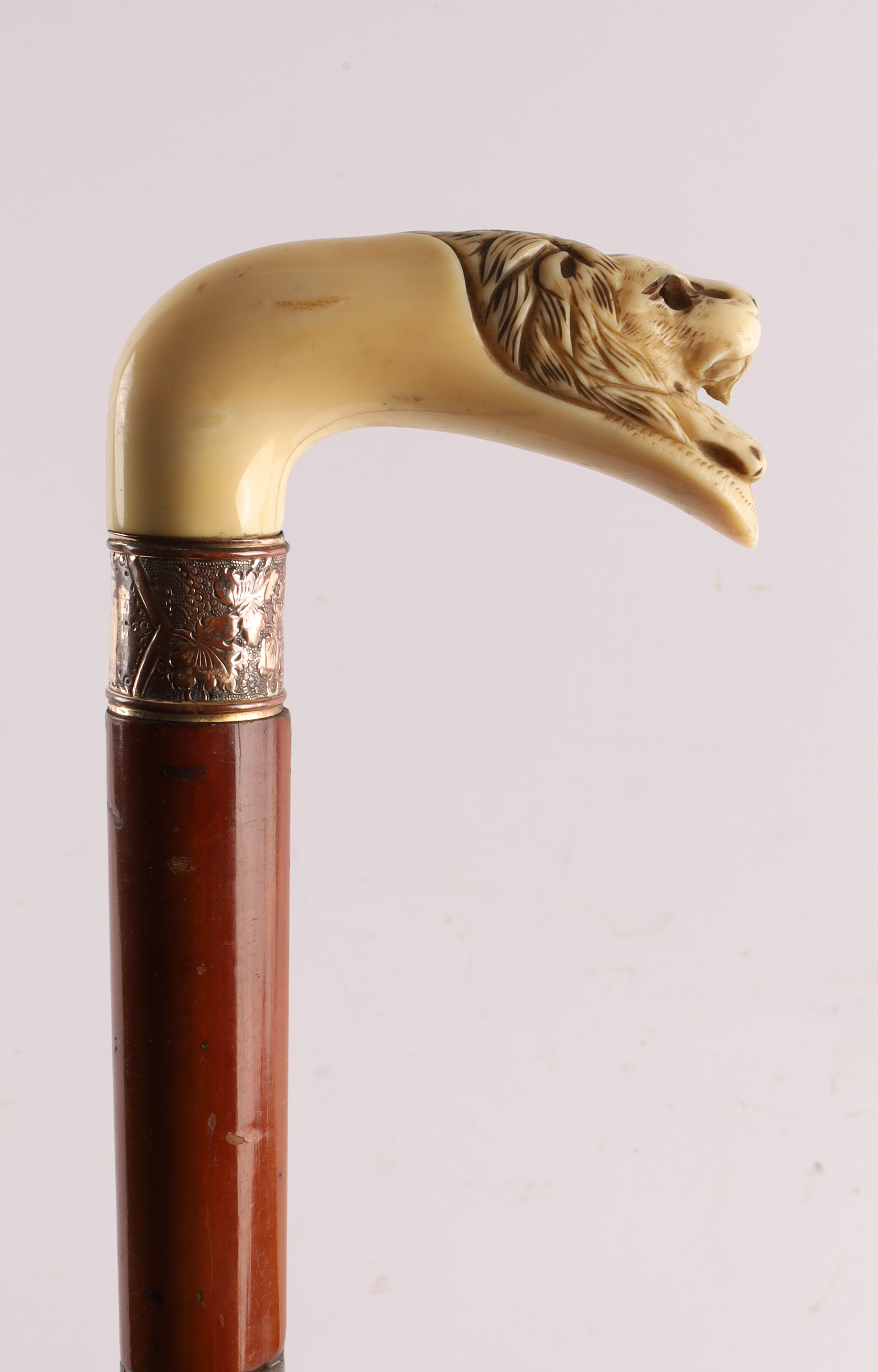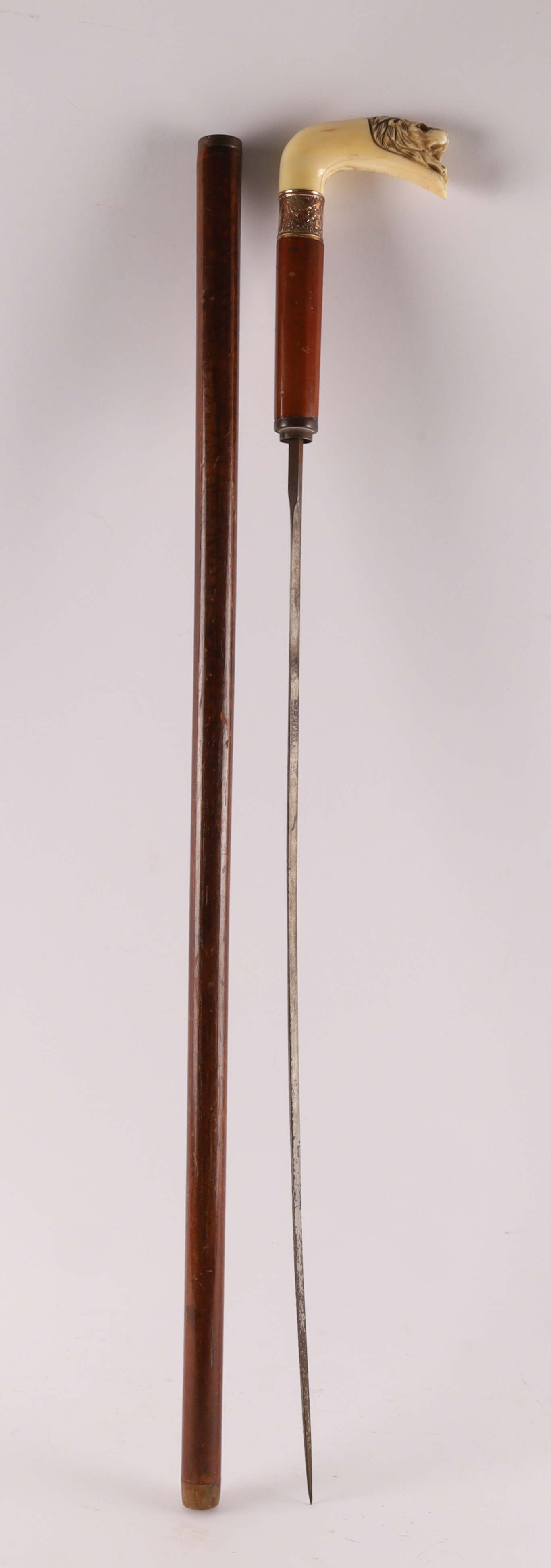 Antique 19th C Victorian Cane Walking Stick Sword, Carved Lion Handle. With gilt, engraved collar and horn ferrule, marked with an O on the blade, cane measures 37 inches L x 4 W, blade measures 23.5 inches. THIS ITEM CANNOT BE EXPORTED FROM CANADA.