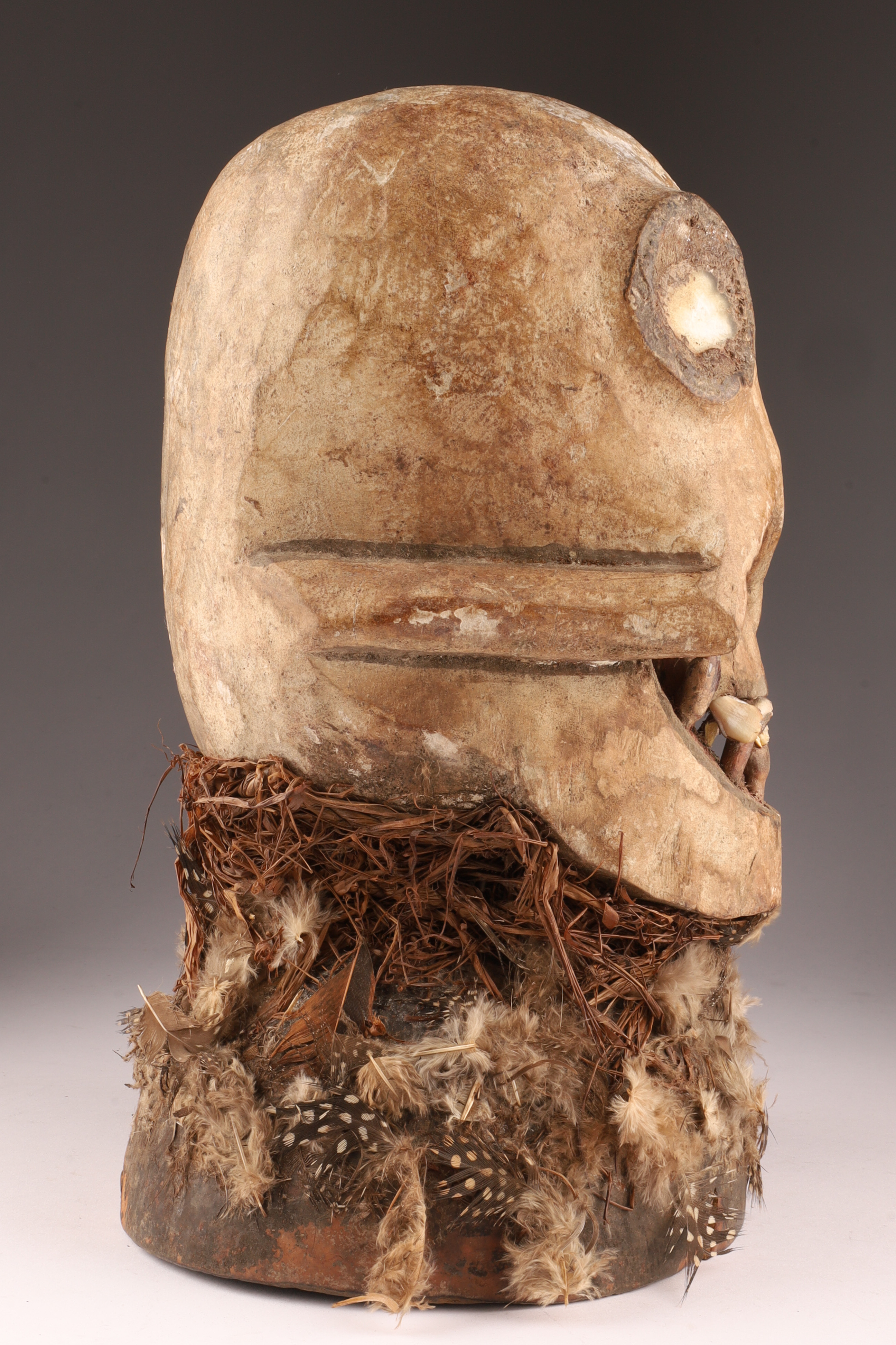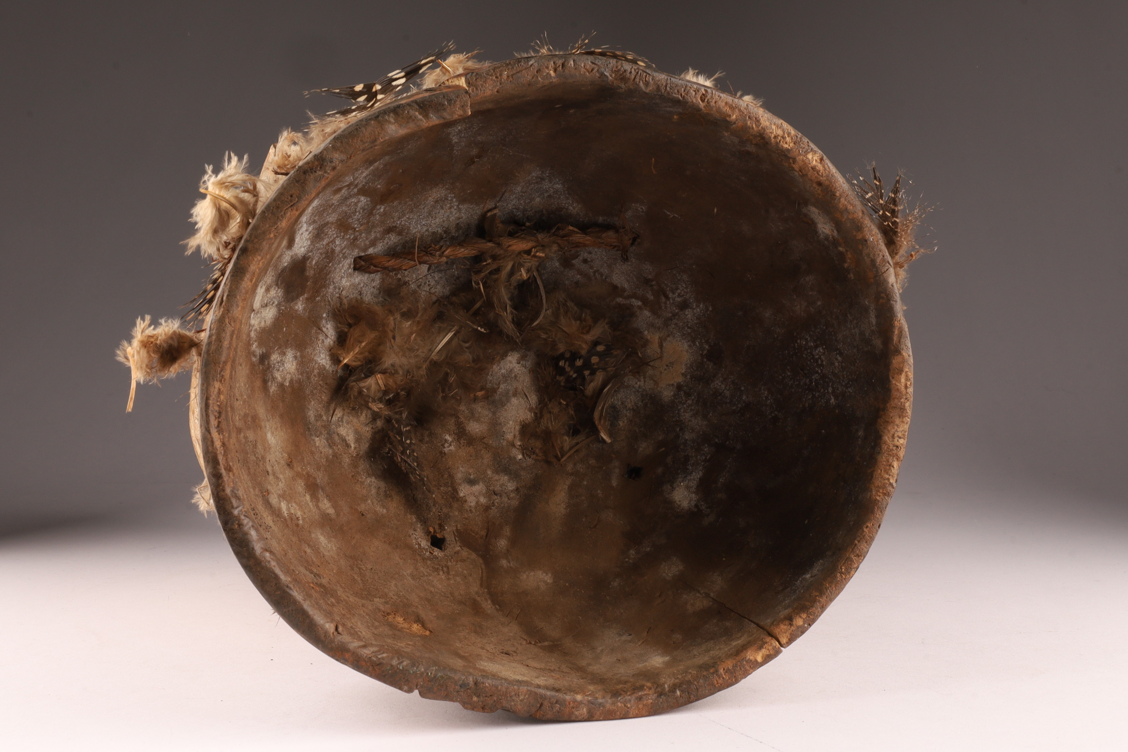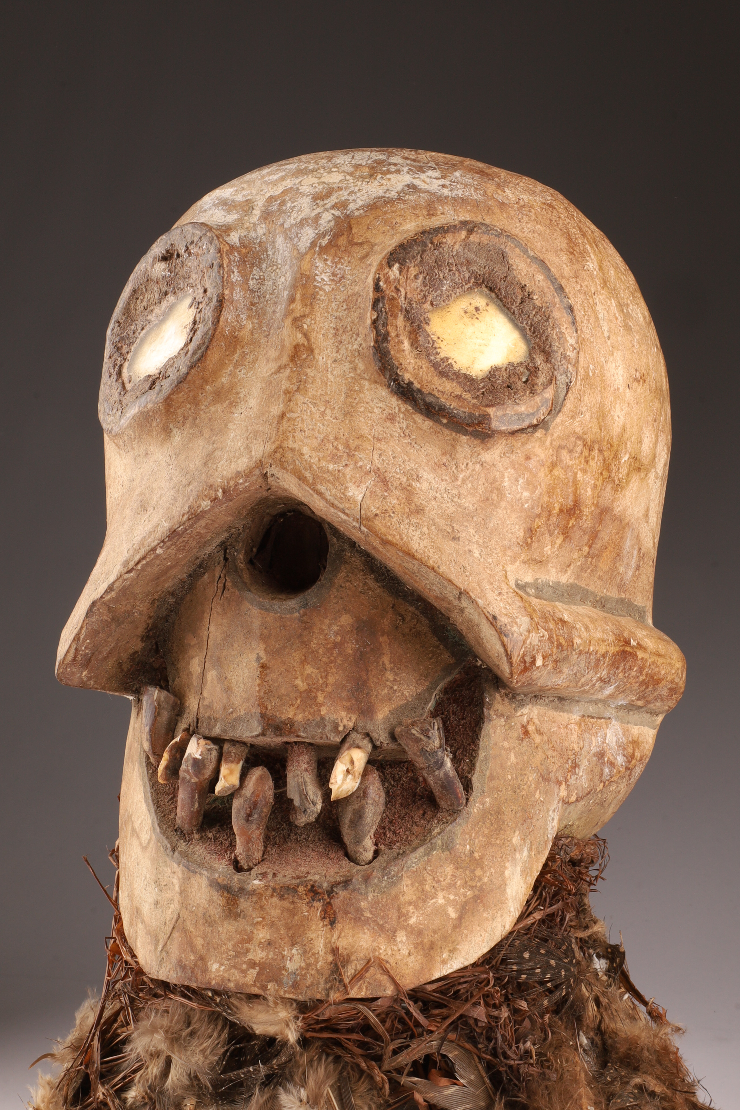 The sculpture’s heavily encrusted surface, weathered patina, and ritual accretions indicate extensive ceremonial use and long handling. Around the base, remnants of bird feathers and natural fibers are bound into the figure — materials symbolically linking the spirit world and the living. The top of the cranium shows age cracks and pigment loss, consistent with examples collected in situ.