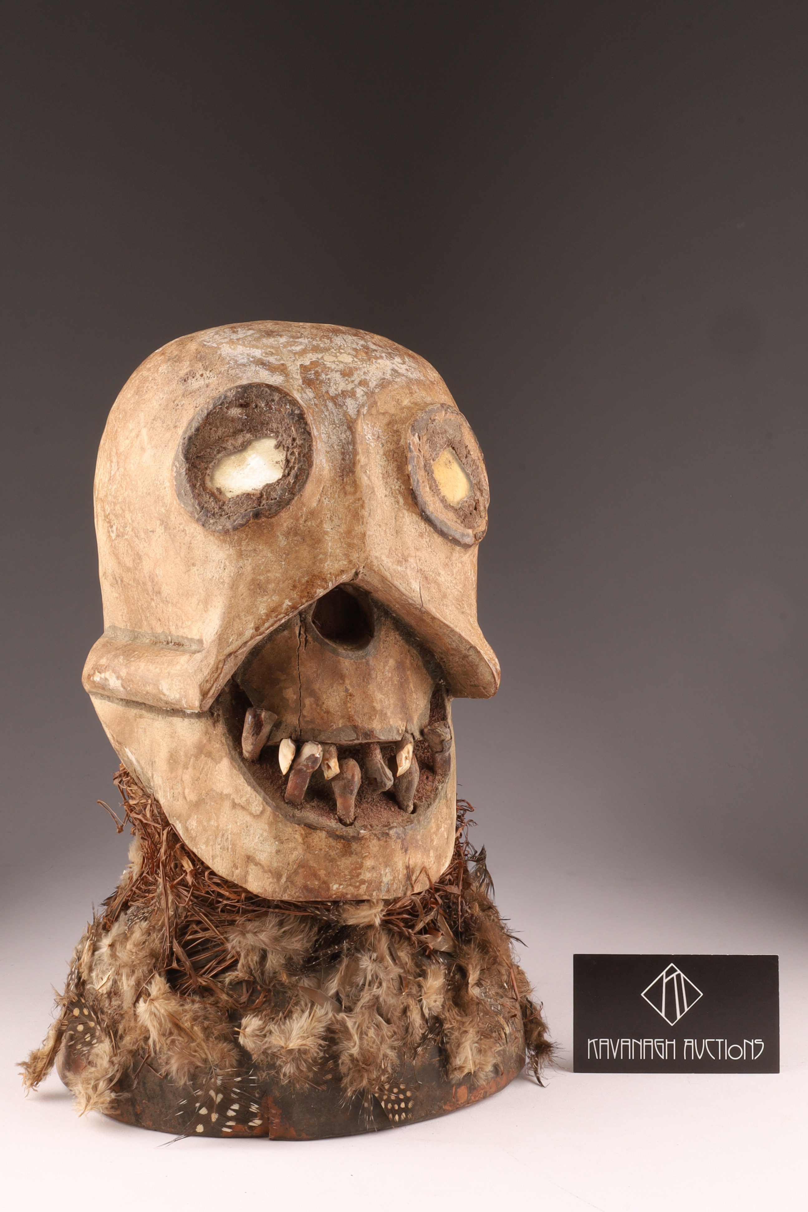 A striking carved wooden ancestral or spirit head, adorned with organic materials including feathers, plant fibers, and traces of pigment. The figure exhibits the classic Sepik aesthetic vocabulary — an elongated skull form with deep circular eye sockets, a pronounced beak-like nose ridge, and an open mouth inset with wooden or shell teeth, giving the visage an otherworldly, almost skeletal intensity.