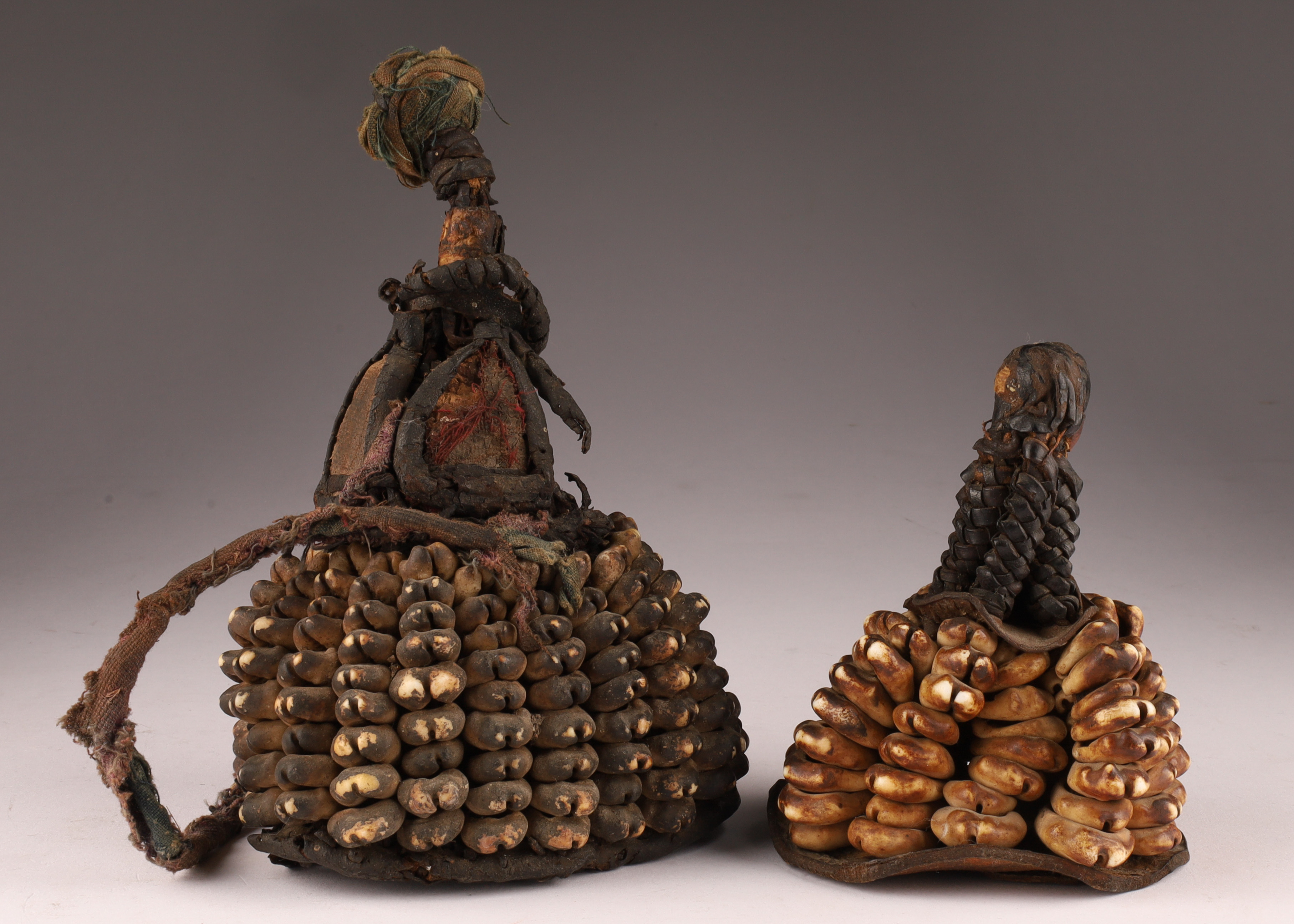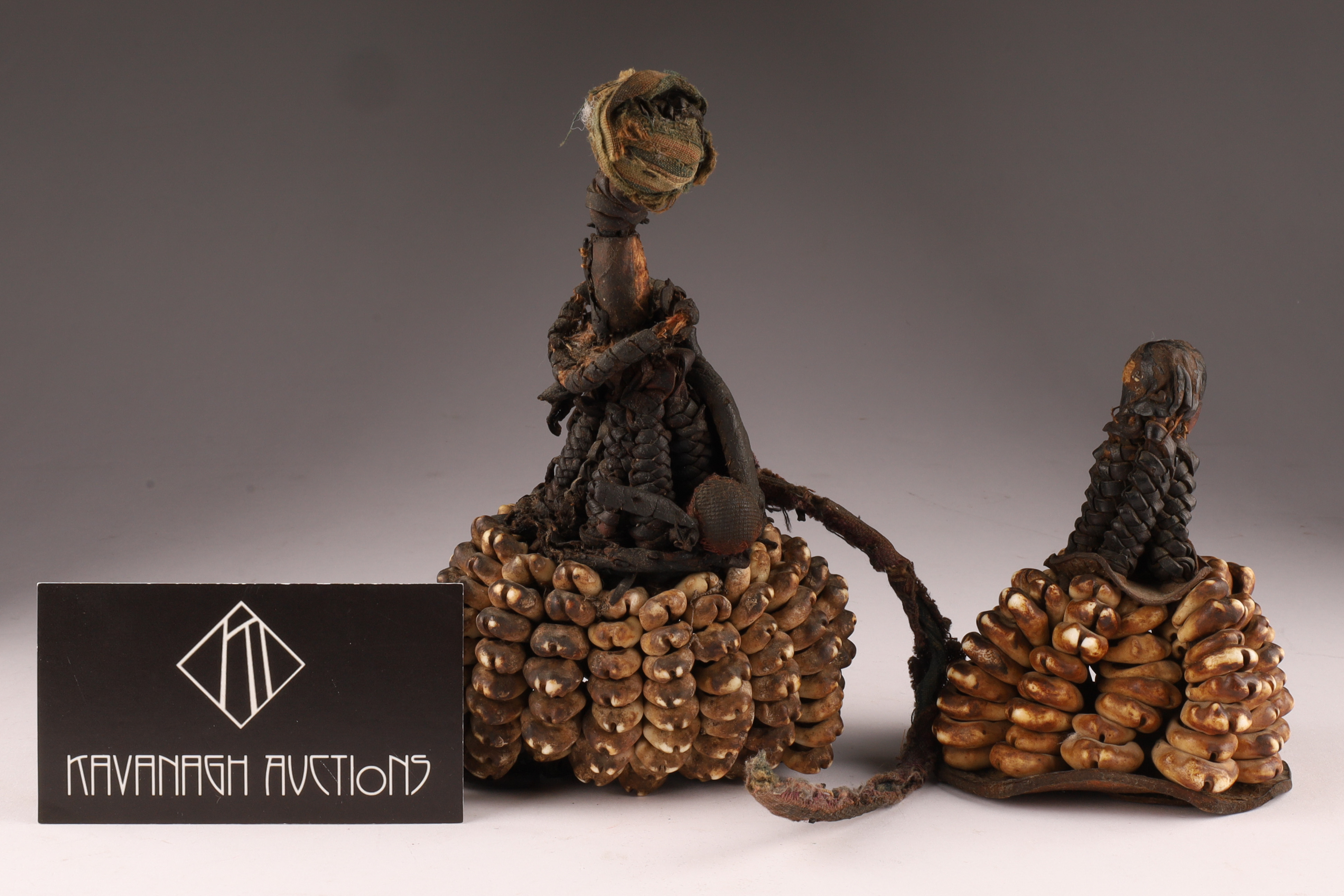 Lot of 2 Antique African Benin Republic Yoruba Cowrie Shell and Leather Ritual Ibori / Ori Inu. Larger measuring 6.5 inches H x 4 W, smaller measures 4 x 3 inches.