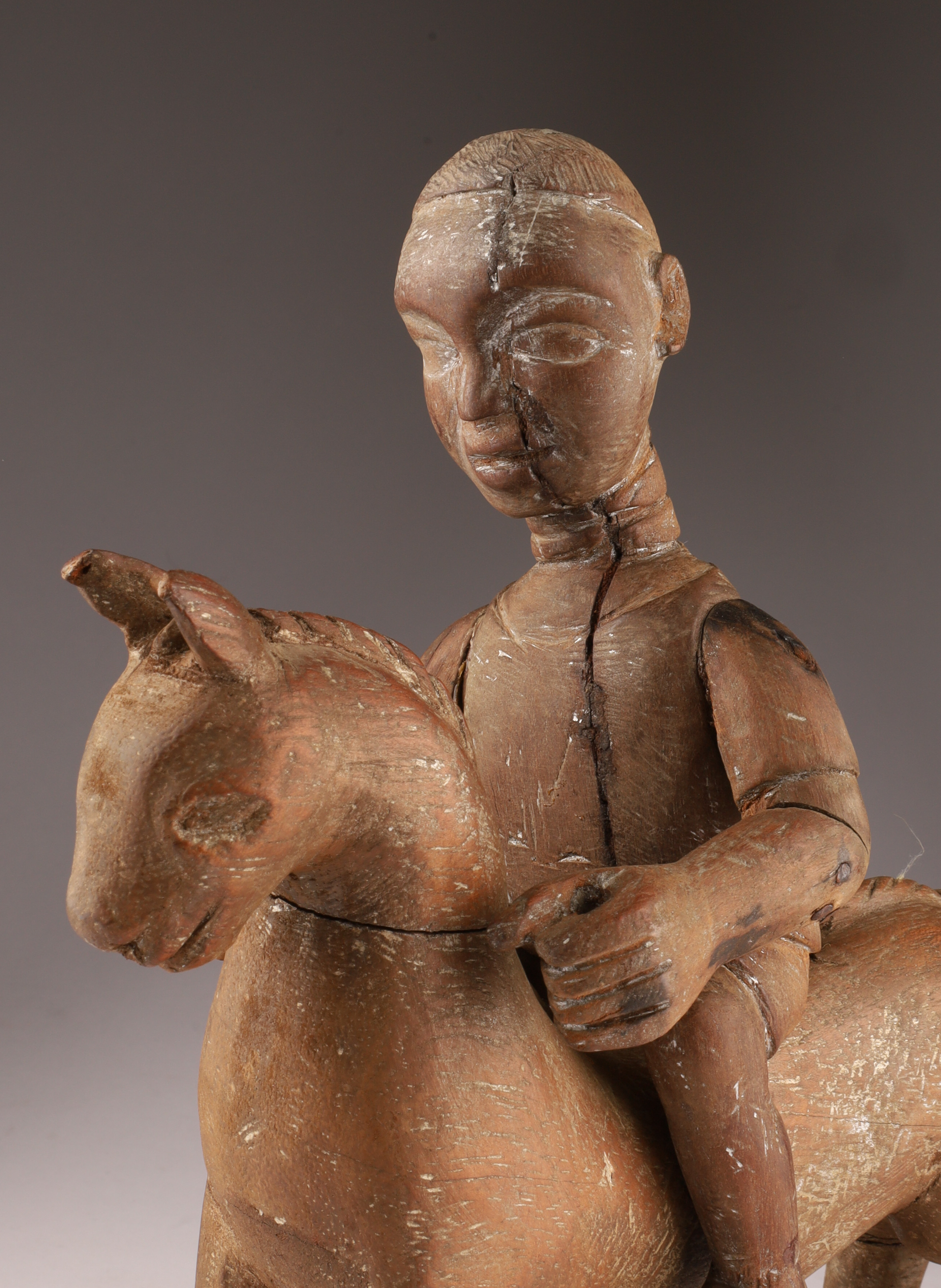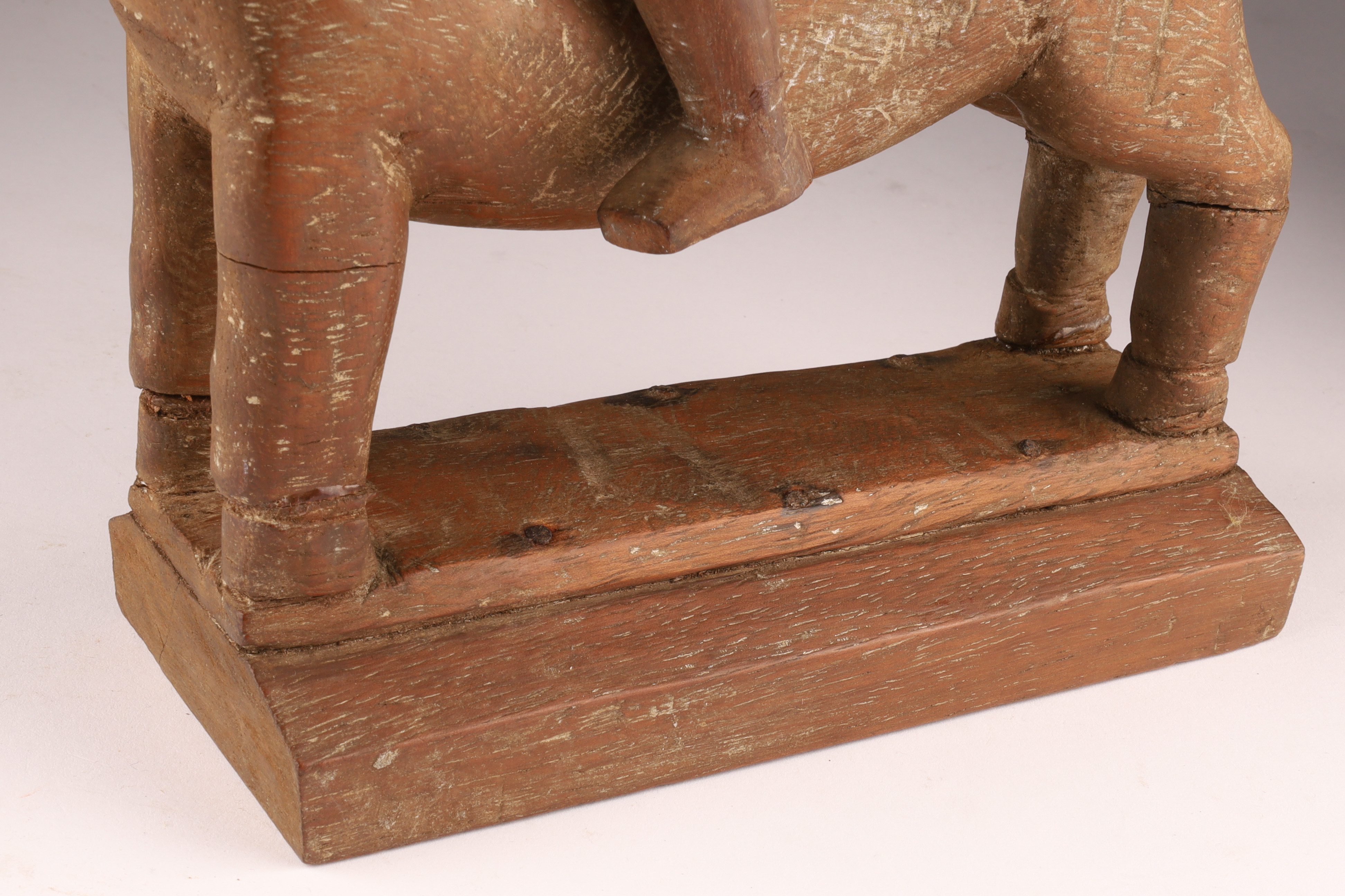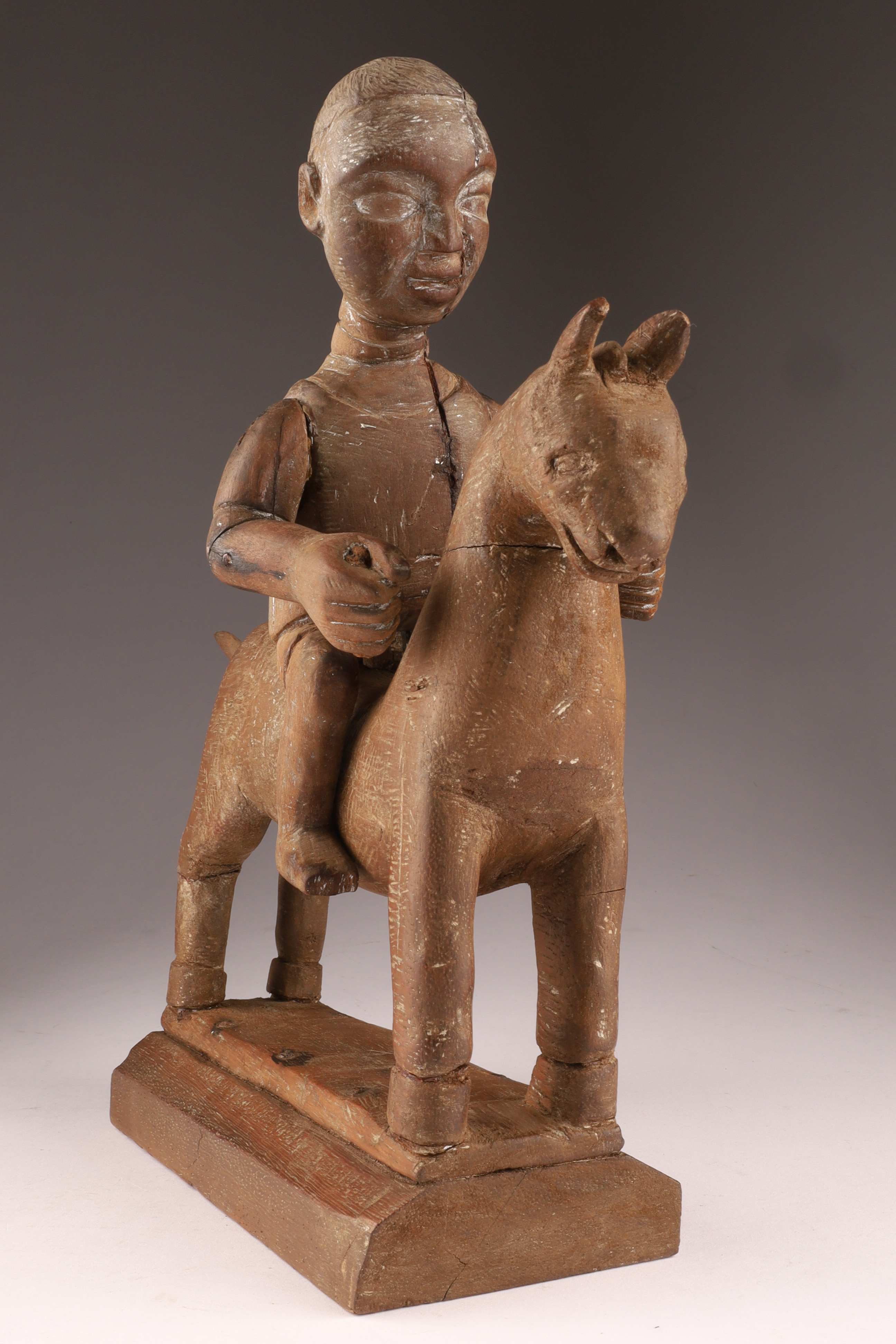African Carved Hardwood Figural Group Rider on Horseback. Repairs, as shown. Measuring 11 inches H x 11 L x 3 W.