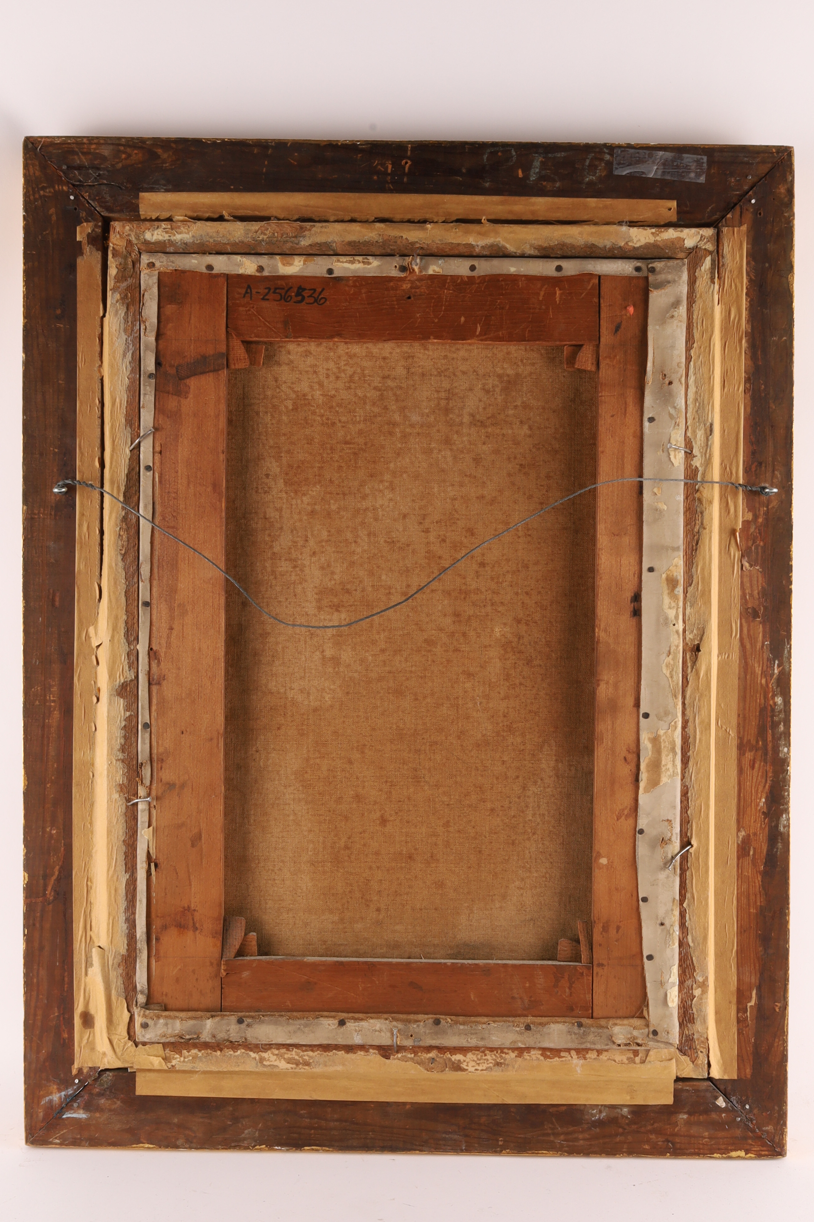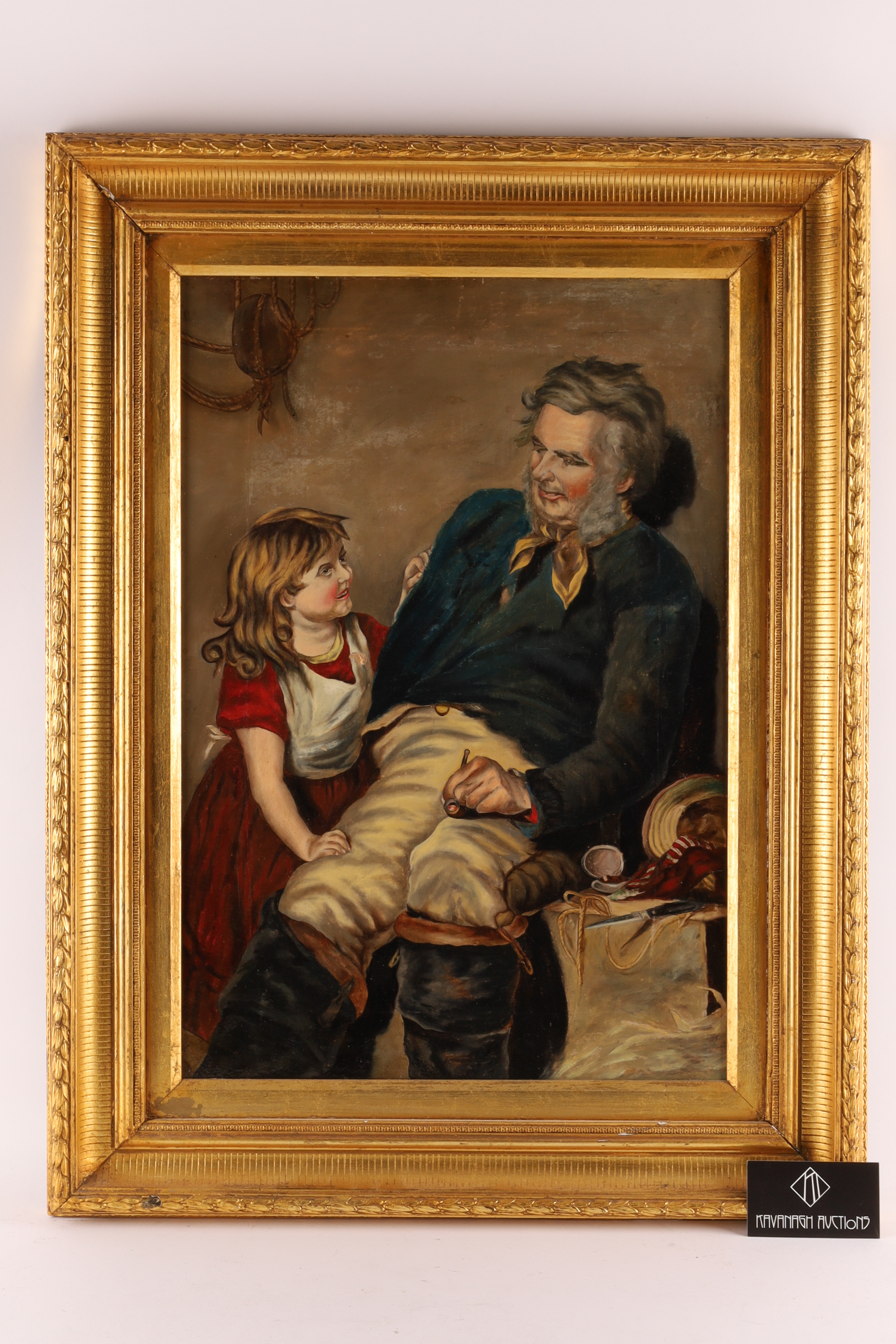 19th C American Folk Art Oil on Canvas Man with Child. Canvas measures 22.5 x 15.5 inches, frame measures 30 inches x 22 W.