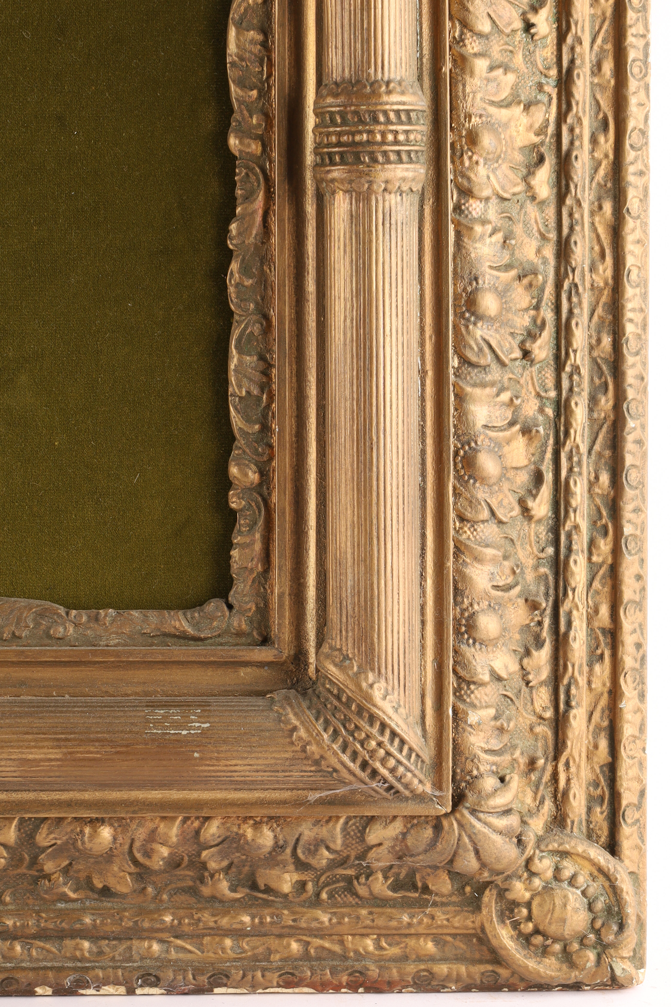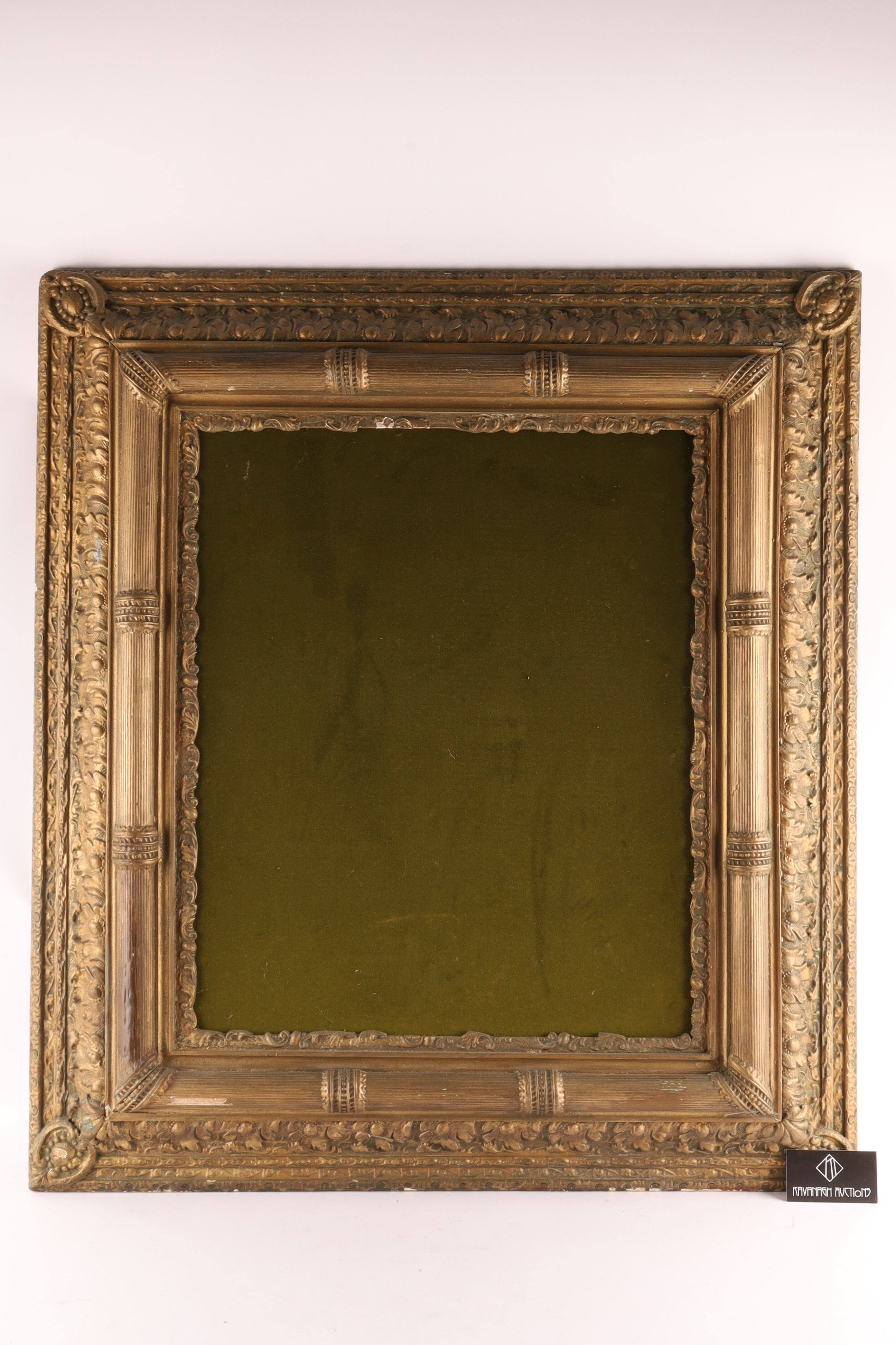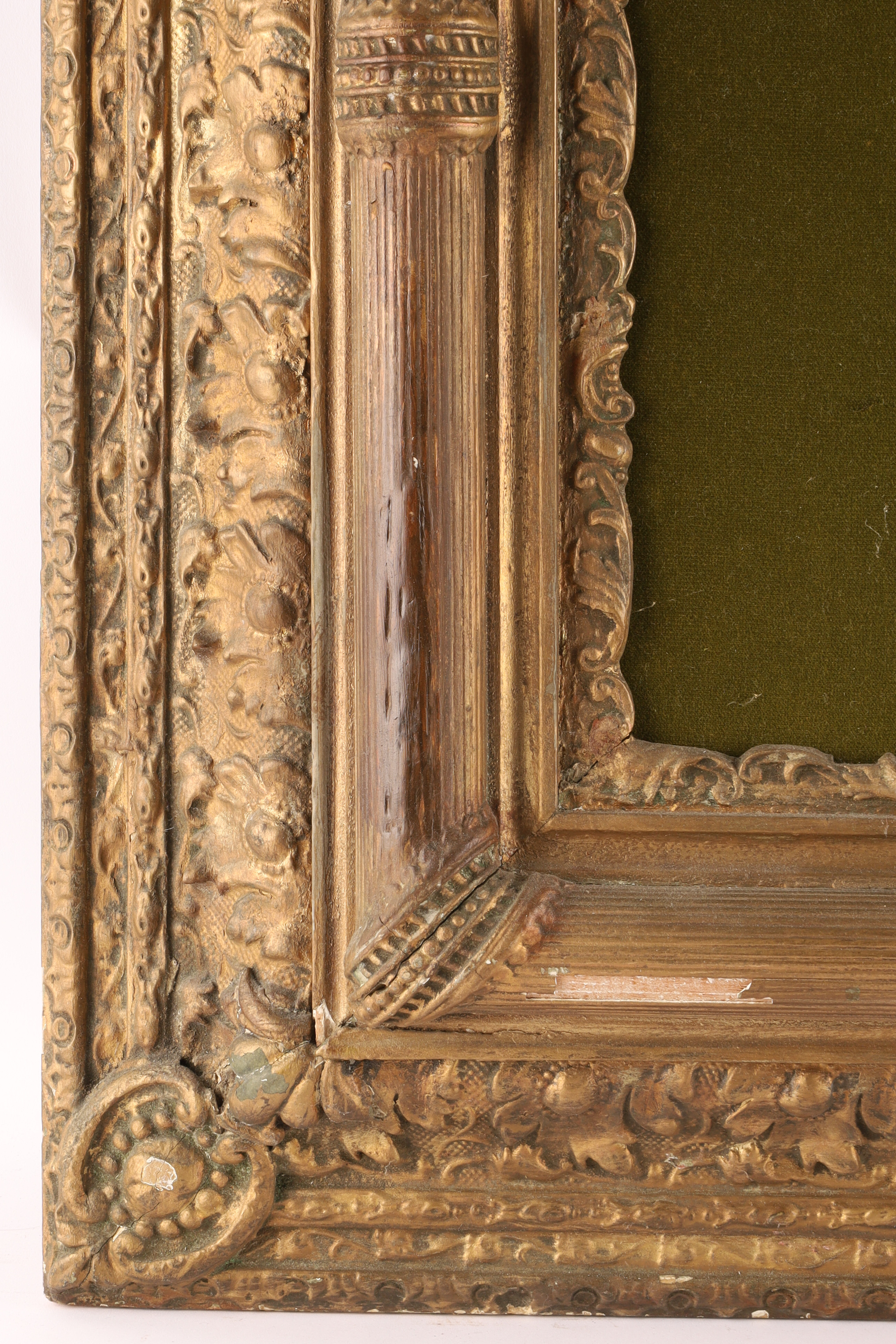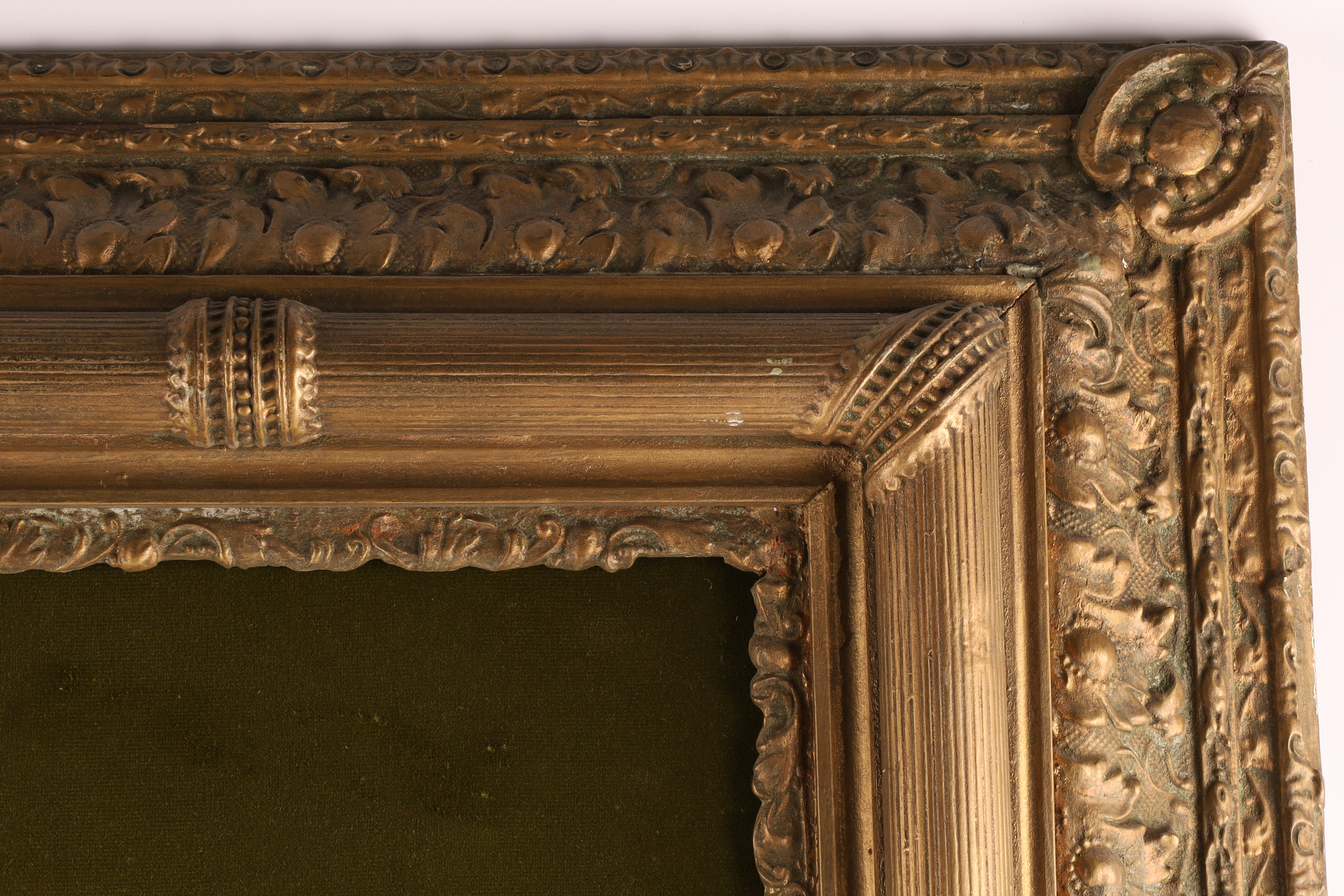 Large Antique Gilt Frame for Mirror or Painting with Velvet interior. Interior opening measures 20 x 24 inches, frame measures 37 x 32.5 inches.