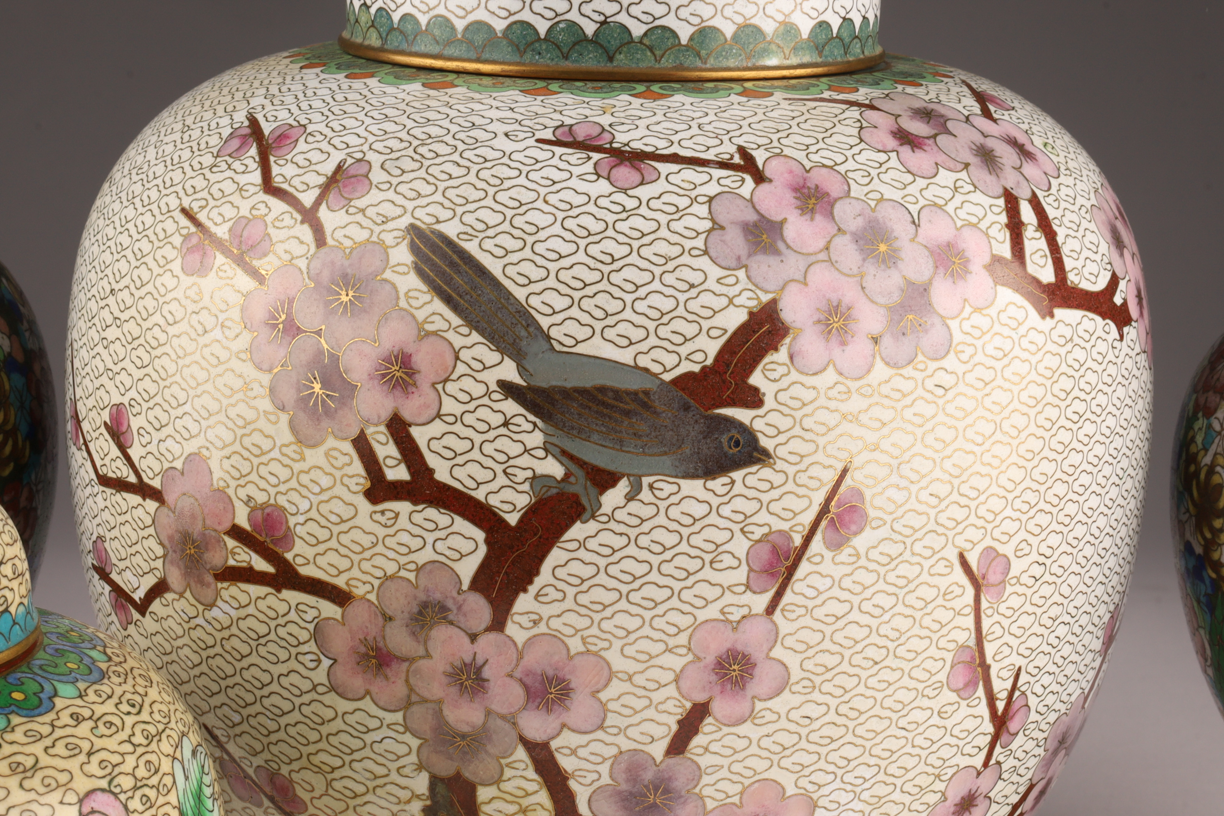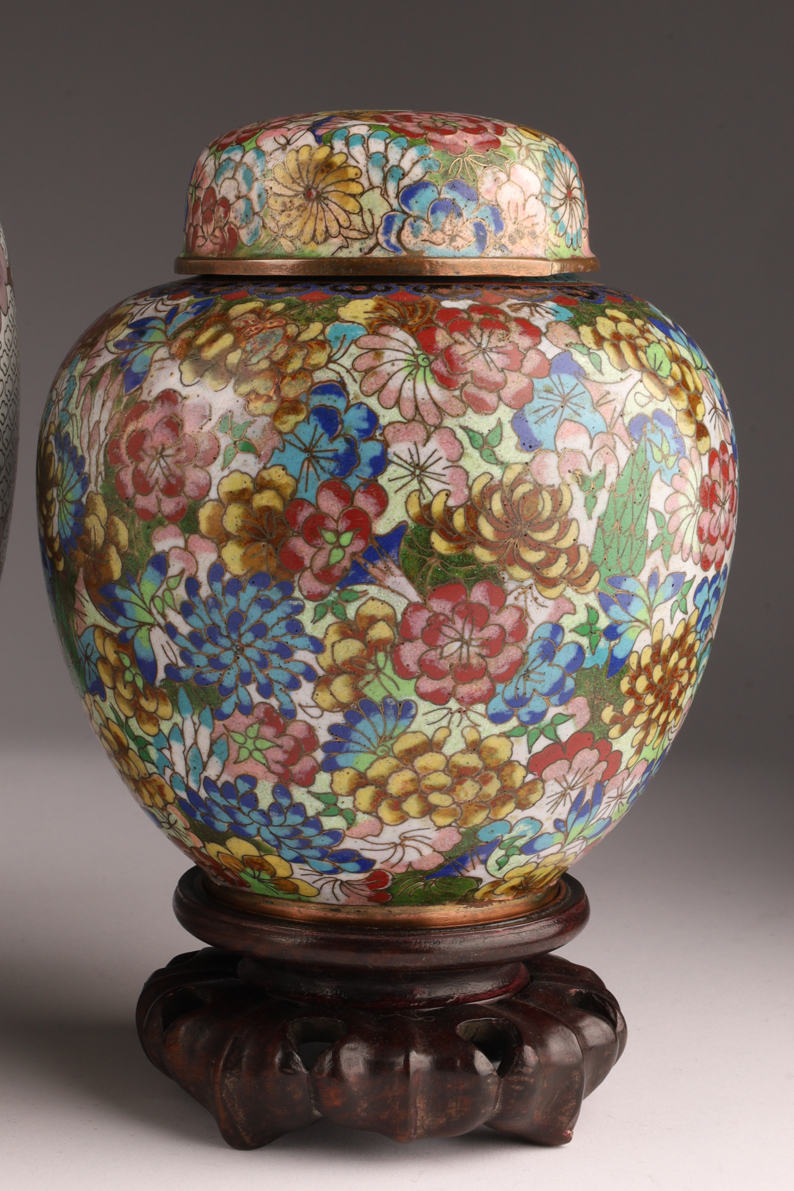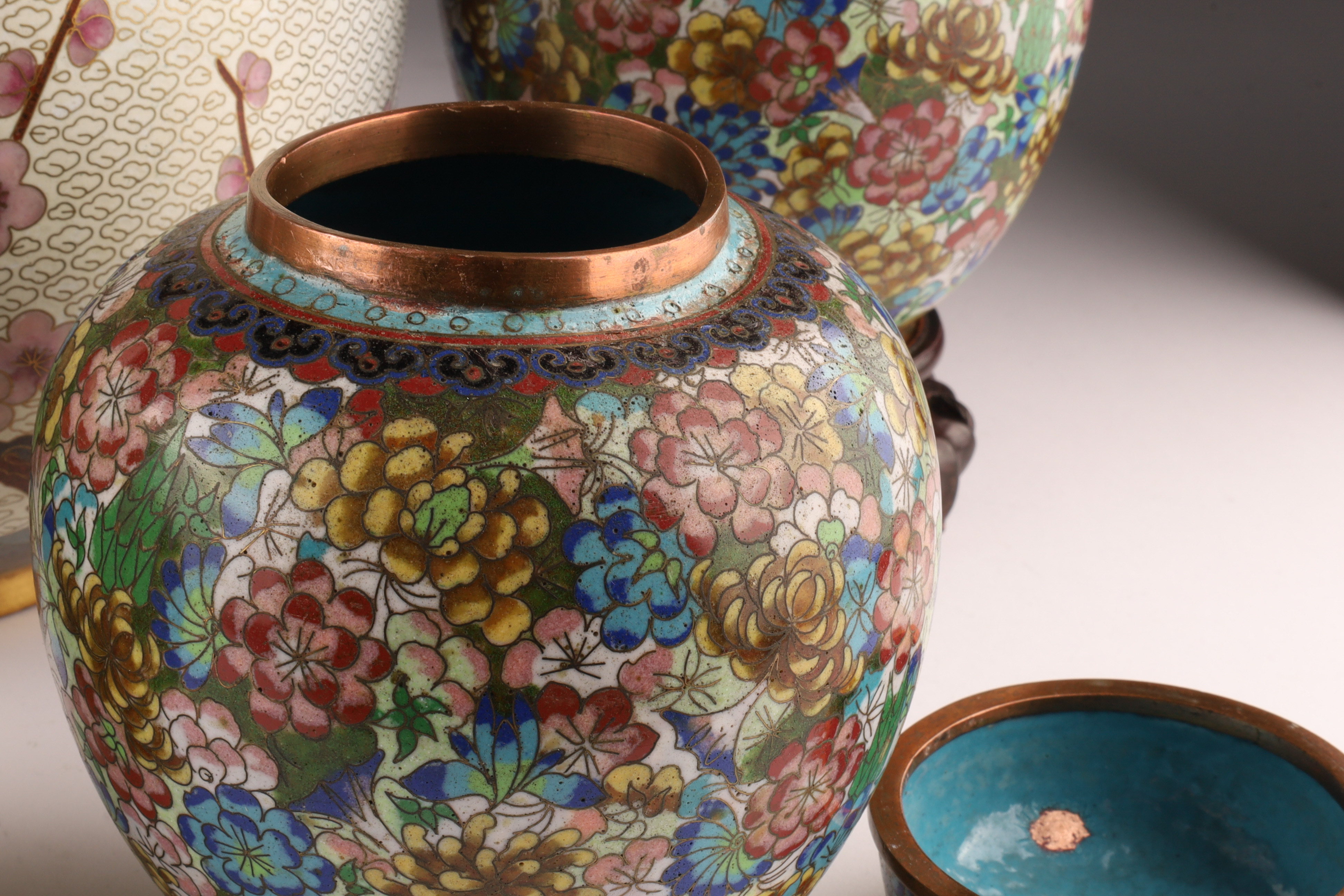 Lot of Four Chinese Cloisonne Ginger Jars. Largest white ground with cherry blossoms measures 9 inches H x 8 W, in good condition. Pair of Mille Fleur vases on stands measure 7.5 inches H x 5 W, one has damage to lid and base. Smallest yellow ground measures 5.5 inches H.