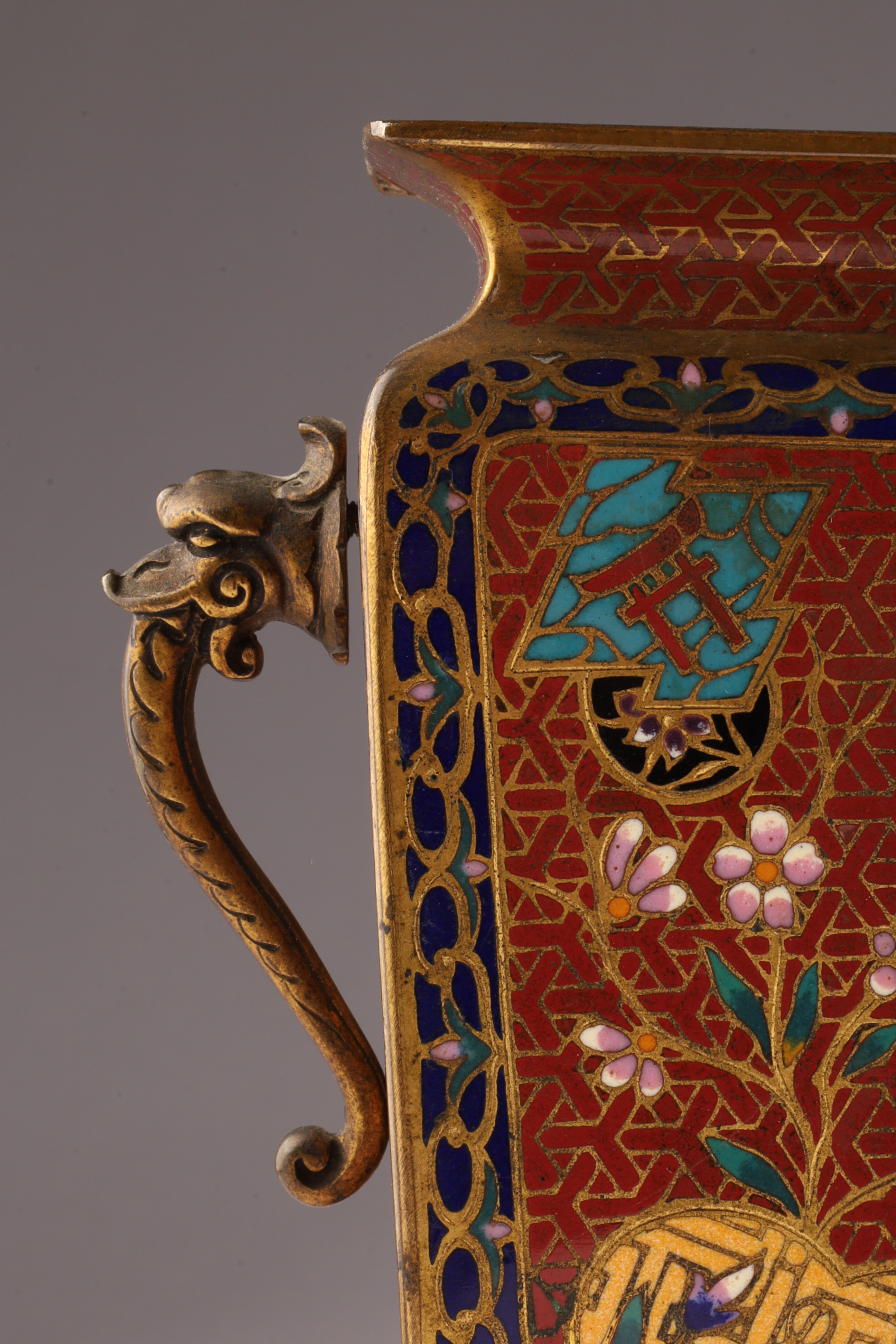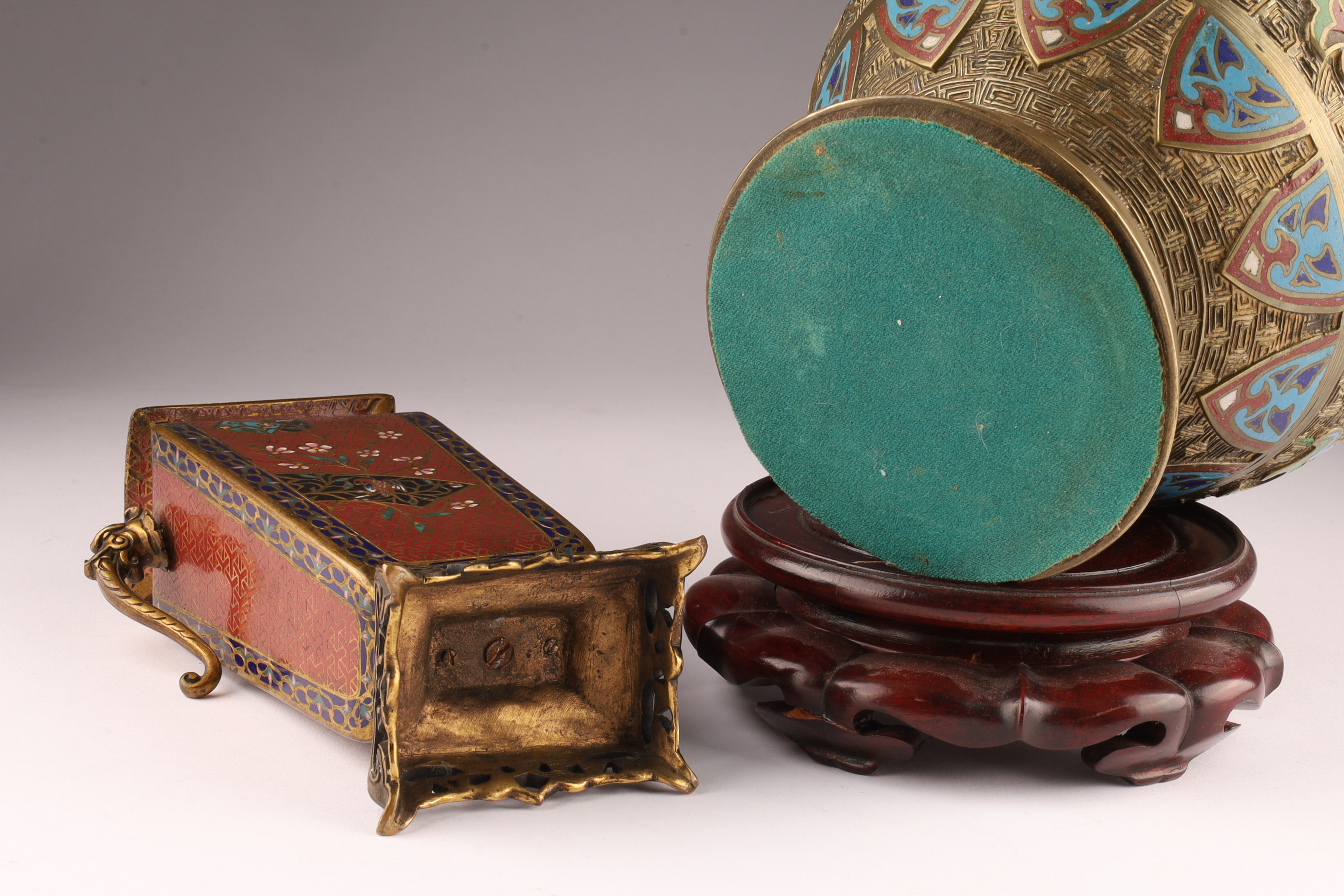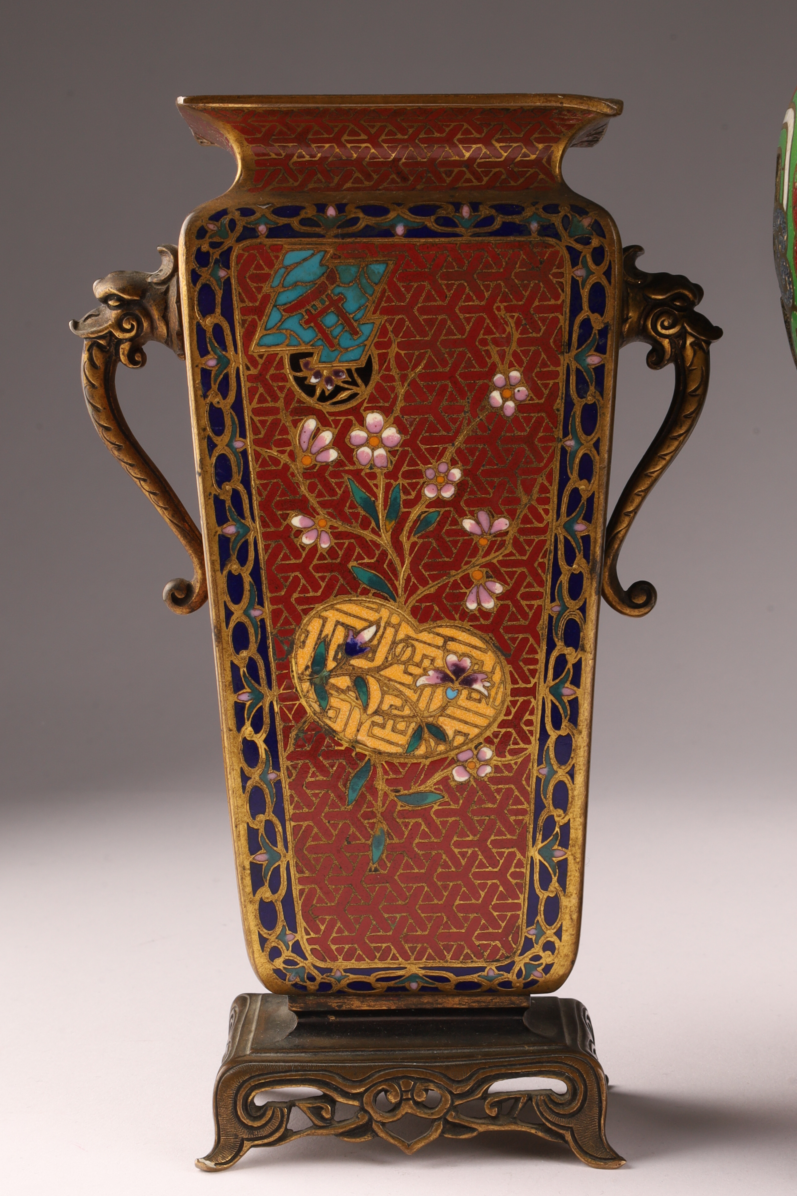 Lot of Two Chinese Archaic Style Cloisonne Champleve Vases. Rectangular vase has damage to rim, loose dragon handles, measures 7.25 inches H x 4.5 W x 2.25 deep. Champleve vase is missing handles, measures 9.5 inches in H x 6.5 W with stand.