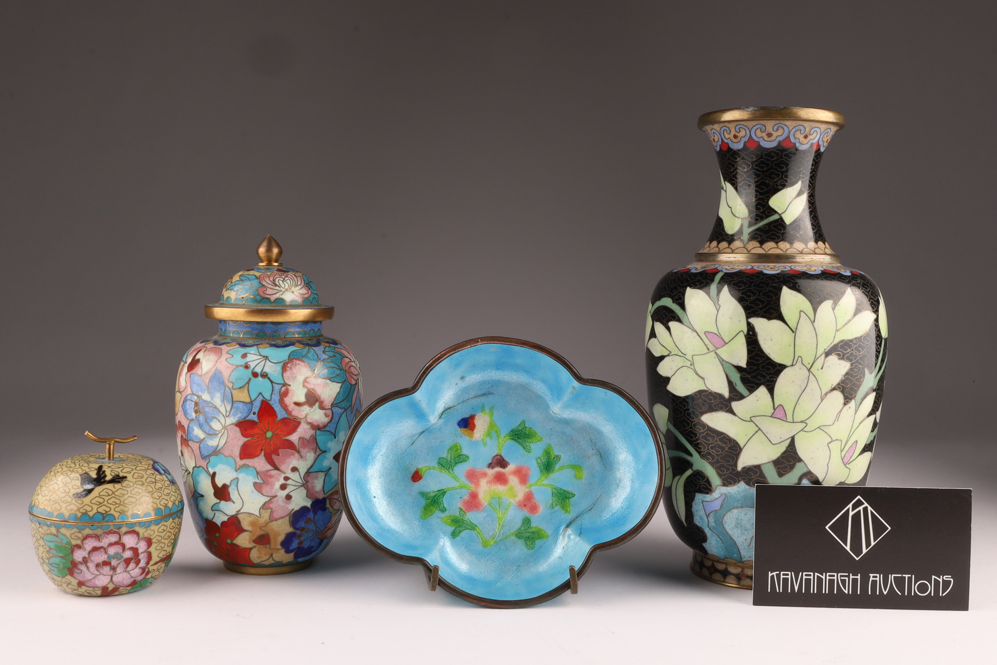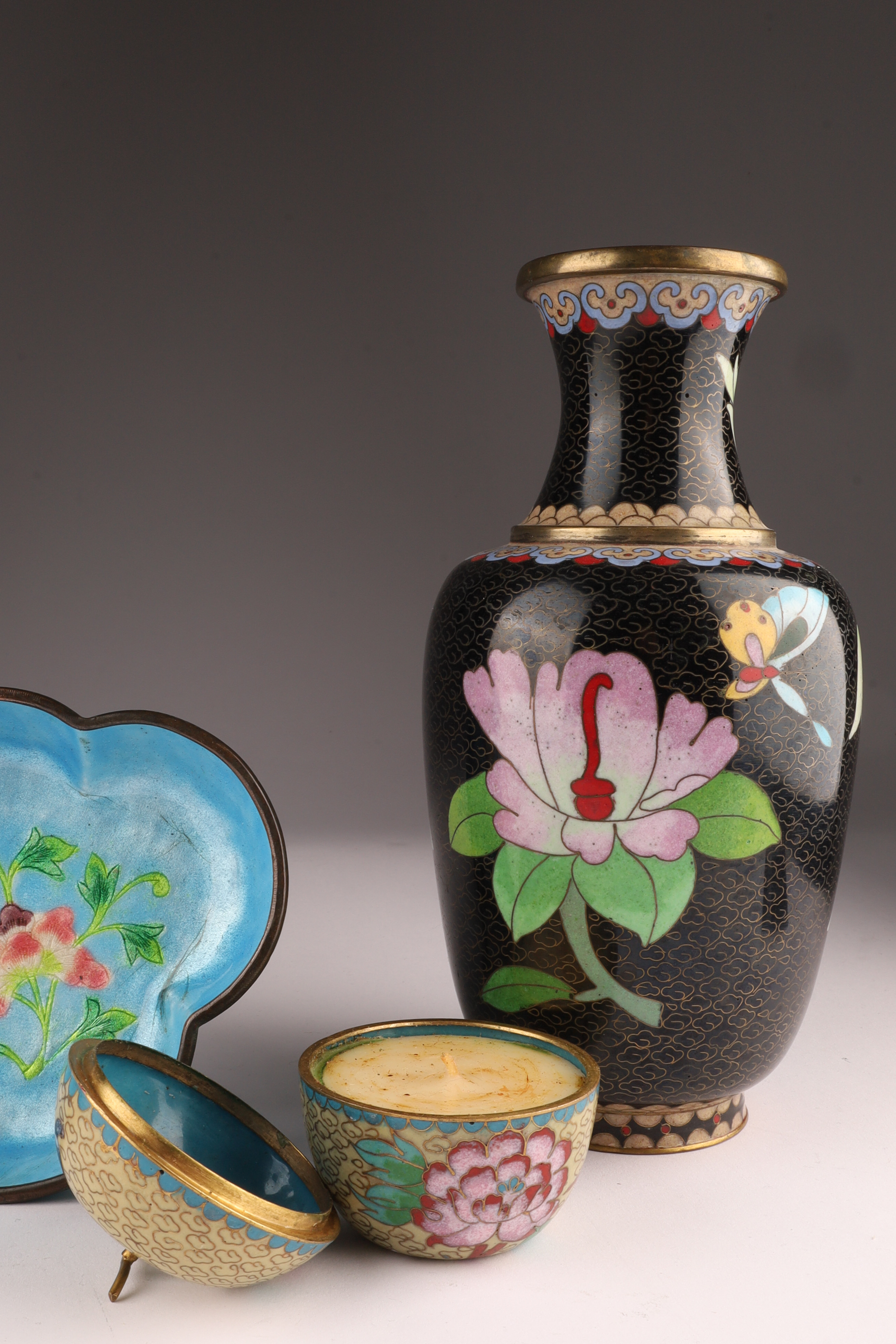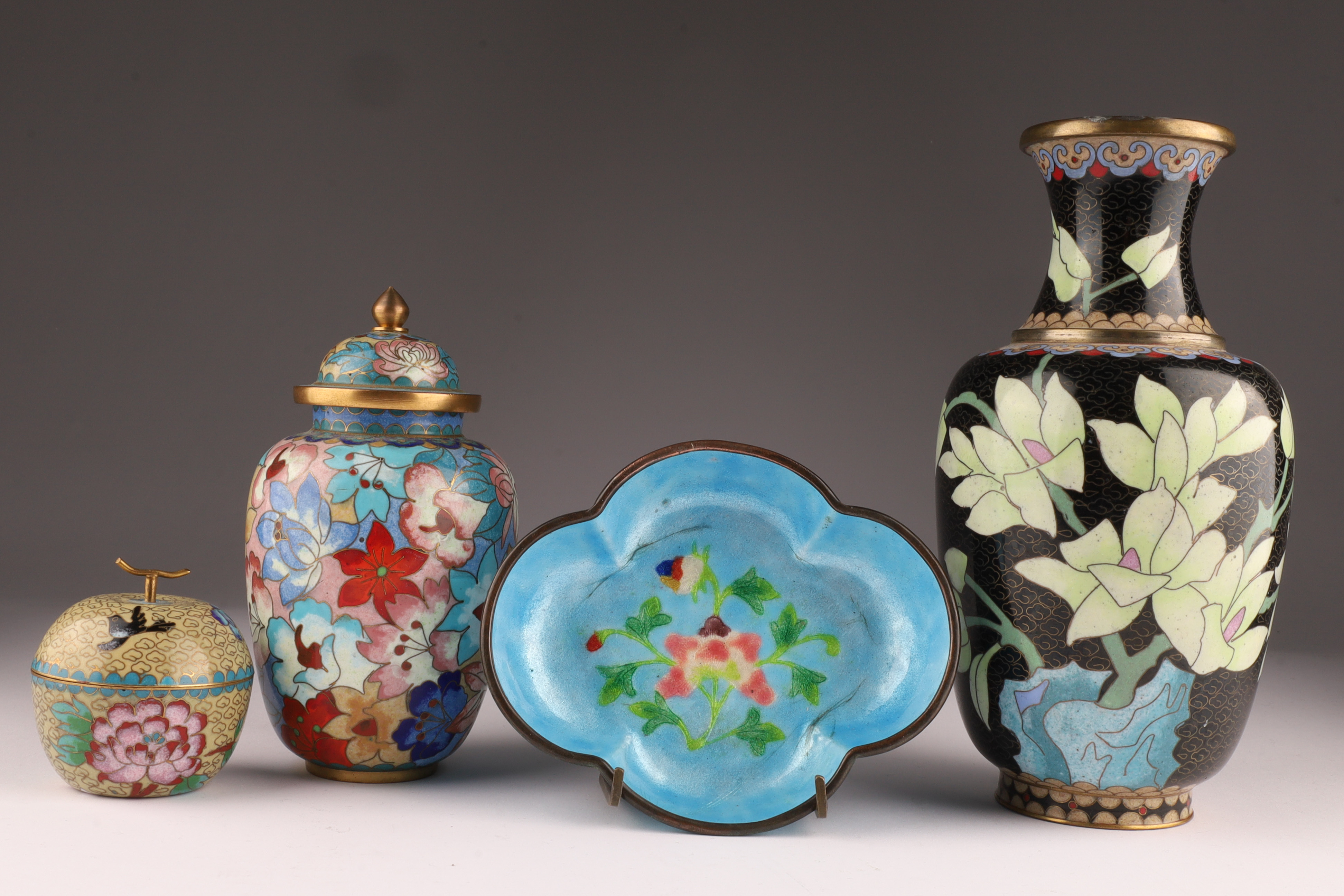 Lot of Four Chinese Cloisonne Vases, Items. Tallest vase flowers on a black ground, measures 8.25 x 4.25 inches W, lidded vase measures 6 x 3.5 inches, blue ground dish measures 1.25 x 5.5 W x 4.5 deep. Small apple form candle measures 2.5 x 2.5 inches.