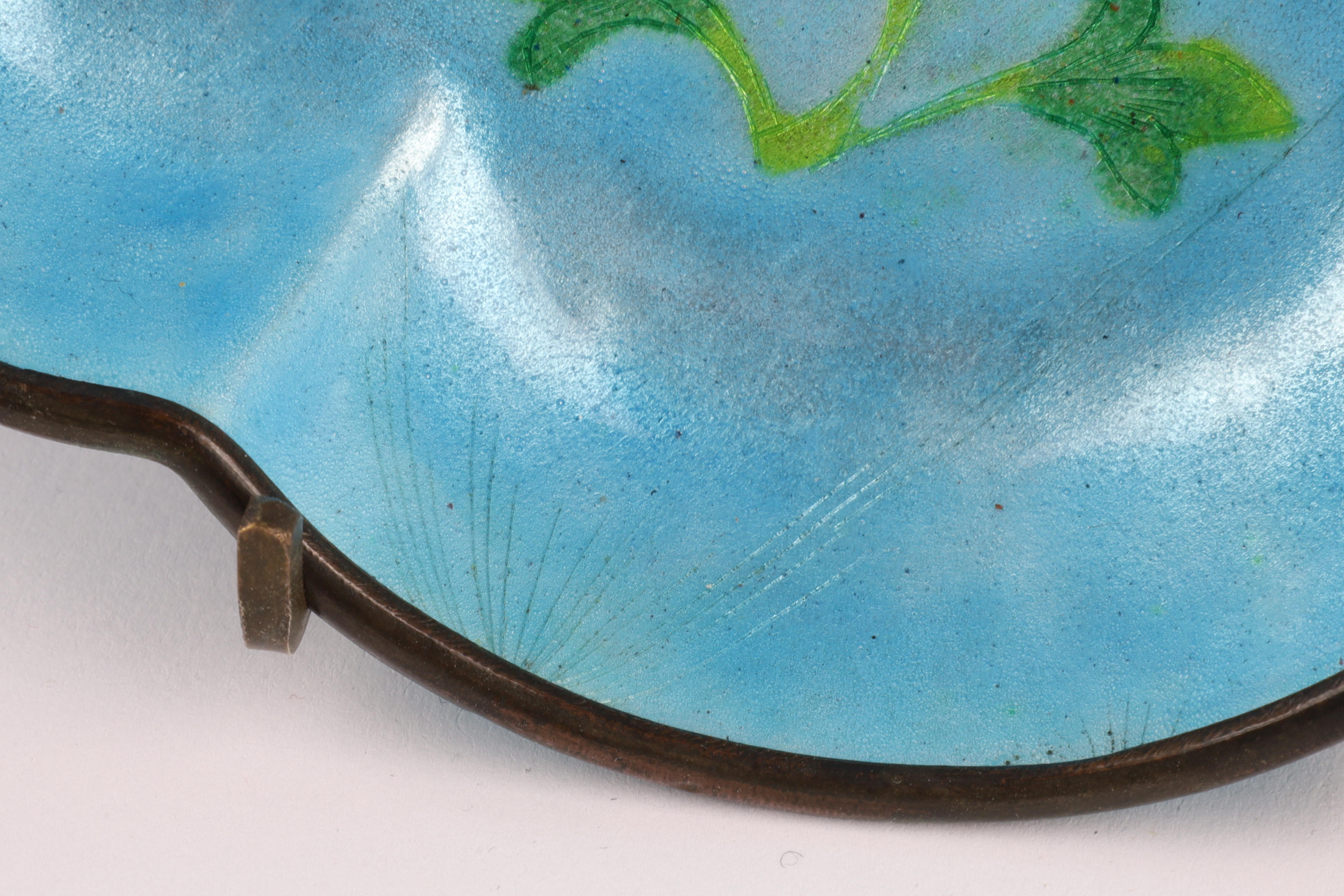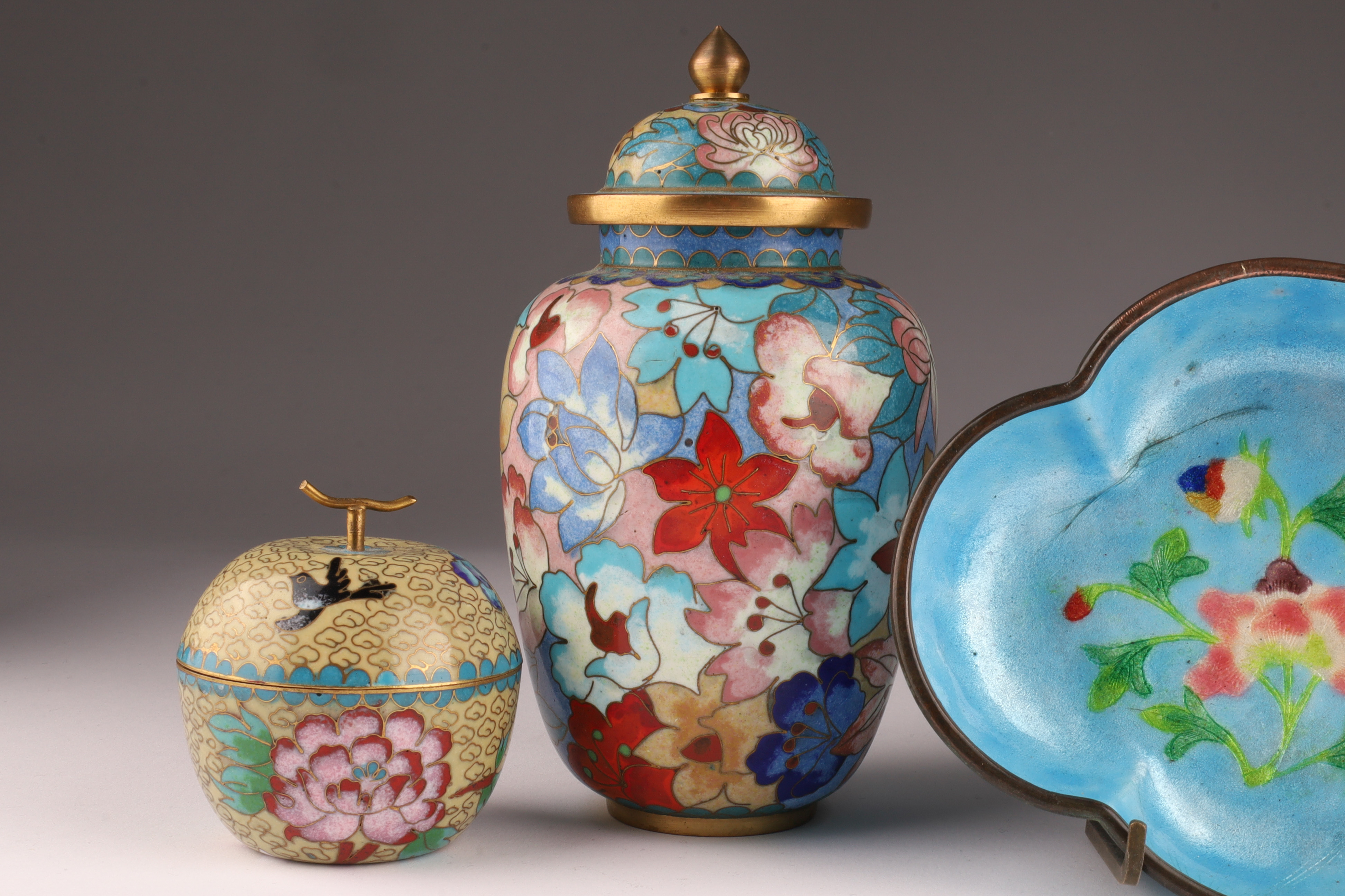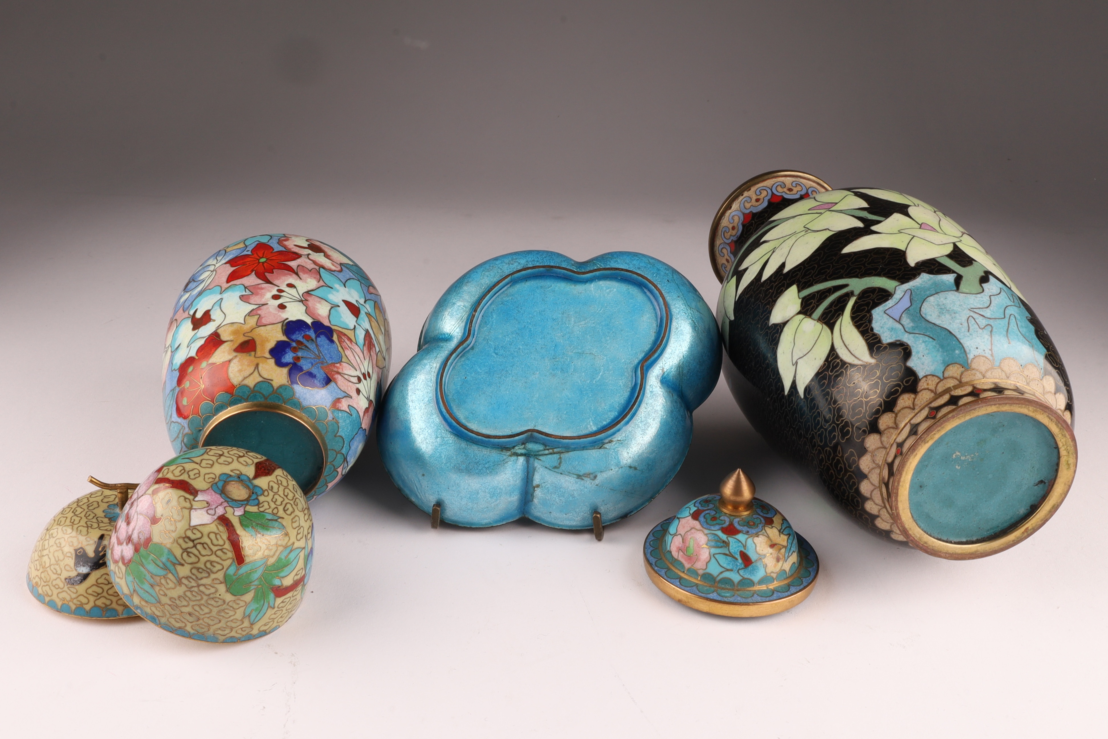 Lot of Four Chinese Cloisonne Vases, Items. Tallest vase flowers on a black ground, measures 8.25 x 4.25 inches W, lidded vase measures 6 x 3.5 inches, blue ground dish measures 1.25 x 5.5 W x 4.5 deep. Small apple form candle measures 2.5 x 2.5 inches.