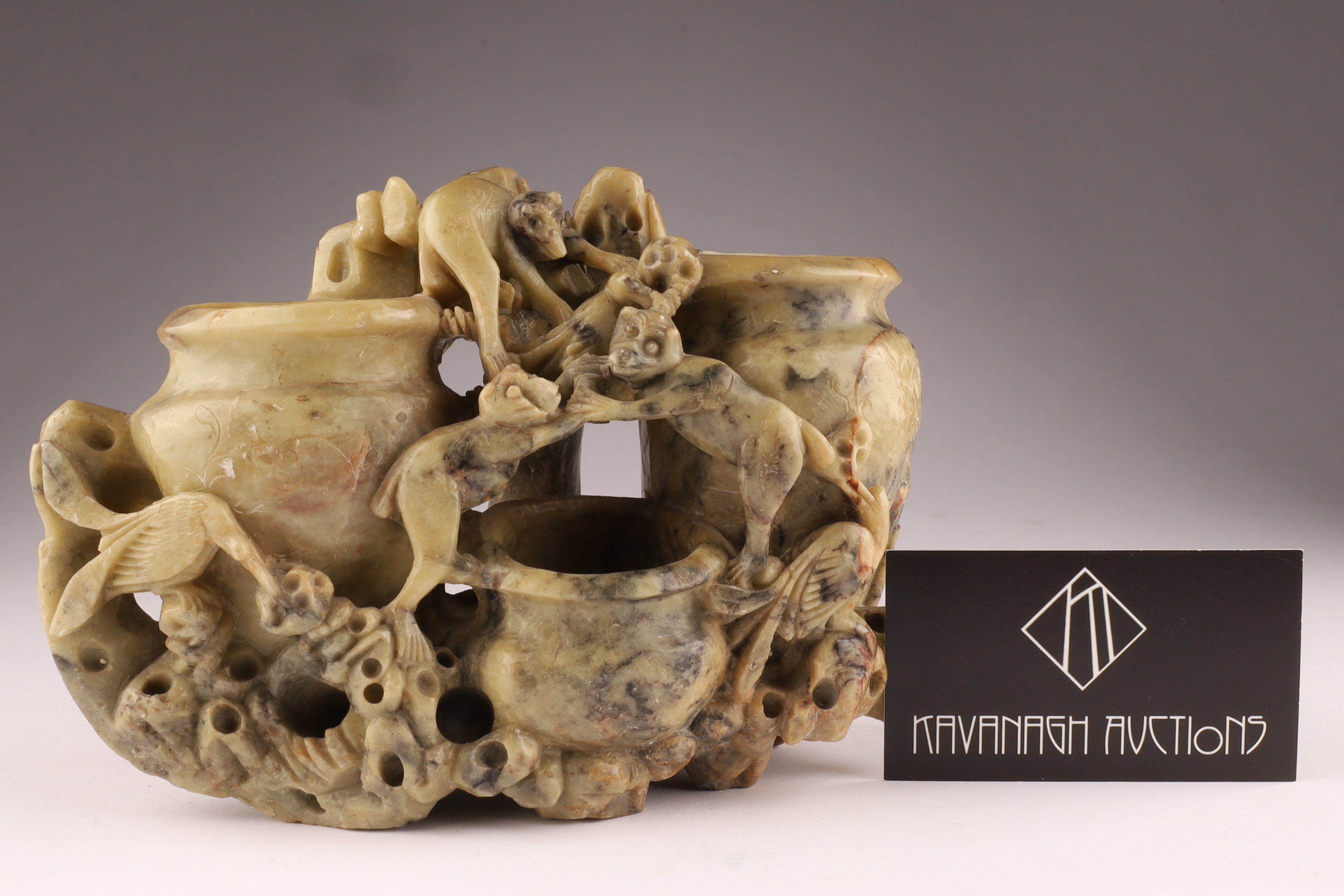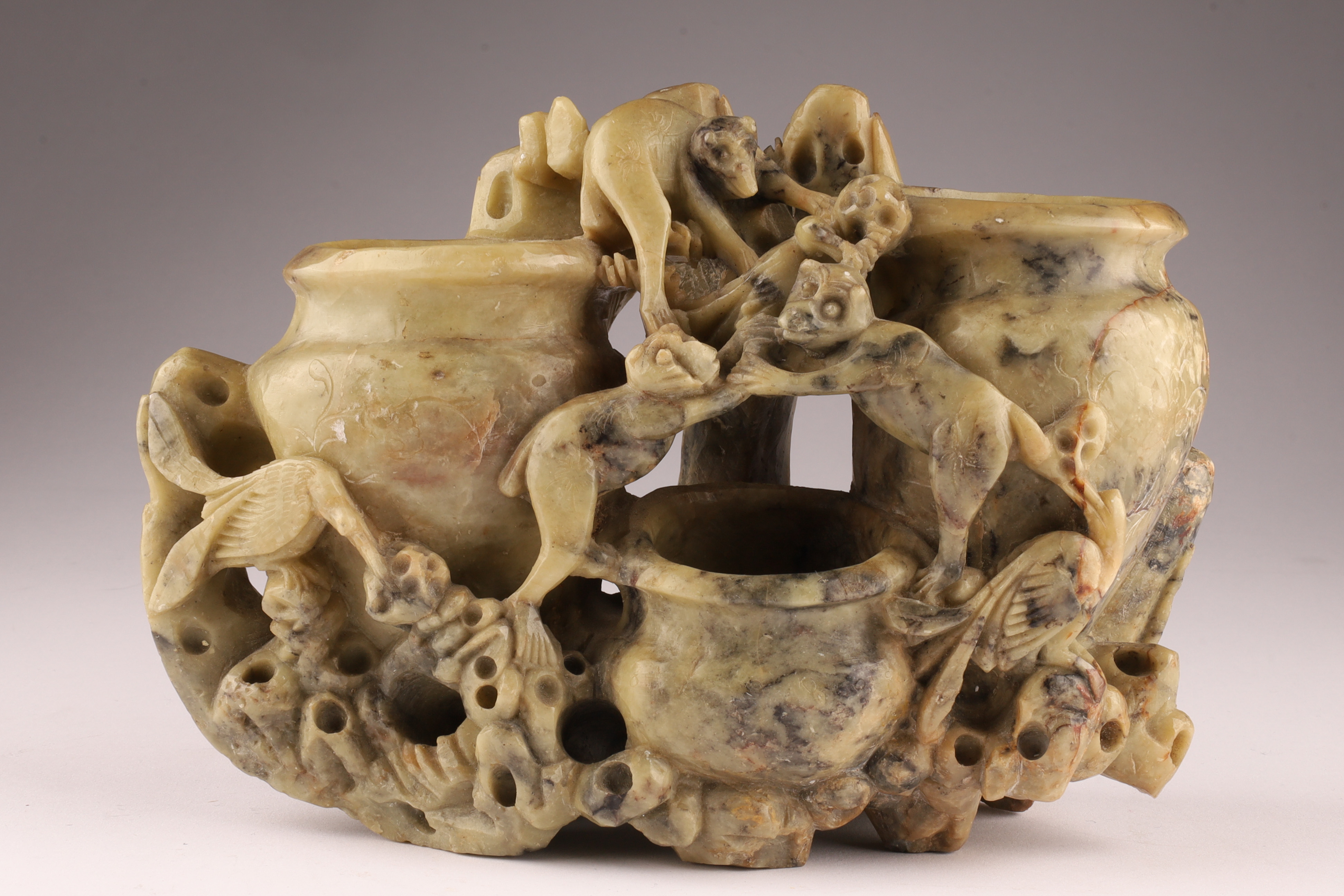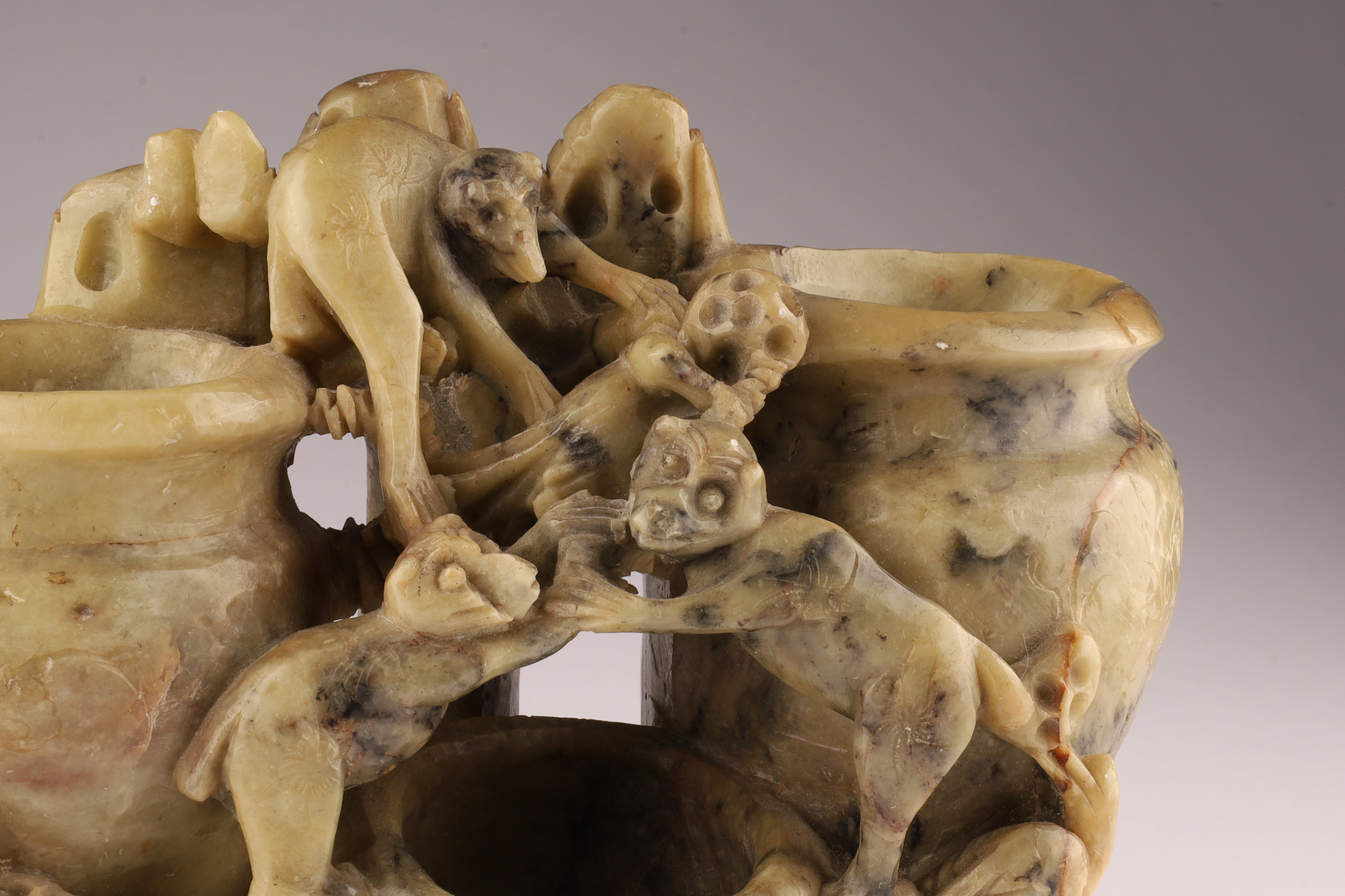 Chinese Carved Hardstone Monkey Vase, vase decorated with carved monkeys measures 5.5 inches H x 8 W.