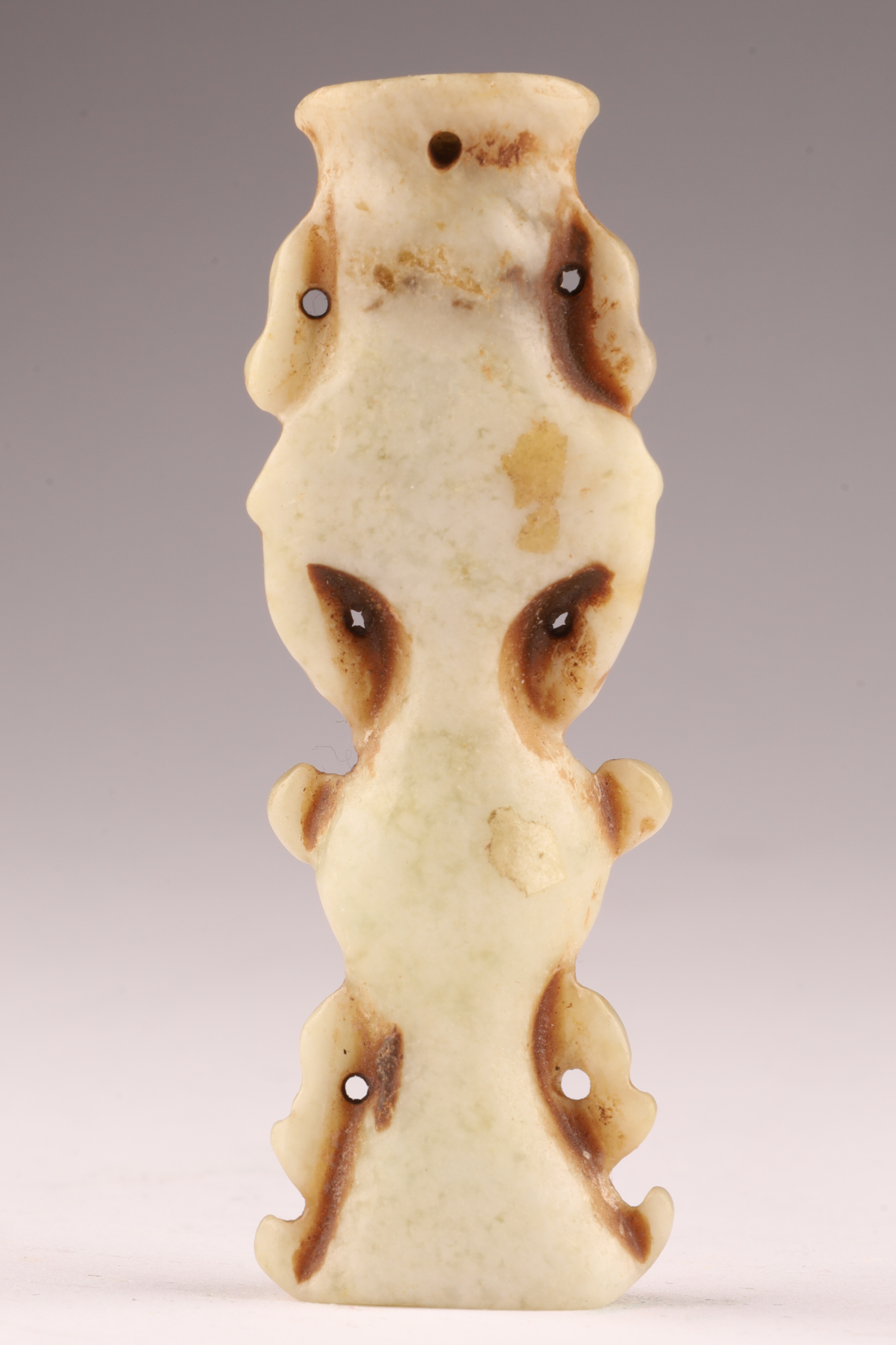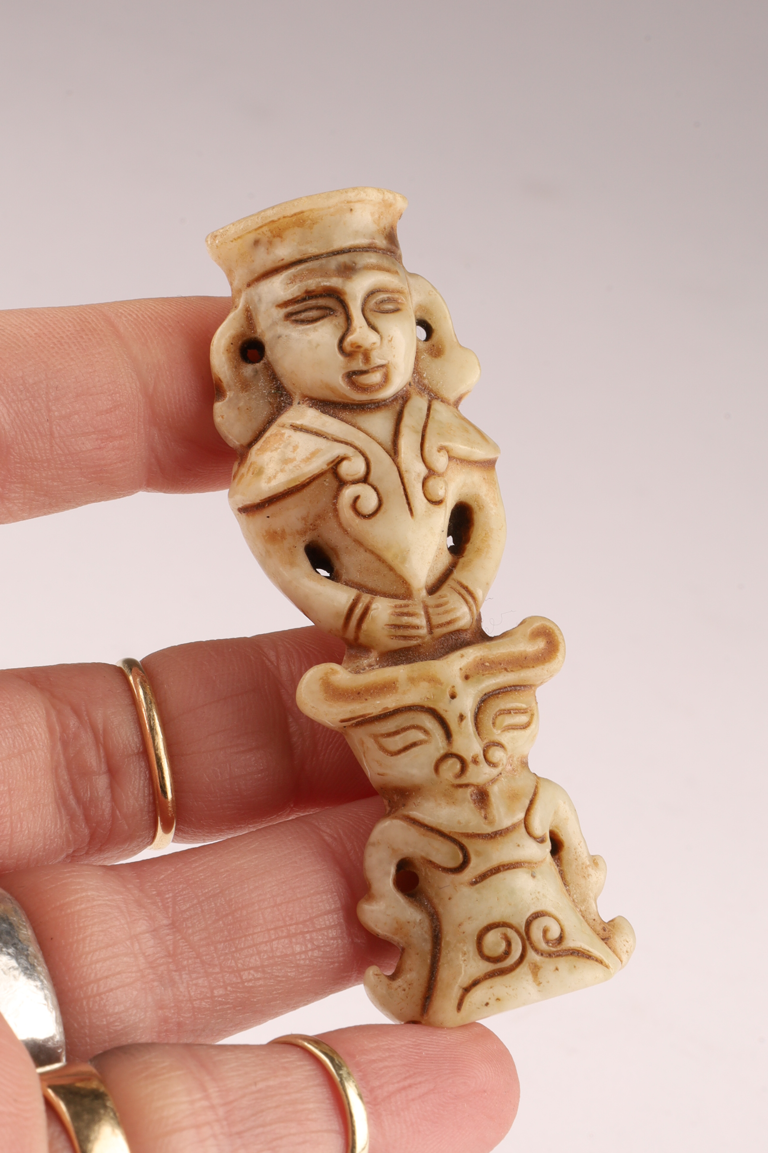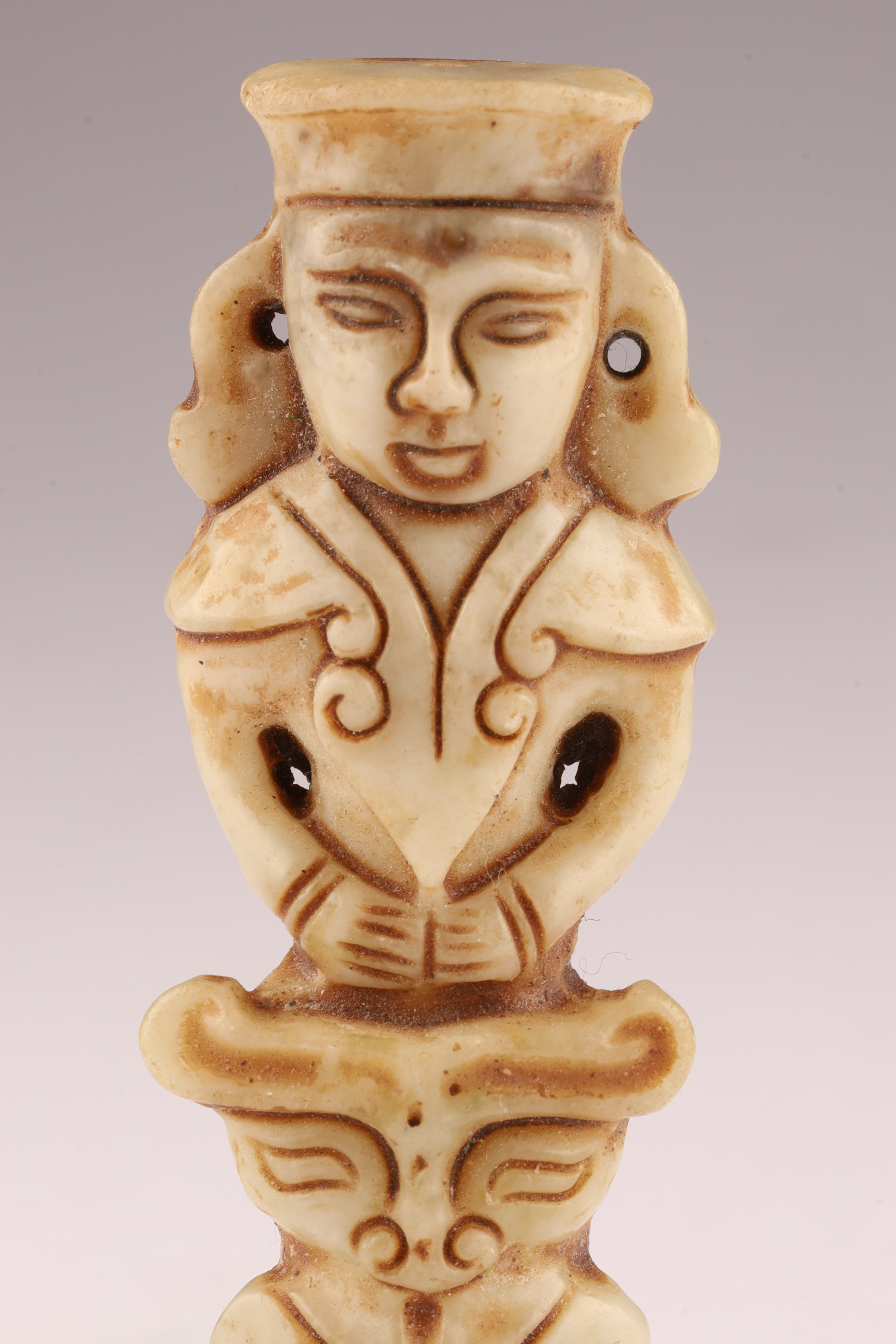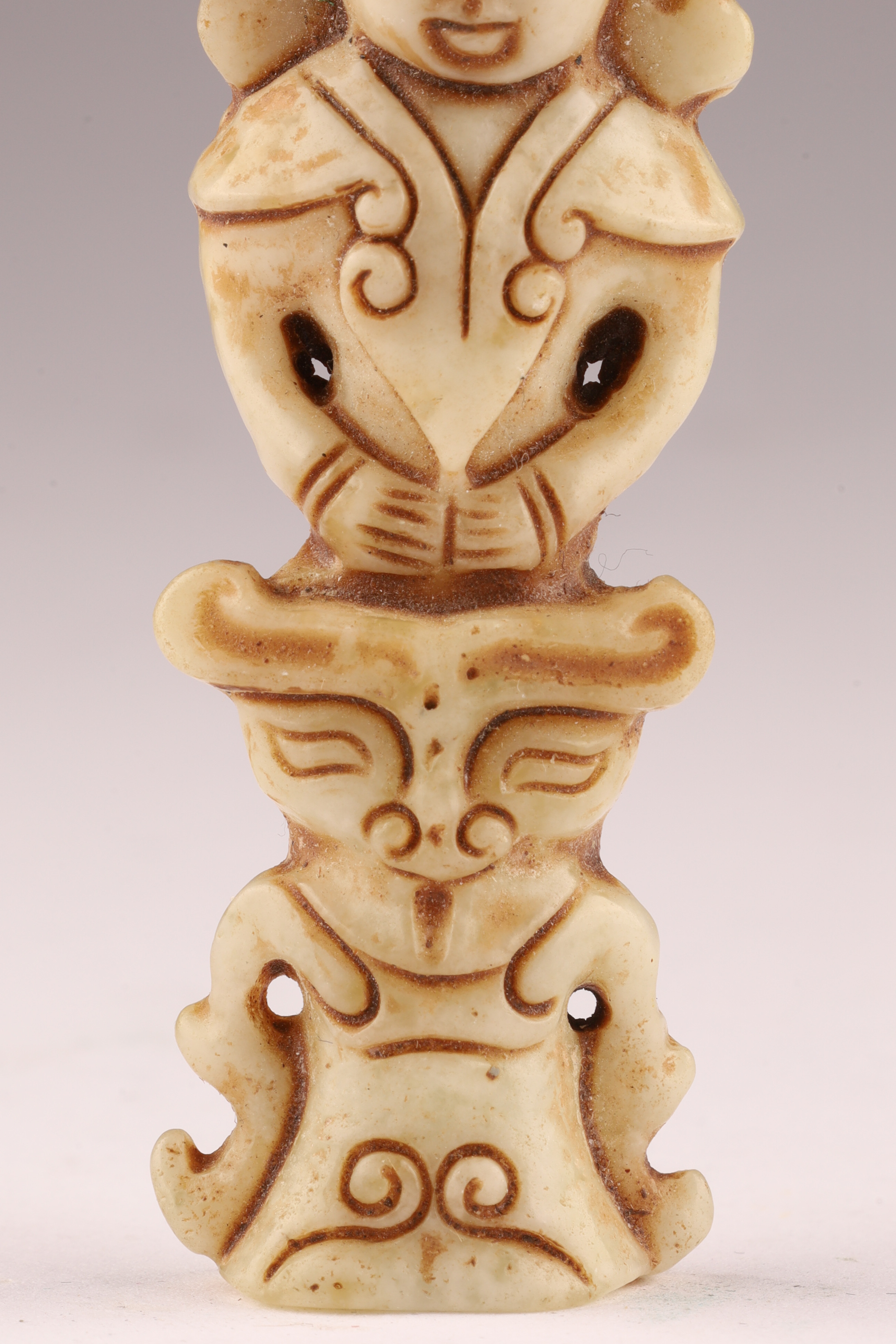 Chinese Carved Jade Pendant, archaic style figural pendant measures 3 inches.