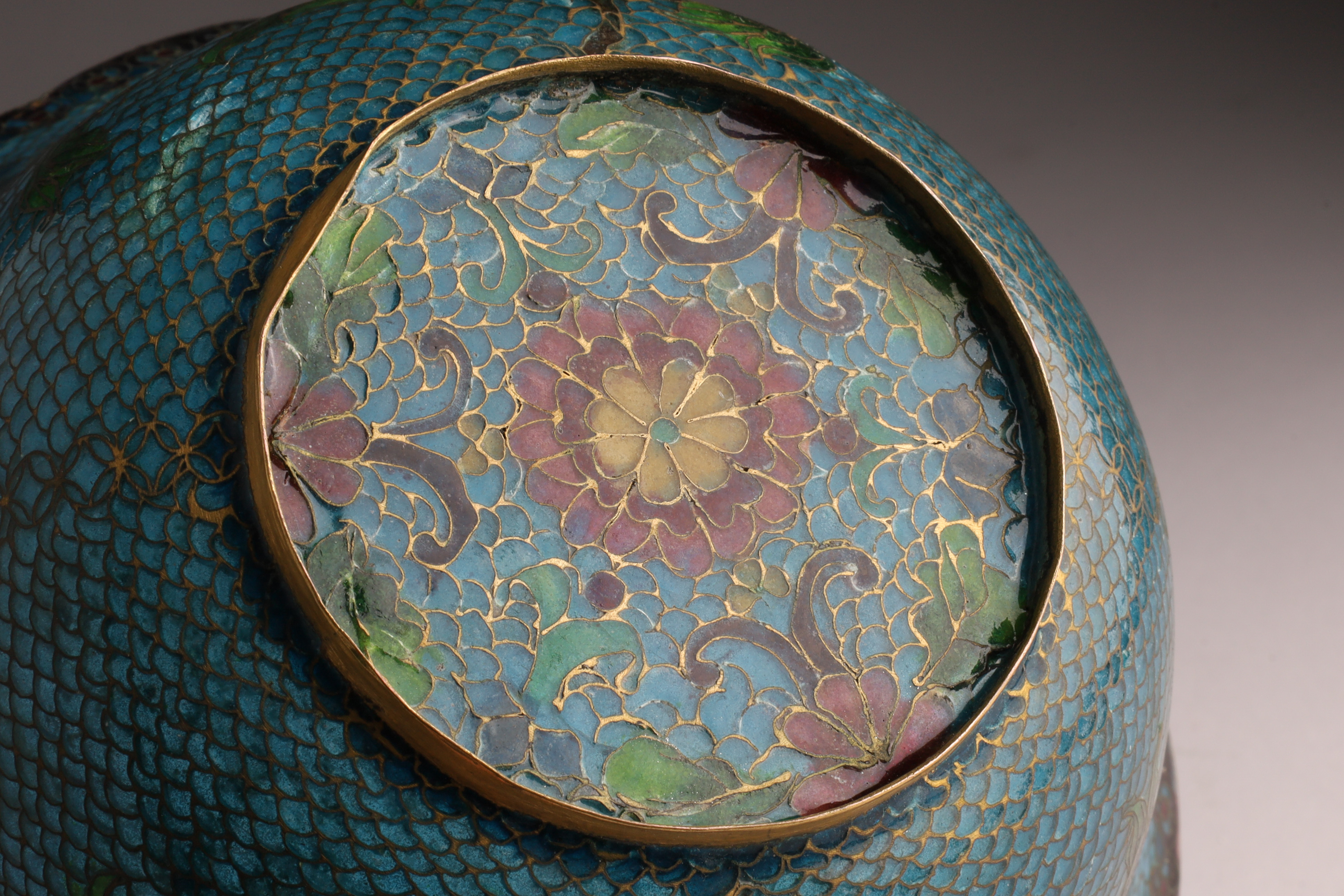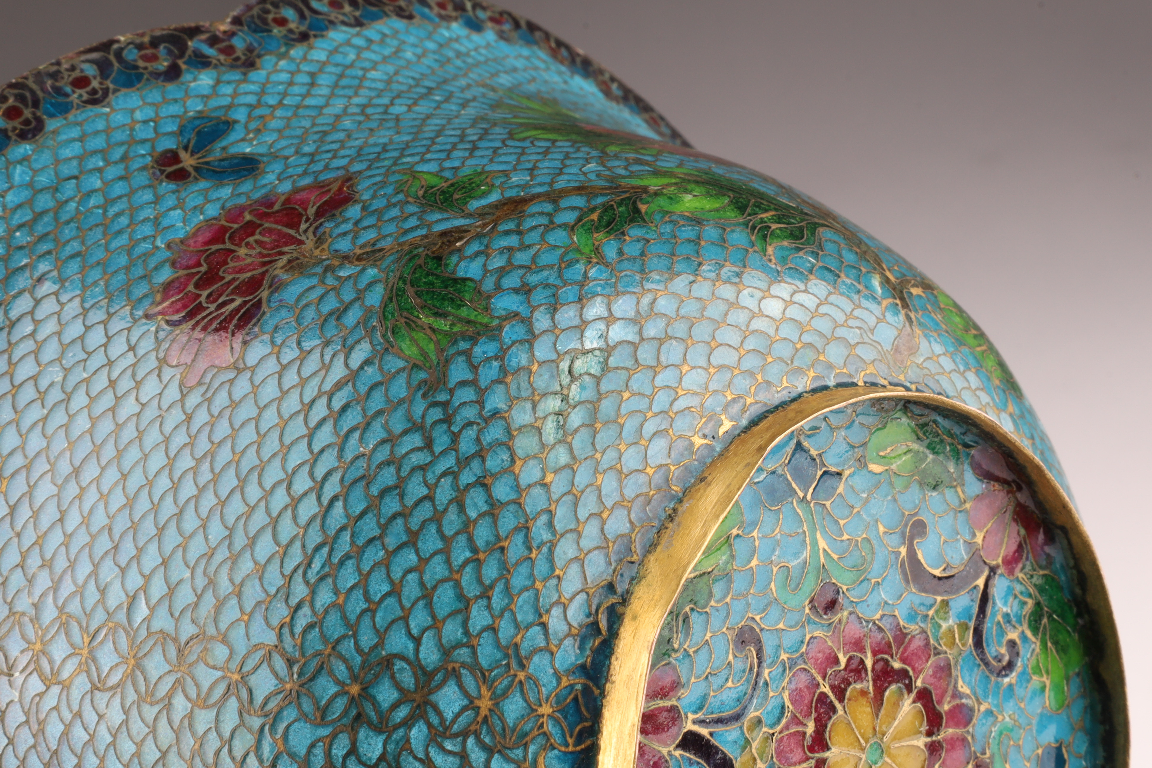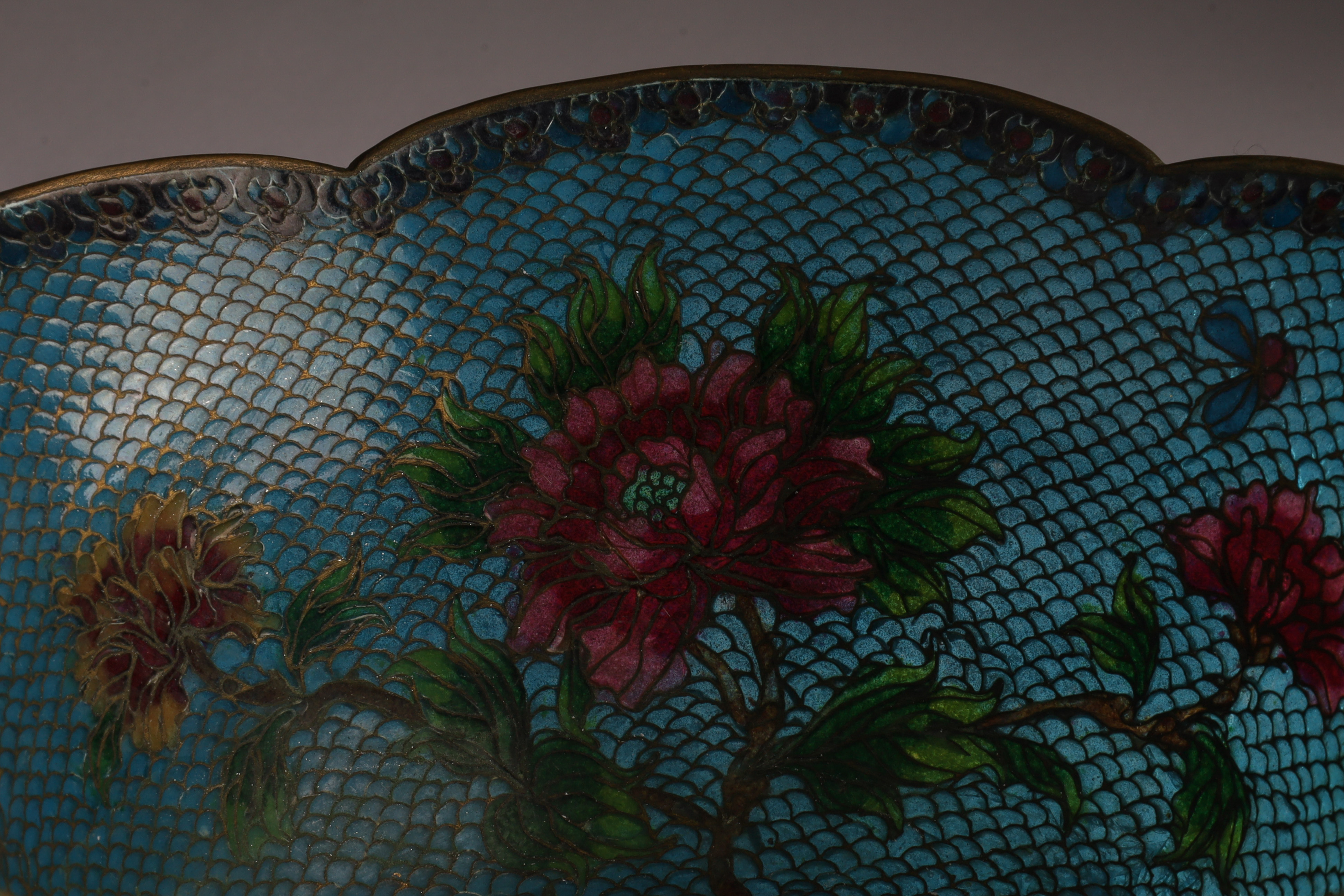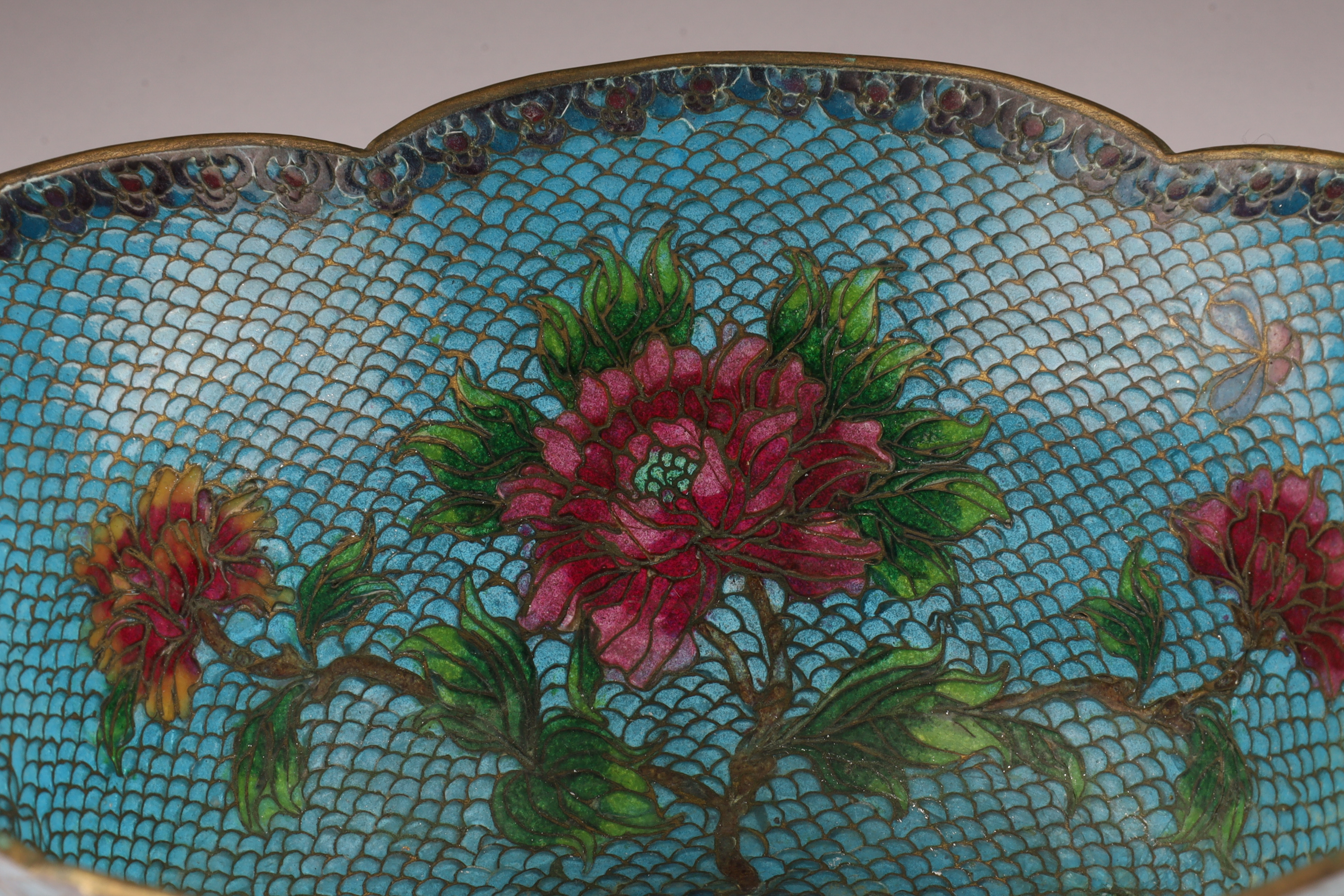 Chinese Plique a Jour Cloisonne Enamel Lobed Footed Bowl, 7 inches W x 3 H. Dent to foot on rim, blemish to enamel over dent.