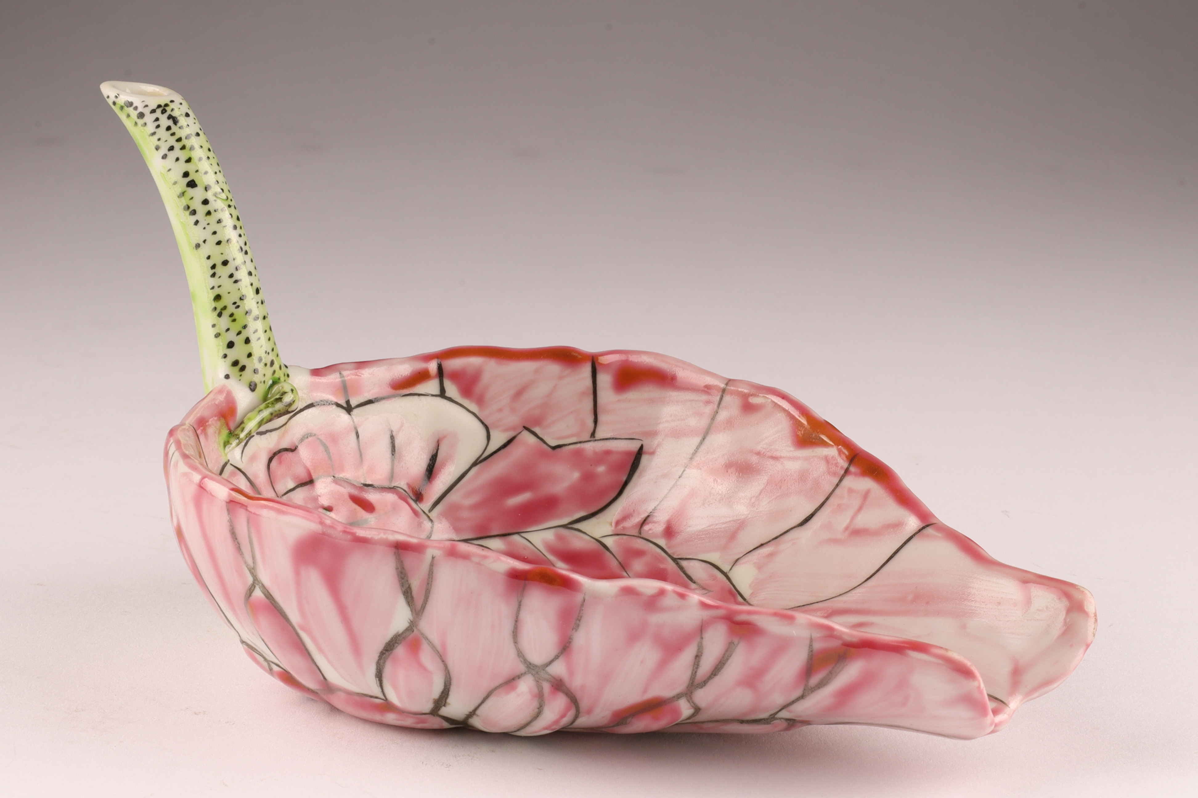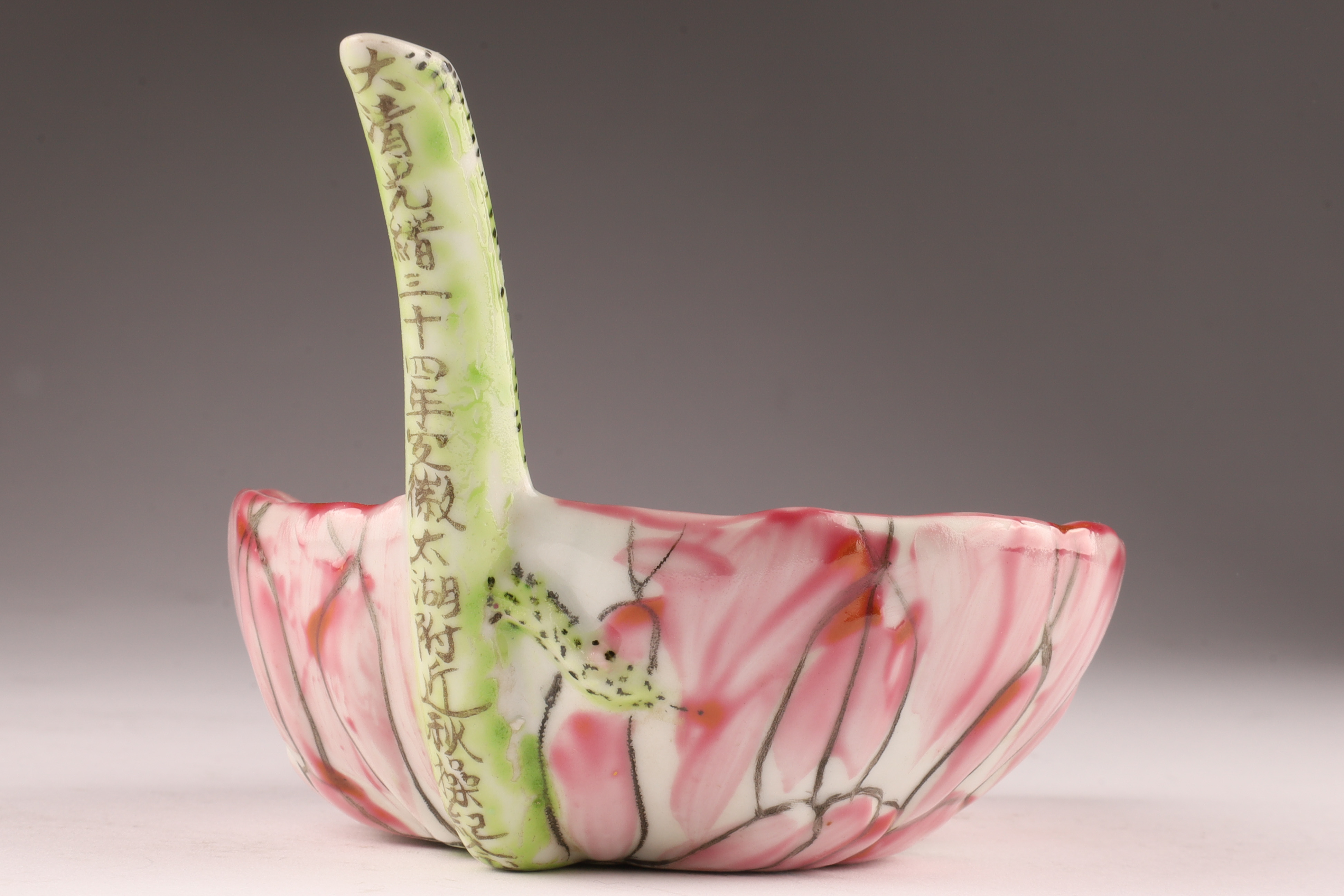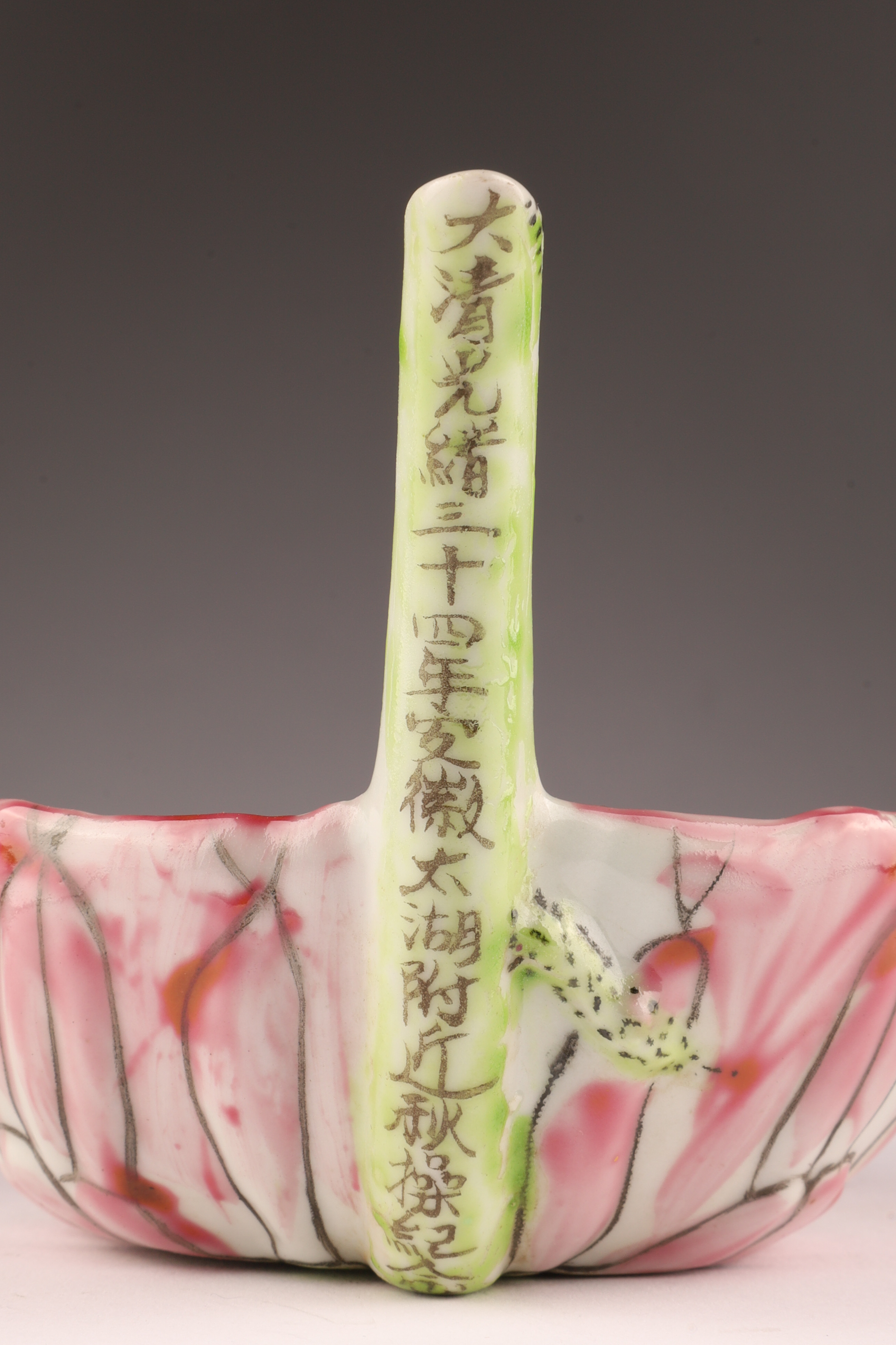 Delicately modeled in the form of a curled lotus leaf with an upturned stem handle, this small famille rose porcelain water dropper (drip bowl) is enamelled in pink, green, and black with finely painted veining. The exterior bears a rare black calligraphic inscription reading “Da Qing Guangxu 30th Year, Autumn Maneuvers Commemoration, ” situating its creation around 1904.
