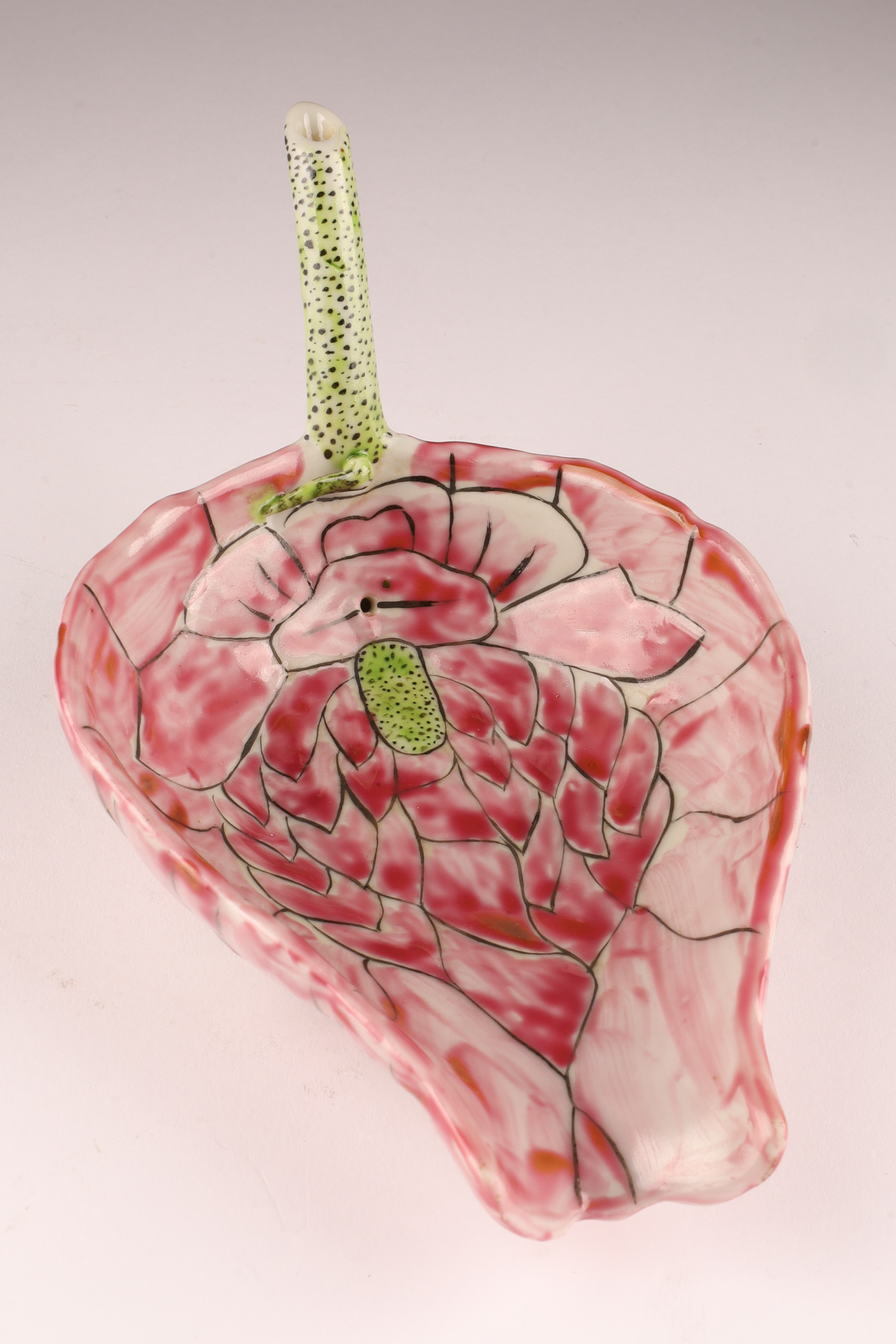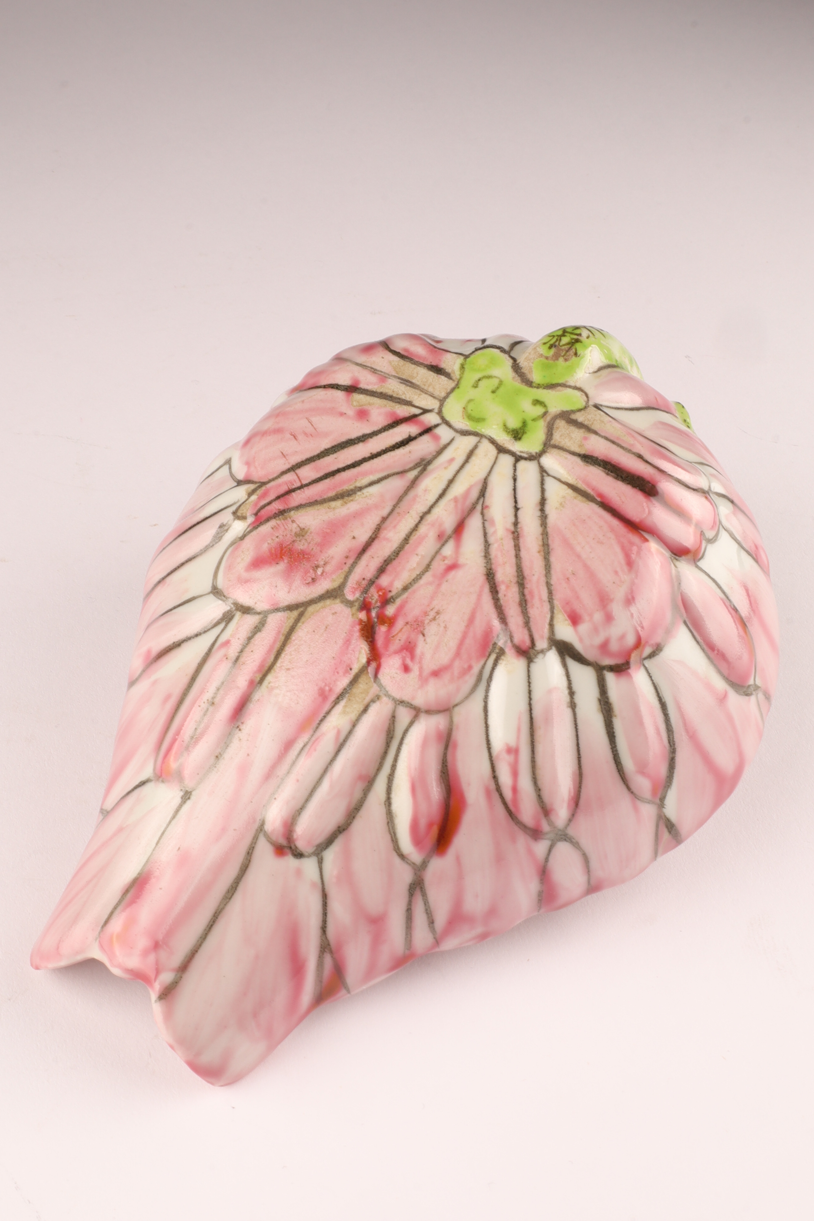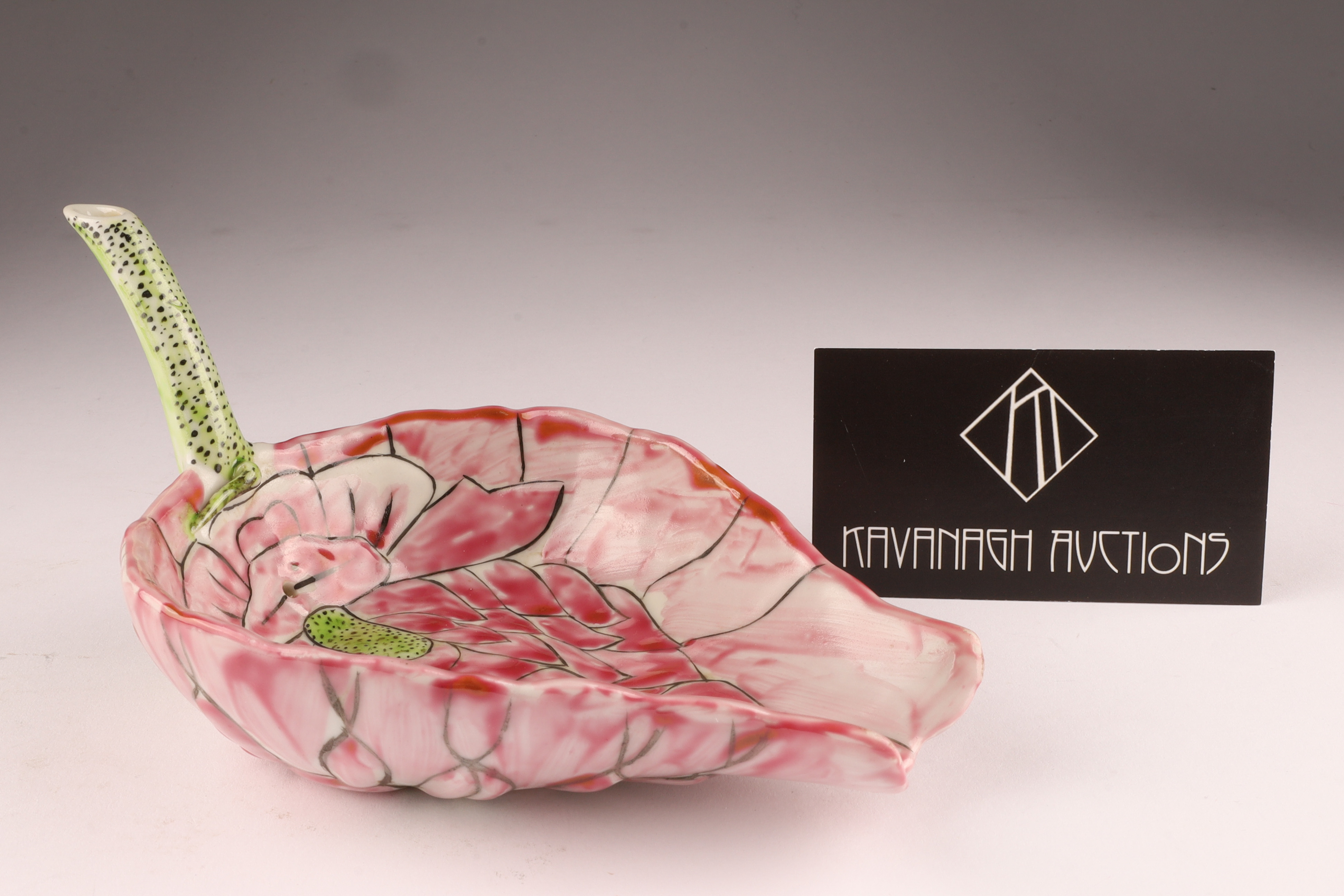 Delicately modeled in the form of a curled lotus leaf with an upturned stem handle, this small famille rose porcelain water dropper (drip bowl) is enamelled in pink, green, and black with finely painted veining. The exterior bears a rare black calligraphic inscription reading “Da Qing Guangxu 30th Year, Autumn Maneuvers Commemoration, ” situating its creation around 1904.