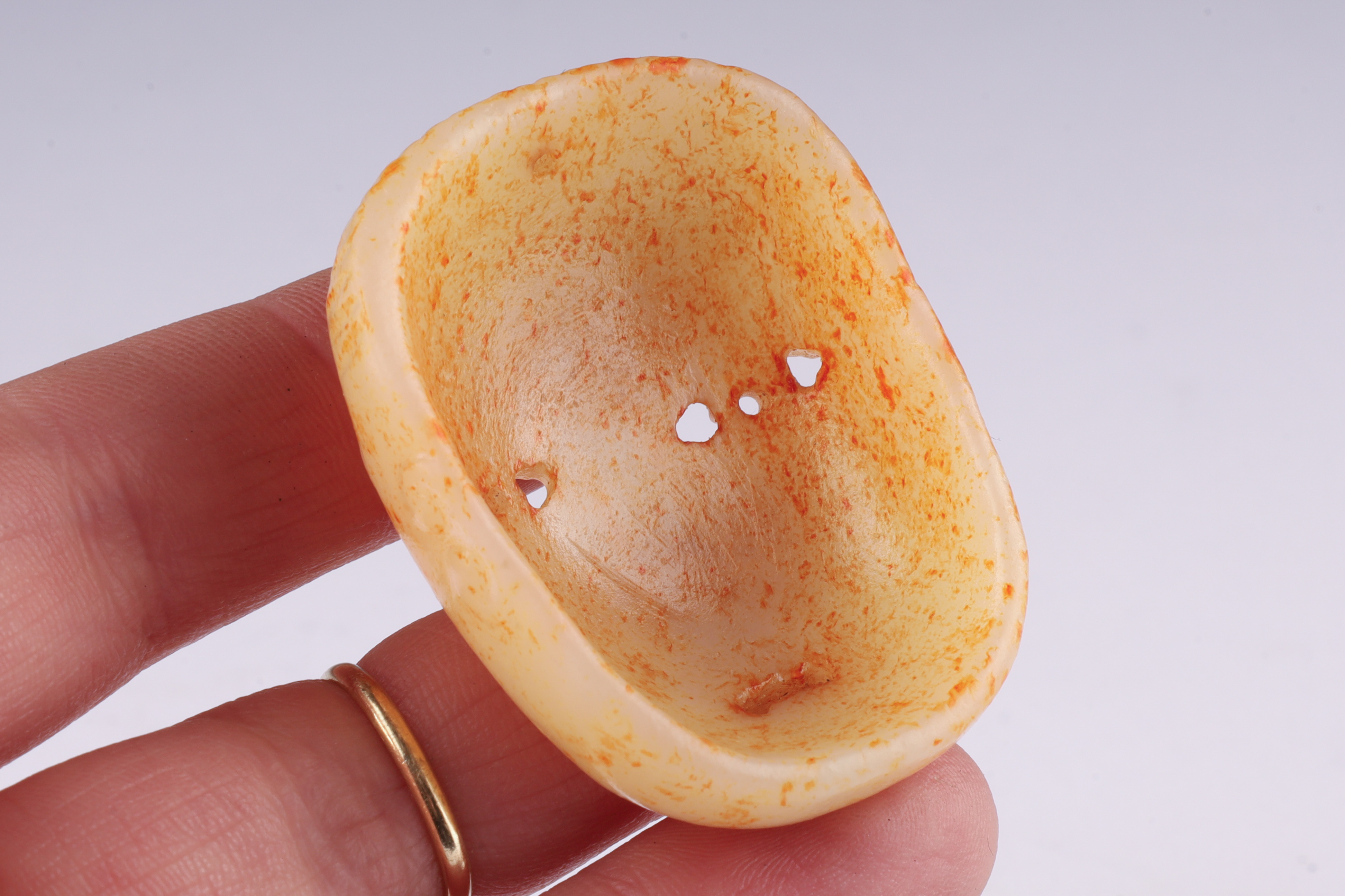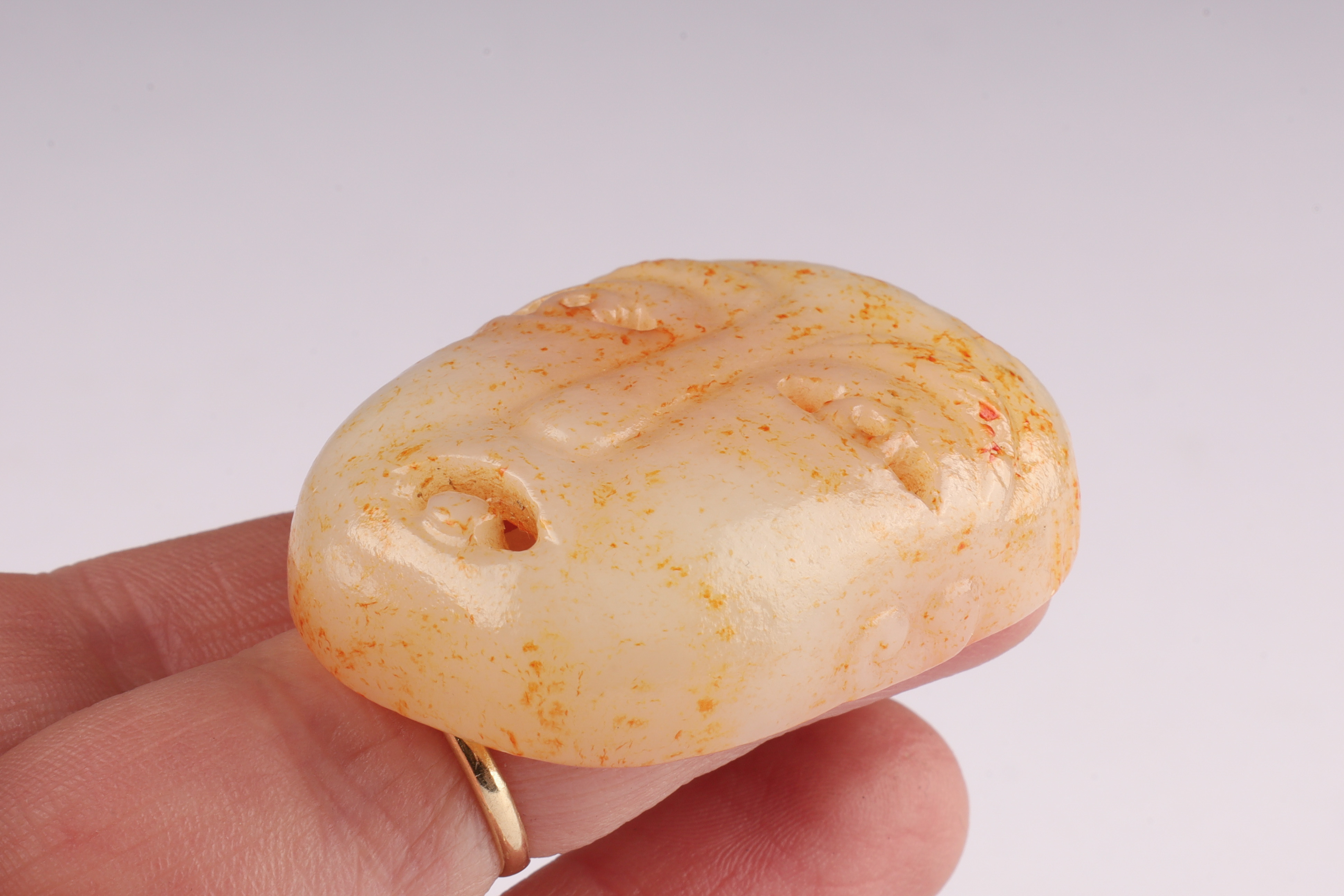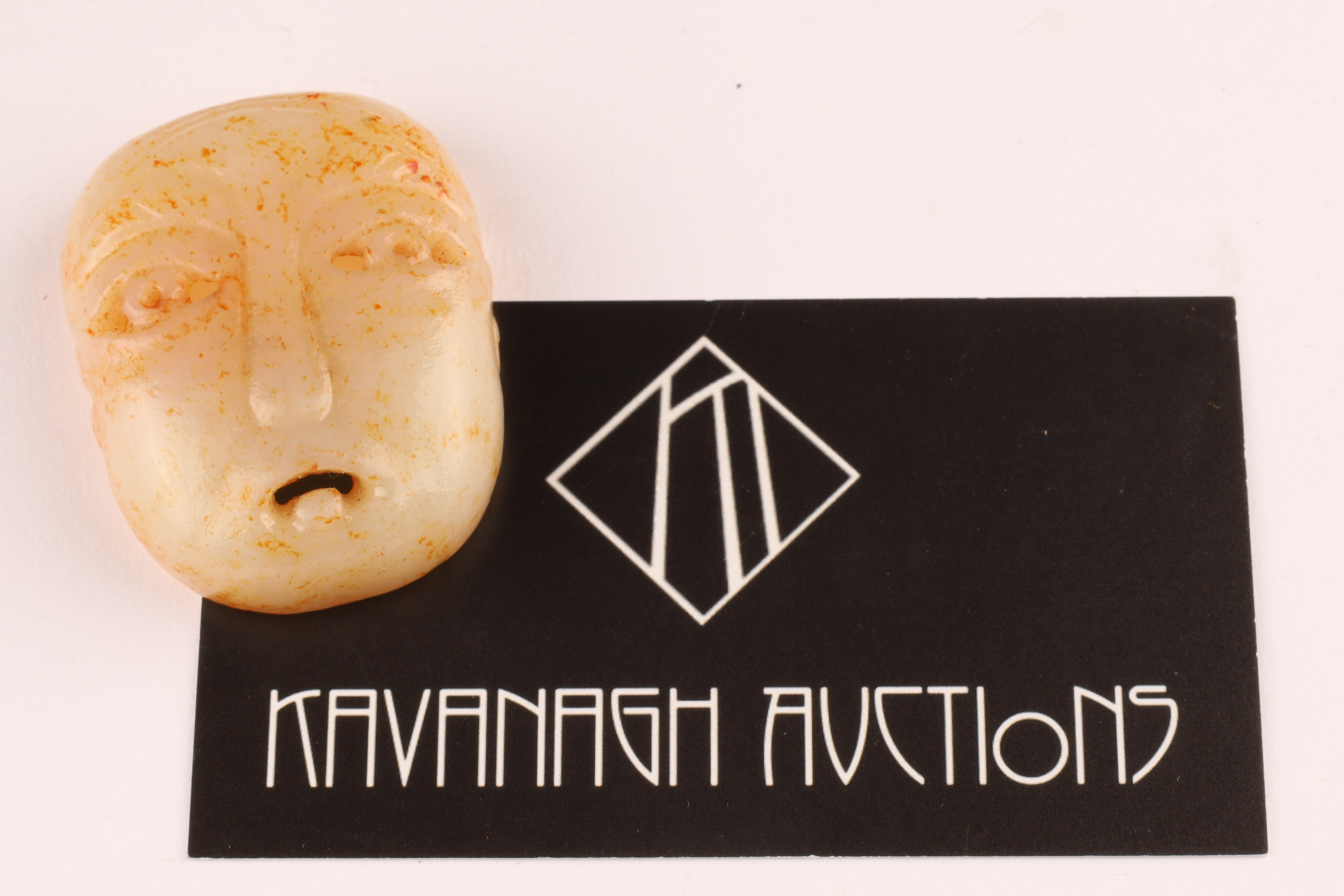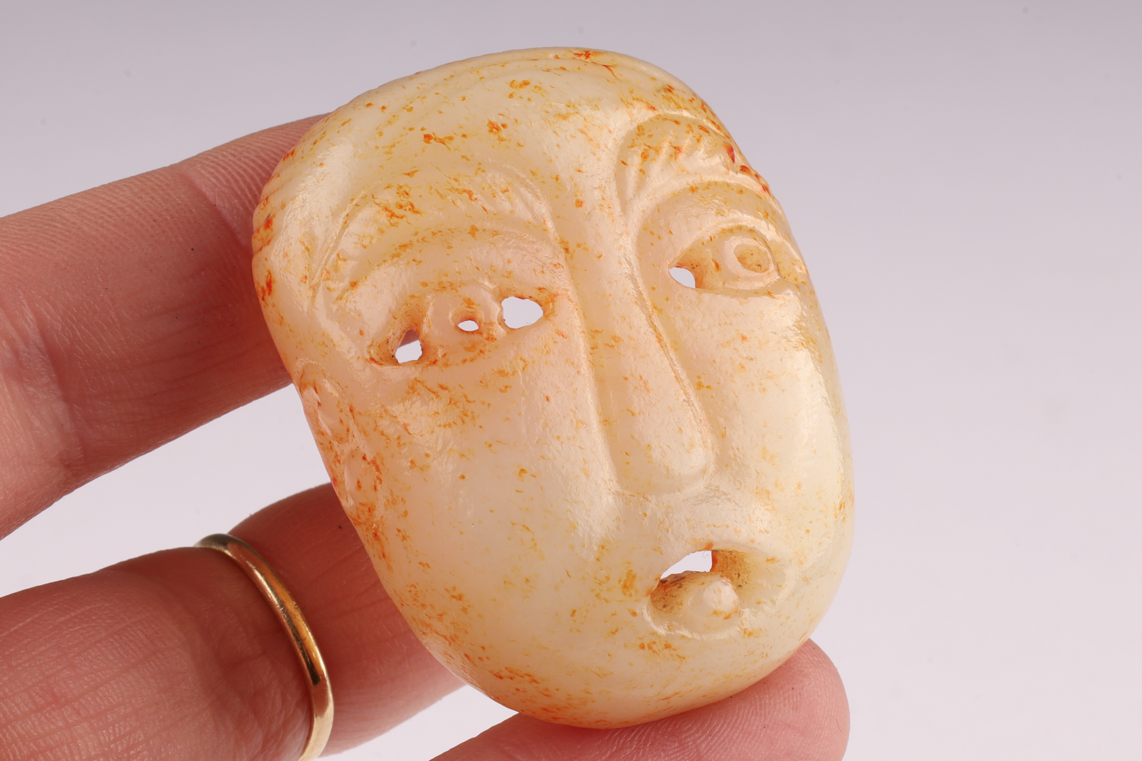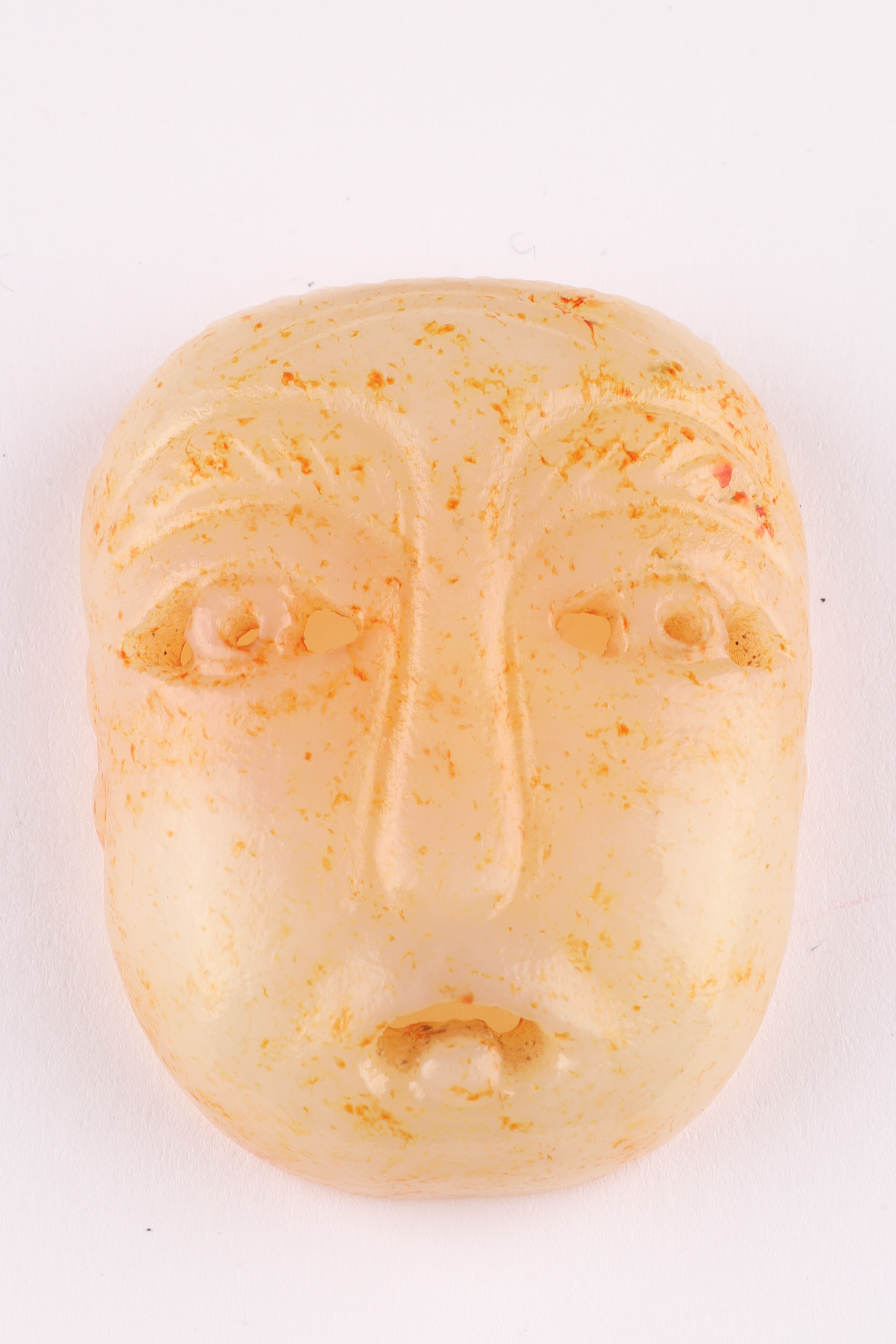 Carved from pale celadon to creamy-white jade with russet and ochre surface staining, the pendant is worked in the form of a stylized human face with drilled eyes, a pronounced nose ridge, and parted lips. The reverse is hollowed, showing tool marks and mineral accretions. The sides are further decorated with faint scroll motifs. Suspension hole to the top, the pendant is fitted with a modern cord and bead for wear.