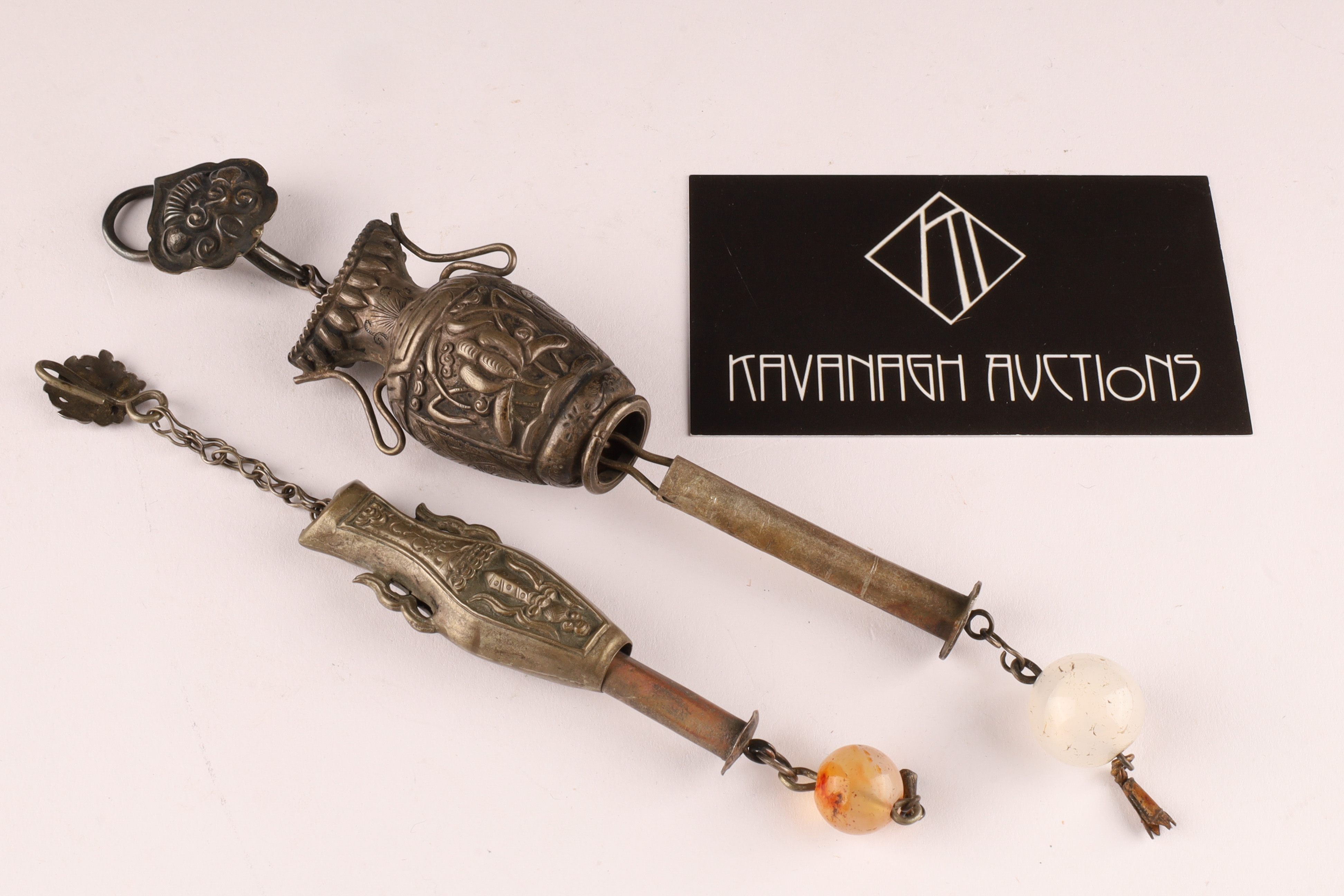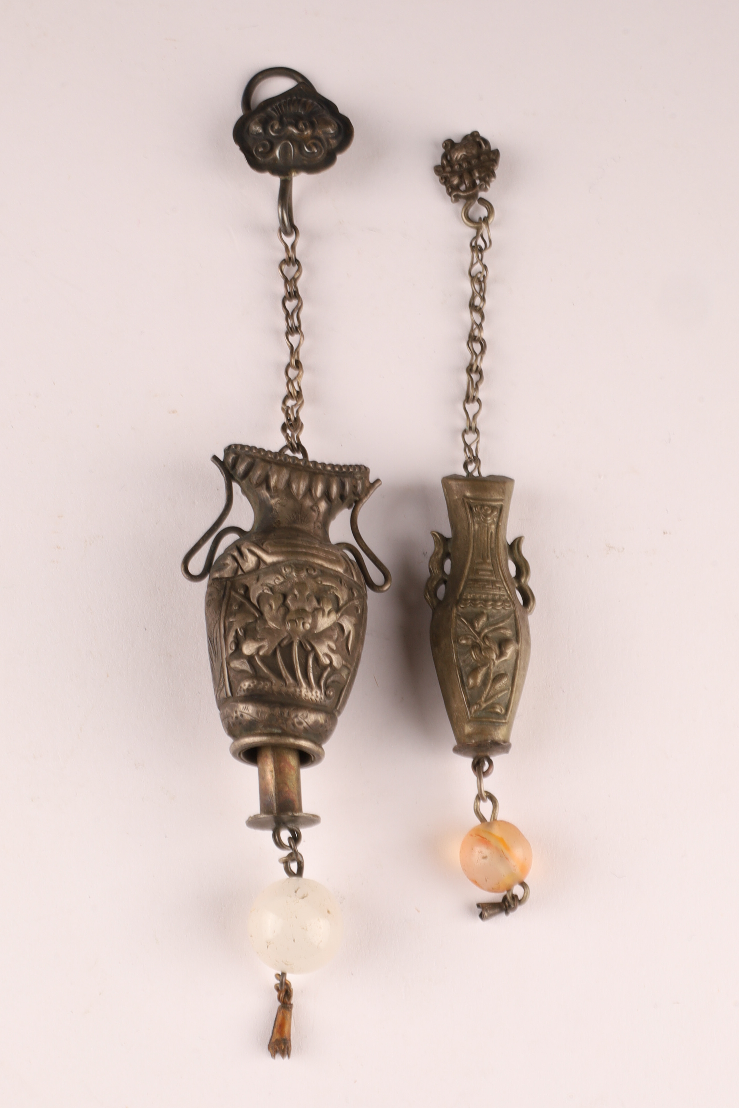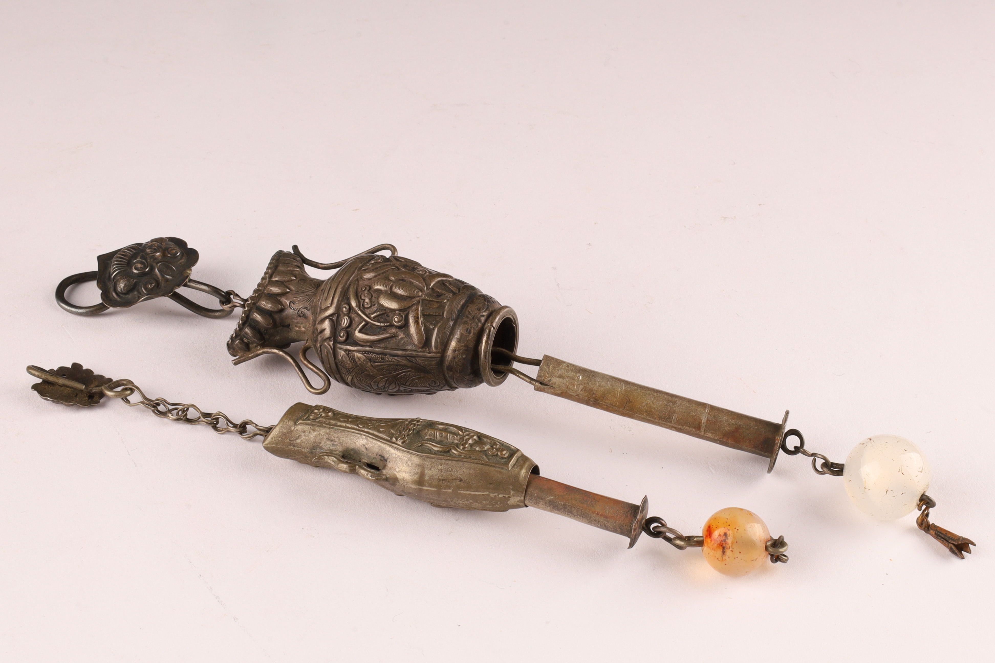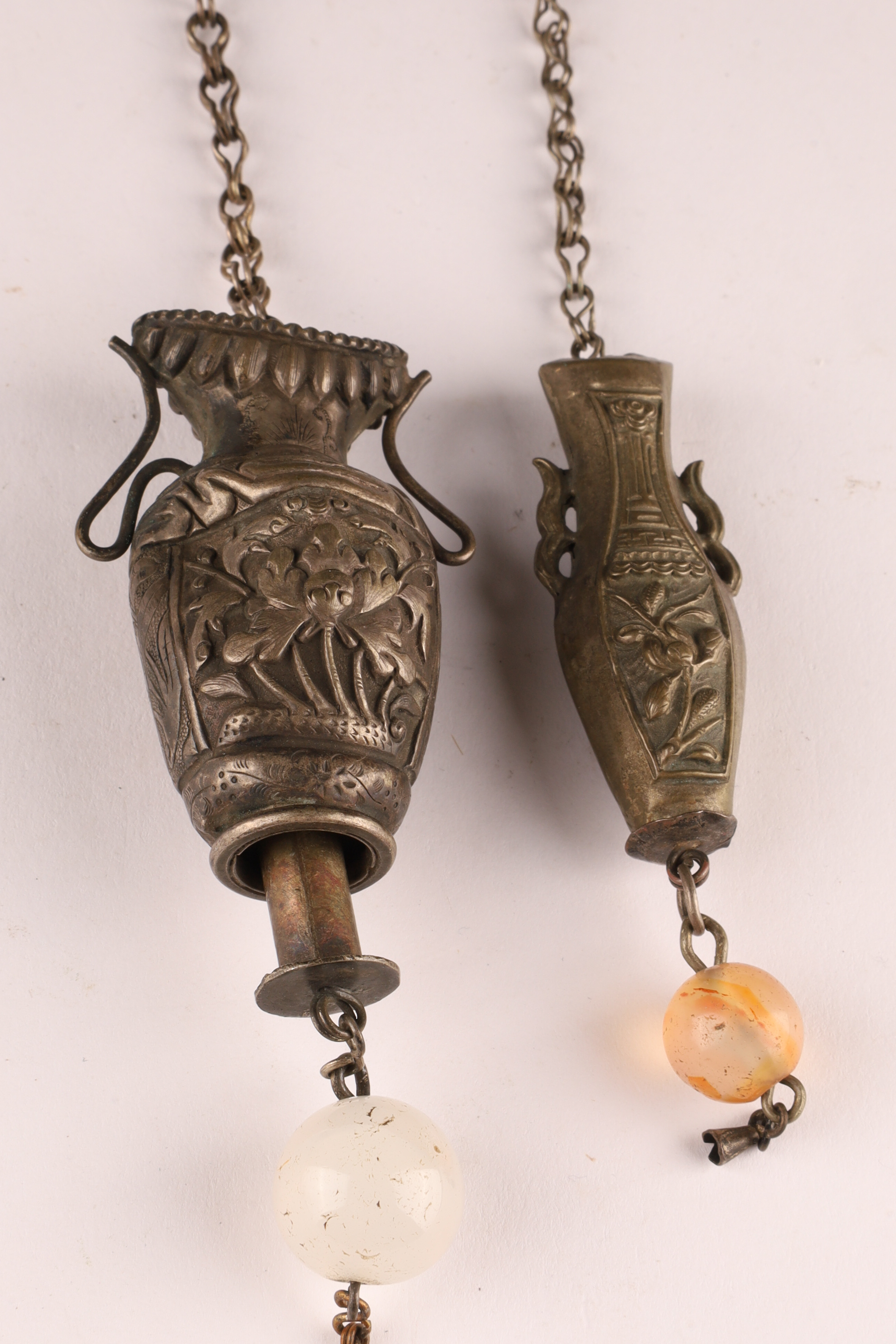 Lot of 2 Antique Chinese Silver Chatelaines with Agate and Jade beads