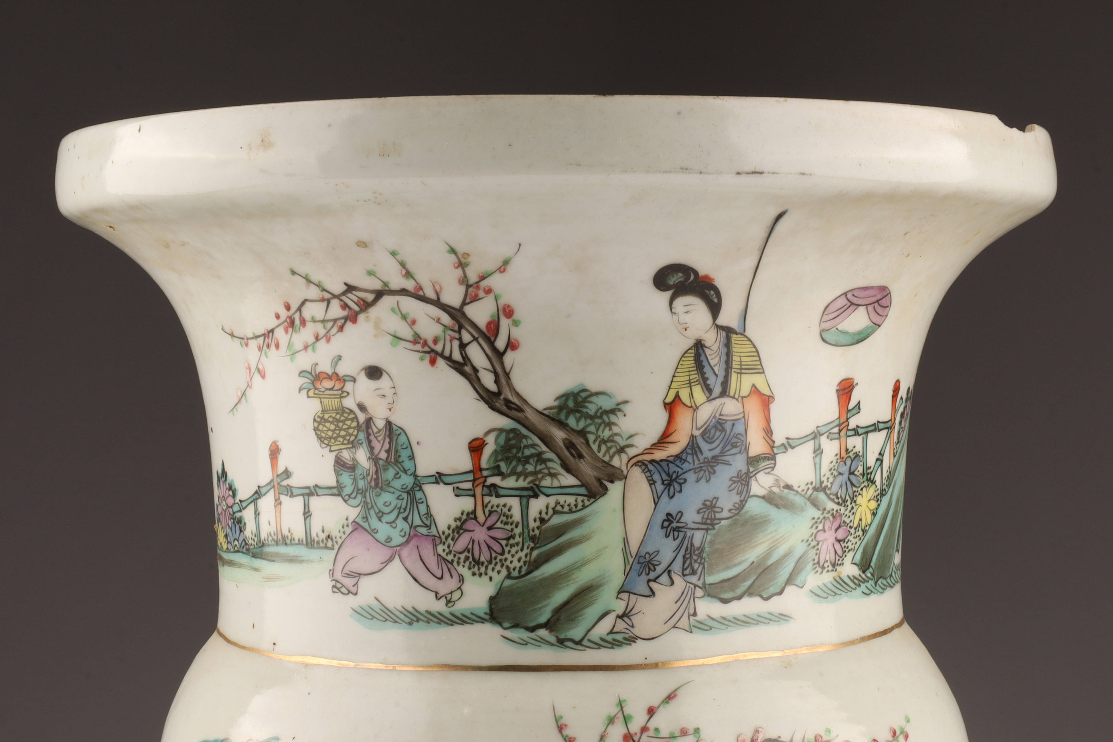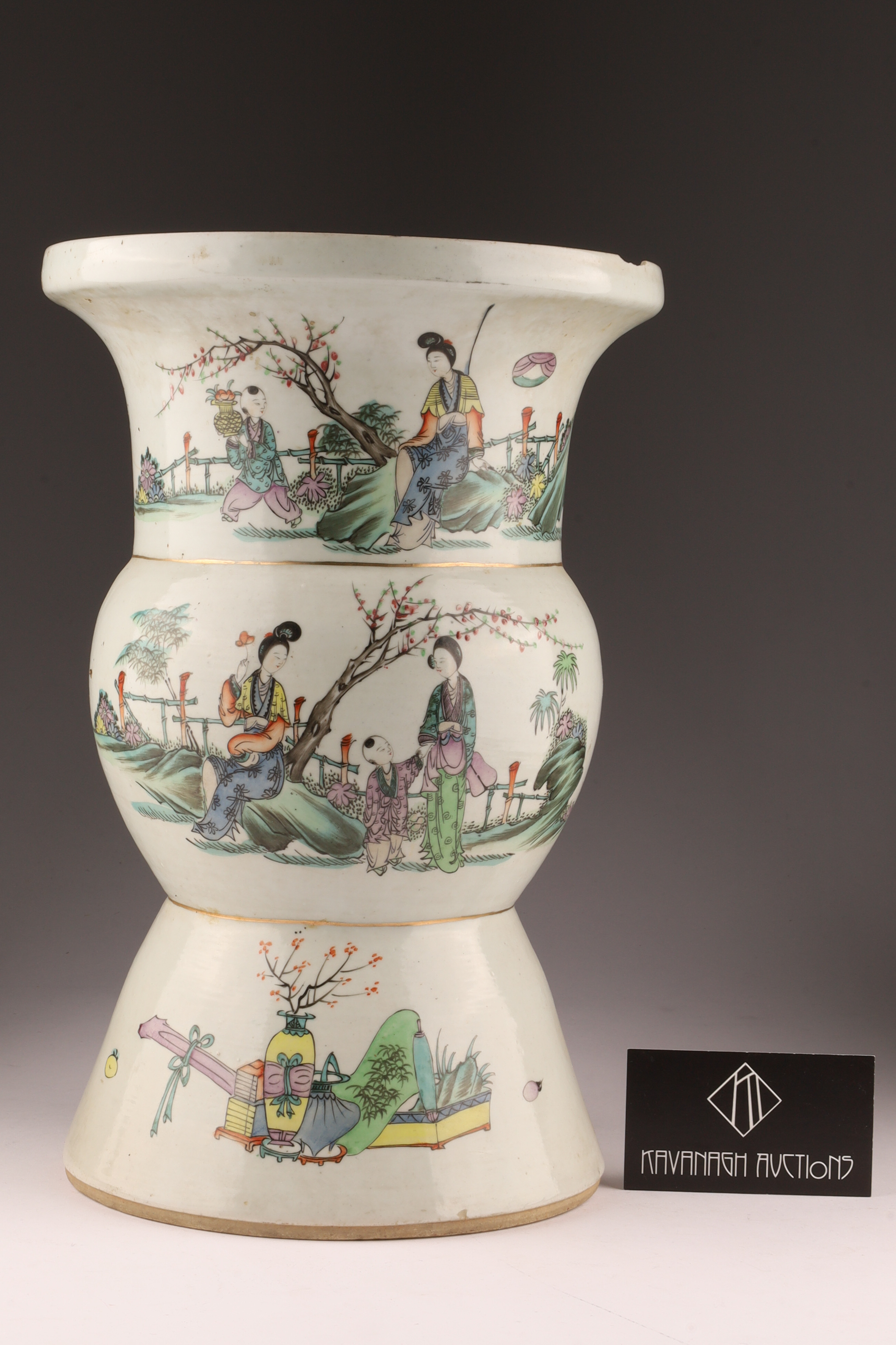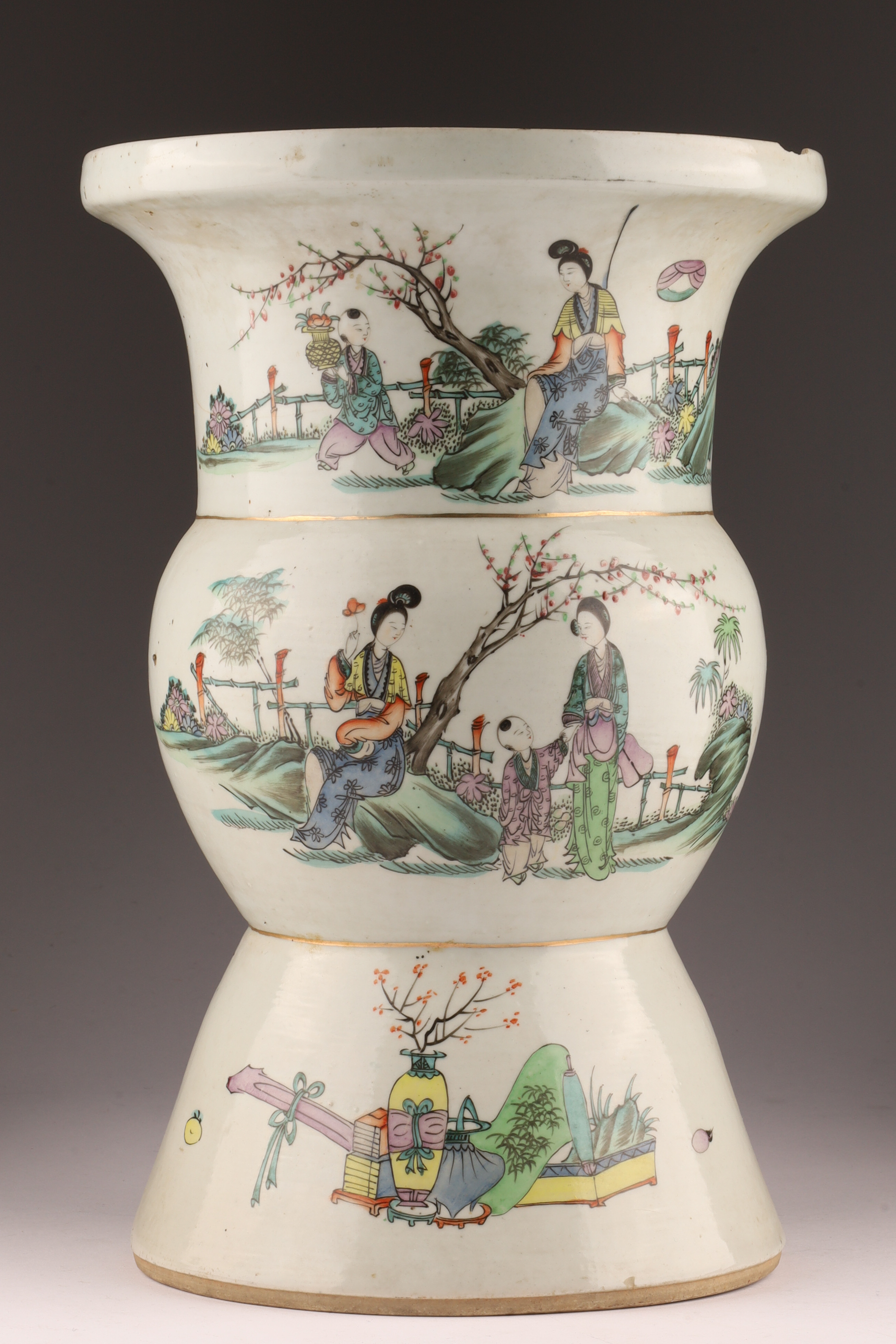 Antique Chinese Famille Rose Gu-Form Vase with Calligraphy and Court Ladies