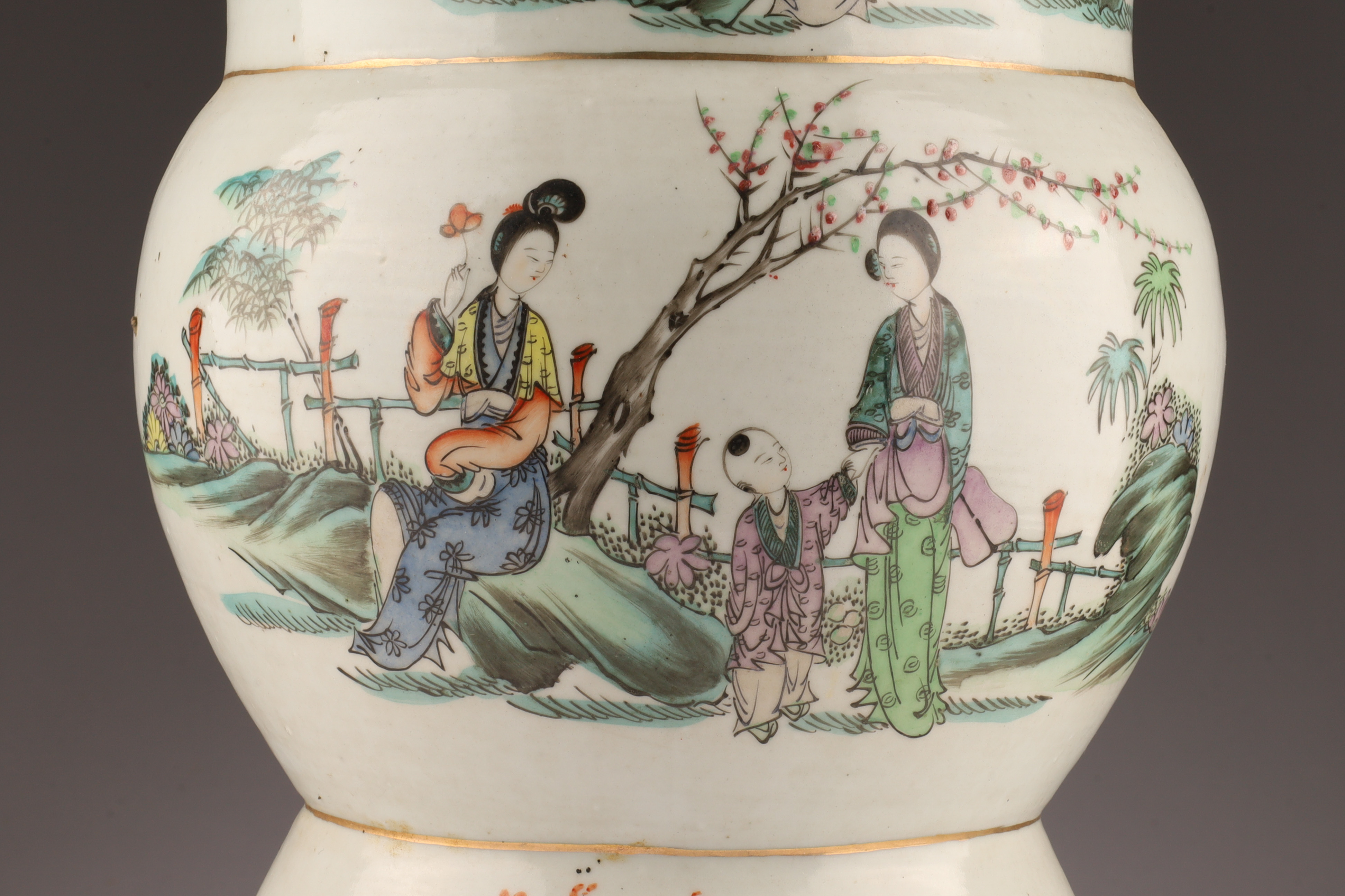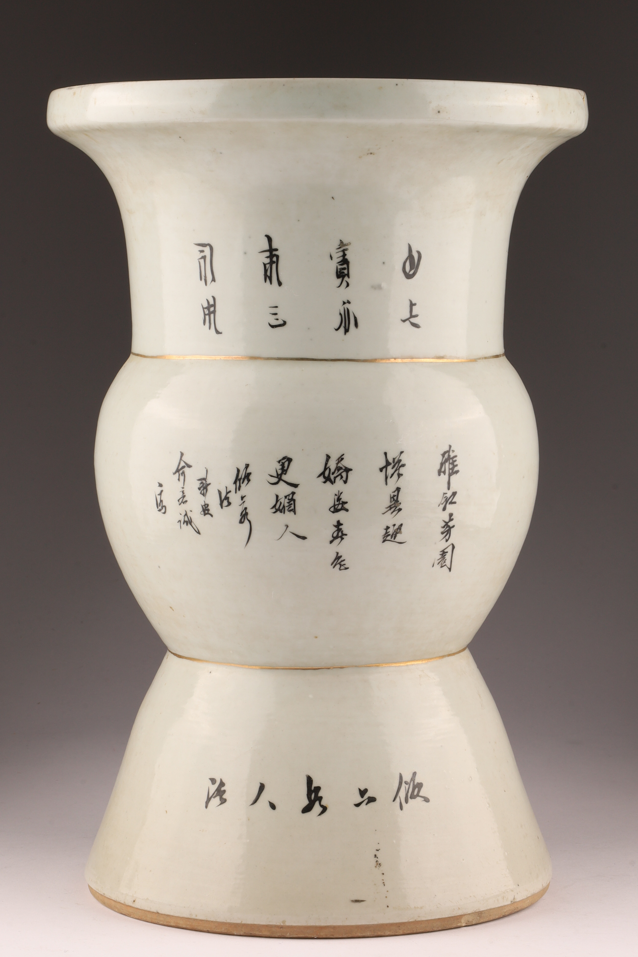 An elegant antique Chinese porcelain vase of gu form, rising from a flared foot to a bulbous midsection and trumpet mouth. One side is finely decorated in famille rose enamels with scenes of court ladies in a garden setting beneath blossoming trees, while auspicious objects adorn the lower register. The reverse bears poetic inscriptions in black calligraphy, evoking images of mountains, rivers, spring blossoms, and wishes for harmony and refinement — complementing the painted scenes.