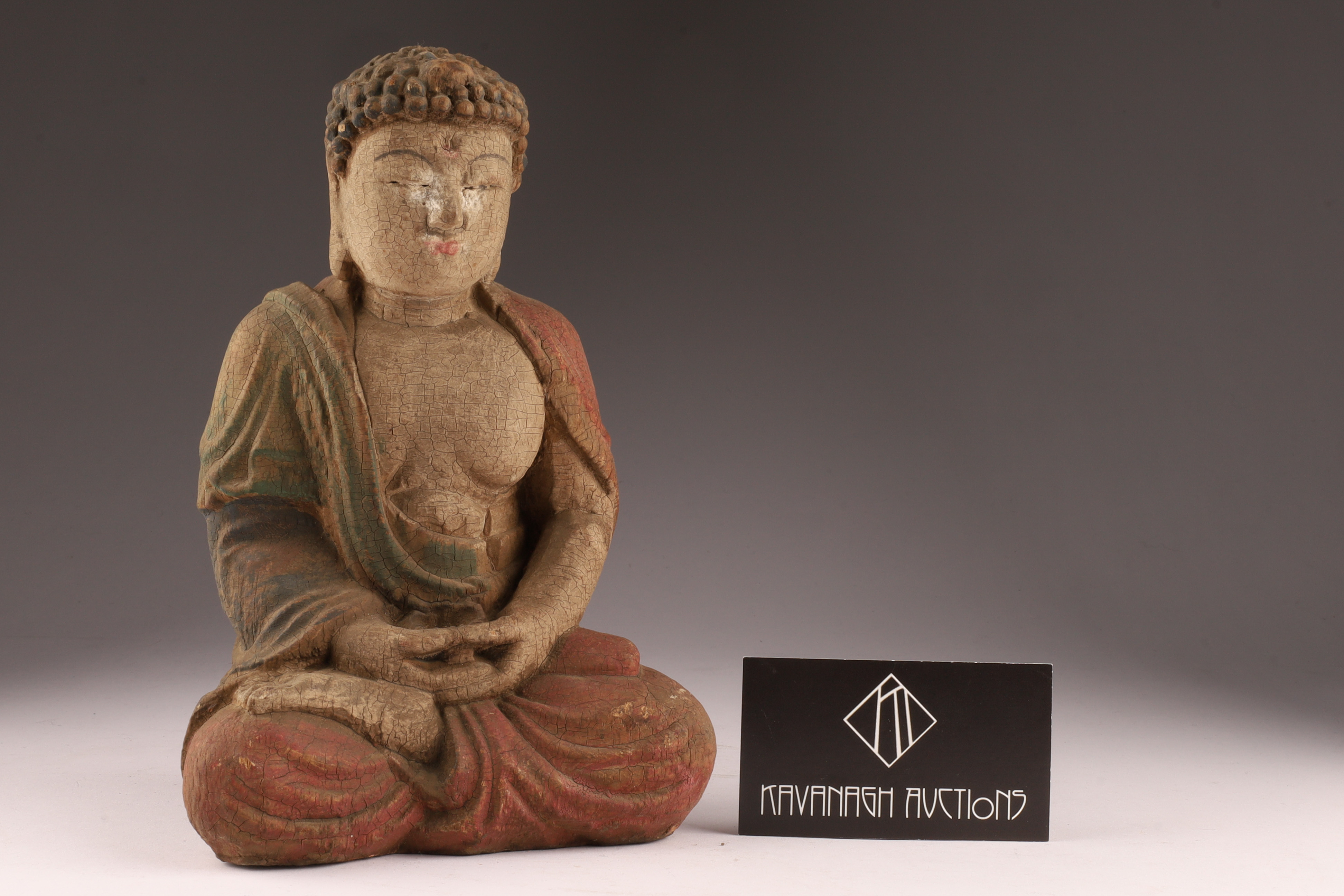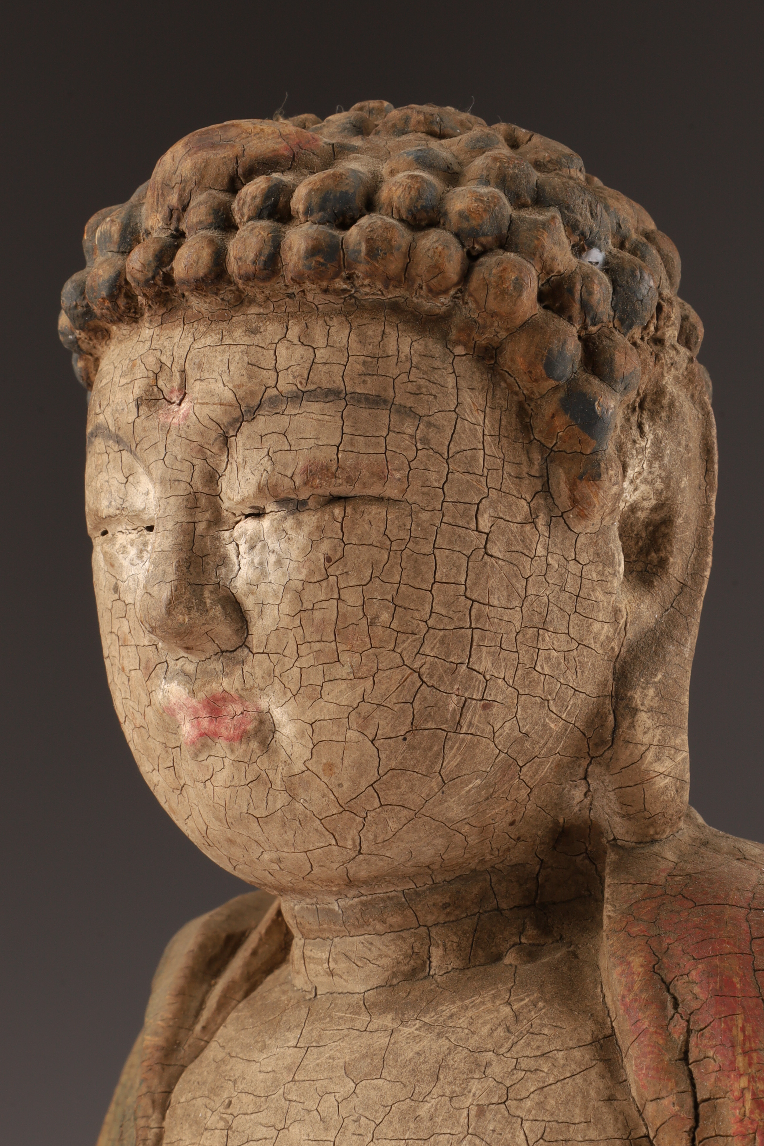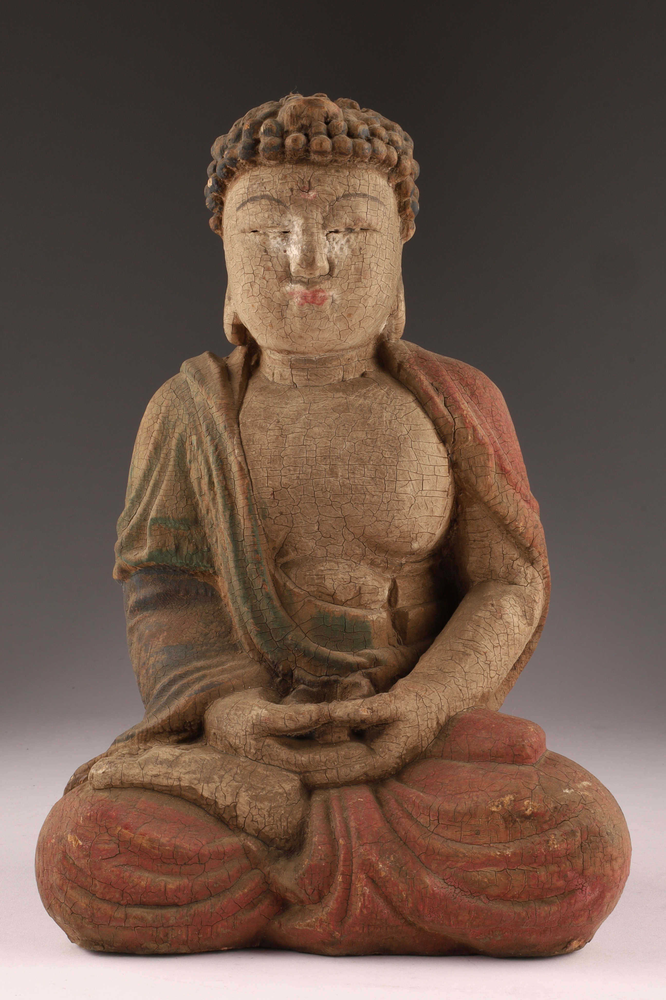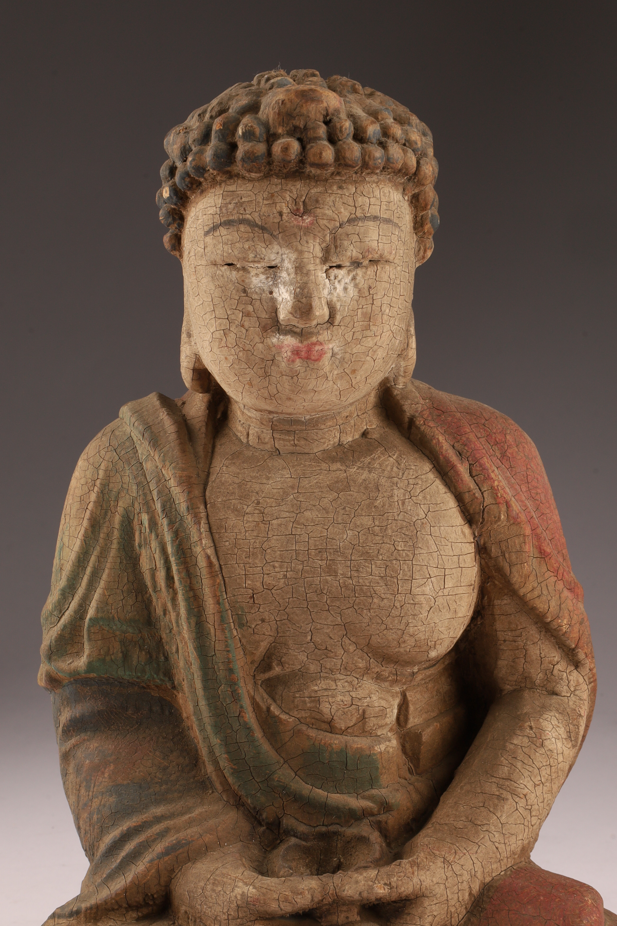Finely carved and polychromed wood figure of Shakyamuni Buddha, seated in dhyana asana (the meditative lotus position) with hands resting in dhyana mudra, symbolizing inner balance and enlightenment. The Buddha’s serene expression is rendered with downcast eyes, a gentle smile, and a broad oval face framed by tightly coiled curls.