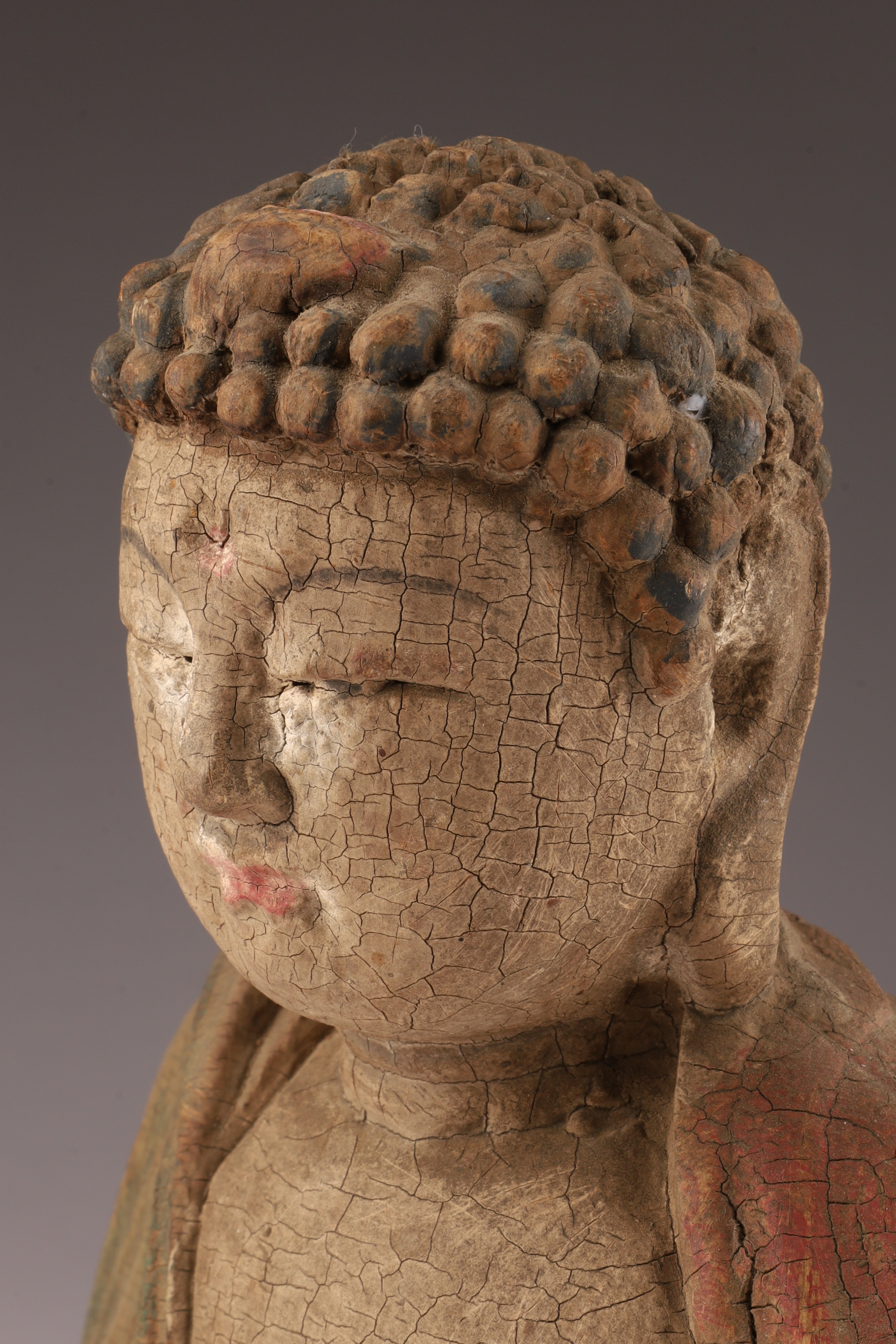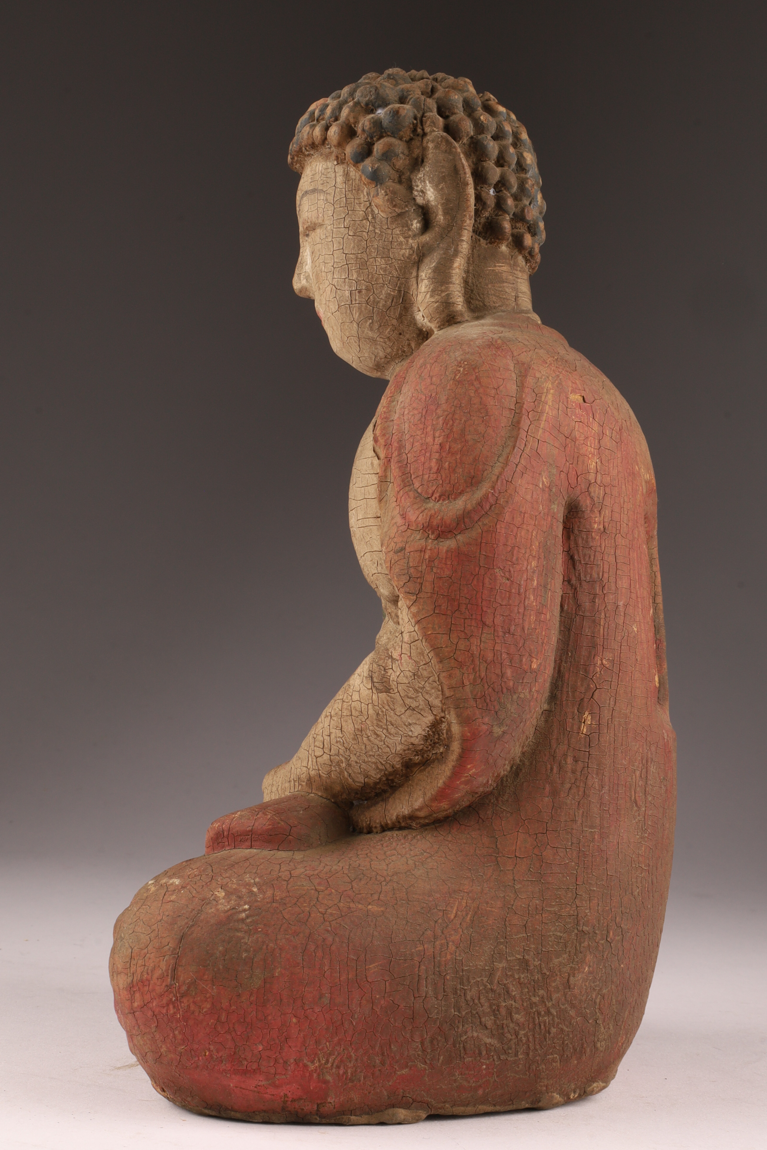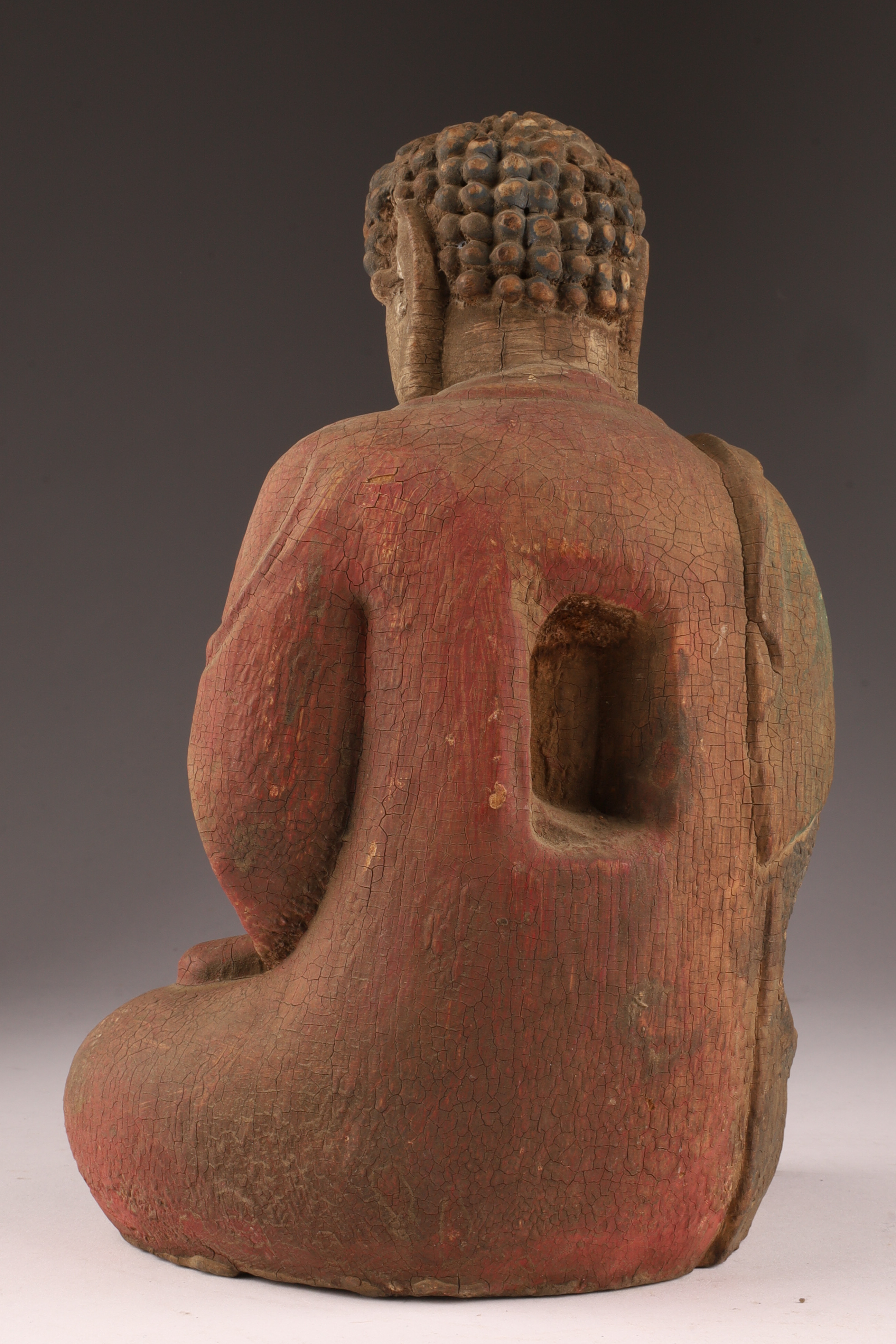 Antique Tibetan Polychrome Wood Carved Shakyamuni Buddha, ca. 1880-1930