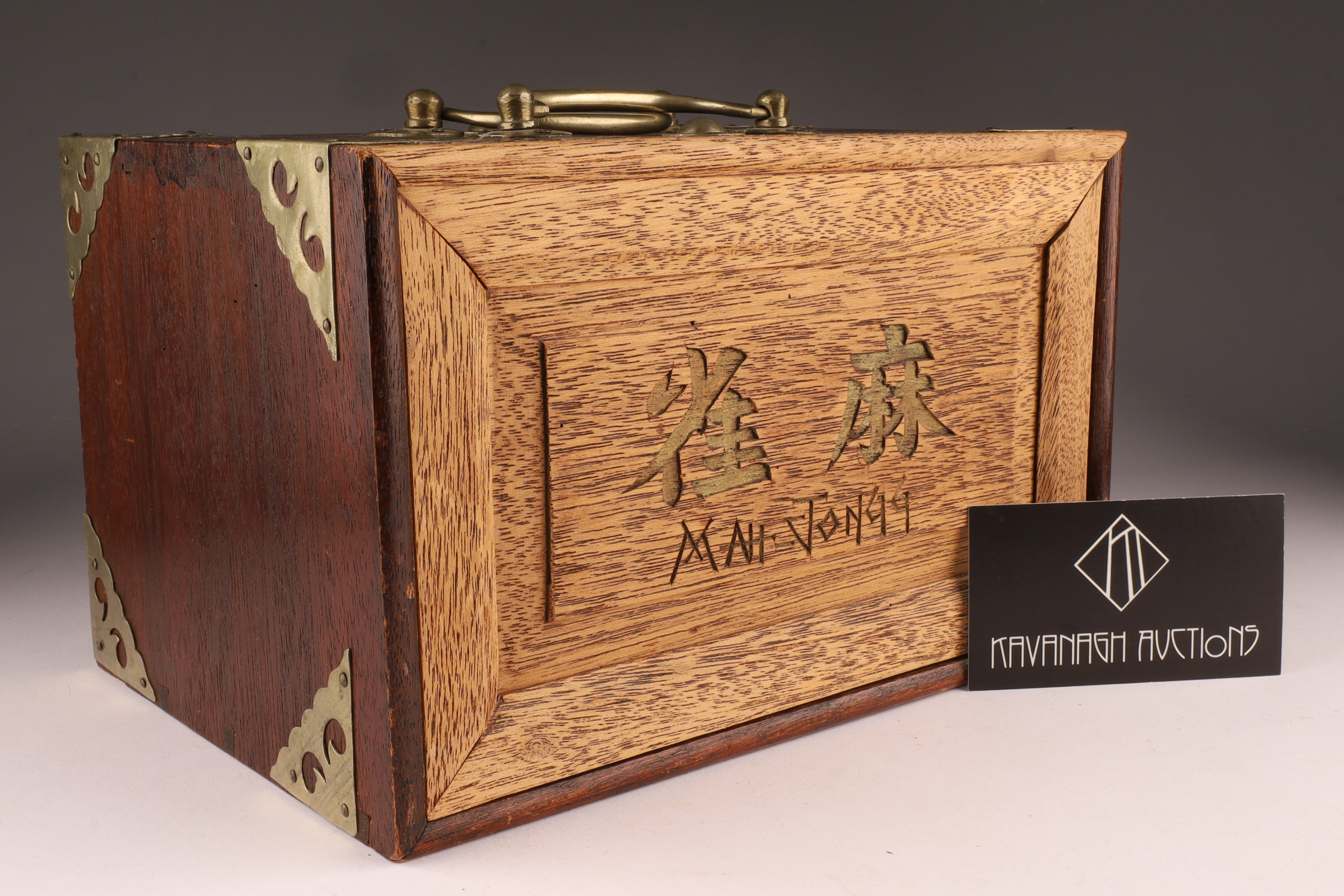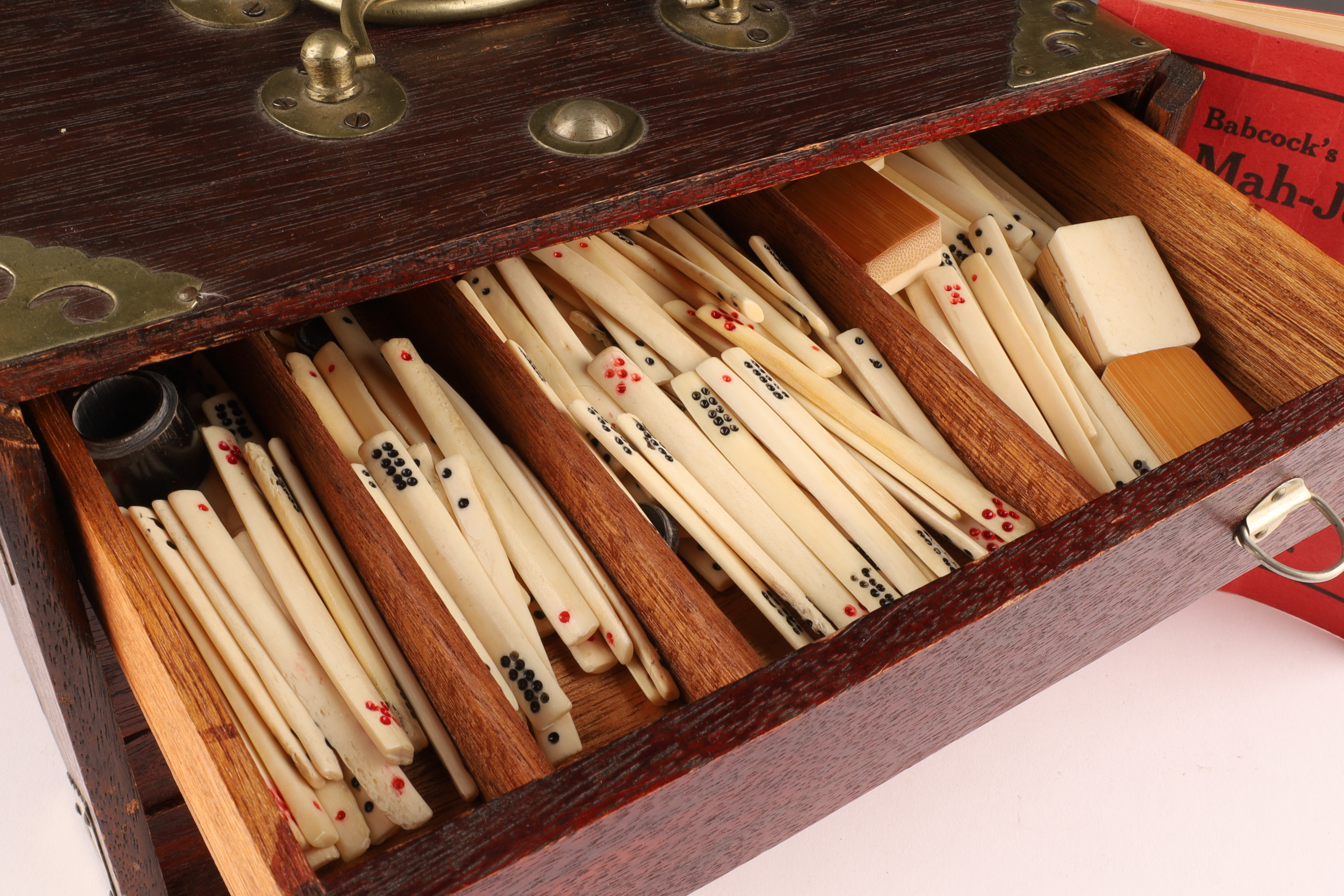 Antique Chinese Mah Jongg Set, C. 1923. In hardwood box with brass bound corners. 148 (144 plus blanks) Tiles made of bone and bamboo with markers and original instructions dated 1923. Box measures 6 inches H x 7 deep x 9.5 W.