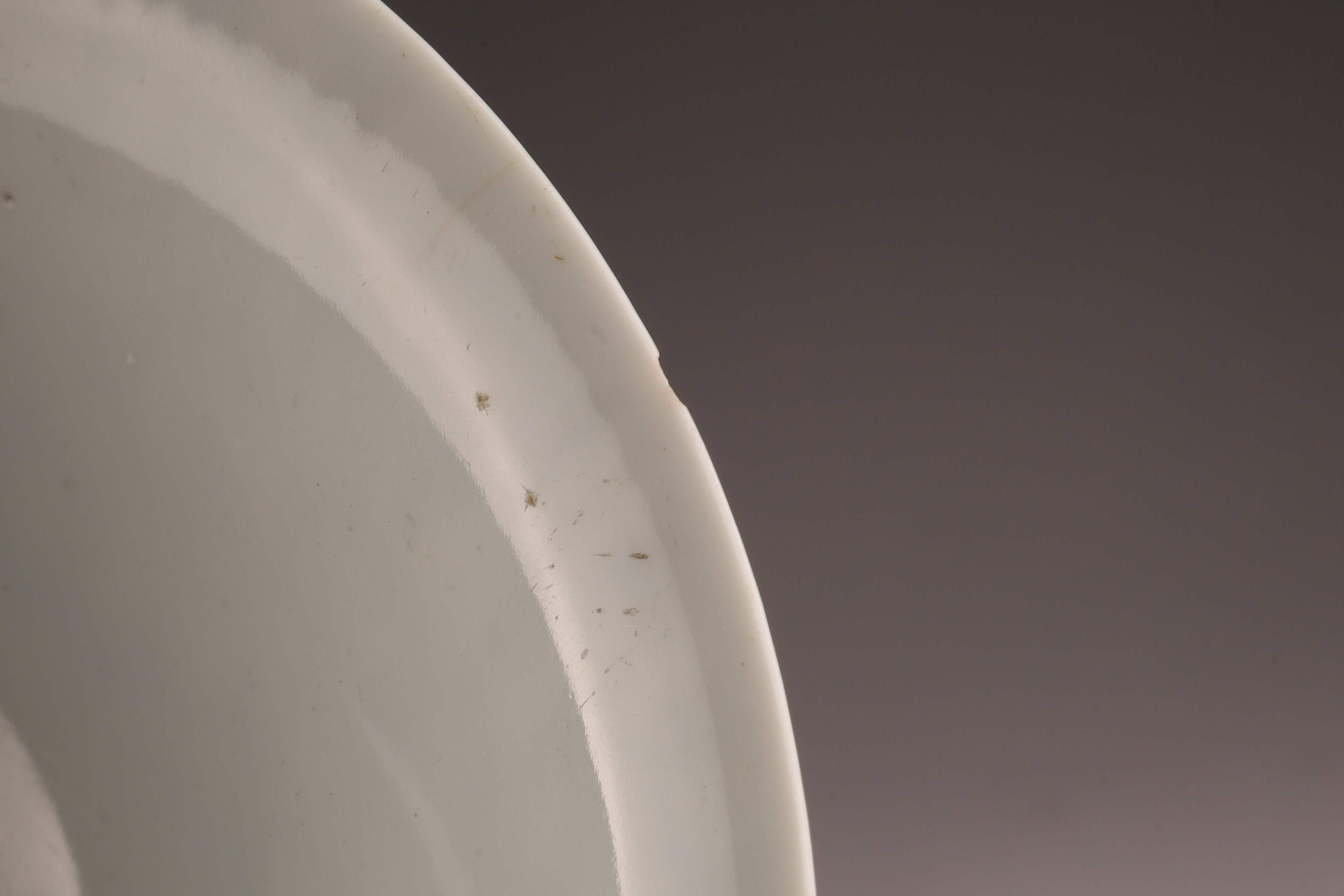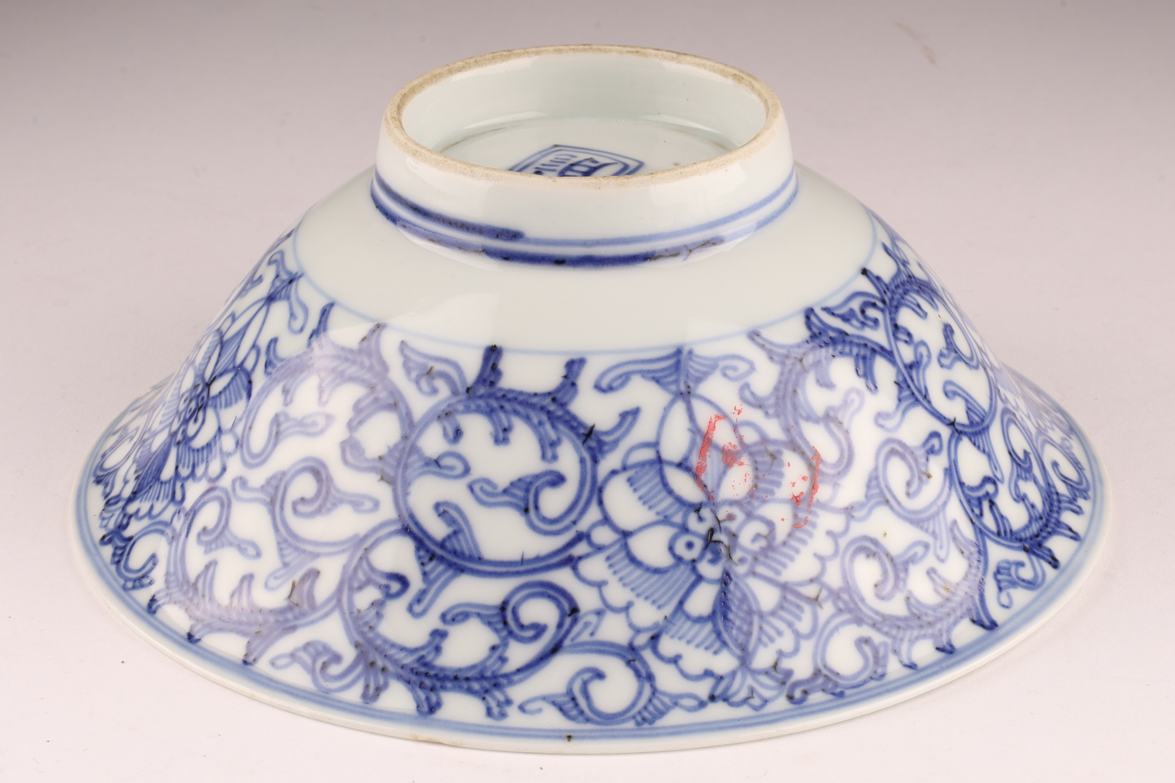 Chinese Porcelain Bowl Blue and White Vine Decoration. On raised foot with flared rim, signed on underside.