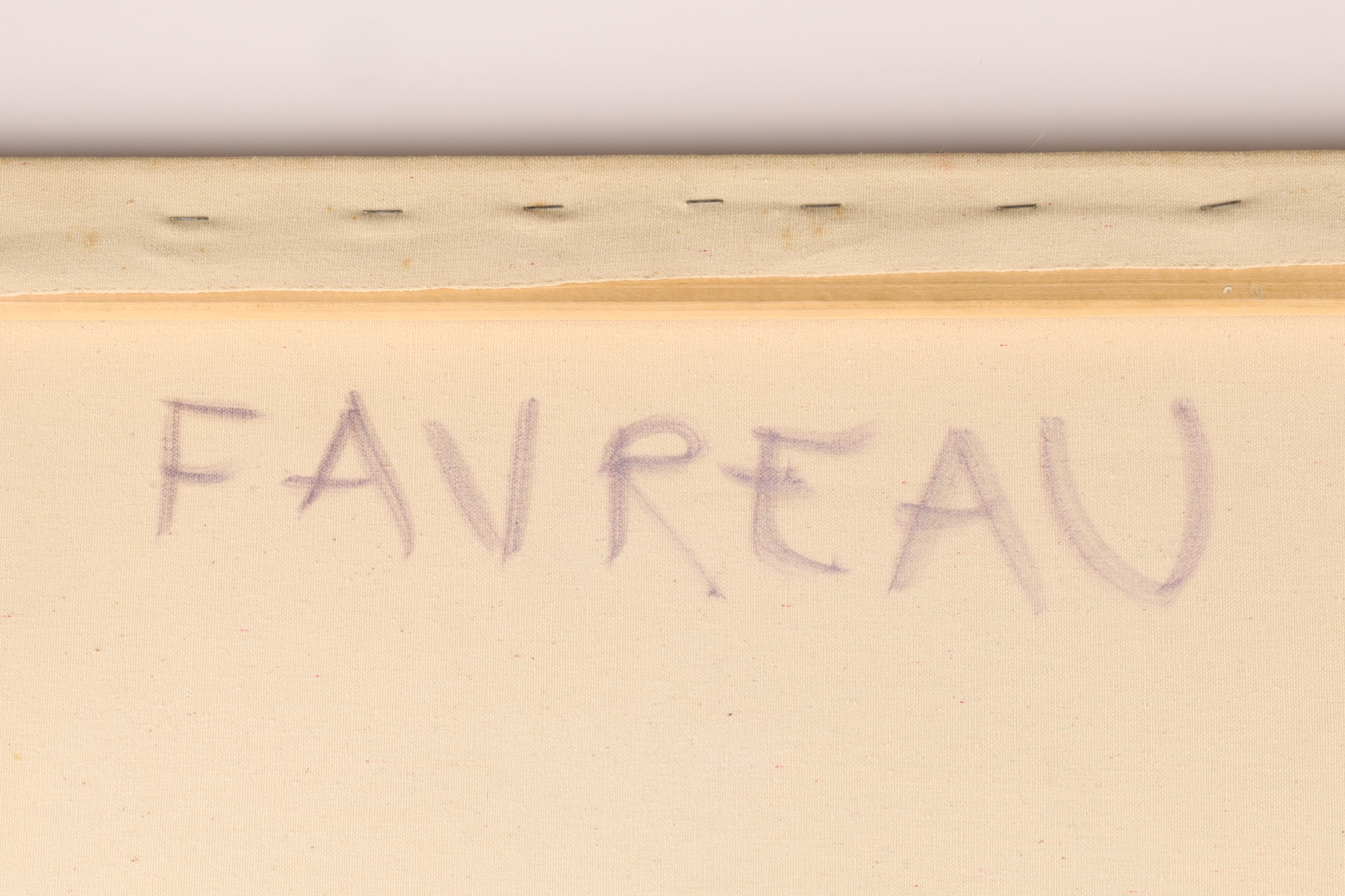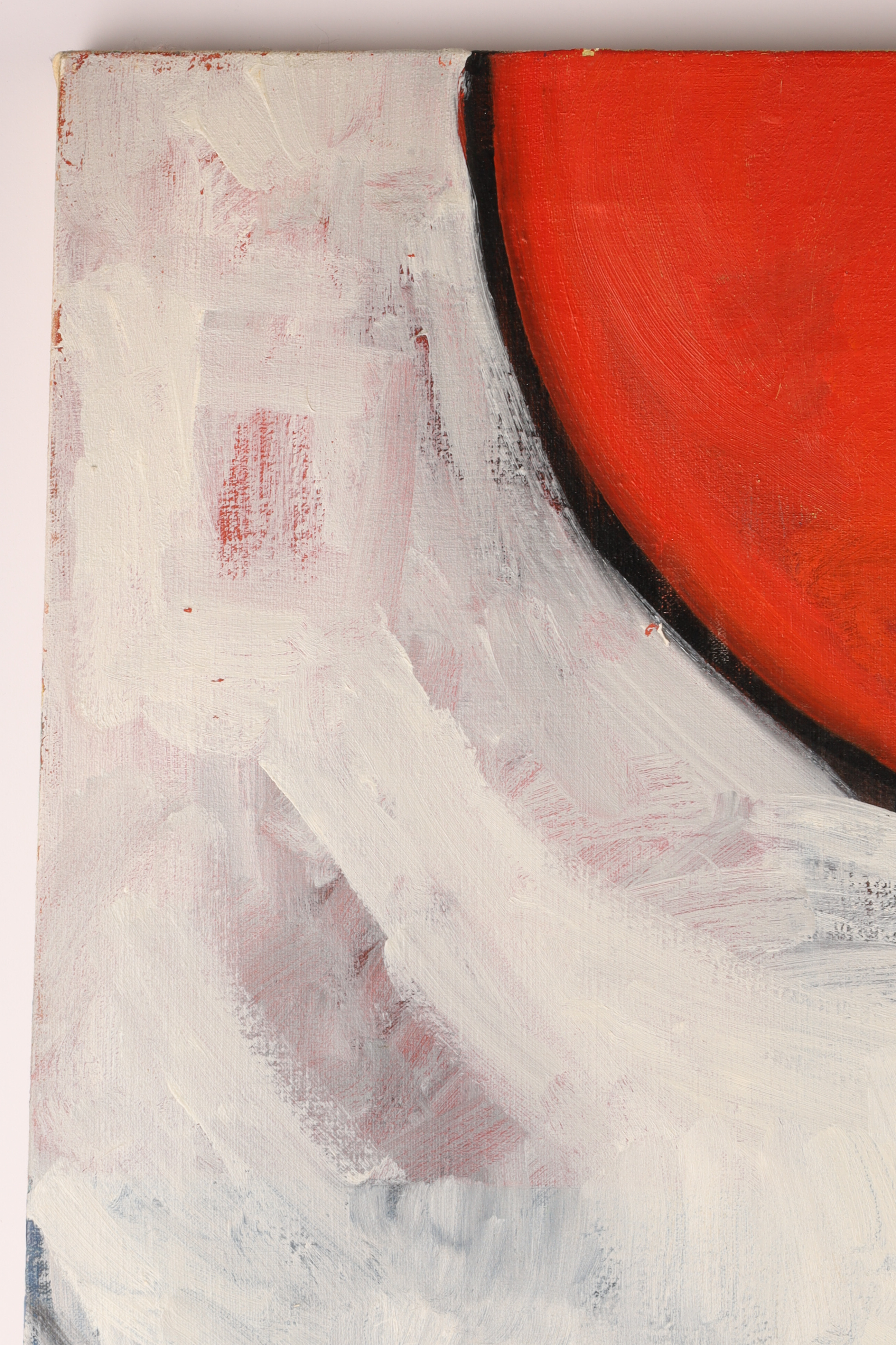 A bold abstract oil on canvas by Canadian painter Marcel Favreau. The composition is divided into two striking halves: on the left, a large red disc against a textured white ground; on the right, a dynamic green field enlivened by accents of red, blue, and purple. Favreau’s gestural brushwork and vibrant palette demonstrate his engagement with postwar abstraction in Quebec, bridging lyrical abstraction and geometric balance.