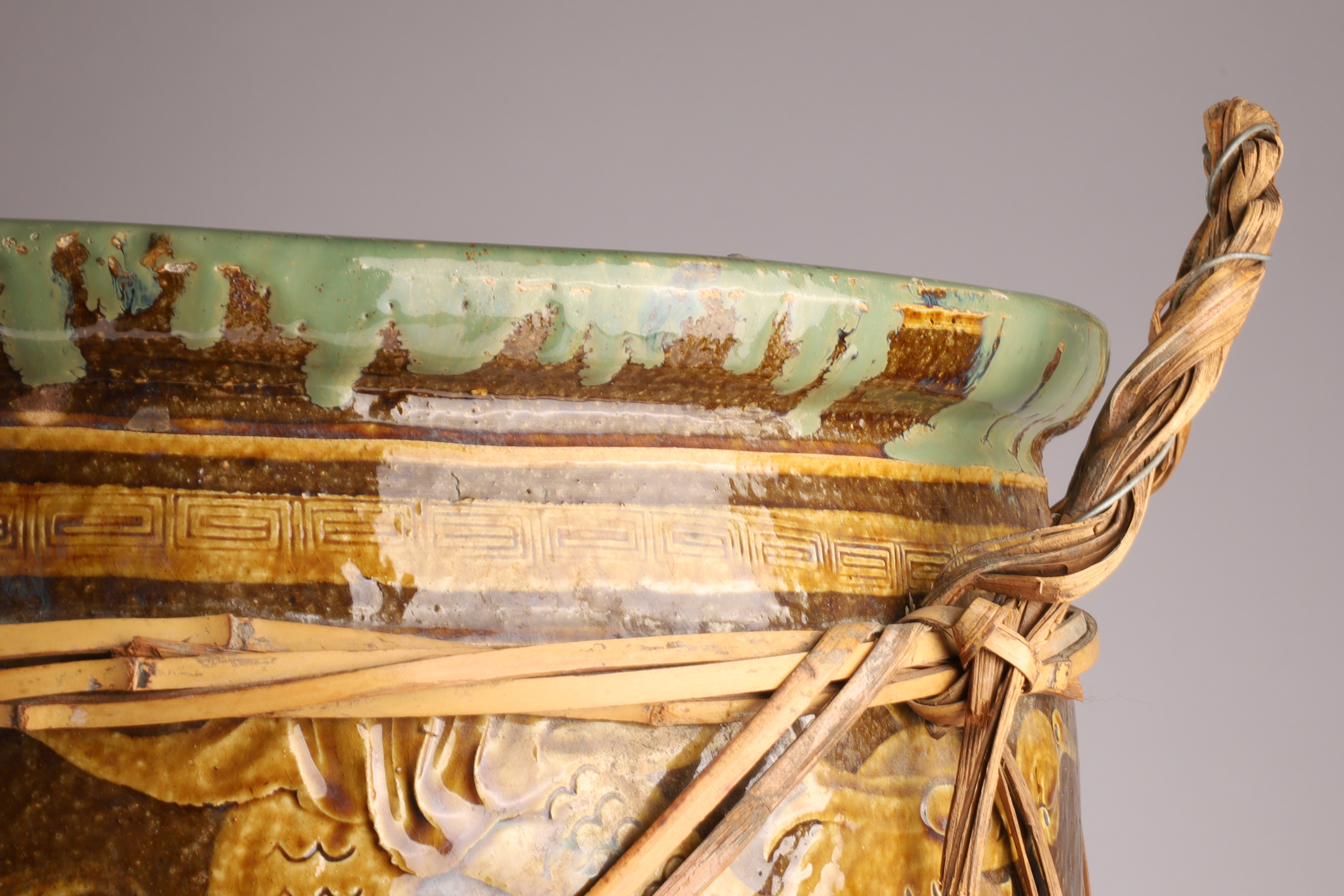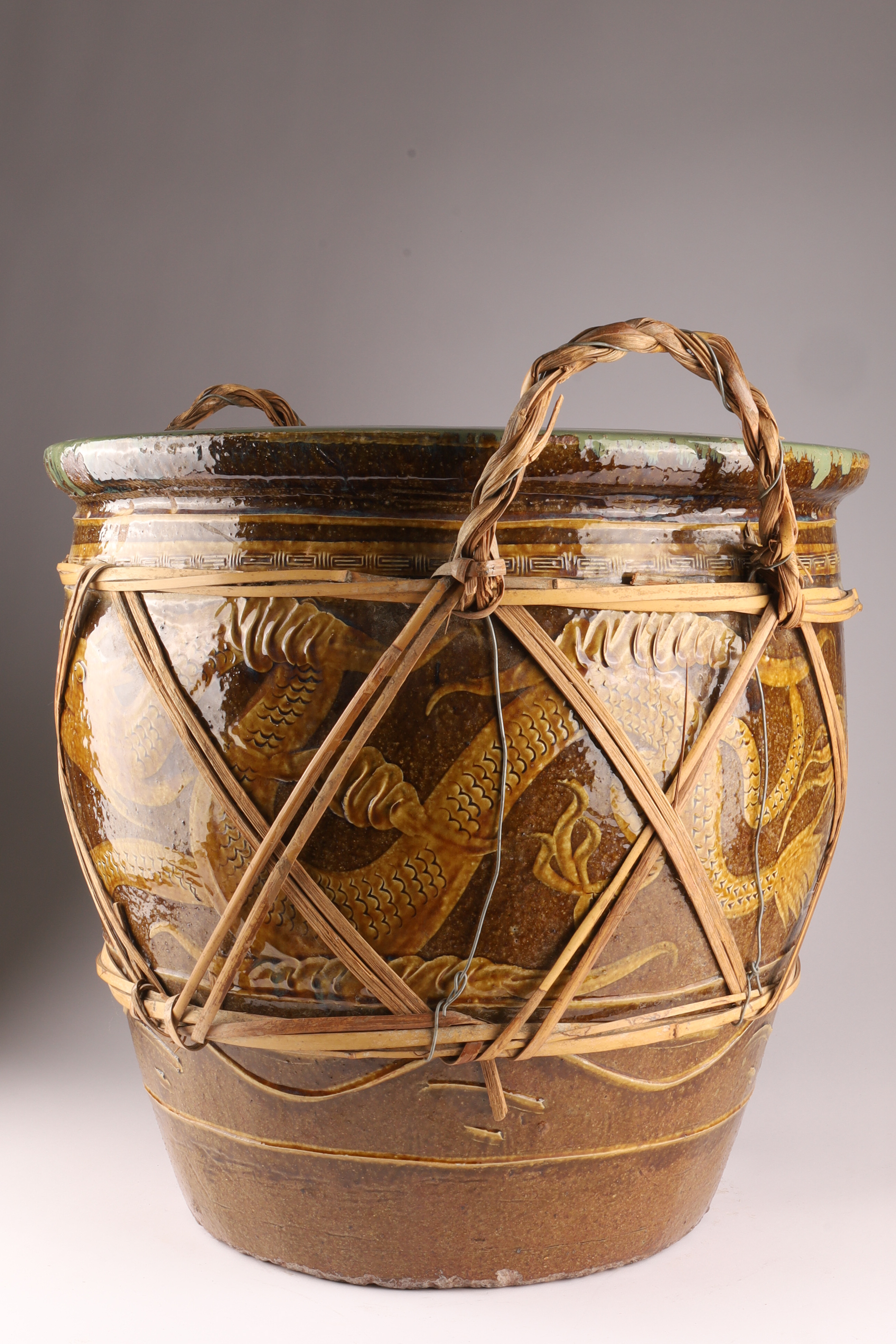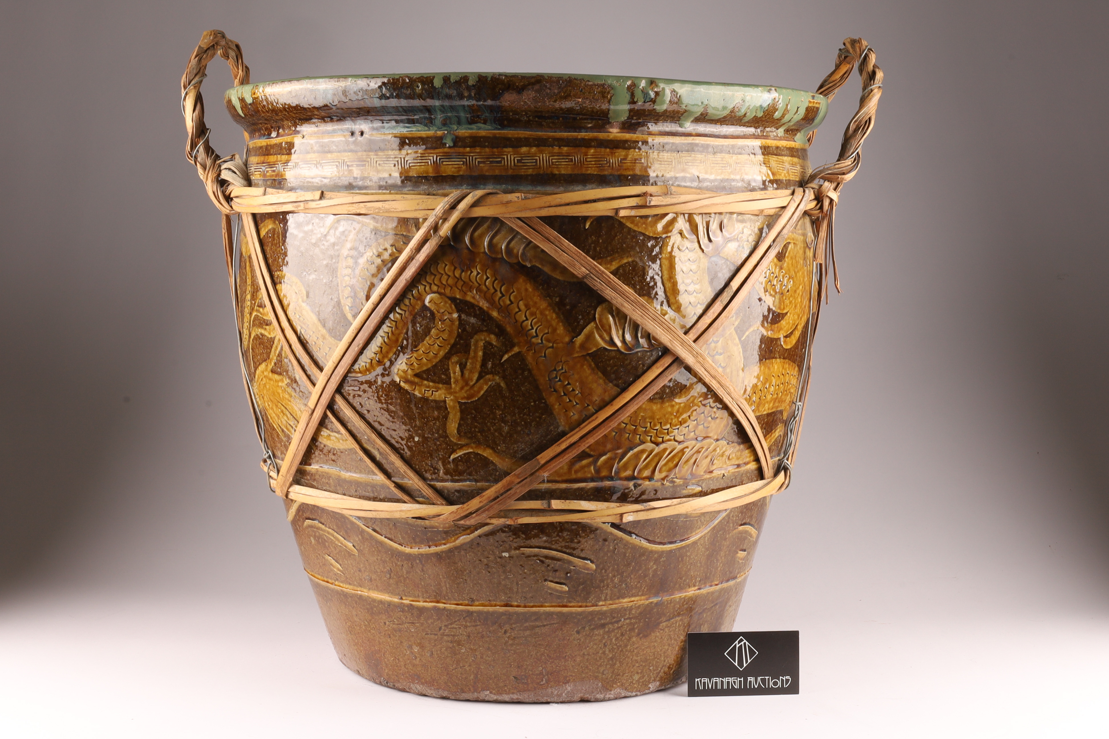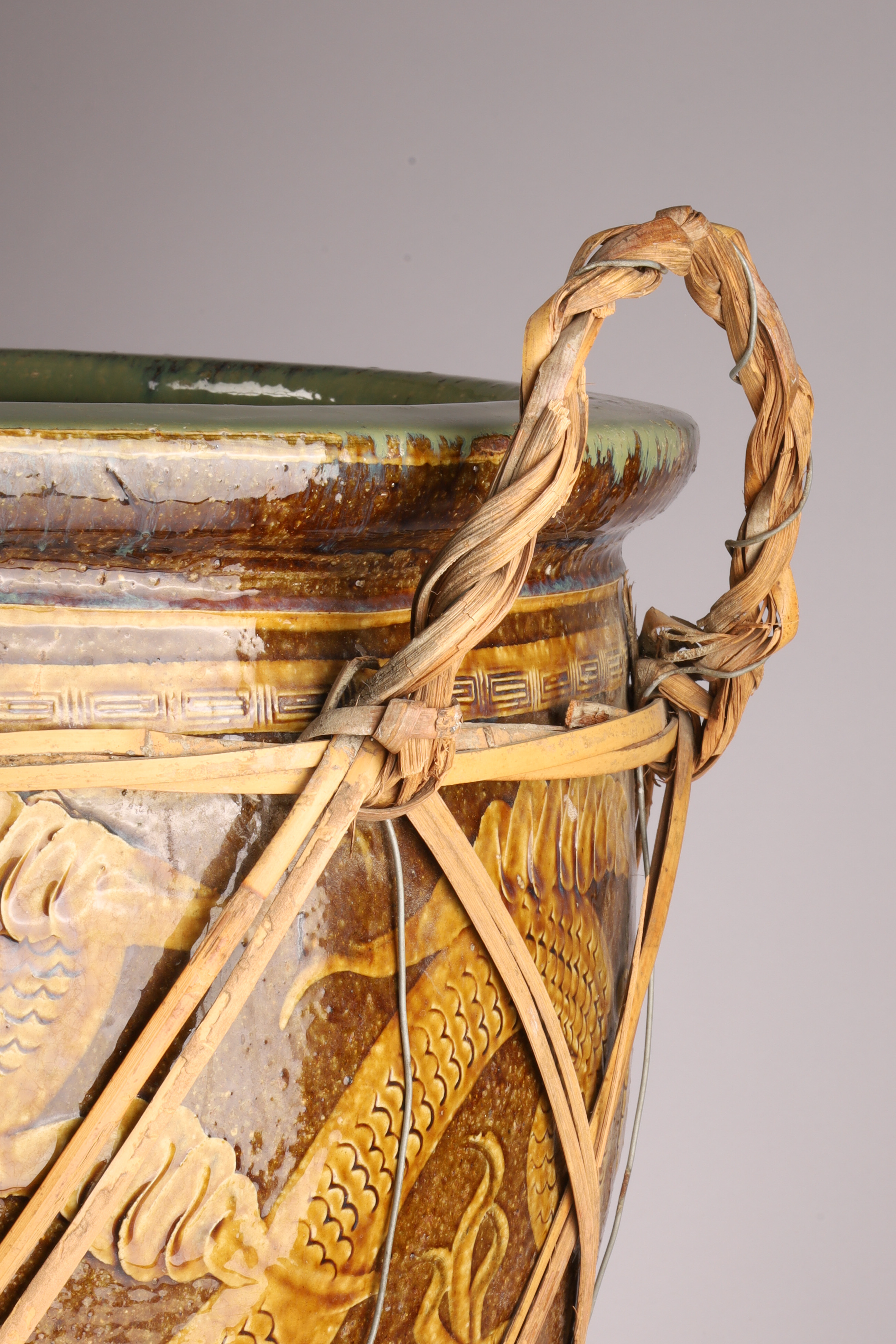 Large Chinese Brown and Green Glaze Jardiniere Egg Pot with woven carrying cord and decorated with scrolling dragons. Measuring 20 inches D x 19 H.