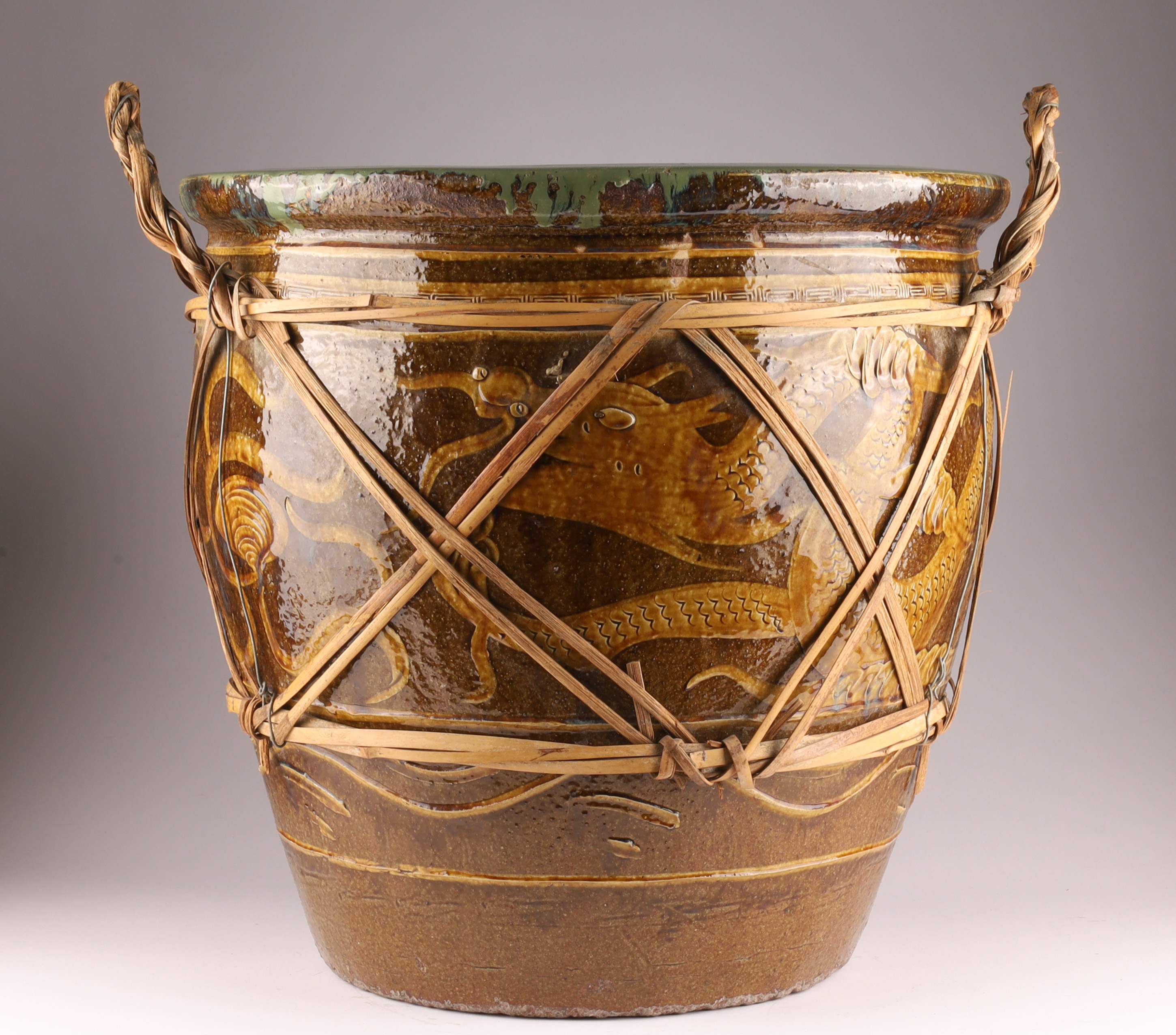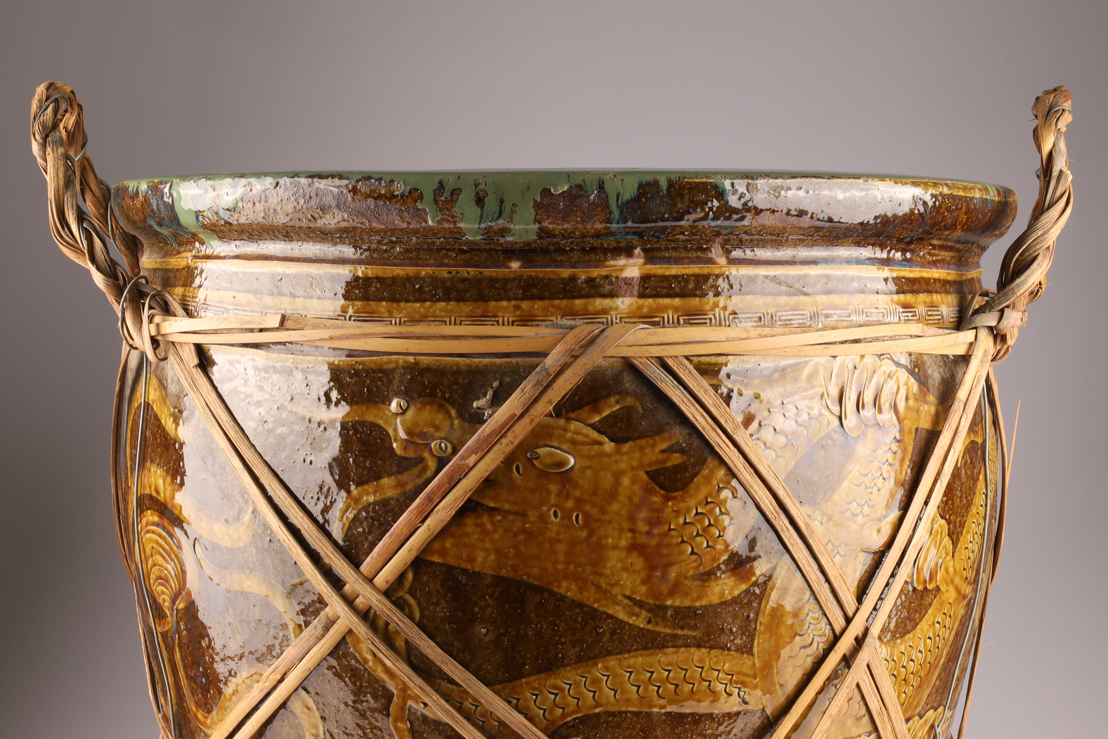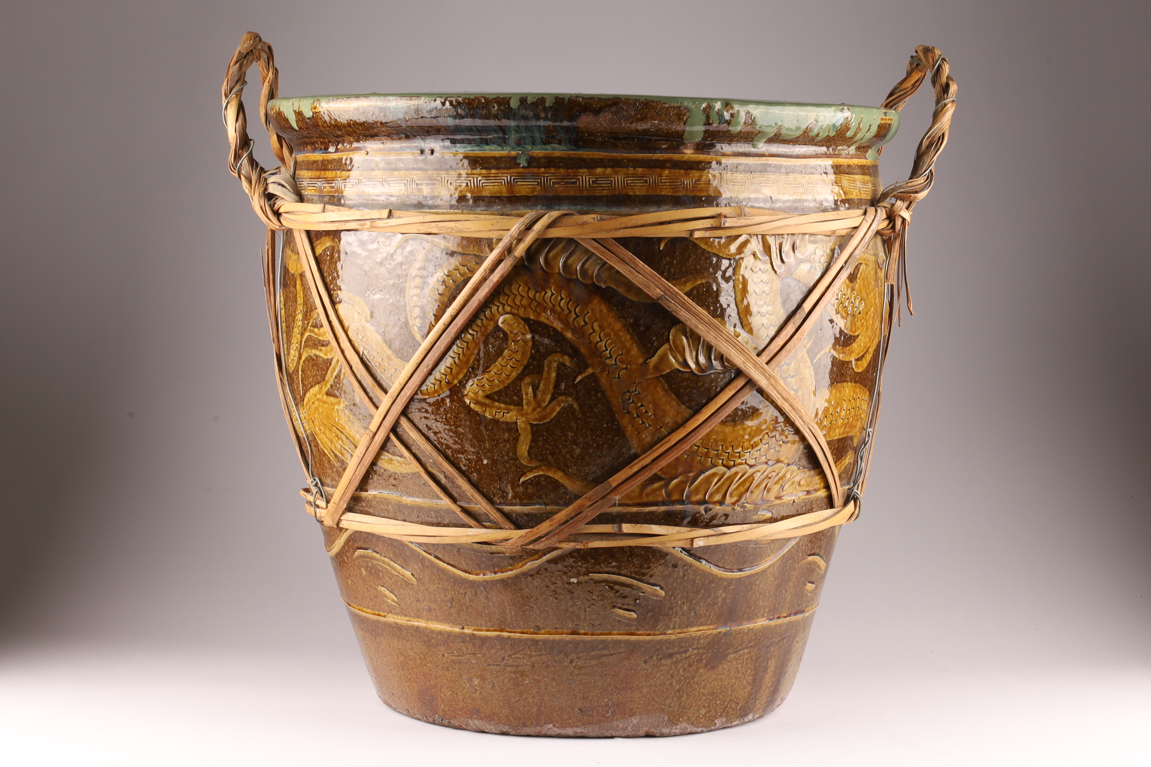 Large Chinese Brown and Green Glaze Jardiniere Egg Pot with woven carrying cord and decorated with scrolling dragons. Measuring 20 inches D x 19 H.