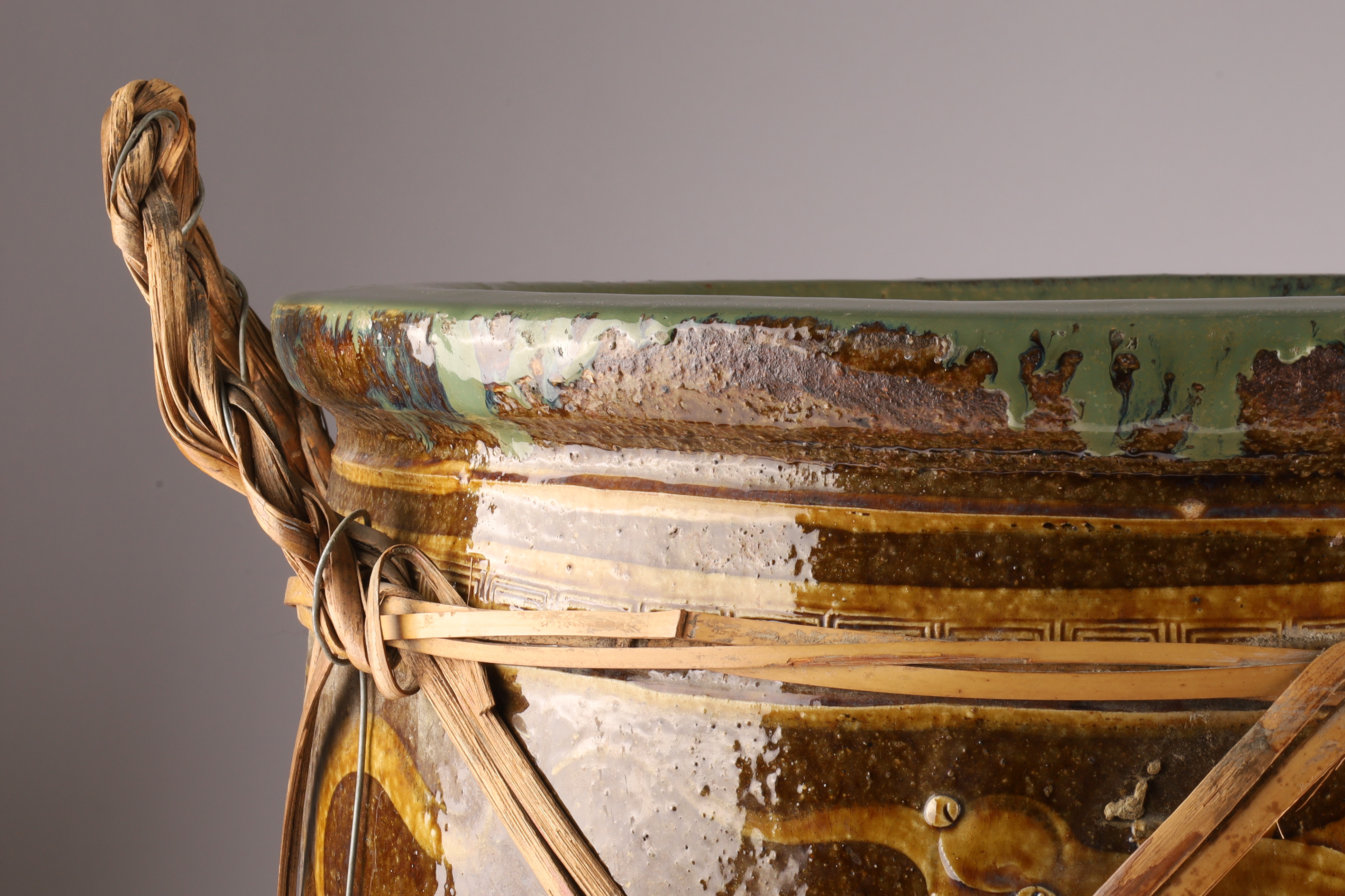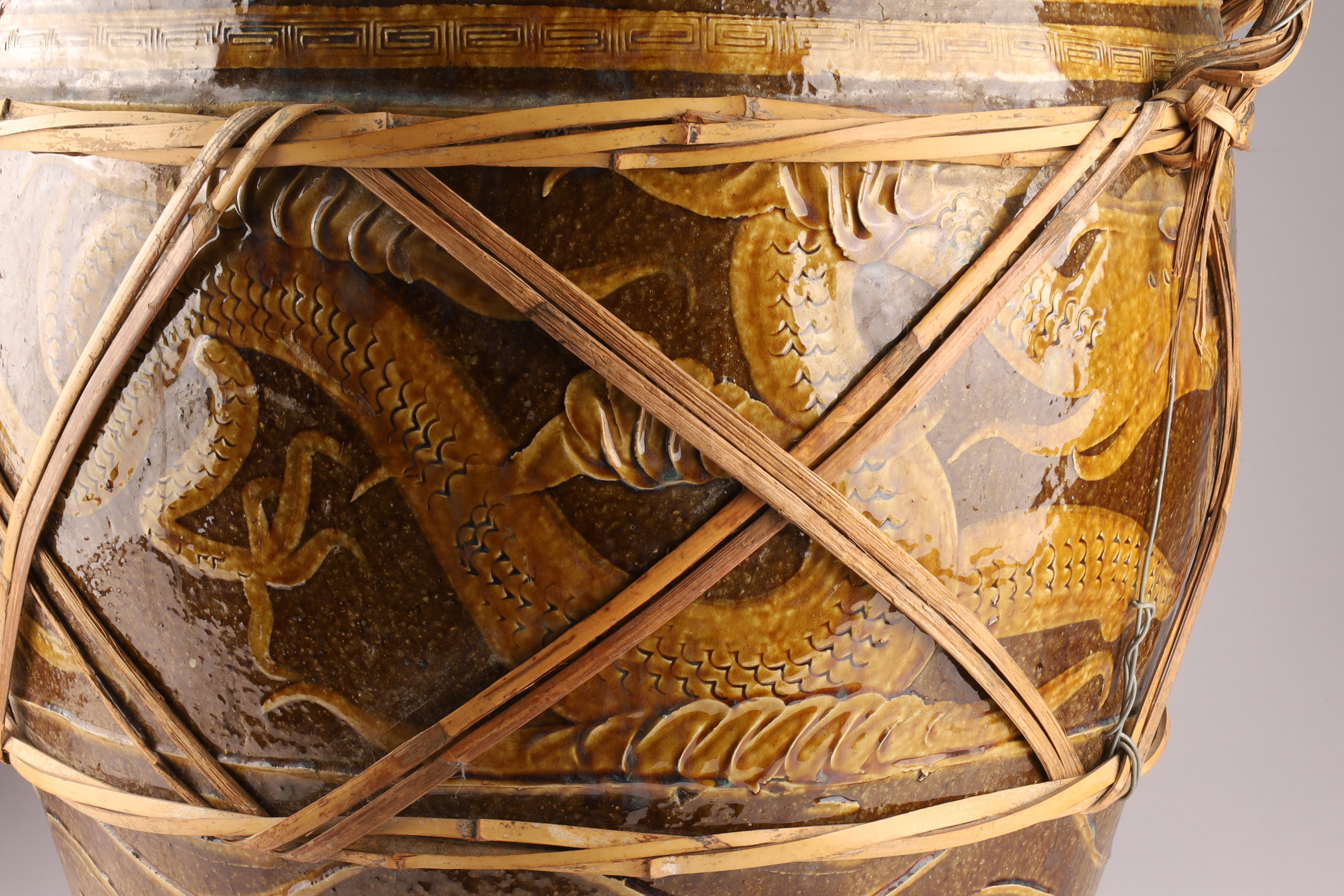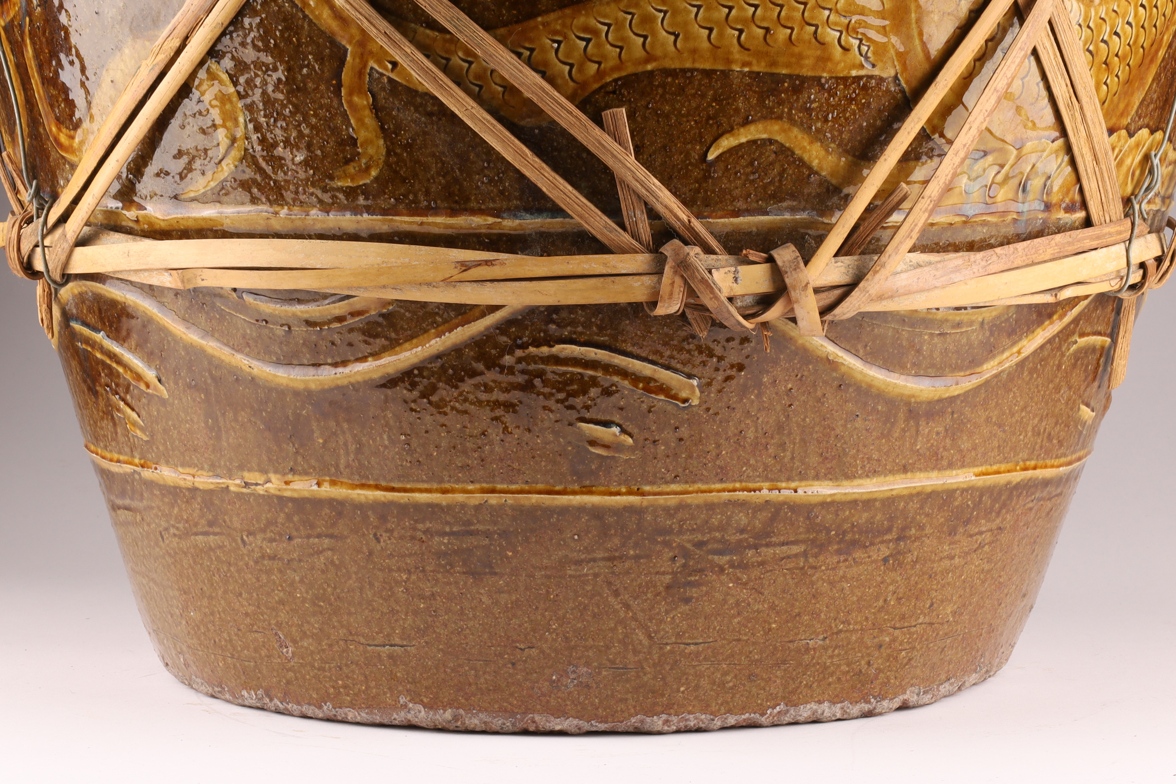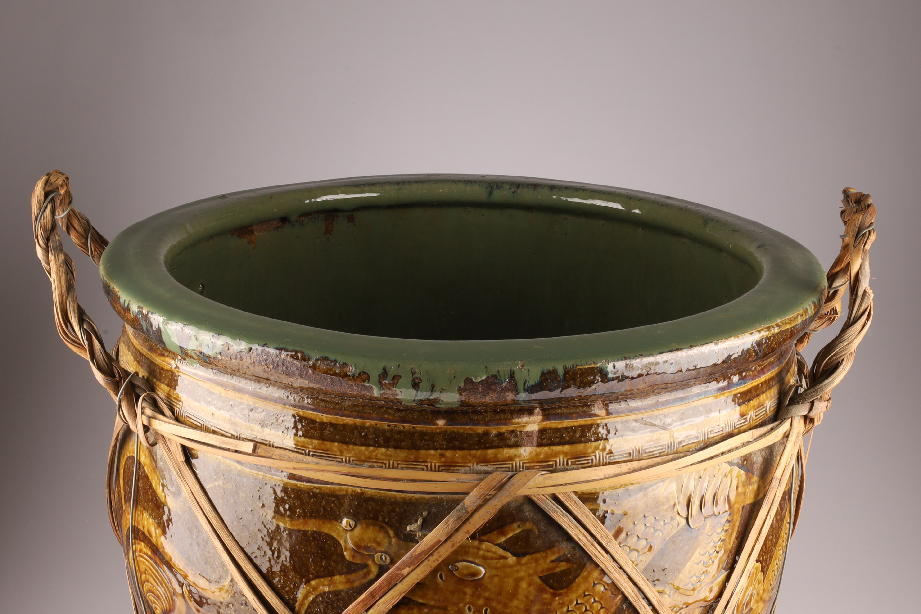 Large Chinese Brown and Green Glaze Jardiniere Egg Pot with woven carrying cord and decorated with scrolling dragons. Measuring 20 inches D x 19 H.