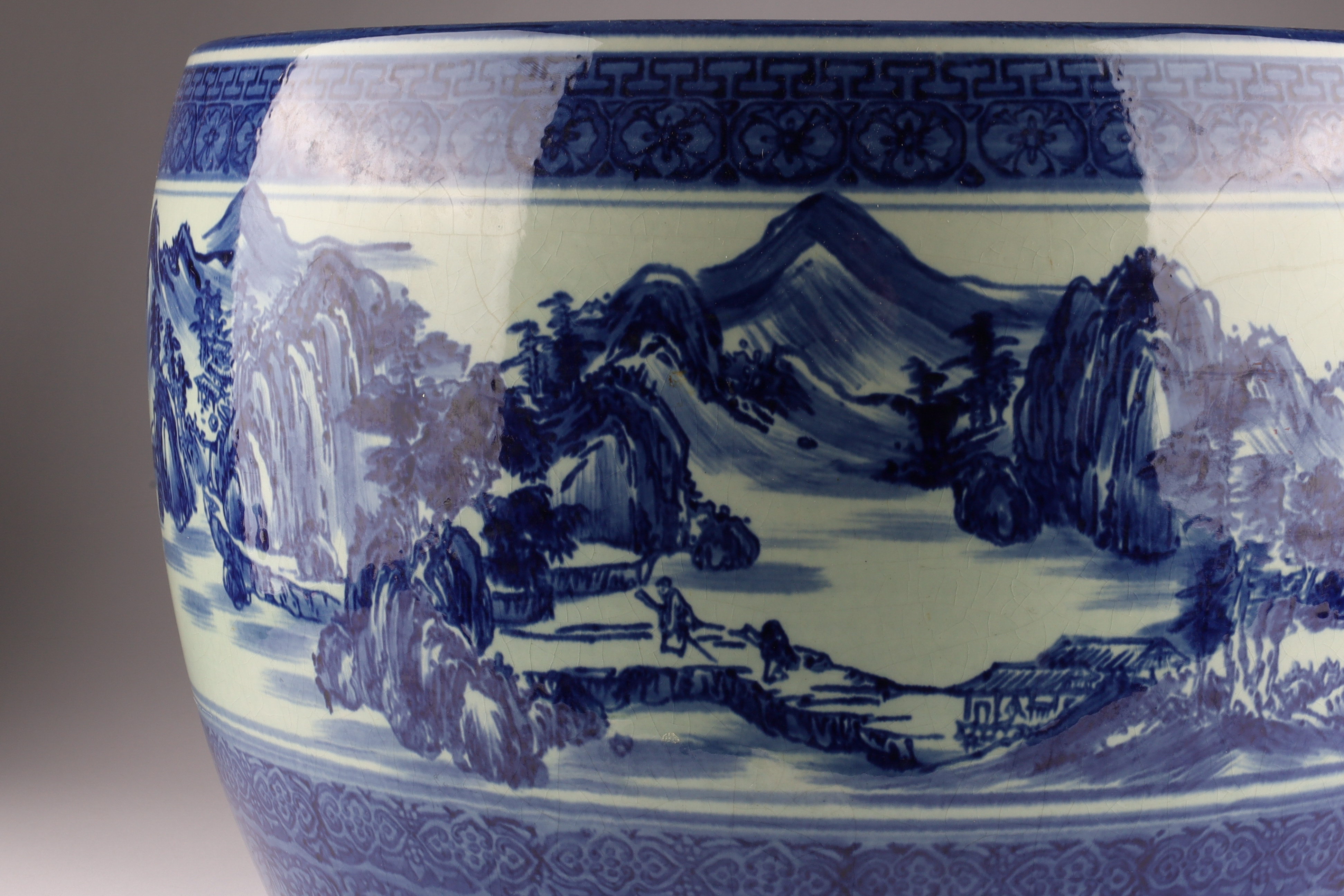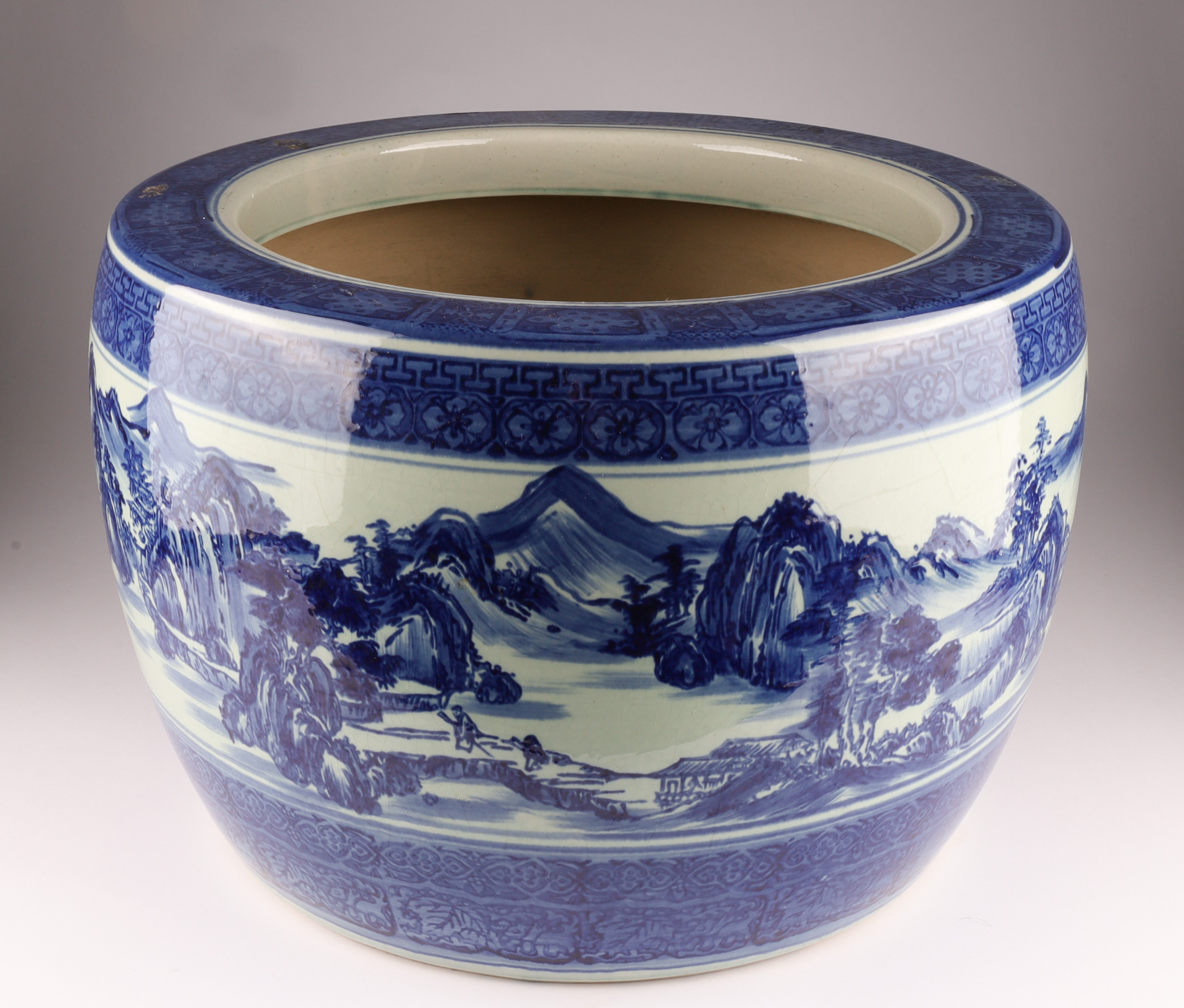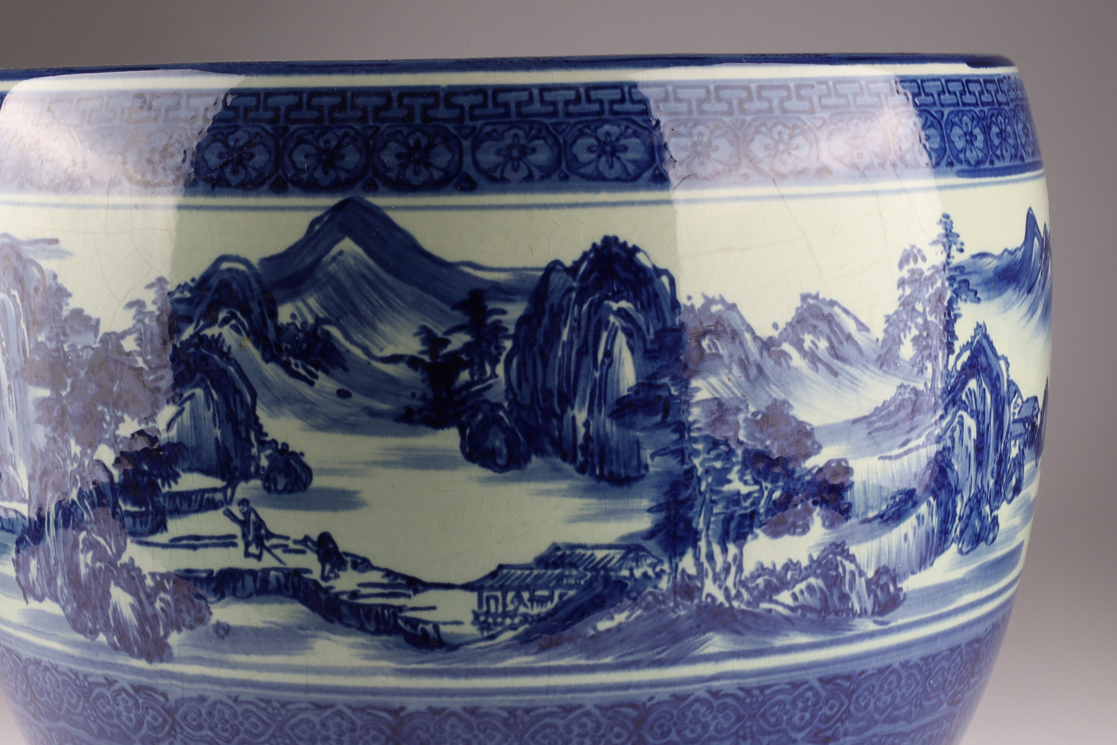 Chinese Blue and White Jardiniere Planter Pot Decorated with a mountainous landscape. Measuring 16 inches diameter x 11 H.