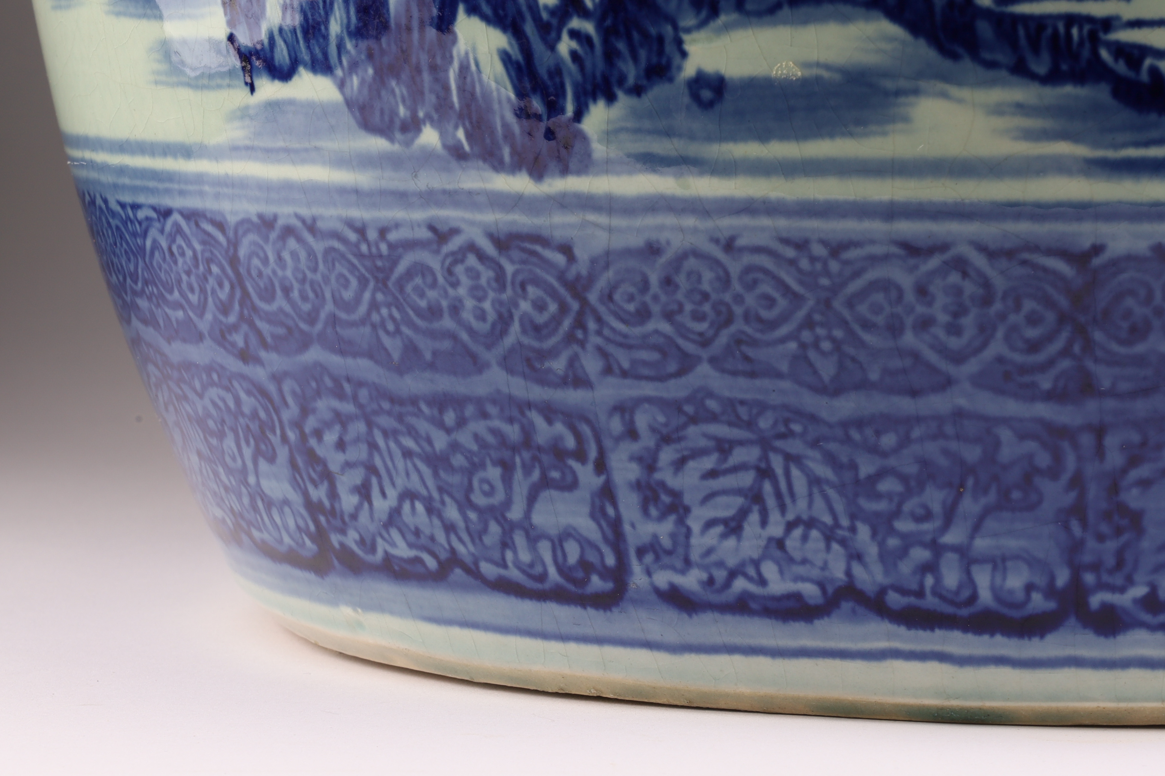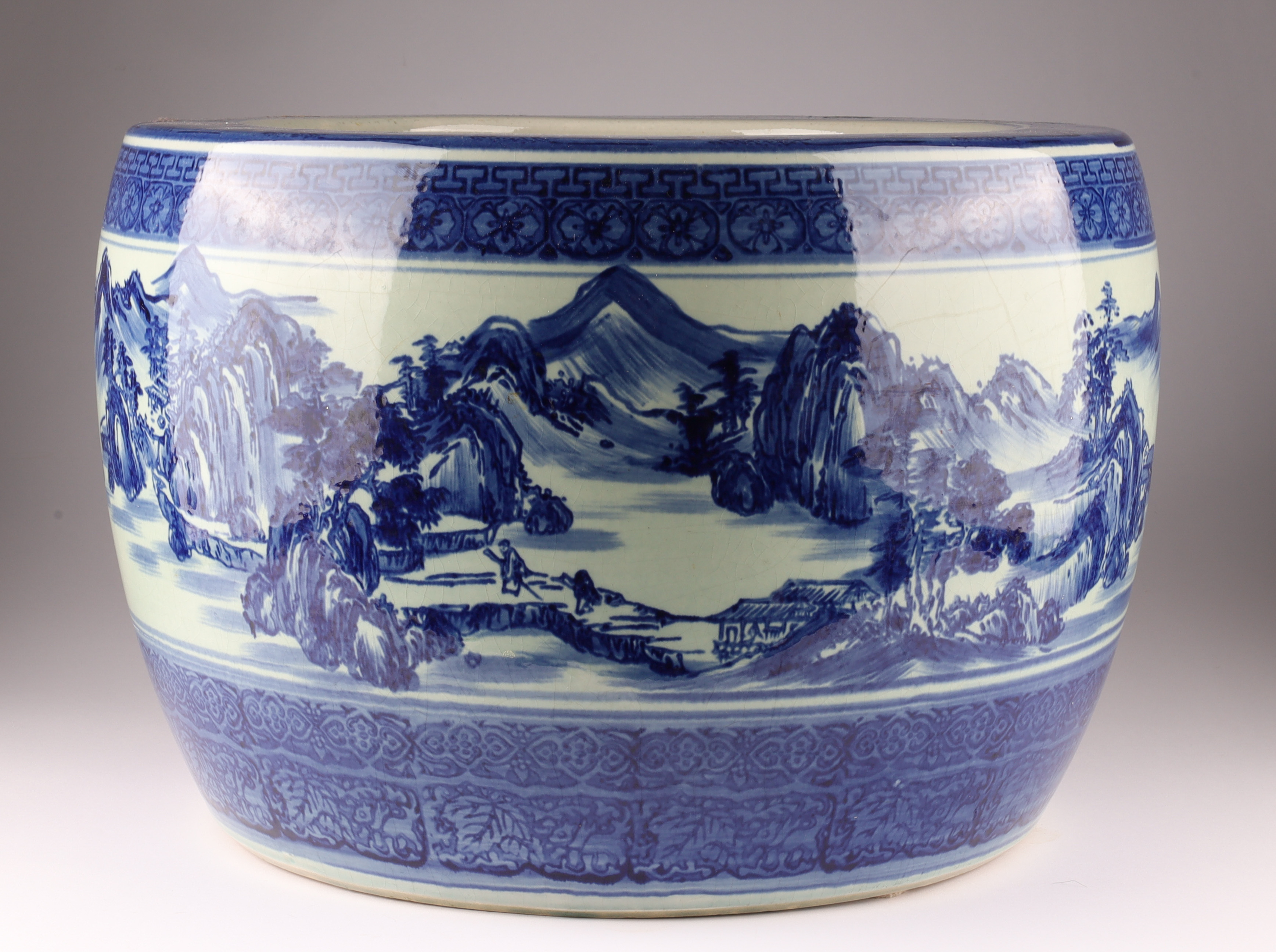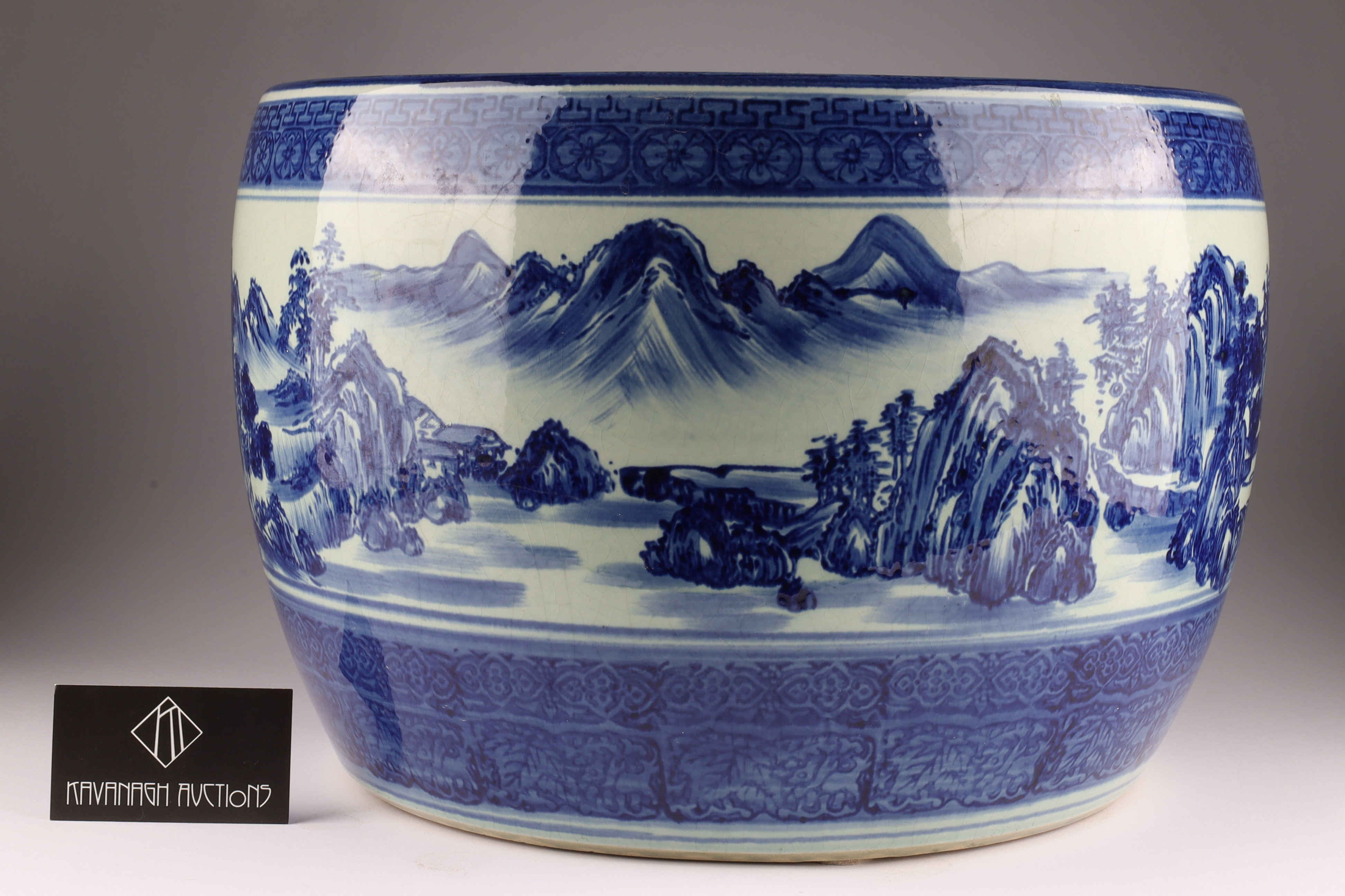 Chinese Blue and White Jardiniere Planter Pot Decorated with a mountainous landscape. Measuring 16 inches diameter x 11 H.