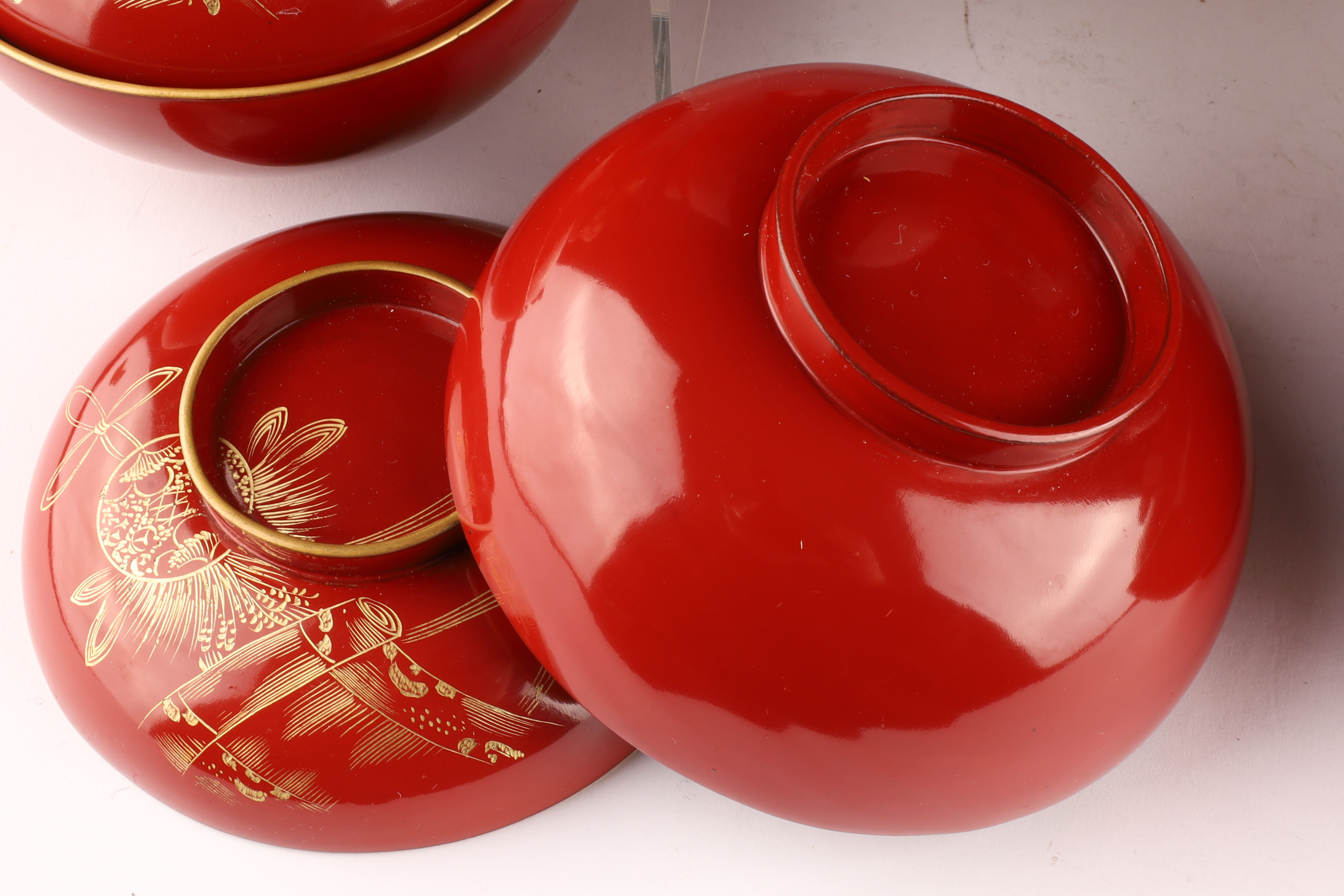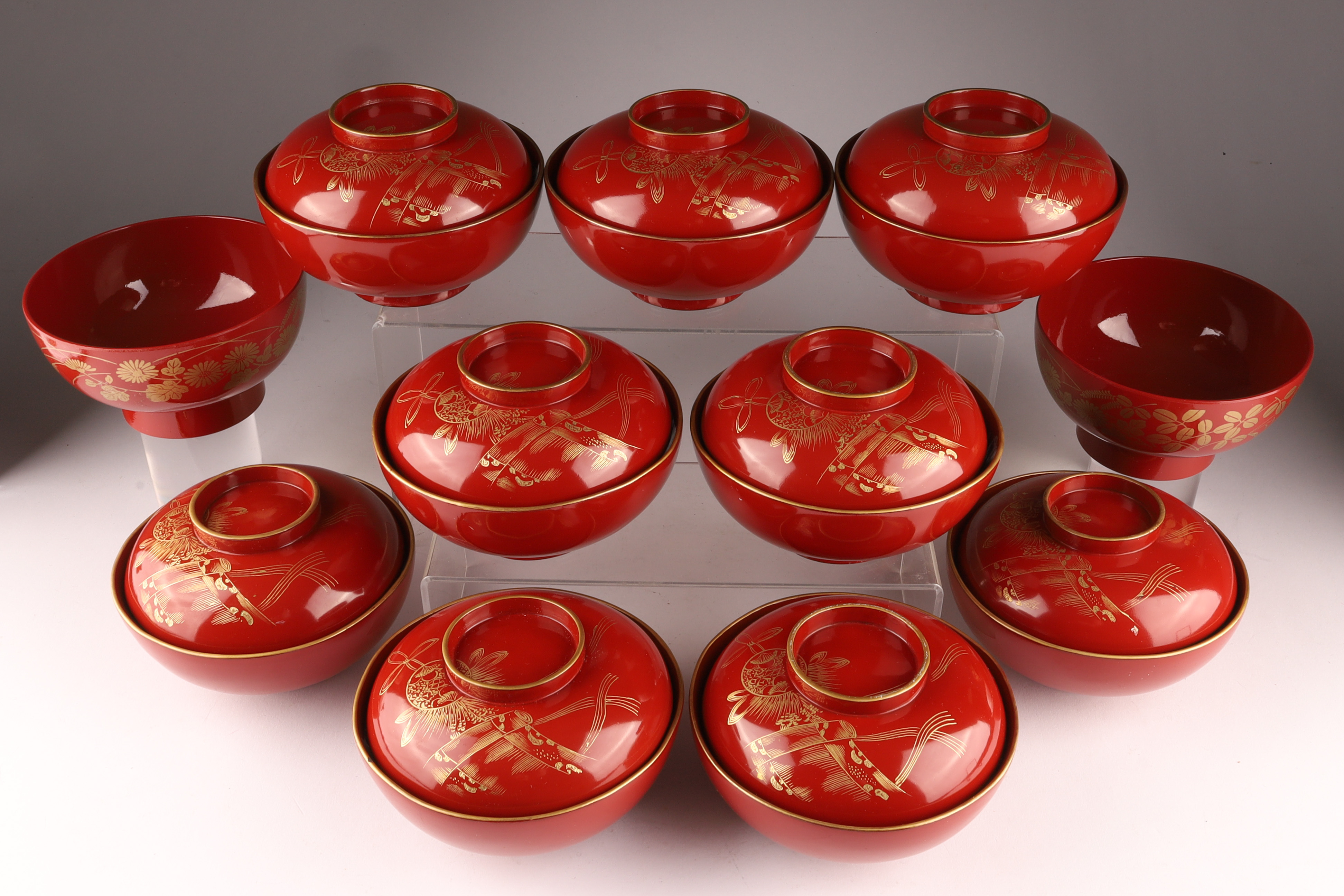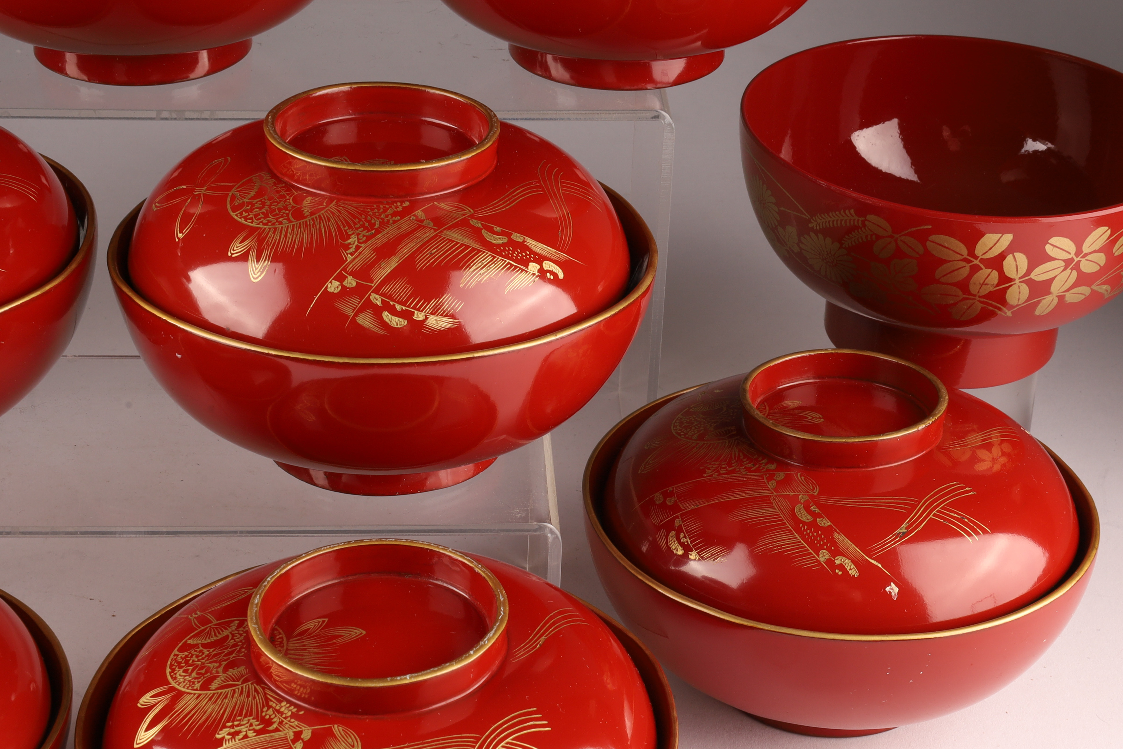Set of 9 Chinese or Japanese Gilt Lacquer Lidded Bowls, 2 Bowls